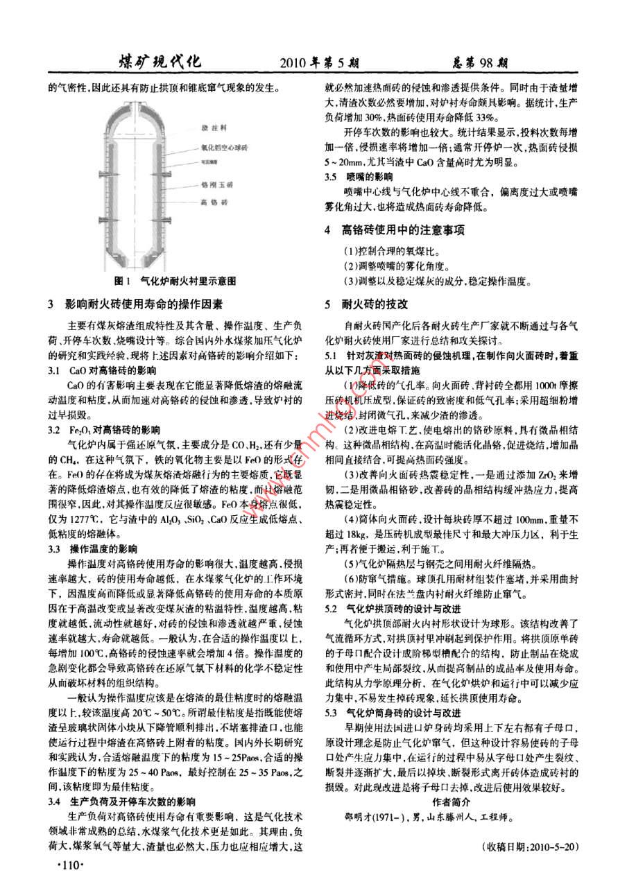煤礦規(guī)代化2010年第5期忌第98期水煤漿加壓氣化耐火磚的深討邵明才兗州煤業(yè)榆林甲醇廠,陜西榆林719000摘要介紹了德士古水煤漿加壓氣化爐耐火材料的種類,影響耐火磚使用壽命的操作因素,操作注意事項及改進措施。關鍵詞德士古;氣化爐;耐火磚;使用壽命;操作因素;改進措施中圖分類號:TQ541文獻標志碼:B文章編號:10090797(2010)05-010901前言22鉻剛玉磚:鉻12剛玉磚支撐磚一是在高純剛玉中添加12%以上的氧化鉻來進水煤漿加壓氣化爐是甲醇生產(chǎn)中的重要設備在甲醇生產(chǎn)行制造的。位于向火面磚背后,具有較高的機械強度,常溫耐長周期運行過程中起著非常重要的作用。氣化爐內(nèi)耐火磚共壓強度在150Mna左右,對氣化爐拱頂耐火材料整體起著非常分為3層(見附圖),由里到外分別為:向火熱面層、隔熱支撐重要的力學支撐作用,并且能夠抵擋高溫下腐蝕性氣體的侵層與保溫層,其中爐內(nèi)向火面磚的壽命直接影響生產(chǎn)的長周期蝕運行。目前國外向火面耐火磚使用壽命達兩年國內(nèi)耐火磚使23氧化鋁空心球磚用壽命一年左右耐火磚更換費用占整個裝置維修費用的50%氧化鋁空心球磚位于支撐磚后部,是一種很好的節(jié)能材此耐火磚除了在選材上(現(xiàn)在向火面磚選用高鉻磚)非常重料,對氣化爐起保溫作用,使熱損失降低使外壁溫度保持在要外,在工藝操作上也十分關鍵。設定值,氧化鋁空心球磚除了導熱系數(shù)低外,常溫、高溫強度2德士古水煤漿氣化上耐火磚的介紹是輕質(zhì)耐材中最好的,雜質(zhì)含量極低,具有較好的抗腐蝕性氣體的侵蝕能力。是目前水煤漿氣化爐選用的輕質(zhì)保溫耐火材耐火材料在氣化技術上的應用主要為氣化爐的內(nèi)襯,也料中較好的材料。就是耐火磚。耐火磚是具有一定形狀和尺寸的耐火材料24可壓縮層氣化技術耐火材料有高鉻磚、剛玉磚、氧化鋁空心球磚耐火可壓縮層一選用陶瓷纖維可塑料陶瓷纖維可塑料具有纖維可塑料很好的保溫絕熱性能,并H能夠有效緩沖高溫下里層耐火材2.1高鉻磚:C90高鉻磚料的徑向膨脹。施工更加方使C^0高鉻磚是目前水煤漿氣化爐向火面使用綜合性能較2.5耐火澆注料好的耐火材料。其高溫性能好具有較強的抗煤熔渣侵蝕的能耐火澆注料一選用鉻12剛玉澆注料,主要用于球項及力,氧化鐵、氧化硅等雜質(zhì)含量極少,體積密度最高可達錐底,澆注料和磚相比具有以下優(yōu)點:無灰縫、整體性好,施T4.3gcm3以上,氣孔率小于16%,燒后常溫耐壓強度在120MPa方便特別是復雜結(jié)構(gòu)的施工,方便快捷省工、省時省力。鉻以上,具有較高的機械強度。12澆注料的抗氣體侵蝕性強,同時由于體積密度大具有很好CO2濃度降到1%以下時方可復電起動。經(jīng)過對此項技術的研究與實踐應用,我礦原沿頂布置(2)防滅火管理:①為了防止工作面機尾以上底煤自燃發(fā)3101工作面在沿底推進過程中,上下端頭留設三角煤的厚度火,工作面每推進一排,在工作面上尾巴(管子必須緊挨頂板和長度都得到合理挖制,在滿足安全施工的前提下得到最大埋管)每班注一次不少于兩袋MEA,不注MEA時,應及時注程度的回采,大大提高了煤炭回收率,回采至今的六個月同比漿;②上順槽應配備有消防水管,且每50m安一個三通(帶閘共計增加原煤產(chǎn)量10000多噸符合科學指導生產(chǎn),技術帶動門)。③工作面順槽消防水管(可與清水管合用),固定管口經(jīng)濟發(fā)展的主題距工作面煤壁不得超過20m,前方用1寸膠管聯(lián)接至工作面,作者簡介上順槽按規(guī)定安設水壓表管中水壓不得低于4kgm2,水量不王合濟(1981-),男,河南省鶴壁市人,漢族,助理工程師,小于06m/min。2007年畢業(yè)于河南理工大學,從事煤礦開采、安全生產(chǎn)管理工4結(jié)語作,現(xiàn)任鶴煤八礦生產(chǎn)科技術員。(收稿日期:2010-6-29)On both ends of the bottom face of coal mining and the two roadway support technologyWang-HetaoHenan Hebi Coal Group coal rank eight mines in Henan Hebi 458008)Abstract: To improve the recovery of coal mines, eight coal mine on the Cape along the bottom face 3101 caused the advance ofupper and lower ends leaving in coal mining technology triangle to explore the practical application of improvement and, through the gallows,and sole methods on the bottom surface of the work of keeping it set up coal thic kness and length of the triangle maximum De control of thesituation naxt year significantly increased the output of raw coal, to achieve a safe and efficient Fazhan strategy.Key words: upper and lower ends triangle coal, gallows end down, coal recovery109煤礦現(xiàn)代化010年第5期忌第98期的氣密性因此還具有防止拱頂和錐底竄氣現(xiàn)象的發(fā)生。就必然加速熱而磚的侵蝕和滲透提供條件。同時由于渣量增大清渣次數(shù)必然要增加,對爐襯壽命頗具影響。據(jù)統(tǒng)計,生產(chǎn)負荷增加30%,熱面磚使用壽命降低33%8注料開停車次數(shù)的影響也較大。統(tǒng)計結(jié)果顯示投料次數(shù)每增氧化鋁空心球磚加一倍侵損速率將增加一倍;通常開停爐一次,熱面磚侵損5~20mm尤其當渣中CaO含量時尤為明顯35噴嘴的影響倍玉磚噴嘴中心線與氣化爐中心線不重合,偏離度過大或噴嘴高倍磚霧化角過大,也將造成熱面磚壽命降低4高鉻磚使用中的注意事項(1)控制合理的氧煤比。(2)調(diào)整噴嘴的霧化角度圖1氣化爐耐火襯里示意圖(3)調(diào)整以及穩(wěn)定煤灰的成分,穩(wěn)定操作溫度