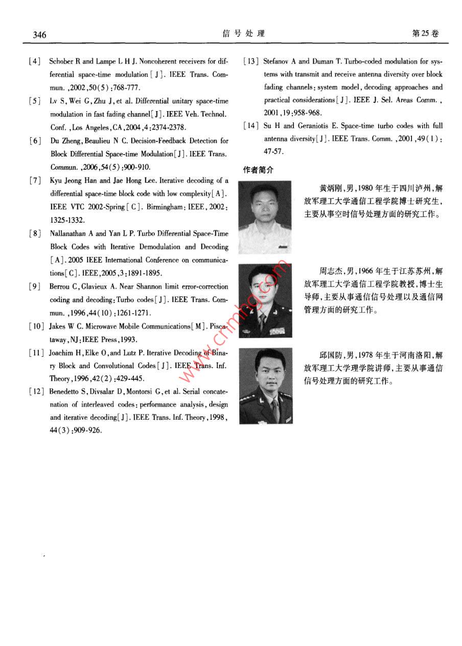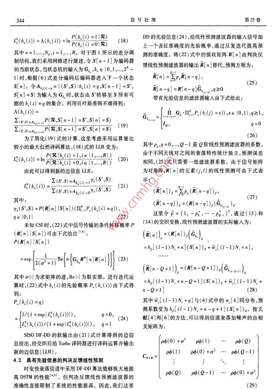 種新的迭代判決反饋差分空時(shí)檢測(cè)算法黃炳剛周志杰邱國(guó)防(解放軍理工大學(xué)通信工程學(xué)院,江蘇南京210007摘要:針對(duì)快衰落信道,提出了Tuto碼與塊差分空時(shí)調(diào)制( BDSTM)串行級(jí)聯(lián)的差分空時(shí)設(shè)計(jì)方案,并以該設(shè)計(jì)方案為基礎(chǔ),提出了一種新的迭代判決反饋差分空時(shí)檢測(cè)(IDF-DSTD)算法。該算法實(shí)現(xiàn)了具有軟輸入軟輸出的判決反饋差分空時(shí)檢測(cè)( SISO DE-DD),一方面在判決反饋線性濾波器中通過引入先驗(yàn)信息,提高了線性預(yù)測(cè)的準(zhǔn)確性,另外, SISO DFDD與外側(cè) Turbo譯碼器之間通過邊信息的交換實(shí)現(xiàn)了迭代檢測(cè)與譯碼。仿真結(jié)果表明,在未知信道狀態(tài)信息(CS)的條件下,本文算法的誤碼性能接近已知CSI的相干檢測(cè),優(yōu)于判決反饋塊差分空時(shí)調(diào)制( DFBDSTM)約2dB。關(guān)鍵詞:差分空時(shí)調(diào)制;快衰落信道;判決反饋差分檢測(cè);軟輸入軟輸出中圖分類號(hào):TN9.3文獻(xiàn)標(biāo)識(shí)碼:A文章編號(hào):1003-0530(2009)03-0341-06A Novel Iterative Decision Feedback Differential Space-TimeDetection AlgorithmHUANG Bing-gang ZHOU Zhi-jie QIU Guo-fangInstitute of Communications Engineering, PLA Univ of Sci. Tech., Nanjing 210007, China)Abstract: A concatenated decision feedback block differential space-time modulation scheme with turbo code is presented forpidly flat-fading channels. a novel iterative decision feedback differential space-time detection algorithm named IDF-DSTD is put for-ward to demodulate the proposed scheme. Within IDF-DSTD differential space-time detection with soft inputs and soft outputs is realizedand more accurate estimation is achieved by using a priori information in the decision feedback linear prediction filter. At the same timecombining iterative decoding and space-time detecting is carried out between SISO DF-DD and turbo decoder by exchanging extrinsic in-formation. Simulation results show that the performance of the proposed design is close to coherent detection and better than decisionfeedback block differential space-time modulation about 2dB without channel state information.Key words: differential space-time modulation; rapidly fading channels; decision feedback differential detecting; soft-input soft-1引言由于差分接收帶來的性能損失。但在快衰落信道條件下,相鄰兩個(gè)接收符號(hào)所經(jīng)歷的信道衰落由于時(shí)間選由于接收端和發(fā)送端都不需要知道信道的狀態(tài)信擇性衰落的影響變化較大,從而導(dǎo)致DSTM的性能急劇息(CS1),近年來,差分空時(shí)調(diào)制(DSTM)技術(shù)受到廣泛下降。為了減少信道快速變化對(duì)于DsTM的影響,文獻(xiàn)關(guān)注13。DSTM與傳統(tǒng)單天線差分調(diào)制DSK相似,[4】提出了基于判決反饋的差分檢測(cè)(DF-DD)算法,該利用前一個(gè)接收到的信號(hào)作為參考去解調(diào)當(dāng)前收到算法通過一個(gè)線性預(yù)測(cè)濾波器利用前面已解調(diào)的數(shù)據(jù)的信號(hào),接收端在未知CSI時(shí)可以獲得滿發(fā)射分集。來預(yù)測(cè)當(dāng)前的信道狀態(tài),用于解調(diào)新收到的數(shù)據(jù),從而DSTM雖然可以進(jìn)行低復(fù)雜度的差分接收,但與接收端有效地降低了由于信道衰落變化帶來的系統(tǒng)性能下已知CSI的相干接收相比有3dB的功率損失。文獻(xiàn)降。最近,文獻(xiàn)[5]提出了一種應(yīng)用于快衰落信道的塊[7]將DSTM與信道編碼串行級(jí)聯(lián),提供了額外的編碼差分空時(shí)調(diào)制( BDSTM)方案。文獻(xiàn)[6]利用判決反饋增益,在時(shí)域相關(guān)衰落信道中其性能接近相干檢測(cè)。差分檢測(cè)(DF-DD)算法有效地減少 BDSTM帶來的有文獻(xiàn)[8]提出了一種采用兩個(gè)DSTM并行級(jí)聯(lián)的差分效衰落帶寬擴(kuò)展。采用DFDD的差分空時(shí)設(shè)計(jì)方案,空時(shí)設(shè)計(jì)方案,接收端通過迭代算法能夠較好的補(bǔ)償接收端必須預(yù)先獲知信道衰減以及加性噪聲的二階統(tǒng)收稿日期:2007年7月19日;修回日期:2007年12月20日342信號(hào)處理第25卷計(jì)量,當(dāng)發(fā)射天線數(shù)目較多時(shí),不可避免會(huì)由于線性預(yù)測(cè)的準(zhǔn)確性帶來系統(tǒng)性能的損失。文獻(xiàn)[12,13,14]提3串行級(jí)聯(lián)差分空時(shí)設(shè)計(jì)出了各種信道編碼與空時(shí)調(diào)制結(jié)合的空時(shí)調(diào)制方案,以Turo碼”為外碼,塊差分空時(shí)調(diào)制( BDSTM)31接收端通過聯(lián)合處理使得空時(shí)調(diào)制獲得接近最優(yōu)ML為內(nèi)碼,本文提出圖1所示的串行級(jí)聯(lián)差分空時(shí)設(shè)計(jì)方檢測(cè)的性能案(由于接收端采用判決反饋差分檢測(cè)(DFDD)),這為了進(jìn)一步提高DSTM在快衰落信道條件下的性里我們稱該方案為( Turbo- DFBDSTM)能,本文針對(duì)平坦快衰落信道提出Tubo碼與 BDSTMBDSTM串行級(jí)聯(lián)的差分空時(shí)設(shè)計(jì)方案,充分利用Turo碼的優(yōu)比特輸人越性能提高判決反饋線性濾波器預(yù)測(cè)的準(zhǔn)確性,構(gòu)造Tuho編碼交織∏具有軟輸入軟輸出的DF-DD檢測(cè)器,實(shí)現(xiàn) Turbo譯碼與DFDD之間的迭代檢測(cè)與譯碼圖! Turbo級(jí)聯(lián)塊差分空時(shí)調(diào)制Fig. 1 Concatenated block differential space-time modulation2信道模型with turbo code輸入比特首先進(jìn)行 Turbo編碼,經(jīng)交織后送入由考查一個(gè)由M個(gè)發(fā)