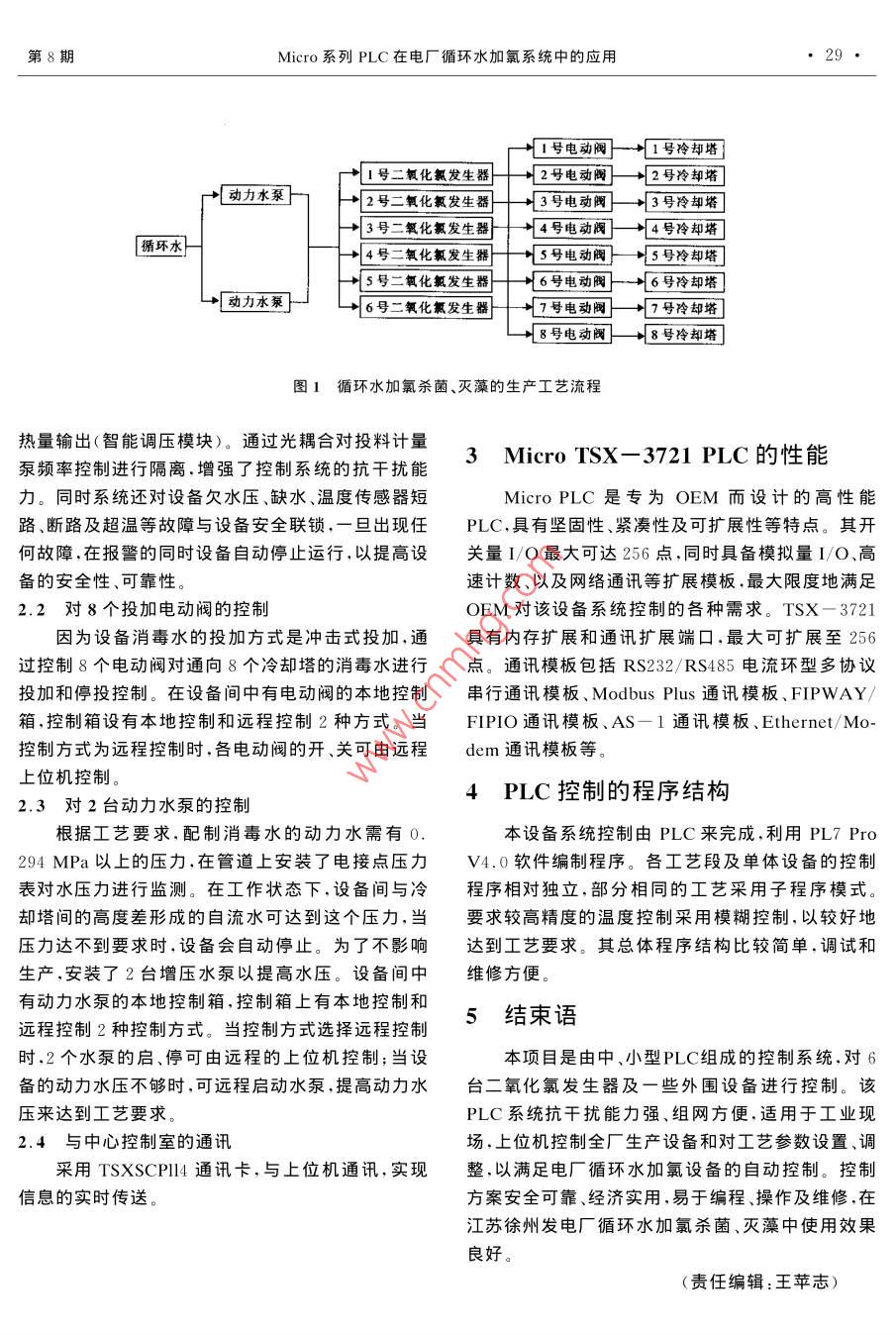 第25卷第8期電力建設(shè)2004年8月Electric power constructionAug,2004Micro系列PLC在電廠循環(huán)水加氯系統(tǒng)中的應(yīng)用趙楠,段宗杰,尉婕(山東山大華特科技股份有限公司,濟(jì)南市,250101)[摘要]徐州電廠循環(huán)水加氯殺菌、滅藻設(shè)備系統(tǒng)采用了PLC組成的控制系統(tǒng),該設(shè)備系統(tǒng)由6臺(tái)二氧化氯發(fā)生裝置、2臺(tái)增壓水泵、8個(gè)電動(dòng)閥及相應(yīng)的PLC系統(tǒng)組成。其工藝過程為取水及加壓、原料投加、設(shè)備加熱、消毒水投加。在設(shè)備系統(tǒng)中進(jìn)行了6臺(tái)二氧化氯發(fā)生器設(shè)備的控制、8個(gè)投加電動(dòng)閥的控制、2臺(tái)動(dòng)力水泵的控制,工作時(shí)可與中央控制室通訊,利用PL7ProⅤ4.0軟件編制程序。該設(shè)備系統(tǒng)在徐州發(fā)電廠循環(huán)水加氯殺菌、滅藻中應(yīng)用情況良好。[關(guān)鍵詞]循環(huán)水二氧化氯殺菌、滅藻PLC系統(tǒng)應(yīng)用中圖分類號(hào):TK223.51文獻(xiàn)標(biāo)識(shí)碼:B文章編號(hào):1000-7229(2004)08-0028-02Application of Micro Series PLC in Chloration System for Circulatingater in Thermal Power planZhao Nan, Duan Zongjie, Yu JieShandong Univercity Huate Technical Company Ltd, Jinan City, 250101circulating water; removing alga and sterilization by chlorinedioxide; PI C System; application徐州電廠循環(huán)水加氯殺菌、滅藻設(shè)備系統(tǒng),需要泵頻率來改變計(jì)量泵的轉(zhuǎn)速,以控制投加原料。安裝PLC系統(tǒng),下面敘述PLC在電廠循環(huán)水加氯(3)設(shè)備加熱控制。按工藝要求,通過對(duì)電加熱系統(tǒng)中的應(yīng)用管供電的控制來控制設(shè)備溫度,以提高原料反應(yīng)的1循環(huán)水加氯殺菌、滅藻的生產(chǎn)工藝轉(zhuǎn)化率(4)消毒水投加控制。消毒水的投加是分時(shí)沖徐州電廠循環(huán)水加氯殺菌、滅藻設(shè)備系統(tǒng)由6擊投加,所以在投加點(diǎn)安裝電動(dòng)閥對(duì)各個(gè)冷卻塔選臺(tái)二氧化氯發(fā)生裝置(包括原料投加和設(shè)備加熱)、2擇投加臺(tái)增壓水泵、8個(gè)電動(dòng)閥及相應(yīng)的PLC系統(tǒng)組成。該設(shè)備系統(tǒng)的二氧化氯制備采用氯酸鈉和鹽酸生產(chǎn)2循環(huán)水加氯殺菌、滅藻的控制方案二氧化氯的工藝,選用10,7kg/h復(fù)合二氧化氯發(fā)由于該設(shè)備系統(tǒng)選用6臺(tái)二氧化氯發(fā)生器裝生裝置各3套及配套設(shè)施,藥液計(jì)量采用計(jì)量泵,給置,需要控制的設(shè)備數(shù)量比較多,本系統(tǒng)采用PLC水穩(wěn)壓采用離心泵。除必要的調(diào)整和配藥外,無人來控制。PLC采用法國(guó)施奈德公司莫迪康值班,全套設(shè)備系統(tǒng)自動(dòng)控制。下面是其工藝過程,TSX3721PLC,該P(yáng)LC系統(tǒng)具有RS485標(biāo)準(zhǔn)通訊如圖1所示接口,可與上位機(jī)相連實(shí)現(xiàn)遠(yuǎn)程監(jiān)控;人機(jī)顯示界面(1)取水及加壓。通過循環(huán)水冷卻塔水位與設(shè)選用觸摸屏面板式PWS3260-FPN備間的水位差,冷卻水送至設(shè)備間與制備的二氧化2.1對(duì)6臺(tái)二氧化氯發(fā)生器的控制氯混合成消毒水。要求管道中有0.294MPa以上各采集點(diǎn)溫度控制自動(dòng)進(jìn)行,從Ptl00鉑熱電壓力,當(dāng)自流水壓力不夠時(shí),需開啟動(dòng)力水泵來提高阻輸入的溫度信號(hào)經(jīng)溫度變送器,轉(zhuǎn)換成4~20mA的水標(biāo)準(zhǔn)信號(hào)經(jīng)模擬量輸入通道采集,與溫度設(shè)定值②)原料投加控制。按工藝要求,通過調(diào)整計(jì)量進(jìn)行比較,通過運(yùn)算(PID方式,模糊計(jì)算),來控制第8期Micro系列PLC在電廠循環(huán)水加氯系統(tǒng)中的應(yīng)用29也號(hào)電動(dòng)閥心口號(hào)冷卻塔號(hào)二氧化氯發(fā)生器|2號(hào)電動(dòng)閥」→2號(hào)冷卻塔[動(dòng)力水泵2號(hào)二氧化氯發(fā)生器3號(hào)電動(dòng)閥3號(hào)冷卻塔3號(hào)二氧化氯發(fā)生器心4號(hào)電動(dòng)閥心4號(hào)冷卻塔循環(huán)水4號(hào)三氧化氯發(fā)生器心5號(hào)電動(dòng)閥}“5號(hào)冷卻塔5號(hào)二氨化氯發(fā)生器“6號(hào)電動(dòng)閥}心6號(hào)冷卻塔動(dòng)力水]6號(hào)三氧化氯發(fā)生器“7號(hào)電動(dòng)兩→號(hào)冷卻塔8號(hào)電動(dòng)閥]~8號(hào)冷卻塔圖1循環(huán)水加氯殺菌、滅藻的生產(chǎn)工藝流程熱量輸岀(智能調(diào)壓模塊)。通過光耦合對(duì)投料計(jì)量泵頻率控制進(jìn)行隔離,增強(qiáng)了控制系統(tǒng)的抗干擾能3 Micro TSX-3721PLC的性能力。同時(shí)系統(tǒng)還對(duì)設(shè)備欠水壓、缺水、溫度傳感器短Micro Plc是專為OEM而設(shè)計(jì)的高性能路、斷路及超溫等故障與設(shè)備安全聯(lián)鎖,一旦岀現(xiàn)仼PLC,具有堅(jiān)固性、緊湊性及可擴(kuò)展性等特點(diǎn)。其開何故障,在報(bào)警的同時(shí)設(shè)備自動(dòng)停止運(yùn)行,以提高設(shè)關(guān)量I/O最大可達(dá)256點(diǎn),同時(shí)具備模擬量I/O、高備的安全性、可靠性速計(jì)數(shù)、以及網(wǎng)絡(luò)通訊等擴(kuò)展模板,最大限度地滿足2.2對(duì)8個(gè)投加電動(dòng)閥的控制OEM對(duì)該設(shè)備系統(tǒng)控制的各種需求。TSX-3721因?yàn)樵O(shè)備消毒水的投加方式是沖擊式投加,通具有內(nèi)存擴(kuò)展和通訊擴(kuò)展端口,最大可擴(kuò)展至256過控制8個(gè)電動(dòng)閥對(duì)通向8個(gè