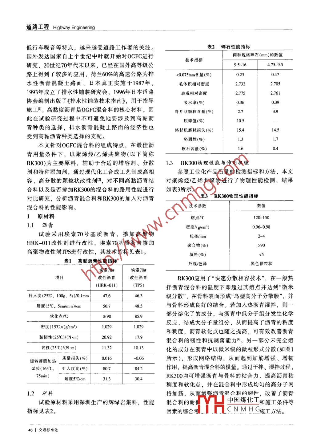 Highway Engineering道路工程聚烯烴/乙烯共聚物干法改性O(shè)GFC瀝青混合料路用性能研究劉永明,林汀2(1.江西省交通工程質(zhì)量檢測中心,江西南昌330038:2江西省交通運輸技術(shù)創(chuàng)新中心,江西南昌33003摘要:OGFC是一種具有透水、防滑、降噪等功能的開級配混合料。以聚烯烴/乙烯共聚物新型改性劑為研究對象,在分析和闡述共聚物改性機理的基礎(chǔ)上,采用干法拌合工藝,通過窒內(nèi)對比試驗,對不同OCFC瀝青混合料力學(xué)性能進(jìn)行研究。結(jié)果表明,在0CFC中加入聚烯烴/乙烯共聚物可有效提高混合料的抗車轍能力、殘留穩(wěn)定度以及抗裂性能。本研究可為聚烯烴/乙烯共聚物干法改性O(shè)GFC瀝青混合料的工程應(yīng)用提供理論依據(jù)和試驗數(shù)據(jù)。關(guān)鍵詞:瀝青混合料;OGFC;聚烯烴/乙烯共聚物;路用性能中圖分類號:U416.217文獻(xiàn)標(biāo)識碼:B文章編號:1002-4786(2013)01-0045-03Experimental Study on Pavement Performance of Polyolefin/EthyleneCopolymer Modified OGFC Hot Mixtures AsphaltLIU Yong-ming, LIN Ting(Jiangxi Provincal Traffic Engineering Quality Inspection Center, Nanchang 330038, China: 2 Jiangxi Provincal TransportationTechnological Innovation Center, Nanchang 330038, China)Abstract: Open graded friction course(OGFC) is an asphalt mixture with interconnecting voids that provideimproved surface drainage during rainfall and reducing traffic noise. Based on the aggregate grade of OGFC as-halt mixture the mechanical properties of polyolefin/ethylene copolymer modified hot mixtures asphalt(dry pro-cess)are studied by experimental tests. The test results indicate that the performance of anti-rutting, anti-cracking and water stability for modified asphalt mixture are greatly improved. The study can give a reference for theapplication of copolymer modified OGFC asphalt mixtureKey words: asphalt mixture; open graded friction course; polyolefin or ethylene copolymer; road performance0引言能、減少雨天濺水而設(shè)計,其設(shè)計空隙率高達(dá)20%OGFC( Open Graded Friction Courses)是一種具左右,降水時路表水可通過結(jié)構(gòu)層連通的空隙滲入有連通空隙的開級配抗滑磨耗層瀝青混合料。它結(jié)構(gòu)內(nèi)部并排走,有效地降低了表面積水所引起的起源于歐洲,在德國稱為大空隙或排水性路面,英水霧、濺水及眩光,增加路面表面粗糙度。由于國稱為大空隙率瀝青碎石,美國稱為開級配瀝青磨OGFC具有空隙率大、表面粗糙、雨天抗滑、減少耗層(oGFC)。OGFC主要是為提高路面的抗滑性水膜滑溜、提高雨季夜晚行車標(biāo)線的識別能力和降筆者深刻感到,只要注意施工中服務(wù)「2]鄧學(xué)軍.路基路面工程[M]的細(xì)節(jié),并能夠認(rèn)真對待,減少參考文獻(xiàn)北京:人民交通出版社,2008水泥混凝土路面早期斷裂并不是[孫忠義,王建華.公路工程「31JTGF30-2003,公路水泥混不可能的,會有更多高質(zhì)量的水試驗工程師手冊[M].北京:人中國煤化工規(guī)范S]」泥混凝土公路為經(jīng)濟和社會發(fā)展交通出版社,2003.CNMHG62013年1月第1期|45道路工程 Highway Engineering低行車噪音等特點,越來越受道路工作者的關(guān)注表2碎石性能指標(biāo)國外發(fā)達(dá)國家自上個世紀(jì)中葉就開始對OGFC進(jìn)行兩種規(guī)格碎石(mm)的數(shù)值技術(shù)指標(biāo)研究,20世紀(jì)70年代末以來,已經(jīng)在國外高等級公95-164.75-9.5路上得到了較多的應(yīng)用,荷蘭60%的高速公路為排<0075mm含量(%)水性瀝青混凝土路面,日本真正實施于1987年毛體積相對密度2.7321993年成立了排水性鋪裝研究會,1996年日本道路表觀相對密度2.7752.761協(xié)會編制出版了《排水性鋪裝技術(shù)指南》,用于指導(dǎo)吸水率(%)0.39施工叫。高黏度瀝青是OCFC混合料的核心材料,因針片狀顆粒含量(%)此在試驗研究過程中不可避免地要涉及到高黏瀝壓碎值(%)105青種類的選擇,排水瀝青混凝土路面的經(jīng)濟性也洛杉磯磨耗損失(%)154受到高黏瀝青種類選擇的支配堅固性(%)本文針對OGFC混合料的組成特點,在最佳瀝軟石含量(%)04青用量條件下,以聚烯烴/乙烯共聚物(以下簡稱RK300)為主要原料,輔助于合適的增容劑、分散1.3RK300物理性能與作用機理劑和特種添加劑,通過現(xiàn)代化工合成工藝制成高相參照工業(yè)化產(chǎn)品質(zhì)量的檢測指標(biāo)和方法,本文容、高分散的顆粒狀改性劑四,對不同高黏瀝青結(jié)對聚烯烴/乙烯共聚物進(jìn)行了物理性能檢測,結(jié)果合料以及是否摻加RK300的混合料的路用性能迸行如表3所示。對比研究,分析瀝青混合料和RK300的加入對瀝青表3RK300物理性能指標(biāo)混合料的性能影響。技術(shù)參數(shù)數(shù)值1原材料熔點C120-1501.1瀝青密度/(g/cm3)0.96-0.98試驗采用埃索70號基質(zhì)瀝青,摻加高聚物HRK-011改性劑進(jìn)行改性,埃索70基質(zhì)瀝青摻加聚合物(%)高聚物改性劑TPS進(jìn)行改性,其技術(shù)指標(biāo)見表1。填料(%)表1高黏瀝青性能指標(biāo)外觀/色澤黑色顆粒狀埃索70#埃索70#項目改性瀝青改性瀝青RK300應(yīng)用了“快速分散相容技術(shù)”,在一般熱(HRK-011)(TPS)拌瀝青混合料的溫度下即超過其熔點并達(dá)到“微米針入度(25℃,100g,5s)/0.1mm47.646.3級分散”,在骨料表面形成“島型高分子分散膜”,并延度(5℃,5 cm/min)cm50.748.5與骨料形成良好的結(jié)合。若加入熱瀝青濕拌,則軟化點859部分熔化了的成分,與瀝青中低分子組分發(fā)生化學(xué)反應(yīng),結(jié)成大分子量組分