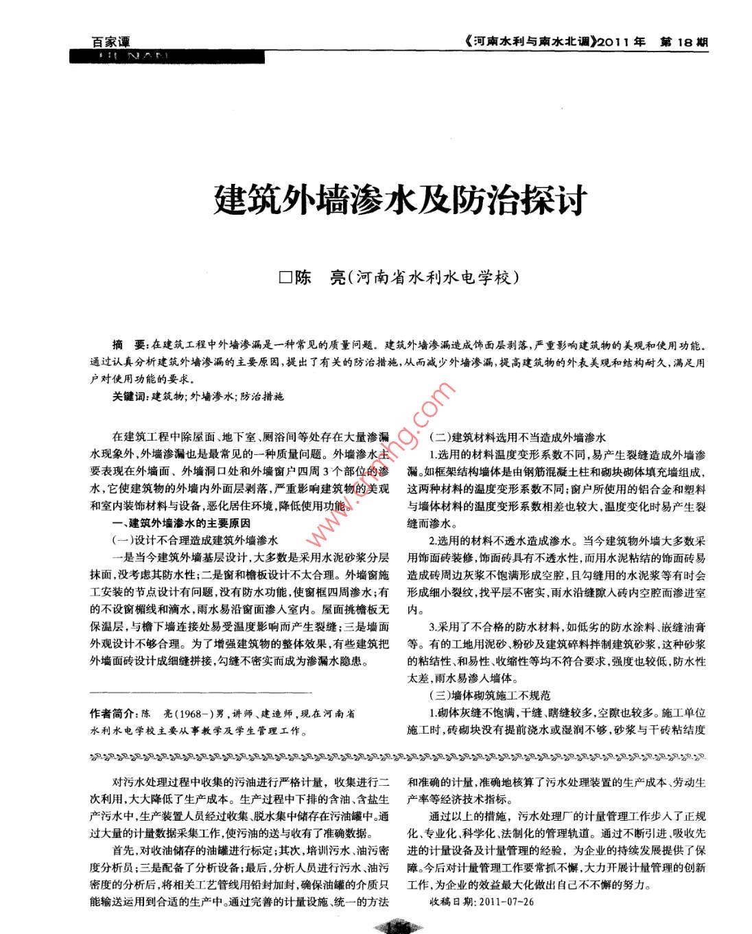 《河南水利與南水北調(diào)》2011年第18期百家譚I HENAN污水處理中的計(jì)量管理口石冬梅(山東東明化工股份有限公司)摘要:在污水處理企業(yè)中 計(jì)量器具的管理對(duì)企業(yè)的發(fā)展起著至關(guān)重要的作用,文章從計(jì)量的基礎(chǔ)管理、方案完善、提高操作精度等幾個(gè)方面提出了加強(qiáng)計(jì)量管理的措施。本文從計(jì)量管理制度,先進(jìn)計(jì)量器具,完善管理方案,計(jì)量考核等方面,對(duì)污水處理中的計(jì)量管理進(jìn)行了探討。關(guān)鍵詞:污水處理;計(jì)量;管理山東方明污水處理廠承擔(dān)著山東東明化工股份有限公司目前,根據(jù)不同的工藝狀況介質(zhì),采用的不同的計(jì)量手段,的污水處理任務(wù)及處理后污水的綜合利用,為周邊農(nóng)村的農(nóng)田本著 先進(jìn)科學(xué)節(jié)約成本的原則,污水處理廠的裝置已實(shí)現(xiàn)了進(jìn)灌溉和生態(tài)環(huán)境的改善做出了很大的貢獻(xiàn)。污水處理廠根據(jù)生出水的準(zhǔn)確計(jì)量,已經(jīng)具有數(shù)字超聲波流量計(jì)、明渠流量計(jì)電產(chǎn)工藝的特點(diǎn)和現(xiàn)場(chǎng)的實(shí)際情況提出了計(jì)量精確管理原則,三磁流量計(jì)等計(jì)量方式。年來(lái)的運(yùn)行收到了較好的效果。三、強(qiáng)化計(jì)量管理,制定完善的管理方案一建立健全企業(yè)計(jì)量管理體系,制定各種計(jì)量管理制度污水處理能力是否達(dá)到要求,與污水處理中間過(guò)程計(jì)量手任何一個(gè)企業(yè),要取得效益的最大化,生產(chǎn)數(shù)據(jù)分析很重段有 著緊密的聯(lián)系。目前的先天不足,幾乎所有的中間處理池要,生產(chǎn)數(shù)據(jù)的真實(shí)性對(duì)指導(dǎo)生產(chǎn)運(yùn)行至關(guān)重要,計(jì)量器具的都沒(méi)有進(jìn)行計(jì)量,處理池的液位、流量全部依靠操作人員的經(jīng)準(zhǔn)確性是根本關(guān)鍵,因此全面開(kāi)展精確的計(jì)量管理是企業(yè)效益驗(yàn)。提高污水處理裝置的中間處理過(guò)程的計(jì)量監(jiān)控在這種情況的核心管理。制定詳實(shí)的計(jì)量規(guī)章制度.開(kāi)展計(jì)量討論分析交下 尤為重要,污水的處理時(shí)間、處理池的液位流量,是三個(gè)必須流會(huì),從思想上.行動(dòng)上計(jì)量管理工作不能有半點(diǎn)松懈與馬虎,監(jiān)控的參數(shù), 如果出現(xiàn)高濃度的污水在中間處理池停留五十分嚴(yán)格執(zhí)行計(jì)量管理制度。鐘,而低濃度的污水卻停留3h,勢(shì)必會(huì)造成處理成本將大大提二、配備合適先進(jìn)的計(jì)量器具,是做好計(jì)量管理工作的基礎(chǔ)高?;谶@種狀況,自己制作了簡(jiǎn)易浮子標(biāo)尺。它的工作原理很沒(méi)有準(zhǔn)確可靠的計(jì)量器具作為檢測(cè)手段,管理無(wú)從做起,簡(jiǎn)單就是利用浮力平衡原理,簡(jiǎn)和帶有標(biāo)尺隨著處理池液位的也就是說(shuō)沒(méi)有調(diào)查就沒(méi)有發(fā)言權(quán),沒(méi)有數(shù)據(jù)作支撐計(jì)量管理工增加或減少,浮在液面上的浮簡(jiǎn)標(biāo)尺也會(huì)跟著上升或下降,從而作毫無(wú)意義。根據(jù)污水處理的整個(gè)工藝過(guò)程全面考慮,對(duì)進(jìn)水得到了 液位的準(zhǔn)確數(shù)據(jù)。加強(qiáng)了中間過(guò)程計(jì)量控制手段,提高流量、出水流量、新鮮水、電、汽、風(fēng)等能源計(jì)量設(shè)備進(jìn)行配備并處理過(guò)程的工藝控制精度、提高效益最大化,降低生產(chǎn)過(guò)程成本進(jìn)行嚴(yán)格管理,實(shí)時(shí)掌握生產(chǎn)數(shù)據(jù)。達(dá)到了預(yù)期的計(jì)量目的。在污水處理企業(yè)做好自來(lái)水的水量.水溫真實(shí)測(cè)量是至關(guān)四、開(kāi)展計(jì)量考核手段,提高員工生產(chǎn)操作精度重要。那么對(duì)水量的計(jì)量要針對(duì)裝置的進(jìn)水方式,采取靈活污水處理廠的裝置,從建設(shè)初期的計(jì)量手段一無(wú)所有 ,到現(xiàn)的適用的計(jì)量手段。- 般來(lái)說(shuō)安裝明渠流量計(jì)t建施工量非在的污水處理裝置運(yùn)行DCS監(jiān)控,計(jì)量水平得到質(zhì)的提高。因常龐大,投資費(fèi)用相當(dāng)大,測(cè)量精確度不高;另-方面考慮到安為 計(jì)量設(shè)施的完善,是確保污水合格排放的技術(shù)基礎(chǔ)。從污水裝電磁流量計(jì)由于管道直徑為DN500mm,投資也十分可觀,且流人裝置的水量、水溫到向處理水體中定額投人化工原材料,從水體中含有大量的雜質(zhì)及油污,不能保證計(jì)量精度。針對(duì)以上工藝流程的監(jiān)控到污水的處理質(zhì)量的檢驗(yàn)都離不開(kāi)計(jì)量指標(biāo)。兩種情況,筆者查閱大量的資料,研究如何精確計(jì)量、如何降低開(kāi)展對(duì)計(jì)量器具的檢定與校準(zhǔn)管理,對(duì)給每-臺(tái)計(jì)量器具的投投資成本、如何做到日常維護(hù)的方便,并與多位同行業(yè)者交流,用情況完好情況、準(zhǔn)確度情況每周-次進(jìn)行檢查與考核,對(duì)管最后得出結(jié)論,采用數(shù)字超聲波流量計(jì),插入式探頭(傳感器)理責(zé)任人與當(dāng)班操作員分別了解情況,對(duì)出現(xiàn)故障的計(jì)量器具在不停工情況下可以安裝、維護(hù),且管道正好在安裝測(cè)量范圍要跟蹤對(duì)維修過(guò)程結(jié)果都要嚴(yán)格監(jiān