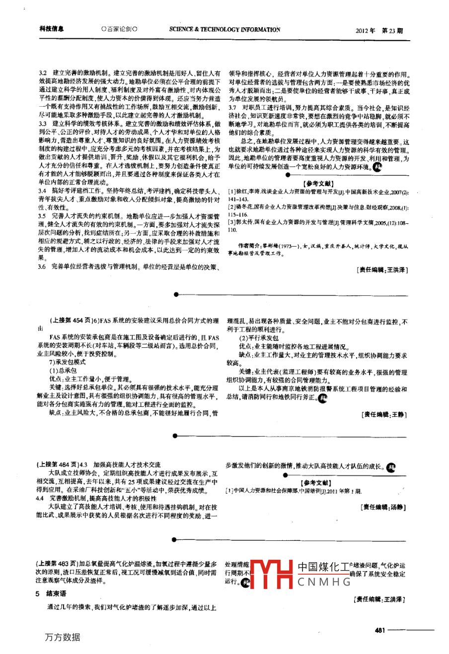 科技信息O百家論劍OSCIENCE TECHNOLOGY INFORMATION2012年第23期GE水煤漿氣化爐堵渣原因及預(yù)防措施靳明亮馮斌梁娜(兗州煤業(yè)榆林能化有限公司陜西榆林719000【摘要】介紹了CE水媒漿氣化堵渣原因,并提出了相應(yīng)的措施,通過(guò)釆取措施后氣化爐未出現(xiàn)過(guò)堵渣現(xiàn)象?!娟P(guān)鍵詞】GE氣化;堵渣;預(yù)防措施兗州煤業(yè)榆林能化有限公司60萬(wàn)噸甲醇廠采用GE水煤漿加壓3.1原料煤質(zhì)原因化工藝屬兩相并流加壓氣化氣。濃度約59-62%的煤漿通過(guò)煤漿給煤的灰熔點(diǎn)高致使氣化爐操作溫度高系統(tǒng)熱負(fù)荷大導(dǎo)致下降料泵加壓后與高壓氧氣(純度996%以上)通過(guò)工藝燒嘴進(jìn)入氣化爐,管水膜被蒸發(fā)破壞、下降管掛渣;原煤粘溫特性差、操作彈性小,溫度反應(yīng)生成粗合成氣煤中的灰分在高溫下被熔化產(chǎn)生熔渣,與反應(yīng)生稍有波動(dòng)即導(dǎo)致灰渣粘度波動(dòng)容易粘結(jié)、堵塞渣口及下降管。成的粗煤氣并流經(jīng)渣口及下降管進(jìn)人到激冷室粗煤氣被冷卻并為水原料煤灰熔點(diǎn)汽所飽和,出激冷室后飽和氣送入洗滌塔進(jìn)行洗滌后送至變換系統(tǒng)。變形溫度DT℃1220而沉降在激冷室底部的渣及少量沒(méi)有燃燒的炭,通過(guò)破渣機(jī)進(jìn)入鎖軟化溫度sT1290斗通過(guò)鎖斗排入渣池。其中排渣正常是氣化爐安全穩(wěn)定運(yùn)行的重要流動(dòng)溫度1310方面,我廠因堵渣致系統(tǒng)停車就達(dá)10次之多。1氣化爐堵渣分類11氣化爐激冷室堵渣要是由于激冷后的大塊爐渣在破渣機(jī)上架橋?qū)е聽(tīng)t渣不能順利進(jìn)人鎖斗而出現(xiàn)堵渣現(xiàn)象。在激冷室堵渣后需在系統(tǒng)停車降溫后進(jìn)人氣化爐激冷室進(jìn)行清渣清理完畢后再烘爐升溫。12氣化爐下降管堵渣主要是指渣在流動(dòng)過(guò)程中粘結(jié)在下降管上,致使下降管掛渣,導(dǎo)致合成氣偏流或下降管燒穿。在下降管堵渣后需在系統(tǒng)停車降溫后進(jìn)入氣化怕懶燒家講行清:如下降管被燒穿環(huán)雪事?lián)Q下降管圖2原料煤粘溫特性曲線32氣化爐操作工況由于原煤粘溫特性差、氣化爐容易堵渣,在發(fā)現(xiàn)渣口堵時(shí)提高中心氧比例及氣化爐操作溫度進(jìn)行熔渣由于爐溫的提高及中心氧比例提高是同時(shí)進(jìn)行,容易導(dǎo)致大塊渣直接從渣口脫落在破渣機(jī)上形成架橋,導(dǎo)致氣化爐激冷室堵渣;同時(shí)由于提高中心氧導(dǎo)致中心氧比例過(guò)高(最高達(dá)到21-22%)中心氧比例大造成渣口處溫度高加劇了下降管水膜破壞,也導(dǎo)致了下降管堵渣4預(yù)防措施41改善煤質(zhì)圖1下降管堵渣照片針對(duì)氣化用煤灰熔點(diǎn)高及粘溫特性差的問(wèn)題根據(jù)原煤及煤灰分析結(jié)果,在煤中添加合適的助熔劑,以降低煤灰熔點(diǎn)、改善粘溫特性,2氣化爐堵渣時(shí)的現(xiàn)象增加氣化爐操作彈性。改善后煤灰熔點(diǎn)2.1氣化爐渣口壓差上漲變形溫度DTTC1125在正常運(yùn)行時(shí)氣化爐渣口壓差穩(wěn)定,當(dāng)渣口壓差上漲時(shí)表示此軟化溫度ST1254時(shí)氣化爐渣口或下降管堵渣。流動(dòng)溫度22鎖斗與氣化爐壓差下降42優(yōu)化操作在正常集渣時(shí)鎖斗壓力稍高于氣化爐壓力爐渣依靠自身重力隨針對(duì)由于操作原因?qū)е碌臍饣癄t堵渣,編制氣化爐操作注意事鎖斗循環(huán)水進(jìn)人鎖斗以確保正常排渣。正常集渣時(shí)鎖斗與氣化爐壓差項(xiàng)在操作中嚴(yán)格按照操作注意事項(xiàng)進(jìn)行執(zhí)行避免由于操作工況的恒定,如鎖斗與氣化爐壓差偏低代表此時(shí)渣量偏少、氣化爐堵渣;在堵大幅度變化導(dǎo)致氣化爐堵渣渣嚴(yán)重時(shí)鎖斗壓力甚至?xí)陀跉饣癄t壓力正常運(yùn)行時(shí)控制中心氧比例15-16%,調(diào)節(jié)時(shí)以氣化爐上下溫差2.3鎖斗循環(huán)泵出口流量下降不超過(guò)50℃為宜避免中心氧比例過(guò)大破壞激冷水膜(設(shè)計(jì)中心氧比在正常集渣時(shí)由鎖斗經(jīng)鎖斗循環(huán)泵進(jìn)入氣化爐的循環(huán)水量一定,例為15%)。在激冷室堵渣時(shí)鎖斗循環(huán)泵出口流量就會(huì)下降嚴(yán)重時(shí)此流量甚至?xí)刂蒲趺罕茸罡?70,以高壓煤漿泵DCs給定值(即煤漿轉(zhuǎn)速流降至0量)和煤漿濃度為計(jì)算依據(jù),并參考煤漿流量實(shí)測(cè)值計(jì)算氧煤比監(jiān)控24在系統(tǒng)穩(wěn)定運(yùn)行時(shí)撈液機(jī)電流隨鎖斗排渣呈現(xiàn)周期性變化其波比過(guò)高直撈渣機(jī)電流減小cH4含量和佇中止立比數(shù)石曾缸不打量導(dǎo)致實(shí)際氧煤中國(guó)煤化工峰波谷數(shù)值恒定,如出現(xiàn)氣化爐堵渣,撈渣機(jī)電流會(huì)偏小;如堵渣嚴(yán)重一冷水流量的加大,激冷時(shí),撈渣機(jī)電流會(huì)一直穩(wěn)定在波谷,此時(shí)代表氣化爐未排渣水分布CNMH時(shí)調(diào)整激冷水量激冷3氣化爐堵渣的原因水量就高不就低以保護(hù)激冷環(huán)及下降管渣口壓差出現(xiàn)波動(dòng)后,中心氧盡量保持穩(wěn)定,增(下轉(zhuǎn)第481頁(yè))科技信息O百冢論劍OCIENCE& TECHNOLOGY INFORMATION2012年第23期32建立完善的激勵(lì)機(jī)制。建立完善的激勵(lì)機(jī)制是用好人留住人有領(lǐng)導(dǎo)和指捍核心,經(jīng)營(yíng)者對(duì)單位人力資源管理起著十分重要的作用。提