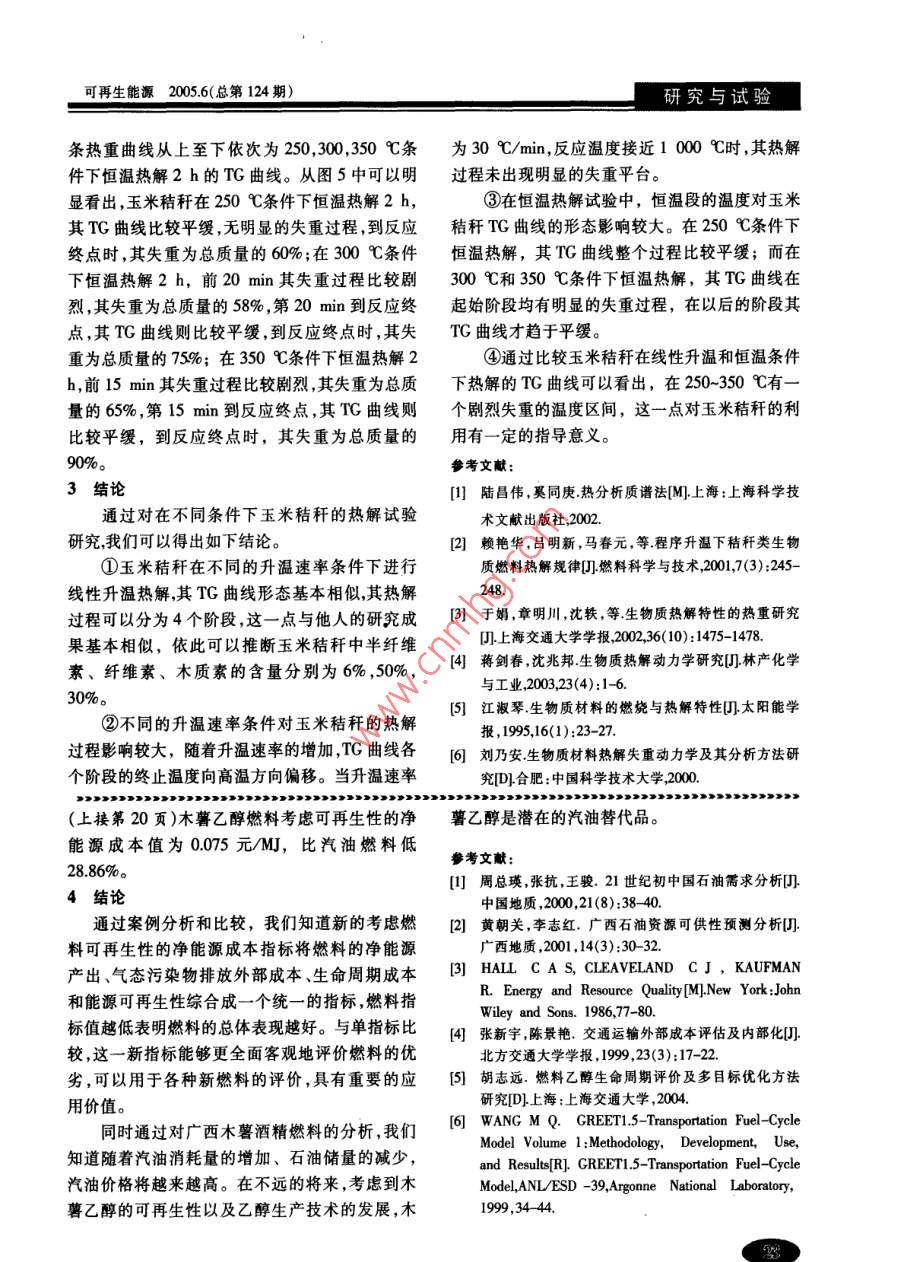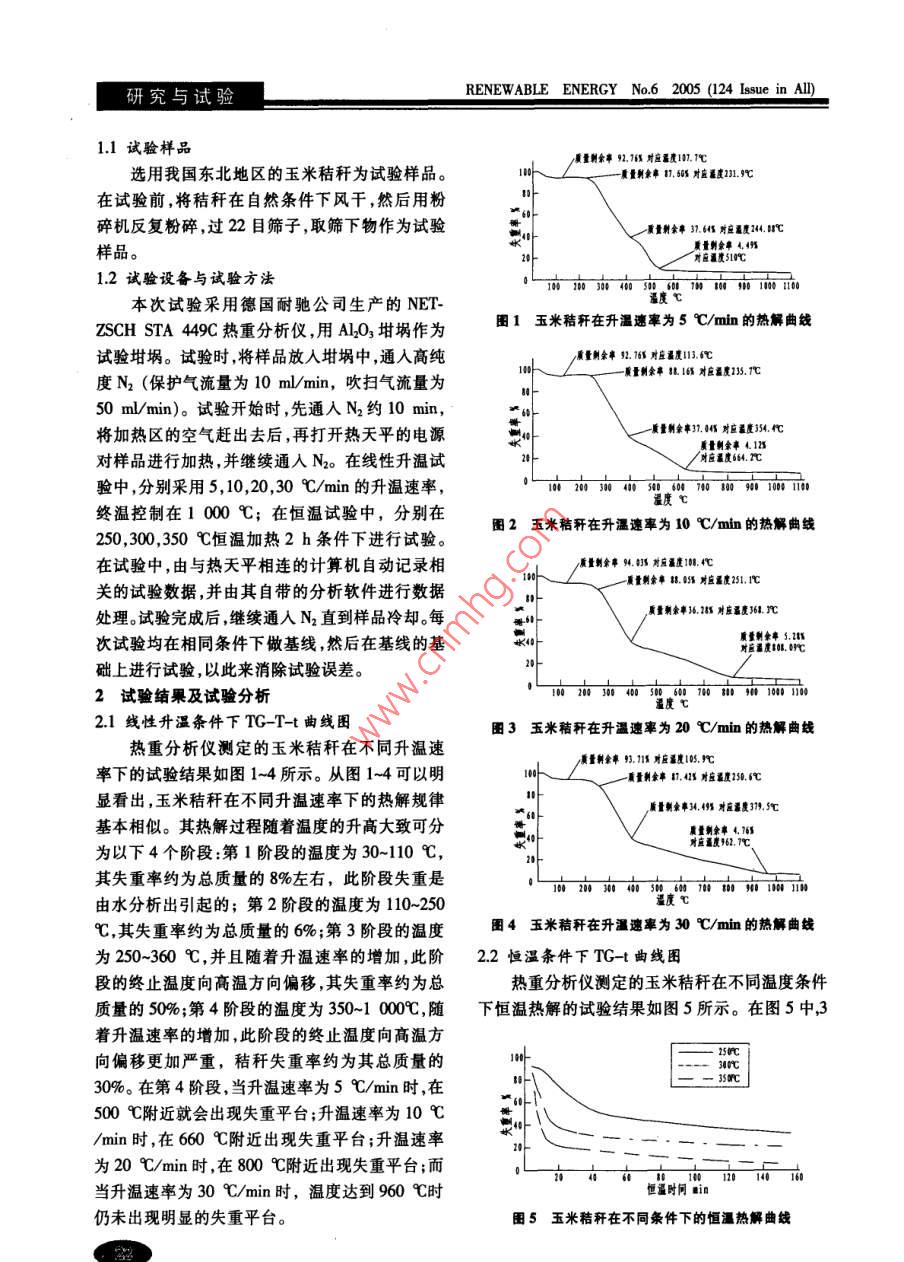 可再生能源20056(總第124期)研究與試驗玉米秸新熱解規(guī)律聊試驗研置周新華,齊慶杰,郝宇,吳憲(遼寧工程技術(shù)大學(xué)土木建筑工程學(xué)院,遼寧阜新123000)摘要:用熱重分析法對玉米秸稈的熱解規(guī)律進行了研究,分析了玉米秸稈樣品在不同升溫速率(5,10,20,30℃/min)不同溫度(250,300,350℃)恒溫加熱2h條件下熱解的試驗結(jié)果發(fā)現(xiàn)樣品的非等溫失重過程由脫水、保持、劇烈失重和緩慢失重4個階段組成并且在相同條件下,樣品的質(zhì)量對玉米秸稈熱解有一定的影響在恒溫熱解過程中,在不同的恒溫溫度條件下,秸稈失重曲線形態(tài)基本相似但在300℃條件下,恒溫熱解的熱重曲線與250,350℃條件下恒溫熱解的熱重曲線相比較為平緩。關(guān)鍵詞:生物質(zhì);熱解;熱重分析;升溫速率;恒溫中圖分類號:S216.2;TK6文獻標識碼;A文章編號:1671-5292(2005)060021-03The experimental research on the pyrolysis characteristicsof corn stalk at the different conditionsZHOU Xin-Hua, QI Qing-jie, HAO Yu, WU Xian(Institute of Civil and Architecture Engineering, Liaoning Technical University, Fuxin 123000, China)Abstract: The paper researches the pyrolysis characteristics of corn stalk by utilizing themethod of thermogravimetric analysis. It analyses the experimental results with the samplesof corn stalk kept at the constant temperature for two hours at the different heating rate(5℃、10℃、20℃、30℃/ min)and different temperatures(200℃、250℃、300℃、350℃), the re-sults show that the unisothemal weightlessness process of the sample is made up of fourinclude the deprivation dramatic weightlessness and slow weightlessness and italso shows that the mass of samples has effect on the pyrolysis of corn-straw at the sameonditions. During the pyrolysis process of isothermal temperature, the corn-straw's TG curvesare very similar at the different isothermal temperatures, but the thermogravimetric curves ofconstant temperature pyrolysis at the 200 Cand 300 C are smoother than it is at the 250 Cand350℃Key words: biomass; pyrolysis; thermogravimetric analyzer; heating rate; constant temperature生物質(zhì)能是僅次于煤炭、石油、天然氣的第四成為高品位能源就更具有發(fā)展前景。近年來,關(guān)大能源約占全球總能源消耗的14%,生物質(zhì)資源于玉米秸稈的熱解特性,國內(nèi)外研究者已提出作為一種相對穩(wěn)定的可再生資源已為世界各國所些有價值的結(jié)論和見解。本文針對玉米秸稈重視。在我國農(nóng)村地區(qū),生物質(zhì)能的利用比例更大,在線性升溫和恒溫條件下的熱解特性進行了研約占農(nóng)村總能耗的43%。玉米秸稈作為生物質(zhì)的究,為深人研究玉米秸稈熱解機理提供了基本主要組成部分,其利用形式也越來越受到人們的數(shù)據(jù)。關(guān)注。在這種背景下,發(fā)展生物質(zhì)能轉(zhuǎn)化技術(shù)使之1試驗設(shè)備及試驗條件收稿日期:2005-07-21基金項目:遼寧工程技術(shù)大學(xué)?;鹳Y助項目(04A01004)作者簡介:周新華(1975-),男,碩土研究生,講師,主要從事生物質(zhì)熱解規(guī)律及燃燒過程中污染物析出規(guī)律等方面的研究研究與試驗RENEWABLE ENERGY No 6 2005(124 Issue in All)1.1試驗樣品重量射余事92.1級對應(yīng)溫度1T選用我國東北地區(qū)的玉米秸稈為試驗樣品??戳渴U侣?.501對應(yīng)遙度119℃在試驗前,將秸稈在自然條件下風干,然后用粉碎機反復(fù)粉碎,過22目篩子,取篩下物作為試驗重量射余31.641對應(yīng)灌度244.℃樣品。質(zhì)量剩余率4應(yīng)溫度5141.2試驗設(shè)備與試驗方法1轉(zhuǎn)441:l本次試驗采用德國耐馳公司生產(chǎn)的NETZSCH STA449熱重分析儀,用AlO3坩堝作為圖1玉米秸稈在升溫速率為5℃/mn的熱解曲線試驗坩堝。試驗時,將樣品放入坩堝中,通入高純項量別余率52.76對應(yīng)溫度11.℃度N2(保護氣流量為10m/min,吹掃氣流量為量余慧16對應(yīng)溫度13.℃50ml/min)。試驗開始時,先通入N2約10min,將加熱區(qū)的空氣趕出去后,再打開熱天平的電源質(zhì)量剩余率31.4對應(yīng)蓋度154.質(zhì)量剩余率41對樣品進行加熱,并繼續(xù)通入N2。在線性升溫試對應(yīng)溫度64.℃驗中,分別采用5,10,20,30℃/min的升溫速率終溫控制在1000℃;在恒溫試驗中,分別在圖2玉米秸稈在升溫速率為10℃/min的熱解曲線250,300,350℃恒溫加熱2h條件下進行試驗。在試驗中,由與熱天平相連的計算機自動記錄相質(zhì)量制余摹9對應(yīng)溫度]關(guān)的試驗數(shù)據(jù),并由其自帶的分析軟件進行數(shù)據(jù)量剩余.4對應(yīng)遙度251,1℃處理。試驗完成后,繼續(xù)通入N2直到樣品冷卻。每質(zhì)量剩余事35.28對應(yīng)溫度31把次試驗均在相同條件下做基線,然后在基線的基對直通度L.罰C礎(chǔ)上進行試驗,以此來消除試驗誤差。2試驗結(jié)果及試驗分析2.1線性升溫條件下TCTt曲線圖圖3玉米秸稈在升溫速率為20℃/min的熱解曲線熱重分析儀測定的玉米秸稈在不同升溫速質(zhì)量剽余事91對應(yīng)遙度10究率下的試驗結(jié)果如圖1-4所示。從圖1~4可以明看量剽食率141對應(yīng)度2.℃顯看出,玉米秸稈在不同升溫速率下的熱解規(guī)律質(zhì)量剩余率34,45對課度31.5℃基本相似。其熱解過程隨著溫度的升高大致可分直遙度形62為以下4個階段:第1階段的溫度為30-110℃,其失重率約為總質(zhì)量的8%左右,此階段失重是由水分析出引起的;第2階段的溫度為110~250逼度℃℃,其失重率約為總質(zhì)量的6%;第3階段的溫度圖4五米秸稈在升溫速率