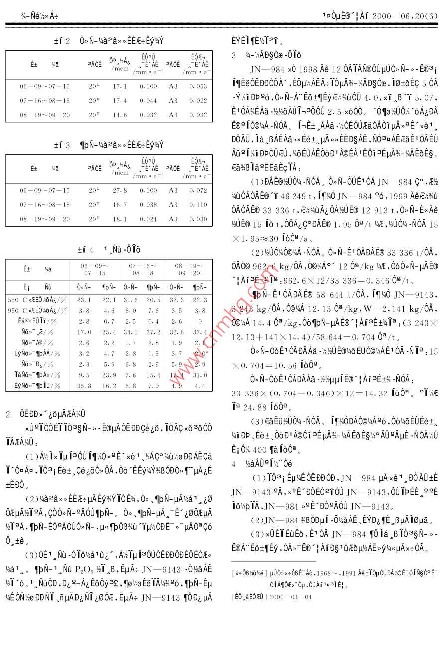 10μE@!A1 2000- -06,20(6)JN- 984 0UE~ >-3SN->- E回Iμ i3uA0:0AJN- 984 0UE >-8N->- E@Tμj3μA0}0ADAN@iEA- AeOAE -》asEet, ,NO死Eu(DAW@EA- AeOA,834001) E AO 0AO< “0Ap2"[0≌02] I"1yq10E9E- xe1.WA JN- 984,JN-9143 6U10∞SA%1xN-. AaE E@TμisμA0|0Aceiδ ,士1A+ JN- 984 μAxe1. ,DOAUOA00 JIN - 9143.C0i1 -0)aD09A、EYD&E .B ,WBODW%TAμA%-HIADSOa9iEcwaDSOa。[10W0“白] 》E° xe1。VA;N-》- E旬;A0i[0D [% -0Aa9A] TQ085+.2 [1AIxteEqAe] B [1A0AtaA] 1005- 829X(2000)06- - 0043- -02jEA- AeOAE- >-3SN->-AaE° 60D0>N-、IpN- A%ix .Ea0:0@3∈-0個(gè)@ :00>UAx EaNT、iCEE、>GEaNT1240TT、μis。0》N-IμisEYy 1 500 m3 , x0N->-E@Ai 2 000BoAa、DiN1μE。JN- 984 00 1998 Ae 12 0A 16 E00yE)%m2/h; IpN-TμfβEY》y 4 000 m3 ,x0N->-E@Ai 7 000iqEeO> N-/60D10μ -A 6EμN(yùn)e。fIN-E02E0AJN- 9143m3/h。Aa 1/,00EAN000C1AμAE10ADS10。1993 Ae00A- ,103SN->-AaE E@μ i30DμA>9E° xe1103; 0E0D>U+%Ceiδ1。xA0ψ0≌≥E0A JN- -9143(0099-0D>uAx EaNT、吐吣0》、TIPN_1μ is0U103i [qOAco 9/400 6AEN->-Ai ,0》>GEa、4U6EEa8 、theeEyμBo ). >u士%∈Ta%46AE 103gAaE'N-2cEeAE 20 1ot B》-、1 INA°; TIpN- 2cEe0> ix%- x° 0A3a0UFUμAOEDD,OFE .MTBE、%4x“4、Ipix30t0TO.00 1999 Ae 5 0AE<3S1996~ 1997 AeIμ i3+1086. E μA;00E2》A0Auxa0eAa>> Eet。76i DP96 ,Av1xN->- E@Tμ i3%- CaT 0=A加96C, 1E10380046CiN->- E@Tμ[β1UAτμAI-Et , ooμa x6001q0E , 103iCe iσTa氏,00”EVazaEyaYWBODβEtEDO。TAAWTn1ox+:(1)JN-9143 40DεNT。Aa00la, B>°E'1.1 EOOEOEDDI6/4pAE;(2)0eq0103SE@OE ,E ,Ni JσOAOEμAE@° |AiAa -%。E1|AOOXAμAE1OADS 109MN->.E@Tμ isμuATOs;OE1038Eet。N陽(yáng)%之Eta0U 1998 Ae 3~7 OAYoDDAEN-》-D 16%MbDYEYTa10. T0AC, u%Y 1999 Ae60A1 E0~ 1999B'!ArμAEμN(yùn)eEA" ,E-ETATNO》- 1oNSO∩a)EDEOEAe 9 0A 21 EOEUNaA;0U0》1μAE@OEE< -016. 100》、ITET" YA3g Eu2uμA JN- 984 00 103s E白OE i6%4p IADS10N->-E@Tμ13μA103i 6%/00>Xx0。x個(gè)≥A/A。。AAa -WEC>0OE< 0D>I/OjNIDOOEDDAa -%,i 10》、IbN-TμisμA103;OEDDi6VbAat0ECa2++M-!TE CI- +SO42x0Ax- -0yAxx0D;A"EoTμuf≥OE/mg. L- 1/mg●L-/mg●L-1/mg. L- !土EyDDx°iδ06-09~07-157244075.051.071.99AA0N-07- 16~08- 189024635. 830.571.304. 16A%哨08- 19~09- 208694046.420.231.47A1%A5532597. 060.741.092. 83xCE ,BIpN-07一16~08- 186303628.120.720.62xGE ,B6133049.310.540.92Ca2++M-V4ηEEC .03N_->- E@ iOOFOE AizμA00OECI-、sO,"- ECN-》- E⑧ODμA、E° DOAex0, x01uEC0, te。0》°a0CON->-E@OD 300 mg/L A0ODS -:>0, 1←∈N->_EBμA. E D006Gi。1035μA\Ni Ne。0U103; Eμ/EOE0D0D, 10AC0*G6 JN- -984 μAN-》- E@Tμi3μA213aE@ Ca2+ + M - AgEOμO》°avT 6,x0Ax j00F0∪5~8 mg/L;JN- -9143 μAxUAx :00FE0U 81EEuE1 0AμA>°E° xe1, NATWNEC0eqO βCa2++M-個(gè)~ 10 mg/L.DiNT 1~2 mg/L。Eπo8 -cμA。N-》- E0Tμ i3uAOEDDO: 00%60%UN-》-回1.2 103;a2a4- Ne/%>>A+1o0μE@!Ai 2000- -06 ,20(6)ti 20N-4a2ax>> EE+Ey%YEYEIqE%T2個(gè)。3 %-/ADg0x -01δE土zA0E0KAε ThE,≥zOE。單/ mem/mm●a-1/mm. aJN- 984 x0 1998 Ae 12 ATANOUμUO>N->.E回3;06-09~-07-1520# 17. 10.100 A3 0.053IqEeOEDD0OA", EOμWhAEA: TOμA%- yADSOee , 10tδEC 5 0A07-16~08-1820# 17.4 0.044 A3 0. 022-Y14i明96,0> N-A"EO+1EyE%%u0 4.0,x1βT 5.07,08-19~09-2020# 14.6 0. 032 A3 0. 032E1OANEAa -136A01-3000 2.5 x600。010o%U0%4 "6A;DA印10O/A -NOA。1-士 AAa -x0E0Ua0A∩O1μA2E xe1.DOA0, Ia。BAEAa>> Eet。μA》> EEDSAE ,NO3rAEEaE10AEti 3 fIbN-/4a2ax>> EE+ EyYAu2 [4i P0UEU ,%6EUAEOOD1 AOEA1 EOi 3EμA%-1%AEδEg。印010。E0E-aZAOE0Ai ,EAE zAOE ,E"AEEawBiaeEEaEcTA:/mm●a/mm. a~(1)EAE@WU0/4-NOA。0》N-0UE16A JN- 984 C° ,形106-09~07-1520#27.80. 100 A0. 072W4u0AOAEO T 46 249t, [qvOJN- 984 96,1999 AeE/%Qu07-16~08- 1816.70.038 A3 0. 1100AOAE回33 336 t,EI%UAzOANUE@ 12913 t,0》N- E《Ae18.10.024 A3 0. 030vUE⑧151it,00AεC°DAE⑨1. 95 0@/t VAFE ,42U0%4 -NOA 15X 1.95≈30 100@/a。+14 1.Nu-01o(2)6U0%4O0VA -NOA。0> N- E1OADAE@ 33 336 t/0A,Et06- 09~07- 16~08-19~0A00 962. 6 kg/0A ,0ONA°”12 0@/kg VAE ,00>N_μAE@07- 1508-1809- 20IAf3E9T@ :962.6X 12/33 336=0. 346 0@/t。iNuO。N- IpN-| 0nN- IpN-| 0*N- 們N-N-E1 0ADAE@ 58 644 t/0A, 191%6 JN- 9143,| 550 C xEEO/NOAi/%| 23.1 22.1| 31.6 20.5| 32.3 22.3950 C xEOW6A:/%| 3.84.66.07.6.|3.53.83 243 kg/0A.00%A 12. 13 0@/kg,W- 2,141 kg/0A,Ea2wE0T/%2.80.7| 2.5 0.4| 2.6 00/%A 14.4 0@/kg ,00PN-μAE⑧° |Ar3EtNT@:(3 243XN6>-莊E/%17.025.4| 34.1 37.2| 32.6 37.412. 13+ 141X14.4)/58 644=0. 704 0/t。No.-~A%/%2.62.2 | 1.7 2.8| 1.9 2.1EyNGo- 1PAA/%3.24.7 2.8 1.5| 3.72.00> N-06E1 0ADAAa -項(xiàng)%UE@)V6 EUCONAE16A -N個(gè)B:15No=~Di/%2.3 5.9| 6.8 2.9| 5.9 2.9X0.704=10.56180x。TaNo-們pAx/%9.5 23.9| 7.6 15.4| 17.4 31.00> N-0E1 6ADAAa -/62uμ1_° |Ai3E士%4 -N0A:EyNO》- 1p10/%35.8 16.2 6.8 7.0| 4.94.433 336X(0. 704-0.346)X12=14.32 10?!鉚VAE但24. 88 100。2 OEDDx* iδσμAEAVU(3)AaE0%U04 -NOA。140DAOCVA96 , 0OW6EUEe+,x0*100ET103$N->- EB@μAOEDDCe io, 10AC xδ3800W們i P、Eet, 0D1 AO0i 3EμA%-lNAEδEg%° AUAμE -NOANUTAEANO:(1)A公1x Iμis0U [940》xe1。VAG° 3GU%b DAECaEj0/ 400 a1o0o。丫0aAo , T03; Eet。Ce i0》0A, 0 -EEyYABODOALE4 )6aA021"0e(1)103; EμEOEDDOD,JN- 984 μAxe1。DOA0EtEDO。(2)a2a》> E氏+ μAEy%YTOE%, 0》、1IbN-μAWa1, i0JN- 9143 A, >2E B0E02100 JN- 9143,0U1P 99E0EμANT°A,C0O》N- 9A01pN-。O> 、MIPN-A-E' i00EμA6%4pTA,JN- 984 >E DORAOU JN- 9143。(2)JN- 984 94BODμI -0%aAE. EYDi 作,BμAl0μa 。WIA. TbN- E0*A0UO》N- ,μ< TPB040 Tu2ODE》" μAO@G6(3)x0ETEuE6,E16A JN- 984 0la。β 103SN-》- .0.te。(3)0E1. ,Nu -0T6/%a10i° ,AvTμ 130U0EDDODEOEOE- E甸' |AiDS 10EOμ%6AE >ylyxux+0A。1。TpN-1. ,Nu P2O。yT B,EμAτ JN- -9143 -0組AE[x+0BWoe] μU0≈x≠OBE- Ao, 1968~ .1991 Ae tTOμoOUBANOE -01Nsσ∞E←%16。1. NuOD ,i9-Ai E6Oy3E,91o%o Ee IA13496 , IpN-印μ0[AEx"0u.0uA102i1E。VEONo BDNI nμADi NT i00E , EμA+ JN- -9143 10DiμA [E0 。aE0E0] 2000 -03- -01