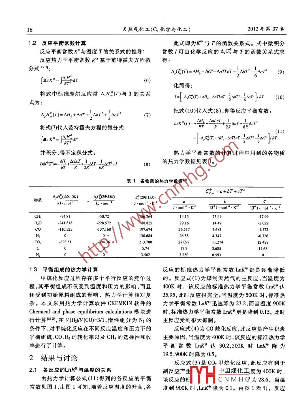 第5期崔曉曦等:合成氣甲烷化熱力學(xué)計算分析合成氣甲烷化熱力學(xué)計算分析崔曉曦12,曹會博2,孟凡會1,李忠(1.太原理工大學(xué)煤化工研究所,煤科學(xué)與技術(shù)教育部和山西省重點(diǎn)實(shí)驗(yàn)室,山西太原030024;2賽鼎工程有限公司,山西太原030032)摘要:探討了合成氣甲烷化過程中各反應(yīng)的熱力學(xué)平衡常數(shù)與溫度的關(guān)系,并使用 CHEMKIN軟件計算了反應(yīng)溫度、壓力對CO轉(zhuǎn)化率、CO2和甲烷選擇性和收率的影響。結(jié)果表明:溫度在550K-630K之間,壓力為1MPa,是甲烷化反應(yīng)的優(yōu)化條件關(guān)鍵詞:合成氣;甲烷化;熱力學(xué)計算中圖分類號:O642;TQ22l.11文獻(xiàn)標(biāo)識碼:A文章編號:1001-9219(2012)05-1505天然氣是一種清潔、高效的能源產(chǎn)品。隨著社1合成氣甲烷化熱力學(xué)計算會、經(jīng)濟(jì)的快速發(fā)展,我國天然氣需求急劇攀升,天然氣長期供不應(yīng)求。我國煤炭資源豐富發(fā)展煤制1.1甲烷化反應(yīng)過程天然氣技術(shù)具有重要意義,煤制天然氣已經(jīng)成為當(dāng)煤經(jīng)過氣化、變換、凈化得到的合成氣中一般前研究的熱點(diǎn)叫。含有H2、CO、CO2、CH4、H2O、CH和惰性氣體,具體a烷化技術(shù)是煤制天然氣最核心、最關(guān)鍵的技的氣體組成與煤的品種和所采用的氣化工藝有關(guān)。由于甲燒化是體積縮小的強(qiáng)放熱反應(yīng),所以合成氣中的情性氣體一般是N和Ar低溫高壓的條件有利于反應(yīng)的進(jìn)行。目前國內(nèi)外煤CO加氫合成甲烷屬于多相催化氣相反應(yīng),基制天然氣工藝甲烷化過程大都采用高溫三級固定本反應(yīng)式床反應(yīng)器串聯(lián)反應(yīng)工藝,由于反應(yīng)溫度高、放熱快,CO+3H=CH,+H-0+206kJ/mol為了防止固定床催化劑床層溫度過高而導(dǎo)致的鎳此反應(yīng)屬強(qiáng)放熱反應(yīng),催化劑一般為鎳催化基催化劑燒結(jié)和積炭而導(dǎo)致催化劑失活,必須嚴(yán)格劑,反應(yīng)溫度在300C-700℃,是FT合成烴類化合控制每級反應(yīng)器的甲烷轉(zhuǎn)化率,并配套大量的換熱物中最簡單的反應(yīng)。器,用來把固定床反應(yīng)器產(chǎn)生的熱量轉(zhuǎn)移走。因此生成的水與CO作用生成CO2和H2(變換反固定床煤制天然氣工藝,存在每段床層轉(zhuǎn)化率低、應(yīng))移熱慢、床層溫度高、能源消耗量大的缺點(diǎn)。CO+H,0=H +C0,+41kJ/mol因此,有必要對合成氣甲烷化過程進(jìn)行熱力學(xué)生成的CO2也可加氫甲烷化生成甲烷和水:研究,考察甲烷化過程中主反應(yīng)及副反應(yīng)的熱力學(xué)CO+4H=CH+2H 0+165kJ/mol平衡常數(shù)、以及熱力學(xué)平衡組分隨反應(yīng)溫度和反應(yīng)反應(yīng)(1)和3是生成甲烷的主反應(yīng),屬于體積縮壓力的變化規(guī)律為進(jìn)一步優(yōu)化煤制天然氣的甲烷小反應(yīng),增加反應(yīng)壓力有利于甲烷生成。副反應(yīng)主化過程提供熱力學(xué)理論依據(jù)探索低溫煤制天然氣要有CO的析炭反應(yīng)以及單質(zhì)碳和沉積碳的加氫反的可能性。2C0=C+C0,+171kJ/molC+2H,=CH,+73kJ/mol此外,還有生成少量醇、醛、醚以及烴類化合物收稿日期:2012.0412;基金項目:國家重點(diǎn)基礎(chǔ)研究發(fā)展計的副反應(yīng)存在。劃(973)(No.2012CB723105)資助項目;作者簡介:崔曉曦在通常(1963-),男,博士研究生,研究方向?yàn)槊夯ぜ盎瘜W(xué)工藝;THO中國煤化工5)達(dá)到平衡較聯(lián)系人:李忠,教授,研究內(nèi)容為煤化工及催化,電郵慢102,有利CNMHGlizhong@tyut.edu.cn,電話/傳真:+0860351-6018526天然氣化工(C1化學(xué)與化工)2012年第37卷1.2反應(yīng)平衡常數(shù)計算此式即為K°與T的函數(shù)關(guān)系式。式中微積分反應(yīng)平衡常數(shù)K°與溫度T的關(guān)系式的推導(dǎo):常數(shù)可由化學(xué)反應(yīng)的△G與T的函數(shù)關(guān)系式求反應(yīng)熱力學(xué)平衡常數(shù)K°基于范特霍夫方程微得分式嗎△G2()=△H-/R-△ aUNt-Mb72-r3(9)r△HIdr(6)化簡得將式中標(biāo)準(zhǔn)摩爾反應(yīng)焓△,H(T)與T的關(guān)系4c,A,Mnm…r(10)式為△,H(T)=△H0+△n7+△b72+△cT把式(10)代入式(8),即得反應(yīng)平衡常數(shù)(7)LnK°(T)4,△aLnT,1+MbT-△cT將式(7代入范特霍夫方程的微分式RT(11)jalnk=f Tndt-C(+△H-△U-△b3-△ry/Rr并積分,得不定積分式熱力學(xué)平衡常數(shù)的計算過程中用到的各物質(zhì)O)=+axx+1r1△F+1(8)的熱力學(xué)數(shù)據(jù)見表1表1各物質(zhì)的熱力學(xué)數(shù)據(jù)四Pm =a+bt+cT(29815K物質(zhì)kJ·mo03·mo-K2o. mol-.K374.81-50.721862644.157549-241.818188.82529.162.022137.16819767426.537-1172-0.326393.51213.78027.097124883.5023.28013平衡組成的熱力學(xué)計算反應(yīng)的標(biāo)準(zhǔn)熱力學(xué)平衡常數(shù)LnK°都是逐漸降低甲烷化反應(yīng)過程存在多個平行反應(yīng)的競爭過的。反應(yīng)式(1)為煤制天然氣的主反應(yīng),當(dāng)溫度為程,其平衡組成不僅受到溫度和壓力的影響,而且400K時,該反應(yīng)的標(biāo)準(zhǔn)熱力學(xué)平衡常數(shù)InK達(dá)還受到初始原料組成的影響,熱力學(xué)計算相對復(fù)3595,此時反應(yīng)很完全;當(dāng)溫度為500K時,標(biāo)準(zhǔn)熱雜。本文采用熱力學(xué)計算軟件 CKEMKIN軟件的力學(xué)平衡常數(shù)LnK°迅速降為232,而當(dāng)溫度900KChemical and phase equilibrium calculations模塊進(jìn)時,標(biāo)準(zhǔn)熱力學(xué)平衡常數(shù)LnK°更是降到015