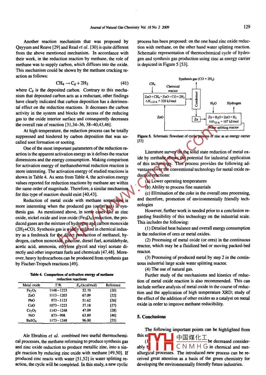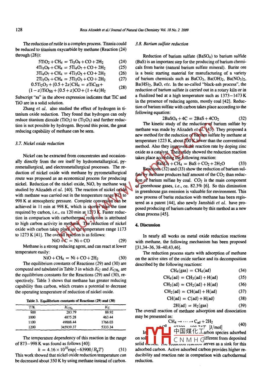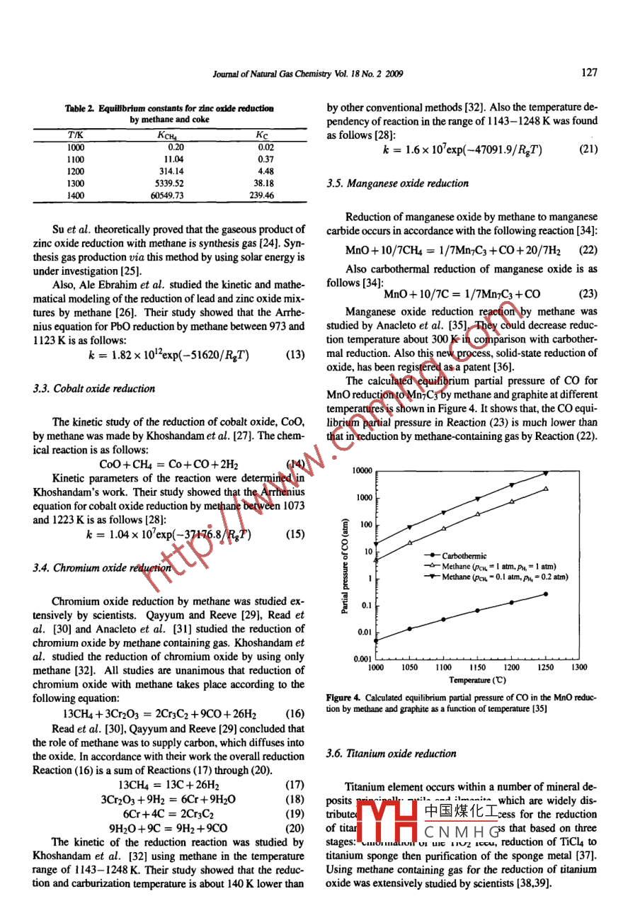 Availableonlineatwww.sciencedirect.comDRN群FScienceDirectN NATURAL GASELSEVIERJournal of Natural Gas Chemistry 18(2009)124-130www.elsevicr.com/locatejngeReviewTransformation of methane to synthesis gas over metaloxides without using catalystReza Alizadeh*, Esmail Jamshidi2, Guangqing Zhang1. Department of Chemical Engineering, Sahand University of Technology Tabriz 51335-1996, Iran:2. Department of Chemical Engineering, Amirkabir Universiry of Technology(Tehran Polytechnic), Tehran, 15875-4413, Iran;3. School of Material Science and Engineering. The University of New South Wales, UNSW Sydney, NSW 2052, AusraliaReceived December 10, 2008; Revised May 4, 2009; Available online June 22, 2009AbstractThis article reviews a new developing method in the field of metal oxide reduction in chemical and metallurgical processes, which usesmethane as a reducing agent. Commonly, coal is used as the reducing agent in the reduction of metal oxide and other inorganic materials; Metalproducing factories are among the most intensive and concentrated source of greenhouse gases and other pollutants such as heavy metals, sulfurdioxide and fly ash. Thermodynamically, methane has a great reducing capability and can be activated to produce synthesis gas over a metaloxide as an oxygen donor. Metal oxide reduction and methane activation, two concurrent thermochemical processes, can be combined as anefficient and energy-saving process; nowadays this kind of technologies is of great importance. This new reduction process could improveare synthesis gas that is more valuable than methane. In this paper, thermodynamic studies and advantages of this promising method werediscussed. The major aim of this article is to introduce methane as a best and environmentally friendly reducing agent at low temperaturemethane; metal oxide; reaction; reduction; greenhouse gases; synthesis gas1. Introductionin contact with carbon, as follows:M-O,+yCo rM+In metal processing industry usually three methodsThis CO2 diffuses back into carbon to generate more COused: electrometallurgical, hydrometallurgical and pyromet- according to the well-known Boudouard reactionallurgical method. Electrometallurgical and hydrometallurgyC+CO= 2C0cal methods characterized by high-energy consumption, dehus. in the solid-state reduction of metal oxide with carived mostly from the combustion of fossil fuels, for process bon, Co is the gaseous intermediateheat and electricity generation. The common method in metalThe reduction of inorganic mineral with coal(coke)is notprocessing factories is pyrometallurgical method based on us- environmentally friendly. These reactions produce poisonousing coal as a reducing agent. Reduction of metal oxide or gases such as SO, CO and large amount of Co2. It would beate ore is an important step for the production of metal favorable if an alternative technique could be developed withchemicals from their natural mineral. The various reducing no discharge of greenhouse gases to the atmosphere. Naturalagents currently employed in reduction processes are carbon, gas, whose major component is methane, is an excellent alhydrogen or mixture of hydrogen and carbon monoxide. Ini- ternative for playing this role. Commonly in chemical plantstial reduction of metal oxide with carbon takes place accord- methane is oxidized in catalytic reformer for producing syning to the following equation [1]thesis gas. The existing commercial technology and estab-lished process for synthesis gas production from natural gas iswhere both solid oxide and carbon are in contact. Te (1) based on the endothermic steam or wet reforming of methaneM-O, +yC(gr)=rM+yCoover中國煤化工 ly be represented by2lgenerated diffuses and reacts withoxide, which is notCNMHG3H2Comesponding author. Tel: +984123459156; Fax: +984123444355; E-mail: r alizadeh@sut.acirDalian Institute of Chemical Physics, Chinese Academy of Sciences. All nights reserveddoi:10.1016S10039953(08)60105XJoumal of Natural Gas Chemistry Vol. 18 No. 2 2009Global warming is one of the most important environmen-The equilibrium constant of this reaction can be calcutal problems in the recent decades and in recent years, lated from the following equation 19great attention has been paid to this problem. This phelogK=∑ UplooK/P-∑vgK/R(house gases(mainly CO2)are accumulating in the atmosphere where k is the equilibrium constant of the reaction and kjas a result of human activity(anthropogenic)and various tants and products respectively. The change of reaction Gibbsindustries [3-5]Carbon dioxide contributes significant greenhouse gaseffect, for instance, 82 percent of United States greenhouse△G0=∑vG-∑m=-R2TLnK(8)gas emission is carbon dioxide [6]. There are a huge amount where GD and GD are the Gibbs free energies of productspapers about the researches for COz concentration from the and reactants, respectively, at temperature T and atmosphericflue gas and further CO2 sequestration or conversion in theliteratures[7-16]. The largest part of carbon dioxide(about temperaturepressure. Rg is the gas constant and T is the absolute10%)is produced by metal oxide reduction processes as a re-sult of carbon consumption during the processes as a reducingFrom these equations the approximate commencing tem-ratures(AG=0 of several metal oxides reaction with car-agent For that reason, the reduction of greenhouse gases es- bon and methane according to Reactions(1)and(5)are com-pecially carbon dioxide in extractive metallurgy is becoming puted and tabulated in Table 1. In which AG and AGs are themore important[I7Using methane instead of carbon as a reducing agent has Gibbs free energy change for Reactions()and(5),respec-recently received an increasing interest in metal processing and methanothermal (Reaction(5) reductionCO2 and not any SOr. But Coal based method produceTable 1. Approximate temperatures(K)for spontaneouslarge amount of fly ash and a lot of heavy metal such as mer-proceeding of metal oxide reduction with
