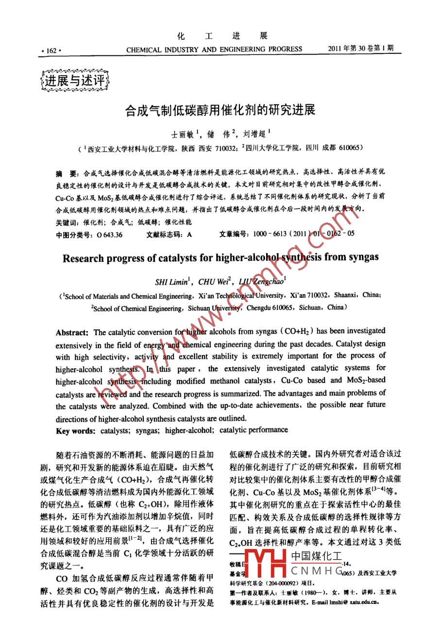 化工進(jìn)展·162·CHEMICAL INDUSTRY AND ENGINEERING PROGRESS2011年第30卷第1期進(jìn)展與述評合成氣制低碳醇用催化劑的研究進(jìn)展士麗敏’,儲偉2,劉增超(1西安工業(yè)大學(xué)材料與化工學(xué)院,陜西西安71002:2四川大學(xué)化工學(xué)院,四川成都61005)摘要:合成氣選擇催化合成低碳混合醇等清潔燃料是能源化工領(lǐng)域的研究熱點(diǎn),高選擇性、高活性并具有優(yōu)良穩(wěn)定性的催化劑的設(shè)計(jì)與開發(fā)是低碳醇合成技術(shù)的關(guān)鍵,本文對目前研究相對集中的改性甲醇合成催化劑cuC基以及Ms2基低碳醇合咸催化劑進(jìn)行了綜合評述,系統(tǒng)總結(jié)了不同催化劑體系的研究現(xiàn)狀,分析了當(dāng)前合成低碳醇用催化劑領(lǐng)域的熱點(diǎn)和難點(diǎn)問題,并指出了低碳醇合成催化劑在今后一段時(shí)間內(nèi)的發(fā)展方向關(guān)鍵詞:催化劑;合成氣;低碳醇;催化性能中圖分類號:O643.36文獻(xiàn)標(biāo)志碼:A文章編號:1000-6613(2011)01-0162-05Research progress of catalysts for higher-alcohol synthesis from syngasSHI Limin', CHU Wei, LIU zengcha('School of Materials and Chemical Engineering, Xi' an Technological University, Xi'an 710032, Shaanxi, China'school of Chemical Engineering, Sichuan University, Chengdu 610065, Sichuan, ChinaAbstract: The catalytic conversion for higher alcohols from syngas(CO+H2)has been investigatedextensively in the field of energy and chemical engineering during the past decades. Catalyst designwith high selectivity, activity and excellent stability is extremely important for the process ofhigher-alcohol synthesis. In this paper, the extensively investigated catalytic systems forhigher-alcohol synthesis including modified methanol catalysts, Cu-Co based and Mosz-basedcatalysts are reviewed and the research progress is summarized. The advantages and main problems ofthe catalysts were analyzed. Combined with the up-to-date achievements, the possible near futuredirections of higher-alcohol synthesis catalysts are outlineKey words: catalysts; syngas; higher-alcohol; catalytic performance隨著石油資源的不斷消耗、能源問題的日益加低碳醇合成技術(shù)的關(guān)鍵。國內(nèi)外研究者對適合該過劇,研究和開發(fā)新的能源體系迫在眉睫。由天然氣程的催化劑進(jìn)行了廣泛的研究和探索,目前研究相或煤氣化生產(chǎn)合成氣(CO+H2),合成氣再催化轉(zhuǎn)對比較集中的催化劑體系主要有改性的甲醇合成催化合成低碳醇等清潔燃料成為國內(nèi)外能源化工領(lǐng)域化劑、CuCo基以及MoS2基催化劑體系34等。的研究熱點(diǎn)。低碳醇(也稱C2+OH),除用作液體其中催化劑研究的重點(diǎn)在于探索活性中心的最佳燃料外,還可作為汽油添加劑以增加辛烷值,同時(shí)匹配、構(gòu)效關(guān)系及合成低碳醇的選擇性規(guī)律等方還是化工領(lǐng)域重要的基礎(chǔ)原料之一,具有廣泛的應(yīng)面,旨在提高低碳醇合成過程的單程轉(zhuǎn)化率用領(lǐng)域和較好的應(yīng)用前景"2,由合成氣選擇催化c2,OH選擇性和醇產(chǎn)率等。本文通過對這3類低合成低碳混合醇是當(dāng)前C化學(xué)領(lǐng)域十分活躍的研中國煤化工究課題之co加氫合成低碳醇反應(yīng)過程通常伴隨著甲金響CNMHG05)及西安工業(yè)大學(xué)科學(xué)研究基金(2040000項(xiàng)日醇、烴類和CO2等副產(chǎn)物的生成,高選擇性和高第一作者及聯(lián)系人:士豳敏(1980),幃士,講師,主要從活性并具有優(yōu)良穩(wěn)定性的催化劑的設(shè)計(jì)與開發(fā)是事能源化工與催化新材料研究,E-mailImshi@tatu.edu.cn士麗敏等:合成氣制低碳醇用催化劑的研究進(jìn)展碳醇合成催化劑體系的研究現(xiàn)狀進(jìn)行系統(tǒng)總結(jié),著。當(dāng)Cs質(zhì)量分?jǐn)?shù)從12%增加到29%,C2OH的分析了當(dāng)前合成低碳醇催化劑領(lǐng)域的熱點(diǎn)和難點(diǎn)合成速率顯著增加,當(dāng)Cs含量非常高時(shí),醇合成問題,并指出低碳醇合成催化劑今后一段時(shí)間內(nèi)速率可能降低例;同時(shí)對Cs促進(jìn)的 Cu/znO/C2O3的發(fā)展方向催化劑的研究發(fā)現(xiàn),原料氣中甲醇加入不會引起產(chǎn)1改性甲醇合成催化劑物分布的顯著變化,而乙醇加入則顯著提高了C2+含氧化合物的產(chǎn)率0對甲醇合成催化劑Zn-Cr、Cu-Zn通過添加堿采用改性的甲醇合成催化劑來選擇催化合成金屬助劑改性可獲得低碳混合醇。其中改性的C2OH,由于生成的產(chǎn)物仍主要是甲醇,C2OH選ZnCr催化劑操作條件苛刻,要求在高溫(350~450擇性低,該體系催化劑的研究僅停留在早期。為使℃)、高壓(12-16MPa)下進(jìn)行,具有最大異丁co加氫催化反應(yīng)生成較多的C2OH,人們對低碳醇選擇性。而改進(jìn)的CuZm則為低溫低壓下堿金屬醇合成用CuCo體系和MS2體系催化劑進(jìn)行了深促進(jìn)的甲醇合成催化劑,對合成氣轉(zhuǎn)化具有較高的入研究。轉(zhuǎn)化率關(guān)于改性的ZnC催化劑,主要是K或C促2CuCo體系催化劑進(jìn)的ZnCr尖晶石結(jié)構(gòu)催化劑,堿金屬K、Cs的添法國石油研究院(IFP)采用共沉淀法首先開發(fā)加,尤其是Cs助劑可顯著提高目標(biāo)產(chǎn)物的生成速了cuc基體系催化劑用于低碳醇的合成。催化劑率。在改性的znC催化劑中,過渡元素C對低碳的主要物相為CuC尖晶石相,在合成氣反應(yīng)介質(zhì)中,CuCo尖晶石相被消耗,產(chǎn)生高度分開的CuCo副產(chǎn)物的形成,將Mn部分取代ZnCr尖晶石結(jié)構(gòu)簇,是醇形成的活性位圍。該催