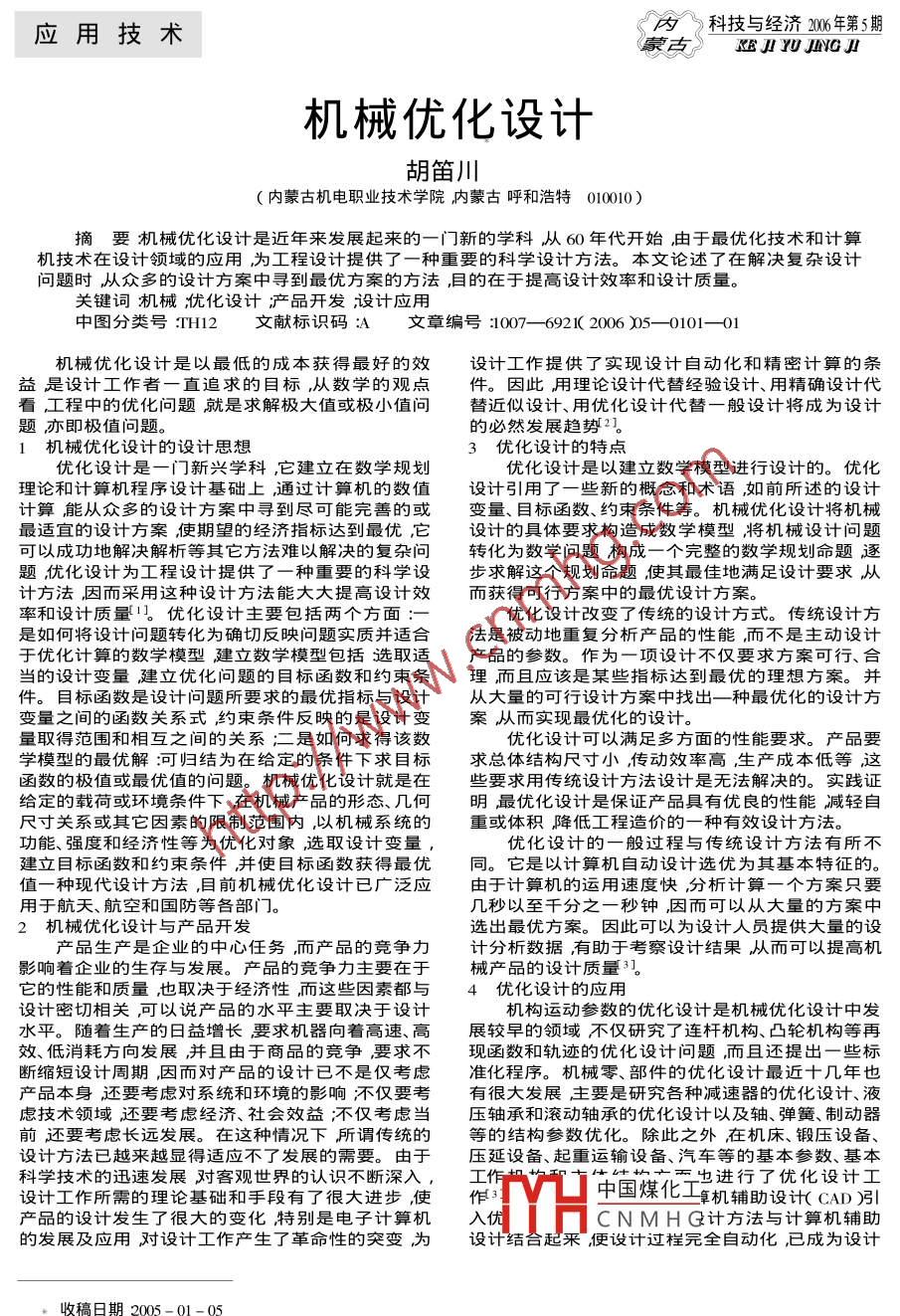 I內(nèi)》科技與經(jīng)濟(jì)206年第5期應(yīng)用技術(shù)蒙友EJIYUJING刀機(jī)械優(yōu)化設(shè)計(jì)胡笛川(內(nèi)蒙古機(jī)電職業(yè)技術(shù)學(xué)院,內(nèi)蒙古呼和浩特010010)摘要機(jī)械優(yōu)化設(shè)計(jì)是近年來發(fā)展起來的一門門新的學(xué)科從60年代開始,由于最優(yōu)化技術(shù)和計(jì)算機(jī)技術(shù)在設(shè)計(jì)領(lǐng)域的應(yīng)用,為工程設(shè)計(jì)提供了一種重要的科學(xué)設(shè)計(jì)方法。本文論述了在解決復(fù)雜設(shè)計(jì)問題時(shí)從眾多的設(shè)計(jì)方案中尋到最優(yōu)方案的方法,目的在于提高設(shè)計(jì)效率和設(shè)計(jì)質(zhì)量。關(guān)鍵詞機(jī)械;優(yōu)化設(shè)計(jì);產(chǎn)品開發(fā)設(shè)計(jì)應(yīng)用中圖分類號(hào):TH12文獻(xiàn)標(biāo)識(shí)碼:A文章編號(hào):1007- -6921( 2006 )05- -0101- -01機(jī)械優(yōu)化設(shè)計(jì)是以最低的成本獲得最好的效設(shè)計(jì)工作提供了實(shí)現(xiàn)設(shè)計(jì)自動(dòng)化和精密計(jì)算的條益是設(shè)計(jì)工作者一直追求的目標(biāo),從數(shù)學(xué)的觀點(diǎn)牛。因此用理論設(shè)計(jì)代替經(jīng)驗(yàn)設(shè)計(jì)、用精確設(shè)計(jì)代看工程中的優(yōu)化問題就是求解極大值或極小值問替近似設(shè)計(jì)、用優(yōu)化設(shè)計(jì)代替一般設(shè)計(jì)將成為設(shè)計(jì)題亦即極值問題。的必然發(fā)展趨勢(shì)22。.1機(jī)械優(yōu)化設(shè)計(jì)的設(shè)計(jì) 思想3優(yōu)化設(shè)計(jì)的特點(diǎn)優(yōu)化設(shè)計(jì)是一門新興學(xué)科,它建立在數(shù)學(xué)規(guī)劃優(yōu)化設(shè)計(jì)是以建立數(shù)學(xué)模型進(jìn)行設(shè)計(jì)的。優(yōu)化理論和計(jì)算機(jī)程序設(shè)計(jì)基礎(chǔ)上通過計(jì)算機(jī)的數(shù)值設(shè)計(jì)引用了一些新的概念和術(shù)語,如前所述的設(shè)計(jì)計(jì)算能從眾多的設(shè)計(jì)方案中尋到盡可能完善的或.變量、目標(biāo)函數(shù)、約束條件等。機(jī)械優(yōu)化設(shè)計(jì)將機(jī)械最適宜的設(shè)計(jì)方案使期望的經(jīng)濟(jì)指標(biāo)達(dá)到最優(yōu)庀設(shè)計(jì)的具體要求構(gòu)造成數(shù)學(xué)模型將機(jī)械設(shè)計(jì)問題可以成功地解決解析等其它方法難以解決的復(fù)雜問轉(zhuǎn)化為數(shù)學(xué)問題構(gòu)成-一個(gè)完整的數(shù)學(xué)規(guī)劃命題逐題優(yōu)化設(shè)計(jì)為工程設(shè)計(jì)提供了-種重要的科學(xué)設(shè)步求解這個(gè)規(guī)劃命題使其最佳地滿足設(shè)計(jì)要求從計(jì)方法,因而采用這種設(shè)計(jì)方法能大大提高設(shè)計(jì)效而獲得可行方案中的最優(yōu)設(shè)計(jì)方案。率和設(shè)計(jì)質(zhì)量(1。優(yōu)化設(shè)計(jì)主要包括兩個(gè)方面:一優(yōu)化設(shè)計(jì)改變了傳統(tǒng)的設(shè)計(jì)方式。傳統(tǒng)設(shè)計(jì)方是如何將設(shè)計(jì)問題轉(zhuǎn)化為確切反映問題實(shí)質(zhì)并適合法是被動(dòng)地重復(fù)分析產(chǎn)品的性能而不是主動(dòng)設(shè)計(jì)于優(yōu)化計(jì)算的數(shù)學(xué)模型建立數(shù)學(xué)模型包括選取適產(chǎn)品的參數(shù)。作為一項(xiàng)設(shè)計(jì)不僅要求方案可行、合當(dāng)?shù)脑O(shè)計(jì)變量建立優(yōu)化問題的目標(biāo)函數(shù)和約束條理而且應(yīng)該是某些指標(biāo)達(dá)到最優(yōu)的理想方案。并件。目標(biāo)函數(shù)是設(shè)計(jì)問題所要求的最優(yōu)指標(biāo)與設(shè)計(jì)從大量的可行設(shè)計(jì)方案中找出一種最優(yōu)化的設(shè)計(jì)方變量之間的函數(shù)關(guān)系式,約束條件反映的是設(shè)計(jì)變.案,從而實(shí)現(xiàn)最優(yōu)化的設(shè)計(jì)。量取得范圍和相互之間的關(guān)系;二是如何求得該數(shù)優(yōu)化設(shè)計(jì)可以滿足多方面的性能要求。產(chǎn)品要學(xué)模型的最優(yōu)解:可歸結(jié)為在給定的條件下求目標(biāo)求總體結(jié)構(gòu)尺寸小,傳動(dòng)效率高,生產(chǎn)成本低等這函數(shù)的極值或最優(yōu)值的問題。機(jī)械優(yōu)化設(shè)計(jì)就是在些要求用傳統(tǒng)設(shè)計(jì)方法設(shè)計(jì)是無法解決的。實(shí)踐證給定的載荷或環(huán)境條件下在機(jī)械產(chǎn)品的形態(tài)、幾何明最優(yōu)化設(shè)計(jì)是保證產(chǎn)品具有優(yōu)良的性能減輕自尺寸關(guān)系或其它因素的限制范圍內(nèi)以機(jī)械系統(tǒng)的重或體積降低工程造價(jià)的一種有效設(shè)計(jì)方法。功能、強(qiáng)度和經(jīng)濟(jì)性等為優(yōu)化對(duì)象選取設(shè)計(jì)變量,優(yōu)化設(shè)計(jì)的一般過程與傳統(tǒng)設(shè)計(jì)方法有所不建立目標(biāo)函數(shù)和約束條件并使目標(biāo)函數(shù)獲得最優(yōu)同。它是以計(jì)算機(jī)自動(dòng)設(shè)計(jì)選優(yōu)為其基本特征的。值一種現(xiàn)代設(shè)計(jì)方法,目前機(jī)械優(yōu)化設(shè)計(jì)已廣泛應(yīng)由于計(jì)算機(jī)的運(yùn)用速度快,分析計(jì)算- - 個(gè)方案只要用于航天、航空和國防等各部門。幾秒以至千分之一秒鐘,因而可以從大量的方案中2機(jī)械優(yōu)化設(shè)計(jì)與產(chǎn)品開發(fā)選出最優(yōu)方案。因此可以為設(shè)計(jì)人員