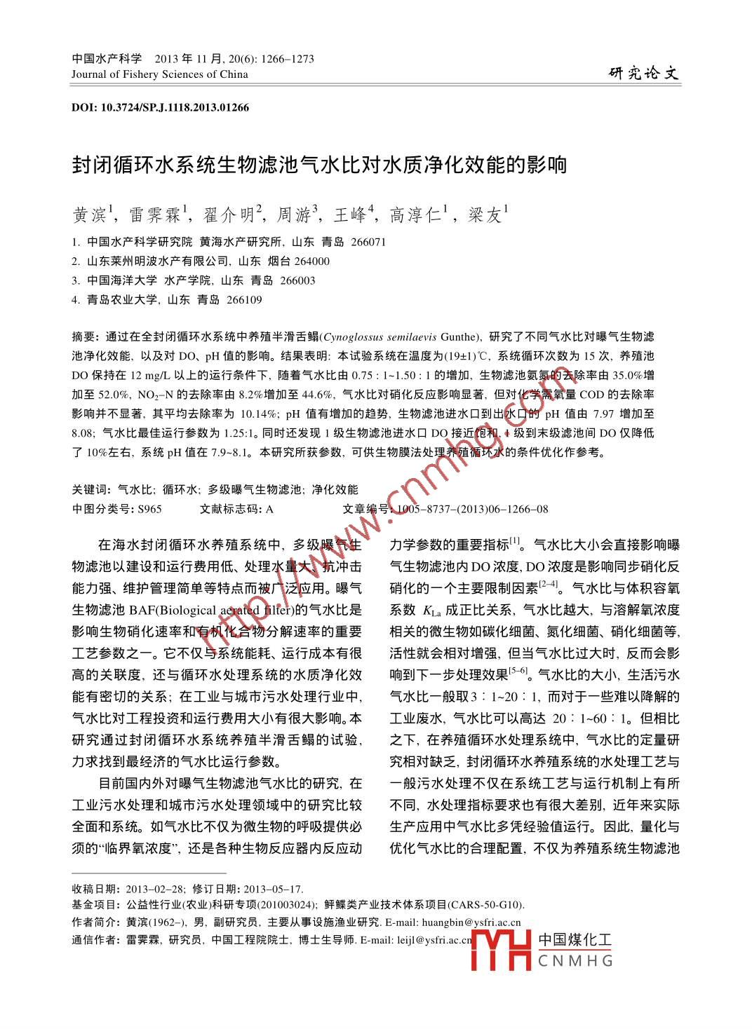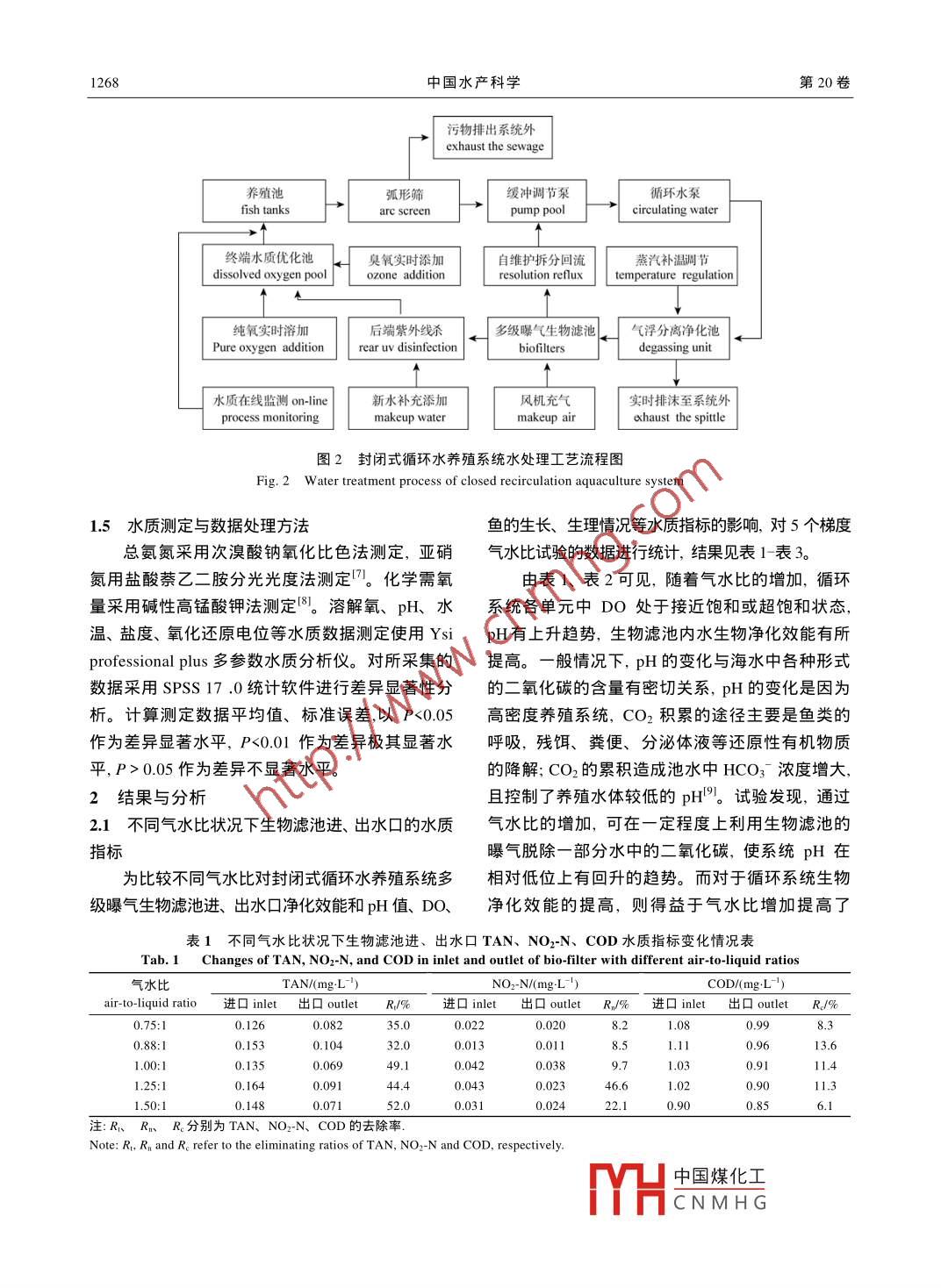 中國(guó)水產(chǎn)科學(xué)2013年 11 月, 20(6): 1266-1273Journal of Fishery Sciences of China研究論文DOI: 10.3724/5SP.J.1118.2013.01266封閉循環(huán)水系統(tǒng)生物濾池氣水比對(duì)水質(zhì)凈化效能的影響黃濱,雷霽霖',翟介明”,周游”,王峰*,高淳仁',梁友'1.中國(guó)水產(chǎn)科學(xué)研究院黃海水產(chǎn)研究所,山東青島2660712.山東萊州明波水產(chǎn)有限公司,山東煙臺(tái)2640003.中國(guó)海洋大學(xué)水產(chǎn)學(xué)院,山東青島2660034.青島農(nóng)業(yè)大學(xué),山東青島266109摘要:通過(guò)在全封閉循環(huán)水系統(tǒng)中養(yǎng)殖半滑舌鰨(Cynoglossus semilaevis Gunthe),研究了不同氣水比對(duì)曝氣生物濾池凈化效能,以及對(duì)DO、pH值的影響。結(jié)果表明:本試驗(yàn)系統(tǒng)在溫度為(19+1)°C,系統(tǒng)循環(huán)次數(shù)為15次,養(yǎng)殖池Do保持在12 mg/L以上的運(yùn)行條件下,隨著氣水比由0.75: 1~1.50: 1的增加,生物濾池氨氮的去除率由35.0%增加至52.0%, NO2- -N的去除率由8.2%增加至44.6%,氣水比對(duì)硝化反應(yīng)影響顯著,但對(duì)化學(xué)需氧量COD的去除率影響并不顯著,其平均去除率為10.14%; pH值有增加的趨勢(shì),生物濾池進(jìn)水口到出水口的pH值由7.97增加至8.08;氣水比最佳運(yùn)行參數(shù)為1.25:1. 同時(shí)還發(fā)現(xiàn)1級(jí)生物濾池進(jìn)水口DO接近飽和, 1級(jí)到末級(jí)濾池間DO僅降低了10%左右,系統(tǒng)pH值在7.9~8.1。本研究所獲參數(shù),可供生物膜法處理養(yǎng)殖循環(huán)水的條件優(yōu)化作參考。關(guān)鍵詞:氣水比;循環(huán)水;多級(jí)曝氣生物濾池;凈化效能中圖分類(lèi)號(hào): s965文獻(xiàn)標(biāo)志碼: A文章編號(hào): 1005-8737- (2013)06- 1266- -08在海水封閉循環(huán)水養(yǎng)殖系統(tǒng)中,多級(jí)曝氣生力學(xué)參數(shù)的重要指標(biāo)"。氣水比大小會(huì)直接影響曝物濾池以建設(shè)和運(yùn)行費(fèi)用低、處理水量大、抗沖擊氣生物濾池內(nèi)DO濃度,DO濃度是影響同步硝化反能力強(qiáng)、維護(hù)管理簡(jiǎn)單等特點(diǎn)而被廣泛應(yīng)用。曝氣硝化的一個(gè)主要限制因素24。氣水比與體積容氧生物濾池BAF(Biological aerated filter)的氣水比是系數(shù)KLa成正比關(guān)系,氣水比越大,與溶解氧濃度影響生物硝化速率和有機(jī)化合物分解速率的重要相關(guān)的微生物如碳化細(xì)菌、氮化細(xì)菌、硝化細(xì)菌等,工藝參數(shù)之一。它不僅與系統(tǒng)能耗、運(yùn)行成本有很活性就會(huì)相對(duì)增強(qiáng),但當(dāng)氣水比過(guò)大時(shí),反而會(huì)影高的關(guān)聯(lián)度,還與循環(huán)水處理系統(tǒng)的水質(zhì)凈化效響到下一步處理效果5-6。氣水比的大小,生活污水,能有密切的關(guān)系;在工業(yè)與城市污水處理行業(yè)中,氣水比一般取3: 1~20: 1,而對(duì)于一些難以降解的氣水比對(duì)工程投資和運(yùn)行費(fèi)用大小有很大影響。本工業(yè)廢水,氣水比可以高達(dá)20: 1~60: 1。但相比研究通過(guò)封閉循環(huán)水系統(tǒng)養(yǎng)殖半滑舌鰨的試驗(yàn),之下,在養(yǎng)殖循環(huán)水處理系統(tǒng)中,氣水比的定量研力求找到最經(jīng)濟(jì)的氣水比運(yùn)行參數(shù)。究相對(duì)缺乏,封閉循環(huán)水養(yǎng)殖系統(tǒng)的水處理工藝與目前國(guó)內(nèi)外對(duì)曝氣生物濾池氣水比的研究,在-般污水處理不僅在系統(tǒng)工藝與運(yùn)行機(jī)制上有所工業(yè)污水處理和城市污水處理領(lǐng)域中的研究比較不同,水處理指標(biāo)要求也有很大差別,近年來(lái)實(shí)際全面和系統(tǒng)。如氣水比不僅為微生物的呼吸提供必生產(chǎn)應(yīng)用中氣水比多憑經(jīng)驗(yàn)值運(yùn)行。因此,量化與須的“臨界氧濃度”,還是各種生物反應(yīng)器內(nèi)反應(yīng)動(dòng)優(yōu)化氣水比的合理配置,不僅為養(yǎng)殖系統(tǒng)生物濾池收稿日期: 2013-02- 28;修訂日期: 2013-05-17.基金項(xiàng)目:公益性行業(yè)(農(nóng)業(yè))科研專(zhuān)項(xiàng)(201003024);鲆鰈類(lèi)產(chǎn)業(yè)技術(shù)體系項(xiàng)目(CARS-50-G10).作者簡(jiǎn)介:黃濱(1962-), 男,副研究員,主要從事設(shè)施漁業(yè)研究. E-mail: huangbin@ysfri.ac.cn通信作者:雷霽霖,研究員,中國(guó)工程院院士,博土生導(dǎo)師. E-mail: leiji@ yfri.ac.cn中國(guó)煤化工YHCNMH G第6期黃濱等:封閉循環(huán)水系統(tǒng)生物濾池氣水比對(duì)水質(zhì)凈化效能的影響1267運(yùn)行工藝參數(shù)優(yōu)化提供科學(xué)依據(jù),對(duì)我國(guó)循環(huán)水養(yǎng)另-路計(jì)量曝氣量。殖節(jié)能增效也意義重大。試驗(yàn)用魚(yú):總共投放體質(zhì)量(640.10士63.30) g.體長(zhǎng)(43.10土1.48) cm的半滑舌鰨魚(yú)種780尾,分別1材料與方法按1號(hào)池240尾2號(hào)池210尾、3號(hào)池180尾1.1試驗(yàn)系 統(tǒng)與試驗(yàn)用魚(yú)4號(hào)池150尾不同密度布放于4個(gè)養(yǎng)殖池中。試驗(yàn)在山東萊州明波水產(chǎn)有限公司試驗(yàn)車(chē)間1.2 封閉式循環(huán)水養(yǎng)殖系統(tǒng)工藝流程圖1),采用封閉式循環(huán)水養(yǎng)殖系統(tǒng),養(yǎng)殖半滑舌封閉式循環(huán)水養(yǎng)殖系統(tǒng)工藝流程如圖2所示。鰨試驗(yàn)。系統(tǒng)水體交換率為18次/d。1.3 養(yǎng)殖試驗(yàn)日常管理,試驗(yàn)期間每天上午8點(diǎn)常規(guī)監(jiān)測(cè)并記錄養(yǎn