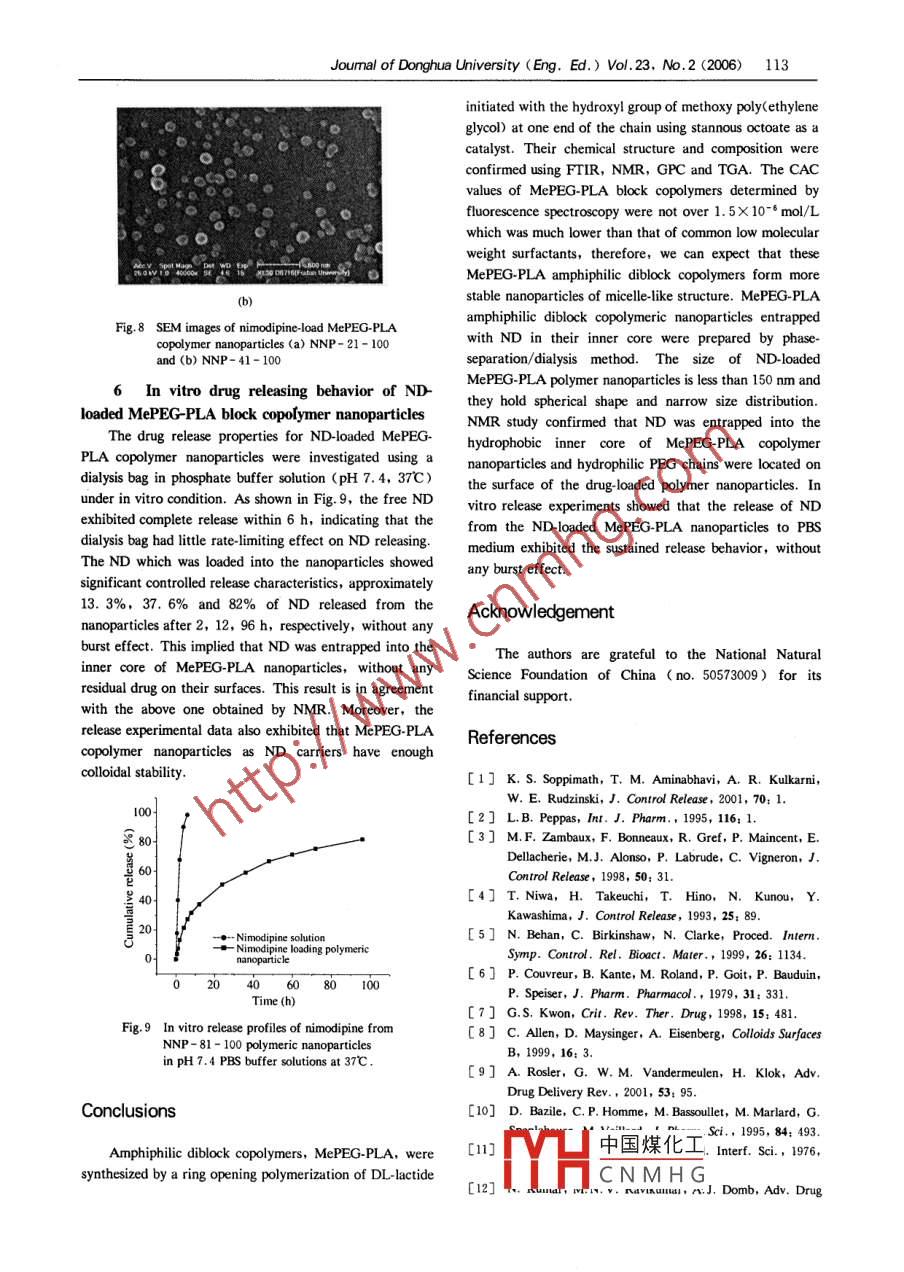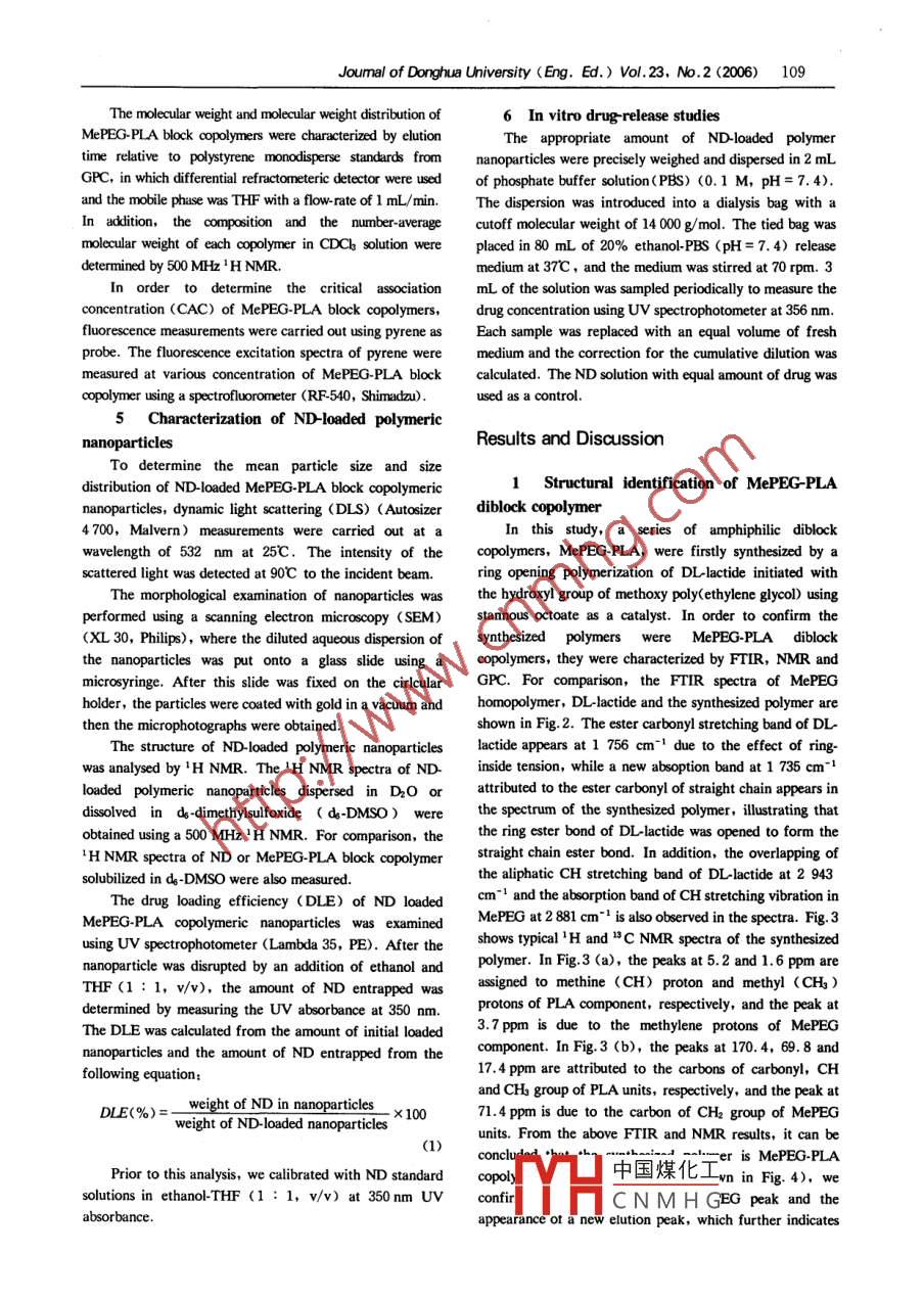 Joumal of Donghua University (Eng. Ed.) Vol.23, No,2 (2006) 107Preparation and Characterization of Nimodipine-loaded Methoxy Poly(ethylene glycol)-poly(lactic acid) Diblock Copolymer Nanoparticles .ZHA Liu-sheng (查劉生)12 , LI Lan (李蘭): , ZHAO Hui-peng (趙輝鵬)21 Stale Key Laboratory of Modification of Chemipal Fibers and Polsmer Materials, Donghua University, Shanghai 200051Research Center of Analysis and Measurement , Donghua University, Shanghai 200051Amphiphilili diblck copolymers, methoxy poly (ethyleneblocks, which are often composed of poly(ethylene oxide)glycol)-poly(lactic acid) (MePEG-PLA), were synthesized(PEO),can form hydrogen bonds with the aqueousfrom monomers of DL-lactide and methoxy poly (ethylenesurroundings and form a hydrophilic shell around theglycol) by a ring opening bulk polymerization in the presencehydrophobic core. The PEO corona prevents recognitionof stannous octoate. Their chemical structure and physicalby the reticuloendothelial system and therefore preliminaryproperties were investigated using FTIR, NMR, GPC, andelimination of the nanoparticles from the blodstream.fluorescence spectroscopy. To estimate the feasibility aThus, these so-called ‘ stealth’properties of the PEOcolloidal drug carrier, nimodipine (ND) was loaded intocorona result in increased blood circulation times and allowMePEG-PLA block copolymer nanoparticles by phasedrugs to be administered over prolonged periods ofseparation/dialysis method. The mean diameter and drugtime[l0]. A final feature that makes amphiphilic blockloading eficiency of ND-loaded MePEG-PLA copolymercopolymers attractive for drug delivery applications is thenanoparticles depended o PLAMePEG block compositionfact that their chemical composition, total molecularof the copolymer and dng/polymer feed ratio inweight, and the ratio of the constituting block can be easilypreparation. NMR study confimed that nlmodipine wEadjusted, which allows control of the size and morphologyentrapped into the hydrophobic inner core of MePEG-PLAof the nanoparticles.copolymer nanoparticles and hydrophillic PEG chains wereBlock copolymers are cassified into several types bylocated on the surface of the drugloaded polymnersequential arrangement of component segment, such as AB-nanoparticles. In vitro release experiments exhilbited thtype diblock copolymer, ABA-type triblock copolymer,sustained release behavior of nimodipine fro MePEG-PLA( AB)。type multiblock copolymer and star blockcopolymer nanoparticles, without any burst effect.copolymer. Block copolymers composed of hydrophobicKeywords: colloidal nanoparticles, biodegradable, drugand hydrophilic segments are known to assemble intodelivery system, diblock copolymer , nimodipine.polymeric nanoparticles in an aqucous medium[ .Compared to other type of amphiphilic block copolymers,AB type amphiphilic diblock copolymers are the mostIntroductionappropriate candidates for forming nanoparticles in sizedesign, aggregation number, and nanoparticle stability dueOver the past few decades, tremendous efforts haveto simple architecture of their molecules[12].been done in developingbiodegradable polymerIt is well known that PEG pssesses a number ofnanoparticles as effective drug delivery devicesl.2]。 Inexcellent physicochemical and biological properties,order to deliver the drug to a target site effectively and thusincluding hydrophilicity, solubility in water and in organicincrease the therapeutic benefit, while minimizing sidesolvents, lack of toxicityta), and absence of antigenicityeffects, various polymers have been employed to prepareand immunogenicityl4n. In recent years, PEG and itsbiodegradable nanopartices3bl. In recent years, thederivatives have been widely applied in biomedical fieldf[5].biodegradable polymer nanoparticles obtained fromPoly(lactic acid) (PLA) has been found to be a veryamphiphilic block opolymers have attracted considerableattractive biomaterial for pharmaceutical and medicalattention as potential drug delivery devices because of theirapplication due to its non-toxicity, biocompatibility anunique advantages'-)]. First of all, hydrophobic drugs canbiodegradability. Especially, the PLA polymer degradesbe physically entrapped in the core of block copolymerinto lactic acid which enters the tricarboxylic acid cycle andnanoparticles and high drug-loading capacity for the type ofis metabolized and subsequently eliminated from the bodydrug carrier can be achieved. Secondly, the bhydrophilicas carbon dioxide and water[16]. Lately, many efforts have中國(guó)煤化工Received Apr.1, 2005MHCNMHGCorrespondence should be adressed to ZHA Liu-sheng, researcher, E-mail; LsZhac@anu.edu.cn108Jourmal of Donghua University (Eng. Ed.) Vol. 23, No.2 (2006)been made to form a new family of block copolymersdialysis method, deionized water and cellulose dialysis bagcomprising PEG and PLA29121. The bright part of this(molecular weight cut off: 14 000) were used.family is that one can modulate the biodegradation rate and2 Synthesis of MPEG-PLA diblock copolymershydrophilicity of polymer by adjusting the ratio of itsMPEG-PLA diblock copolymers were synthesized inhydropilic and hydrophobic constituents. Moreover, boththe bulk state by the ring opening polymerization of DL~PEG and PLA were approved for clinical use by the Foodlactide in the presence of MePEG homopolymer usingand Drug Administration (FDA)is.16].stannous octoate as a catalyst. By variation of the ratio ofThe objective of the present study was to synthesizemonomer to initiator ([ M]/[I]),where [M]= DL-biodegradable amphiphilic diblock copolymer, methoxylactide units and [I] = MePEG homopolymer, the PLApoly (ethylene glycol)-poly (lactic acid) (MePEG-PLA)to PEG segment molecular weight ratio of the copolymer(shown in Fig. 1 (a)), and to evaluate the feasibility ofwas controlled. A weighed amount of MePEG and DL-MePEG-PLA copolymeric nanoparticles as drug carrierlactide were placed in a dried round-bottomed flasksystems. Nimo