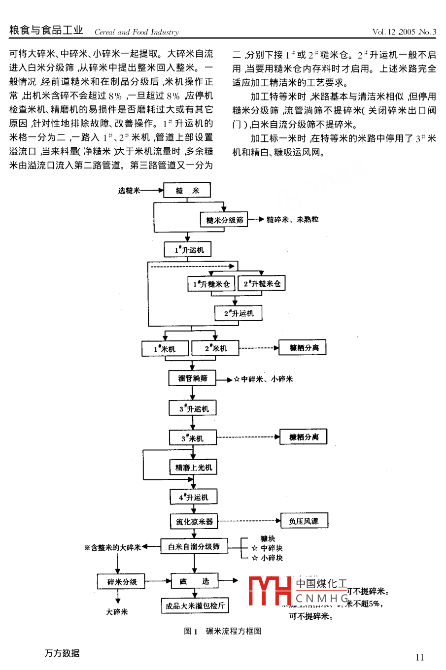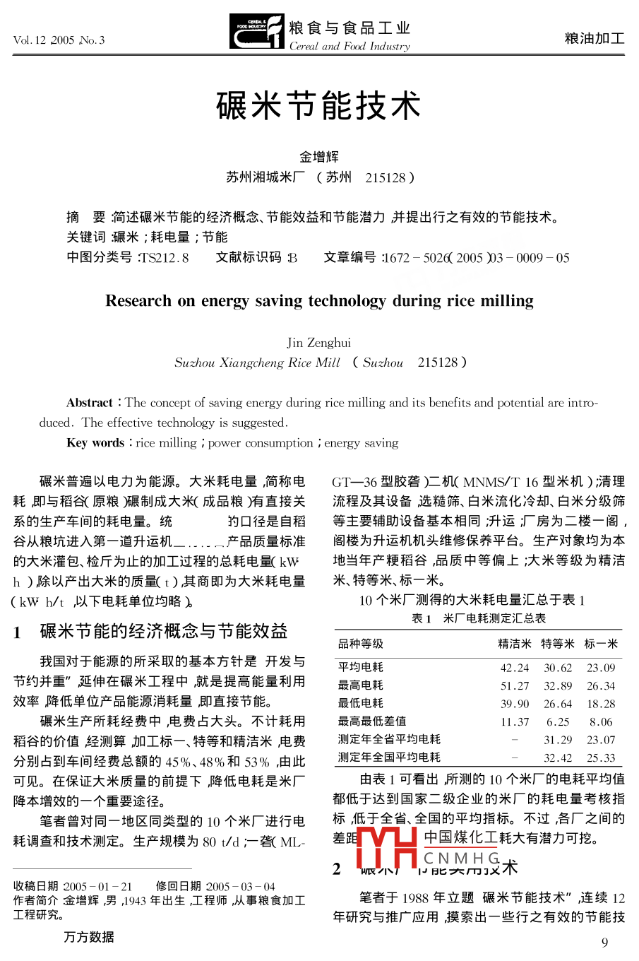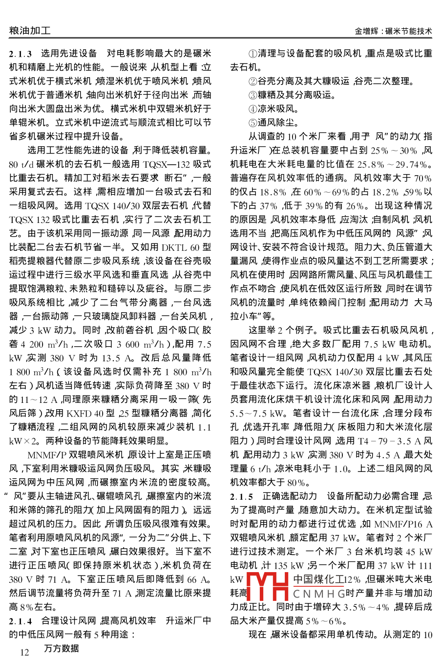 糧食與食品工業(yè)Vol.122005No.3Cereal and Foxx Industr糧油加工碾米節(jié)能技術(shù)金增輝蘇州湘城米廠(蘇州215128)摘要簡(jiǎn)述碾米節(jié)能的經(jīng)濟(jì)概念、節(jié)能效益和節(jié)能潛力并提岀行之有效的節(jié)能技術(shù)。關(guān)鍵詞碾米;耗電量;節(jié)能中圖分類號(hào):TS212.8文獻(xiàn)標(biāo)識(shí)碼文章編號(hào)∶1672-5026(2005)3-0009-05Research on energy saving technology during rice millinginSuzhou Xiangcheng rice Mill Suzhou 215128)Abstract: The concept of saving energy during rice milling and its benefits and potential are introduced. The effective technology is suggestedKey words: rice milling i power consumption energy saving碾米普遍以電力為能源。大米耗電量簡(jiǎn)稱電GT—-36型膠礱)機(jī)MNMs/T16型米機(jī))清理耗即與稻谷原糧)碾制成大米(成品糧)有直接關(guān)流程及其設(shè)備選糙篩、白米流化冷卻、白米分級(jí)篩系的生產(chǎn)車間的耗電量。統(tǒng)拘口徑是自稻等主要輔助設(shè)備基本相同升運(yùn)廠房為二樓一閣谷從糧坑進(jìn)入第一道升運(yùn)機(jī)產(chǎn)品質(zhì)量標(biāo)準(zhǔn)閣樓為升運(yùn)機(jī)機(jī)頭維修保養(yǎng)平臺(tái)。生產(chǎn)對(duì)象均為本的大米灌包、檢斤為止的加工過(guò)程的總耗電量(kW地當(dāng)年產(chǎn)粳稻谷,品質(zhì)中等偏上;大米等級(jí)為精潔h)除以產(chǎn)出大米的質(zhì)量(t)其商即為大米耗電量米、特等米、標(biāo)一米(kWh/t以下電耗單位均略10個(gè)米廠測(cè)得的大米耗電量匯總于表1表1米廠電耗測(cè)定匯總表1碾米節(jié)能的經(jīng)濟(jì)概念與節(jié)能效益品種等級(jí)精潔米特等米標(biāo)一米我國(guó)對(duì)于能源的所采取的基本方針是開(kāi)發(fā)與平均電耗42.2430.6223.09節(jié)約并重”延伸在碾米工程中就是提高能量利用最高電耗51.2732.8926.34效率降低單位產(chǎn)品能源消耗量郾直接節(jié)能。最低電耗39碾米生產(chǎn)所耗經(jīng)費(fèi)中電費(fèi)占大頭。不計(jì)耗用最高最低差值稻谷的價(jià)值經(jīng)測(cè)算加工標(biāo)一、特等和精潔米電費(fèi)測(cè)定年全省平均電耗31.2923.07分別占到車間經(jīng)費(fèi)總額的45%、48%和53%由此測(cè)定年全國(guó)平均電耗32.4225.33可見(jiàn)。在保證大米質(zhì)量的前提下降低電耗是米廠由表1可看出所測(cè)的10個(gè)米廠的電耗平均值降本增效的一個(gè)重要途徑。都低于達(dá)到國(guó)家二級(jí)企業(yè)的米廠的耗電量考核指筆者曾對(duì)同一地區(qū)同類型的10個(gè)米廠進(jìn)行電標(biāo)低于全省、全國(guó)的平均指標(biāo)。不過(guò)各廠之間的耗調(diào)查和技術(shù)測(cè)定。生產(chǎn)規(guī)模為80td;-(ML.差距中國(guó)煤化工耗大有潛力可挖CNMHG比六門]又術(shù)收稿日期2005-01-21修回日期2005-03-04作者簡(jiǎn)介金增輝男,1943年出生,工程師,從事糧食加工筆者于1988年立題碾米節(jié)能技術(shù)”,連續(xù)12工程研究年研究與推廣應(yīng)用摸索岀一些行之有效的節(jié)能技糧油加工金增輝:碾米節(jié)能技術(shù)杺含能源管理)電耗指標(biāo)在行業(yè)內(nèi)長(zhǎng)期保持領(lǐng)先。輔助設(shè)備電耗為2.01占大米總電耗的10.63%加至2000年企業(yè)轉(zhuǎn)制,大米年加工量在1.1工標(biāo)一米,電耗為2.64,占11.42%;加工精潔為1.5萬(wàn)t其中精潔米(含出口精制米)約占總量的5.72占14.5%。顯示加工精度越高其米機(jī)工段85%其余為特等米、標(biāo)一米。1988年大米耗電量輔助設(shè)備耗電量占總電耗的比例越大。壓低礱谷流為精潔米38.2、特等米24.8、標(biāo)一米18.1接著這3量更不合理。某米廠礱谷時(shí)產(chǎn)量正常為4.6t糙個(gè)等級(jí)大米電耗分別降到32.3、21.6和16.5瀏了米加工標(biāo)二米時(shí)礱谷工段電耗為6.18。加工精潔后期則連續(xù)5年保持在33.0、22.0、17.0以下。特米將礱谷流量降低2.7t糙米測(cè)得礱谷工段電耗別要指出的是,節(jié)能是在保證大米質(zhì)量和車間生產(chǎn)為10.05。因?yàn)榈a谷工段的清理設(shè)備、谷殼分離與環(huán)境達(dá)標(biāo)的前提下獲得的吸運(yùn)、谷殼二次處理、選糙篩、通風(fēng)除塵及升運(yùn)機(jī)等2.1精心設(shè)計(jì)選優(yōu)提高能源利用率的負(fù)荷和稻米流量關(guān)系不大壓低礱谷產(chǎn)量使輔助2.1.Ⅰ流量平衡優(yōu)化生產(chǎn)整個(gè)工藝流程的各種設(shè)備的生產(chǎn)效率降低導(dǎo)致電耗增加。設(shè)備必須配套各工序之間的設(shè)備能力必須適應(yīng)。筆者所在廠在原有二機(jī)的基礎(chǔ)上增加一機(jī)改礱谷機(jī)和米機(jī)輔助設(shè)備與主機(jī)的生產(chǎn)能力要基本造為一礱三機(jī)。三臺(tái)米機(jī)的配用動(dòng)力為37kW×3平衡使每臺(tái)設(shè)備能發(fā)揮應(yīng)有的生產(chǎn)效率防止設(shè)備加工標(biāo)一米用二臺(tái)米機(jī)。加工特米前半個(gè)班開(kāi)2臺(tái)和動(dòng)力的浪費(fèi)。米機(jī)。后半個(gè)班開(kāi)3臺(tái)米機(jī)(將前半班多余糙米儲(chǔ)長(zhǎng)久以來(lái)我國(guó)碾米工程設(shè)計(jì)規(guī)范以標(biāo)二米為于20t糙米倉(cāng)內(nèi)加工精潔米3臺(tái)米機(jī)開(kāi)足。如依據(jù)。日產(chǎn)80t碾米生產(chǎn)線配一蘊(yùn)36型7.5kW)是礱谷機(jī)開(kāi)足米機(jī)吃飽礱碾流量基本平衡使整和二機(jī)雙輥米機(jī)28-30kW×2)日產(ch