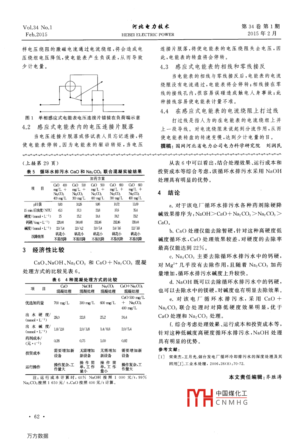 Vol 34 No. 1河北電力技術(shù)第34卷第1期Feb 2015HEBEI ELECTRIC POWER2015年2月電廠循環(huán)水排污水回用混凝處理實驗研究耿曉杰,凌小鳳2,孫慧1,李會鵬凵,許振華1,李嗥1(1.國網(wǎng)河北省電力公司電力科學(xué)研究院,石家莊050021;2.北京中寰工程項目管理有限公司武漢分公司,武漢430070)摘要:根據(jù)電廠循環(huán)水排污水低堿度高硬度的水質(zhì)特點,采用聚合硫酸鐵作為混凝劑,聚丙烯酰胺作為助凝劑,CaO、Na?CO3NaOH分別作為軟化劑,對電廠循環(huán)水進(jìn)行混凝實驗,結(jié)果表明,NaOH處理比CaO處理、Na2CO3處理、CaO+Na2CO3處理具有明顯的優(yōu)勢。關(guān)鍵詞:循環(huán)水排污水;回用;混凝;CaO;Na2CO3;NaOH中圖分類號:TM621.8;X703文獻(xiàn)標(biāo)志碼:B文章編號:1001-9898(2015)01-0028-02Experimental Research on Coagulation of Circulating Waste Water in Power PlantSun hui,Li H(1. State Grid Hebei Electric Power Research Institute, Shijiazhuang 050021, China; 2. Beijing ZhonghuanEngineering & Project Management Co Ltd. Wuhan Branch, Wuhan 430070)Abstract: According to the power plant circulating waste water of low alkalinity and high hardness water quality characteristicsusing of PFS as a coagulant, polyacrylamide as coagulant aid, lime, sodium hydroxide and sodium carbonate were used as thesoftener in coagulation tests. The results showe that from the treatment effect, operating costs and investment costs, for sucha low alkalinity high hardness circulating waste water, sodium hydroxide had more advantages than lime, sodium carbonateand lime sodium carbonateKey words: circulating waste water; reuse; coagulation; CaO: Naz CO,: NaOH火電廠作為用水耗水大戶,其循環(huán)水排水量表1循環(huán)水排污水水質(zhì)指標(biāo)占總水耗的70%~80%,對循環(huán)水排污水進(jìn)行結(jié)果項目結(jié)果/(mg·L-1)回收利用,不僅能夠降低排污對環(huán)境的影響,還對外觀透明陽離子節(jié)約水資源,提高企業(yè)經(jīng)濟效益有重要意義。河pH值溶解固形物/(mg·L-1)1740.0Na+北某電廠二期工程為2臺300MW亞臨界燃煤機耗氧量/(ng·L-1)0‖ca2+組,其循環(huán)水補水采用一期循環(huán)水排污水經(jīng)弱酸全硅/(276.00Mg2+147.00處理后的出水,處理流程為:一期循環(huán)水溢、排水活性硅/(mg·L1)98.00NHt0.00電導(dǎo)率/(S55陰離子(水庫水)→弱酸生水池→生水泵→纖維球過濾器濁度/FTU402.00雙流弱酸床→二期循環(huán)水池。二期機組循環(huán)水全硬度/(mmol·L-1)35.10sO濃縮倍率約為3.8,其循環(huán)水排污水直接排放。為永久硬度/(mmol·L-1)28.10HcO實現(xiàn)廠內(nèi)廢水資源的最大利用,擬對二期循環(huán)水暫時硬度/(mm全堿度/(mmol·L-1)排污水進(jìn)行回收利用,開展混凝處理實驗研究。全酸度/(mmol·L-1)酚酞堿度/(mmol·L-1)0.00H2PO1實驗用水分析有成倍的增加,并含有用于循環(huán)水處理的表面活實驗用水為河北某電廠二期工程機組循環(huán)水性劑,水質(zhì)污染嚴(yán)重。其堿度為7mmol/L,硬度系統(tǒng)排污水,水質(zhì)指標(biāo)見表1為35mmol/L,兩者相差20mmol/L以上,屬于從表1中可以看出,該循環(huán)水排污水含鹽量、典型的低堿度高硬度廢水,要處理好這種水,需要堿度、COD、SiO2及濁度等各項指標(biāo)均比地表水通過實驗中國煤化工收稿日期:2014-11-10CNMHG作者簡介:耿曉杰(1987-),男,工程師,主要從事電廠化學(xué)研究工作。Vol 34 No. 1河北電力教術(shù)第34卷第1期Feb 2015HEBEI ELECTRIC POWER2015年2月2混凝實驗研究Na2CO3加藥量達(dá)到600mg/L及以上時,對降低水中硬度有明顯效果,硬度去除率能達(dá)到28%,此該混凝實驗采用聚合硫酸鐵、聚丙烯酰胺與時堿度升至8.8mmol/L,當(dāng)Na2CO3加藥量達(dá)到不同的軟化劑(CaO、Na2CO3、NaOH進(jìn)行配比實1500mg/L時,硬度去除率能達(dá)到52%,去除的驗,其中聚合硫酸鐵加藥量根據(jù)經(jīng)驗暫時固定為幾乎全為鈣硬且混凝澄清效果明顯,此時堿度升40mg/L,PAM加藥量暫時固定為1mg/L。實至14mmol/L驗通過調(diào)整軟化劑加藥量,考察其對循環(huán)水排污2.3NaOH混凝實驗水硬度及堿度的去除效果。NaOH的理論加藥量為鎂鹽的摩爾量,即2.1CaO混凝實驗12.1mmol/L,以下采用純度為100%的NaOH通過計算,CaO的理論加藥量為7.2則其加藥量為242mg/L。NaOH混凝實驗結(jié)果mmol/L,以下采用純度為50%的CaO,則其加藥見表4。量為4032mg/L。CaO混凝實驗結(jié)果見表2。表4循環(huán)水排污水NaOH混凝實驗結(jié)果表2循環(huán)水排污水caO混凝實驗結(jié)果NOH的加藥量Ca(加藥量100m/L.a0mg/1.300mg/1.400mg/L.500mg/L400 mg/L 500 mg/L 600 mw/L 700 mg/L 800 mg/L.pH值值l5min后濁度/NTU26615min后濁度/NTU233302硬度/mml·L1)3348176硬度/(mrm·L-1)3767526452184371763516032鈣硬/(mg·L1)363874352堿度/(m·L1)24/8418/5220/3822/3622/30礬花小礬花小礬花小礬花小礬花堿度/(mm·L-)16/3818/4016/3018/2816/24冗降效果礬花小礬花小礬花小礬花小礬花小不易沉降不易沉降不易沉降不易沉降路大沉降效果不易沉降不易沉降不易沉降不易沉降不易沉降從表4可以看出,NaOH既可以去除水中的從表2可以看出,高硬度低堿度循環(huán)水排污鈣硬,也可以去除水中的鎂硬;隨著NaOH加藥水水質(zhì),石灰處理對硬度的去除率較低,硬度的最量的增加,水中的硬度逐漸下降,堿度也逐漸下高去除率僅為22%;石灰加藥量至少應(yīng)達(dá)到500降,pH值逐漸上升,沉降效果逐漸變好;當(dāng)NaOHmg/L及以上才對硬度去除有明顯效果;從沉降情加藥量達(dá)到300mg/L及以上時,對降低水中硬度況看,石灰混凝形成的礬花較小,沉