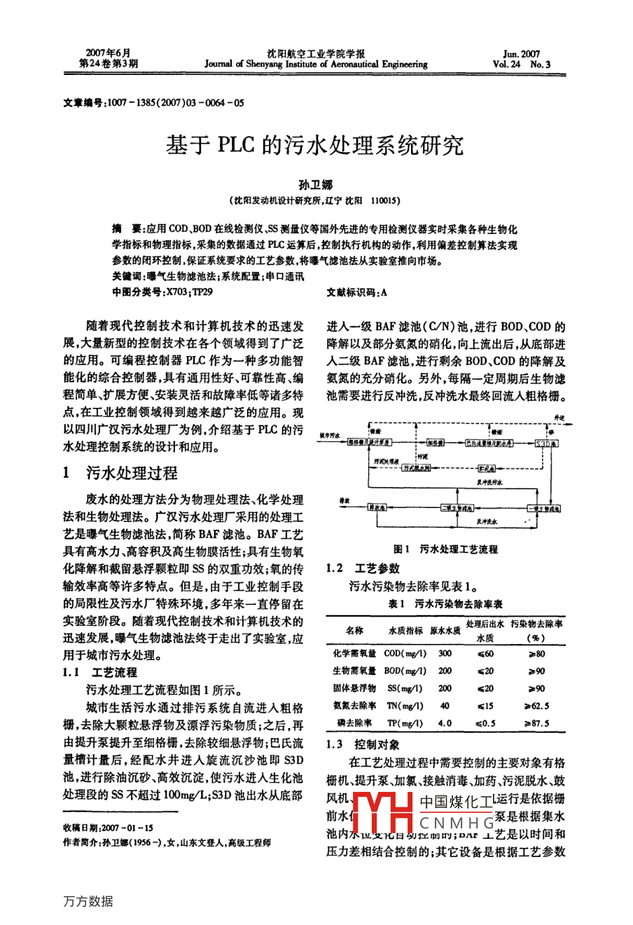 2007年6月沈陽航空工業(yè)學(xué)院學(xué)報(bào)Jun. 2007第24卷第3期Journal of Shenyang Institute of Aeronautical EngineeringVol.24 No. 3文章編號(hào):1007 - 1385(2007)03 -0064 -05基于PLC的污水處理系統(tǒng)研究孫衛(wèi)娜(沈陽發(fā)動(dòng)機(jī)設(shè)計(jì)研究所,遼寧沈陽10015)摘要:應(yīng)用 COD、BOD在線檢測(cè)儀.ss測(cè)量?jī)x等國外先進(jìn)的專用檢測(cè)儀器實(shí)時(shí)采集各種生物化學(xué)指標(biāo)和物理指標(biāo),采集的數(shù)據(jù)通過PLC運(yùn)算后,控制執(zhí)行機(jī)構(gòu)的動(dòng)作,利用偏差控制算法實(shí)現(xiàn)參數(shù)的閉環(huán)控制,保證系統(tǒng)要求的工藝參數(shù),將曝氣濾池法從實(shí)驗(yàn)室推向市場(chǎng)。關(guān)鍵詞:曝氣生物濾池法;系統(tǒng)配置;串口通訊中圖分類號(hào):X703 ;TP29文獻(xiàn)標(biāo)識(shí)碼:A隨著現(xiàn)代控制技術(shù)和計(jì)算機(jī)技術(shù)的迅速發(fā)進(jìn)人一級(jí)BAF濾池(C/N)池,進(jìn)行BOD、COD的展,大量新型的控制技術(shù)在各個(gè)領(lǐng)域得到了廣泛降解以及部分氨氮的硝化,向上流出后,從底部進(jìn)的應(yīng)用??删幊炭刂破鱌LC作為- -種多功能智人二級(jí)BAF濾池,進(jìn)行剩余BOD、COD的降解及能化的綜合控制器,具有通用性好、可靠性高、編氨氮的充分硝化。另外,每隔一定周期后生物濾程簡(jiǎn)單擴(kuò)展方便、安裝靈活和故障率低等諸多特池需要進(jìn)行反沖洗,反沖洗水最終回流人粗格柵。點(diǎn),在工業(yè)控制領(lǐng)域得到越來越廣泛的應(yīng)用?,F(xiàn)以四川廣漢污水處理廠為例,介紹基于PLC的污水處理控制系統(tǒng)的設(shè)計(jì)和應(yīng)用。1污水處理過程 .-4 -------------- .鳳沖洗污水廢水的處理方法分為物理處理法、化學(xué)處理C國)-中國法和生物處理法。廣漢污水處理廠采用的處理工民樓水藝是曝氣生物濾池法,簡(jiǎn)稱BAF濾池。BAF工藝具有高水力高容積及高生物膜活性;具有生物氧圖1污水處理工藝流程化降解和截留懸浮顆粒即ss的雙重功效;氧的傳1.2工藝參數(shù)輸效率高等許多特點(diǎn)。但是,由于工業(yè)控制手段污水污染物去除率見表1。的局限性及污水廠特殊環(huán)境,多年來-直停留在表1污水污染物去除率表實(shí)驗(yàn)室階段。隨著現(xiàn)代控制技術(shù)和計(jì)算機(jī)技術(shù)的處理后出水污染物去除事迅速發(fā)展,曝氣生物濾池法終于走出了實(shí)驗(yàn)室,應(yīng)名稱水質(zhì)指標(biāo)原水水質(zhì)水質(zhì)(%)用于城市污水處理?;瘜W(xué)需氧量COD(mg/1) 300≤60≥801.1 工藝流程生物需氧量BOD( mg/1) 200<20≥90污水處理工藝流程如圖1所示。固體懸浮物SS(mg/1) 200城市生活污水通過排污系統(tǒng)自流進(jìn)人粗格氨氮去除事TN( mg/l)0≤I5≥62.5柵,去除大顆粒懸浮物及漂浮污染物質(zhì);之后,再碘去除率TP(mg/1) 4.0≤0.5≥87.5由提升泵提升至細(xì)格柵,去除較細(xì)懸浮物;巴氏流1.3控制對(duì)象量槽計(jì)量后,經(jīng)配水井進(jìn)人旋流沉沙池即S3D在工藝處理過程中需要控制的主要對(duì)象有格池,進(jìn)行除油沉砂、高效沉淀,使污水進(jìn)人生化池柵機(jī)、提升泵加氯、接觸消毒、加藥、污泥脫水、鼓處理段的ss不超過100mg/L;S3D池出水從底部風(fēng)機(jī)中國煤化工L運(yùn)行是依據(jù)柵收稿日期:2007-01-15MH.CNMH(泵是根據(jù)集水池內(nèi)水業(yè)文化日動(dòng)u工制時(shí);DAr⊥藝是以時(shí)間和作者簡(jiǎn)介:孫衛(wèi)娜(1956 -) ,女,山東文登人,高級(jí)工程師壓力差相結(jié)合控制的;其它設(shè)備是根據(jù)工藝參數(shù)第3期孫衛(wèi)娜:基于PLC的污水處理系統(tǒng)研究55控制的。重點(diǎn)是BAF濾池。,采用了基于PLC與工控機(jī)來構(gòu)建(SCADA)監(jiān)控和數(shù)據(jù)采集系統(tǒng)。以工控機(jī)作為監(jiān)視和控制現(xiàn)場(chǎng)2控制 系統(tǒng)構(gòu)成生產(chǎn)過程的可視窗口,以PLC可編程控制器進(jìn)行2.1控制方案邏輯運(yùn)算,對(duì)生產(chǎn)過程實(shí)行在線實(shí)時(shí)控制。污水處理廠的占地面積大,設(shè)備比較分散,信2.2系統(tǒng)構(gòu)成號(hào)的傳輸距離較遠(yuǎn)。通過分析工藝過程發(fā)現(xiàn):在(1)根據(jù)工藝設(shè)計(jì)要求,將全廠的控制系統(tǒng)受控對(duì)象中有相當(dāng)多的開關(guān)量和模擬量,同時(shí)檢劃分為三個(gè)網(wǎng)絡(luò)層面。即監(jiān)控管理層,過程控制測(cè)點(diǎn)也較多。而控制過程是以邏輯順序控制為層和設(shè)備執(zhí)行層。該污水處理廠自動(dòng)控制系統(tǒng)如主,閉環(huán)控制為輔。針對(duì)這樣-一個(gè)實(shí)際狀況,我們圖2所示。中二日。舊工作打印機(jī)四工種100M華大周111圈2污水處理廠自動(dòng)控制系統(tǒng)監(jiān)控管理層設(shè)在中央控制室。中央控制室設(shè)量I0點(diǎn)數(shù)為14點(diǎn)。2#PLC控制站設(shè)在沉沙池置了兩臺(tái)計(jì)算機(jī),互為備用提高系統(tǒng)的可靠性,其控制室內(nèi), 監(jiān)控項(xiàng)目包括鼓風(fēng)機(jī)、細(xì)格柵機(jī)、S3D中一臺(tái)兼做工程師站。計(jì)算機(jī)采用臺(tái)灣產(chǎn)的研華池等。開關(guān)量I/0點(diǎn)數(shù)為283點(diǎn),模擬量V0點(diǎn)工控機(jī)IPC -610選用,21寸的純平顯示器,配裝數(shù)為16點(diǎn)。3#PLC控制站設(shè)在BAF動(dòng)力間,主改進(jìn)的組態(tài)監(jiān)控