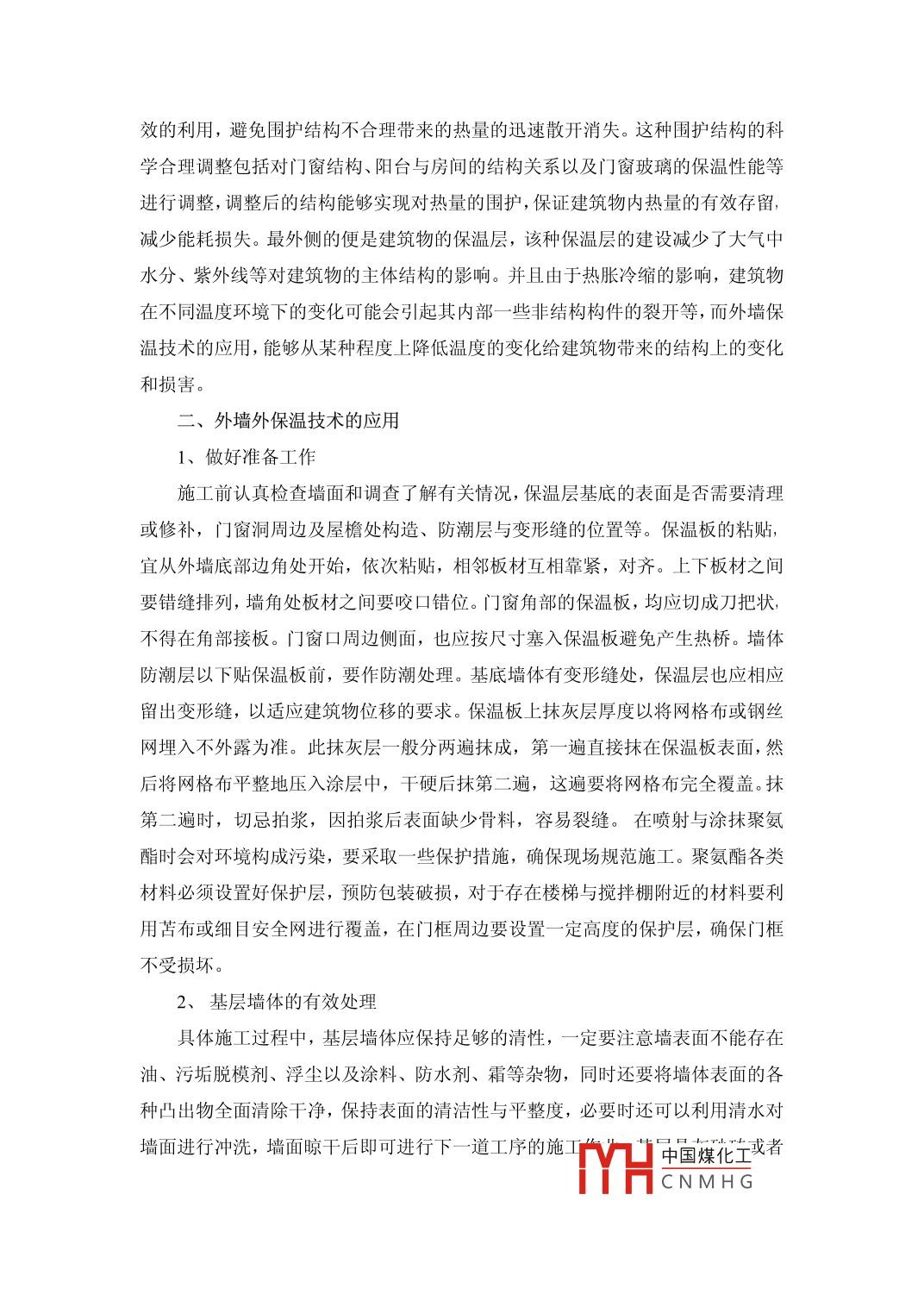 建筑節(jié)能及外墻外保溫節(jié)能技術的應用陳海濤中國華冶科工集團有限公司山東266100摘要:建筑節(jié)能中外墻保溫具有先進性、優(yōu)越性,建筑外墻保溫的實施和應用為我國建筑節(jié)能標準的推廣、實現(xiàn)綠色生態(tài)建筑發(fā)展提供堅強有力的保障。關鍵詞:建筑節(jié)能;外墻保溫;應用中圖分類號:TE08文獻標識碼前言外墻既要承重又要起保溫作用,外墻厚度必然較厚。采用高效保溫材料后,墻厚得以減薄。但如果采用內保溫,主墻體越薄,保溫層越厚,熱橋的問題就越趨于嚴重。在寒冷的冬天,熱橋不僅會造成額外的熱損失,還可能使外墻內表面潮濕、結露,甚至發(fā)霉和淌水,而外保溫則可以不存在這種問題。使用保溫材料對外墻進行隔熱、保溫,外墻外保溫既適用于新建建筑,也適用于既有建筑的節(jié)能改造,建筑節(jié)能中外墻保溫的優(yōu)越性外墻保溫技術作為一種新經(jīng)濟技術革命和經(jīng)濟危機下的產(chǎn)物,誕生于二十世紀七十年代的石油危機時期的歐洲,該種技術的出現(xiàn)是應對能源問題和有效對付能源危機的有效措施。新時期,我國面臨更大的資源和能源壓力,為了節(jié)約資源緩解壓力,新的建造技術不斷被應用到相關領域,外墻保溫技術應用于建筑業(yè),降低建筑物在取暖等方面的能源消耗。建筑物種節(jié)能目標的實現(xiàn)是通過一些列結構的調整來實現(xiàn),這種結構包括建筑物從內到外的內部供暖及采熱系統(tǒng)、建筑圍護結構以及建筑物外側的保溫層多重結構共同作用來實現(xiàn)的。就供暖采熱系統(tǒng)而言,通過相關管道的建設和及時維修護養(yǎng),減少供暖過程中因為管道破損等問題帶來的能耗損失;在供暖過程中提高鍋爐燃燒率和管道熱量傳輸效率,減少熱量在產(chǎn)生和傳輸過程中的損耗。這可以通過供熱管道的合理設計和安裝,實現(xiàn)供熱系統(tǒng)性能的改善。由此向外,是建筑圍護結構在建筑物保溫和降低能耗中的作用的實現(xiàn)。對于圍護結構的改善最主中國煤化工要的是其熱工性能的改善,保證建筑物得到的熱量供給CNMHG分有效的利用,避免圍護結構不合理帶來的熱量的迅速散開消失。這種圍護結構的科學合理調整包括對門窗結構、陽臺與房間的結構關系以及門窗玻璃的保溫性能等進行調整,調整后的結構能夠實現(xiàn)對熱量的圍護,保證建筑物內熱量的有效存留,減少能耗損失。最外側的便是建筑物的保溫層,該種保溫層的建設減少了大氣中水分、紫外線等對建筑物的主體結構的影響。并且由于熱脹冷縮的影響,建筑物在不同溫度環(huán)境下的變化可能會引起其內部一些非結構構件的裂開等,而外墻保溫技術的應用,能夠從某種程度上降低溫度的變化給建筑物帶來的結構上的變化和損害外墻外保溫技術的應用1、做好準備工作施工前認真檢査墻面和調査了解有關情況,保溫層基底的表面是否需要淸理或修補,門窗洞周邊及屋檐處構造、防潮層與變形縫的位置等。保溫板的粘貼,宜從外墻底部邊角處開始,依次粘貼,相鄰板材互相靠緊,對齊。上下板材之間要錯縫排列,墻角處板材之間要咬口錯位。門窗角部的保溫板,均應切成刀把狀不得在角部接板。門窗口周邊側面,也應按尺寸塞入保溫板避免產(chǎn)生熱橋。墻體防潮層以下貼保溫板前,要作防潮處理?;讐w有變形縫處,保溫層也應相應留岀變形縫,以適應建筑物位移的要求。保溫板上抹灰層厚度以將網(wǎng)格布或鋼絲網(wǎng)埋入不外露為準。此抹灰層一般分兩遍抹成,第一遍直接抹在保溫板表面,然后將網(wǎng)格布平整地壓入涂層中,干硬后抹第二遍,這遍要將網(wǎng)格布完全覆蓋。抹第二遍時,切忌拍漿,因拍漿后表面缺少骨料,容易裂縫。在噴射與涂抹聚氨酯時會對環(huán)境構成污染,要釆取一些保護措施,確保現(xiàn)場規(guī)范施工。聚氨酯各類材料必須設置好保護層,預防包裝破損,對于存在樓梯與攪拌棚附近的材料要利用苫布或細目安全網(wǎng)進行覆蓋,在門框周邊要設置一定高度的保護層,確保門框不受損壞。2、基層墻體的有效處理具體施工過程中,基層墻體應保持足夠的淸性,一定要注意墻表面不能存在油、污垢脫模劑、浮塵以及涂料、防水劑、霜等雜物,同時還要將墻體表面的各種凸出物全面清除干凈,保持表面的清潔性與平整度,必要時還可以利用清水對墻面進行沖洗,墻面晾干后即可進行下一道工序的施中國煤化工或者CNMHG硅酸鹽砌塊時,要對其基底附著力進行有效的檢驗:若為中性洗滌劑淸洗基層墻面,則可以采用清水對其進行沖洗、晾干;以1:1的比例配制粘結膠漿,準備小塊聚苯板,并在其上面抹粘結膠漿,厚度控制在13毫米左右;該聚苯板粘貼在基層墻面上后,對其進行三天的有效養(yǎng)護;如果粘結膠漿層、基層墻體遭到了嚴重的破壞,那么說明該材料不適合該墻體3、聚苯板施工沿外墻散水標高彈好散水水平線,設置變形縫位置,在墻面彈出縫線、變形縫的寬度線。具體粘貼施工方法是:利用不銹鋼材料的抹子,沿著聚苯板周圍涂抹粘結膠漿,寬度與厚度分別控制在50毫米、10毫米,若利用的是標準尺寸聚苯板,則在板中間位置可均勻地布置8個點,其直徑大約在10厘米左右,厚在10毫米左右,而且中心距一般控制在20厘米左右。在聚苯板黏貼過程中應當保持操作的迅速性,而且聚苯板安裝施工之前,粘結
