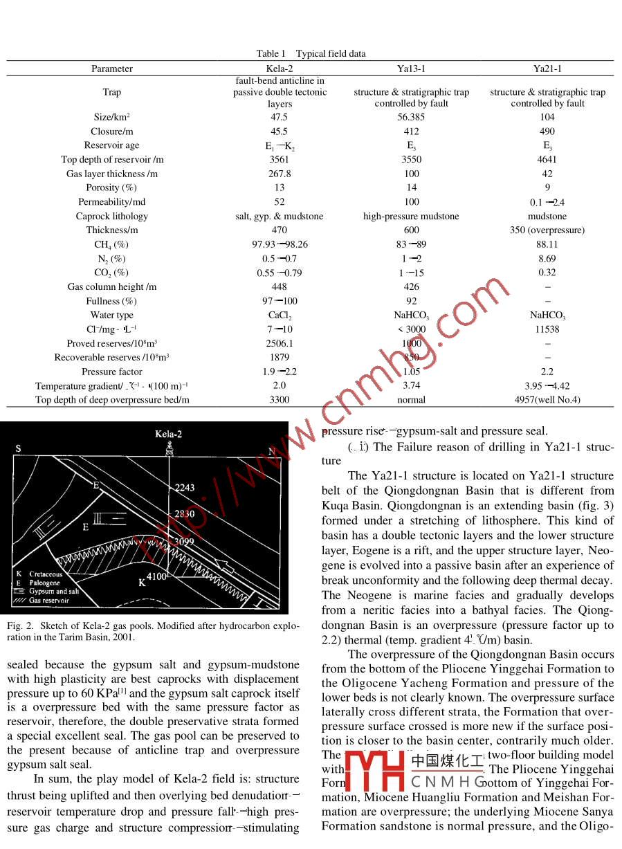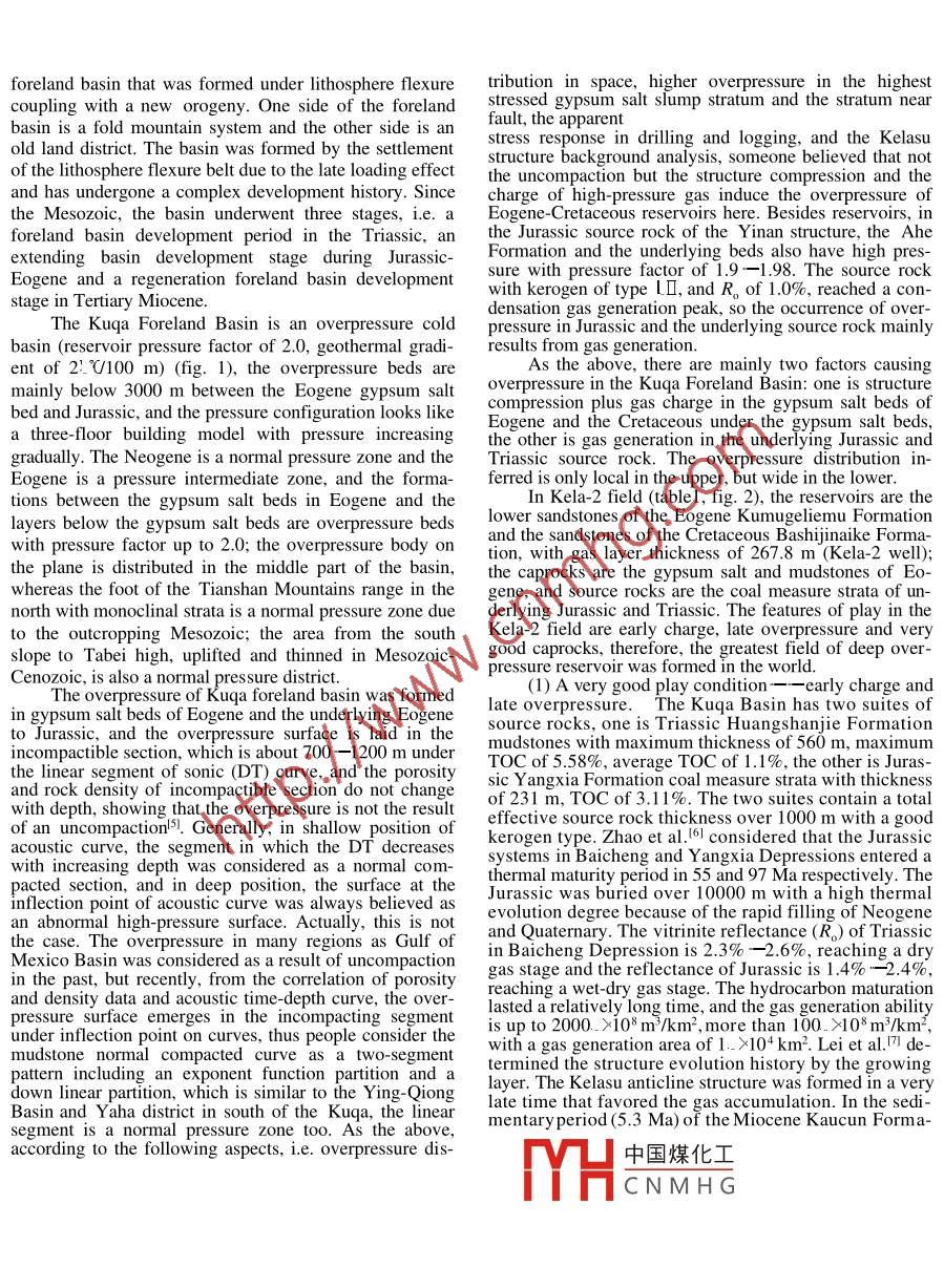 Deep overpressure gasbesides near the top overpressure surface, the hydrocarbonin overpressure basin was mainly accumulated in the presaccumulationsure transition zone and normal pressure zone, and anaccumulation in deep overpressure zone may be formedunder the given conditions. This paper discusses playZHANG Qimingconditions under deep overpressure over 2.0 pressureChina Offshore Oil Nanhai West Corporation, Zhanjiang 524057, China factor by comparison of the Kela-2 field in the Kuga(e-mail:zhangqm@cnooc.com.cn)Foreland Basin with Ya2 1-1 structure in the Qiongdong-Abstract The Kela-2 gas field in the Kuqa Depression of nan Basinthe Tarim Basin is one of the greatest fields recently discov- 1 Hydrocarbon occurrence in overpressure basinered in the deep overpressure reservoir in the world. Theplay conditions of Kela-2 field and Ya2l-1 structure featuresThe hydrocarbons in overpressure basin are com-in the Qiongdongnan Basin on the South China Sea shelf has monly distributed in the normal pressure zone and thebeen studied, and a gas accumulation under deep overpres. pressure intermediate zone. It is rarely accumulated in thefavourable conditions for gas ith overpressure occurrence level in exploration in overpressure basins. The results ofccumulation): one is that the Soviet Union are the earliest countries with the highesttime of gas charge matchestime, and the other is a good quality caprock. If the charge exploration proved that the hydrocarbon reserves from thewas early and the overpressure occurrence was late, and a deep overpressure reservoir cover only a small part of thefine caprock of the evaporite bed existed, the accumulation total reserveof gas is favourable; conversely, it is difficult to form a gasFor example, the hydrocarbon exploration of Trinidadl3 was started in 1866 and the first drilling well wasKeywords: overpressure, overpressure basin, deep overpressure near the oil seepage and the mud volcano. Trinidad is thereservoir, gas accumulationearliest country conducting high-pressure bed investigation in the world. After World War. the abnormal highBoth the Trinidad and the Former Soviet Union are pressure played an important role in the exploration andthe earliest countries in the world which carried out the development. By the end of 1995, the total productionexploration in the overpressure basin and the drilling from the six fields in interesting areas was 1310. >104m3works in overpressure bed were started in the middle ofthe igth century. In the 1940s-1950s of the 20th century, pressure intermediate belt with pressure over 16.4 KPa/mthe discoveries of overpressure basin became more and whereas the fields in the overpressure and deep overpress-more and the people started to study the overpressure sure belt had hardly commercial value.mechanism from respective speciality. In the 1960sIn the Former Soviet Union+, the overpressure wasoverpressure prediction techniques for prevention of over 5000 holes were encountered in Timan-Pechoeadrilling accident. After the 1980s scholars started the weWest Siberia, East Siberia, Volga-Ural, Sokhalinskiystudy of overpressure-hydro-carbon relationship. So far, North Caspian. South Caspian and North Caucasus. Thethe overpressure basins over 180 have been discovered in statistical results showed that 90% wells with pressurethe world. From the 1950s to now, the overpressure factor below 1. 8 had commercial value, indicating that thesystems have been discovered in 29 basins in Sichuan hydrocarbon in overpressure basin was distributed in theduring hydrocarbon exploration of overpressure fissure- normal pressure and intermediate beltbecame a geologic leading edge technology. Up to now, 2 Accumulation under deepoverpressurescholars have discussed the hydrocarbon occurrence inoverpressure basin, but rarely studied the play condition fissures existing in tight sandstones and limestone, andunder deep overpressure. China has accumulated a wealth pore sandstones being covered by an intact thick mud-of experiences in deep overpressure from the explorations stones, as well as pore sandstones or pore limestone andin the Ying-Qiong Basin, the South China Sea, the fractured limestone being covered by an evaporite,canSichuan Basin, the Dungar Basin and the Tarim Basin, the gas in deep overpressure reservoirs be reserved to theXinjiang. The study is an urgent affair for developpresthe first three kinds ofChinas natural gas industry Law et al中國煤化工1- scale gas fields. but themost of hydrocarbonsverpressure basinsCNMH GSuch as the Kela-2 fieldaccumulated near the top overpressure and the reservoirs1)Accumulation of the Kela-2 field. The Kela-2hardly produced hydrocarbon when the pressure gradient field is located in Kuqa Foreland Basin, to the north isis over 19 KPa/Tianshan fold mountain chain. and to the south is theAccording to the authors practical experiencesChinese Science Bulletin Vol 47 Supp. December 2002foreland basin that was formed under lithosphere flexure tribution in space, higher overpressure in the highestcoupling with a new orogeny. One side of the foreland stressed gypsum salt slump stratum and the stratum nearbasin is a fold mountain system and the other sidefault, the apparentstress response in drilling and logging, and the Kelasuold land district. The basin was formed by the settlement structure background analysis, someone believed that notof the lithosphere flexure belt due to the late loading effect the uncompaction but the structure compression and theand has undergone a complex development history. Since charge of high-pressure gas induce the overpressure ofthe Mesozoic, the basin underwent three stages, i.e. a Eogene-Cretaceous reservoirs here. Besides reservoirs, inforeland basin development period in the Triassic,anin the Jurassic source rock of the Yinan structure, the Alextending basin develoFormation and the underlying beds also have high pressure with pressure factor of 1.9--1.98. The source rockEogene and a regen