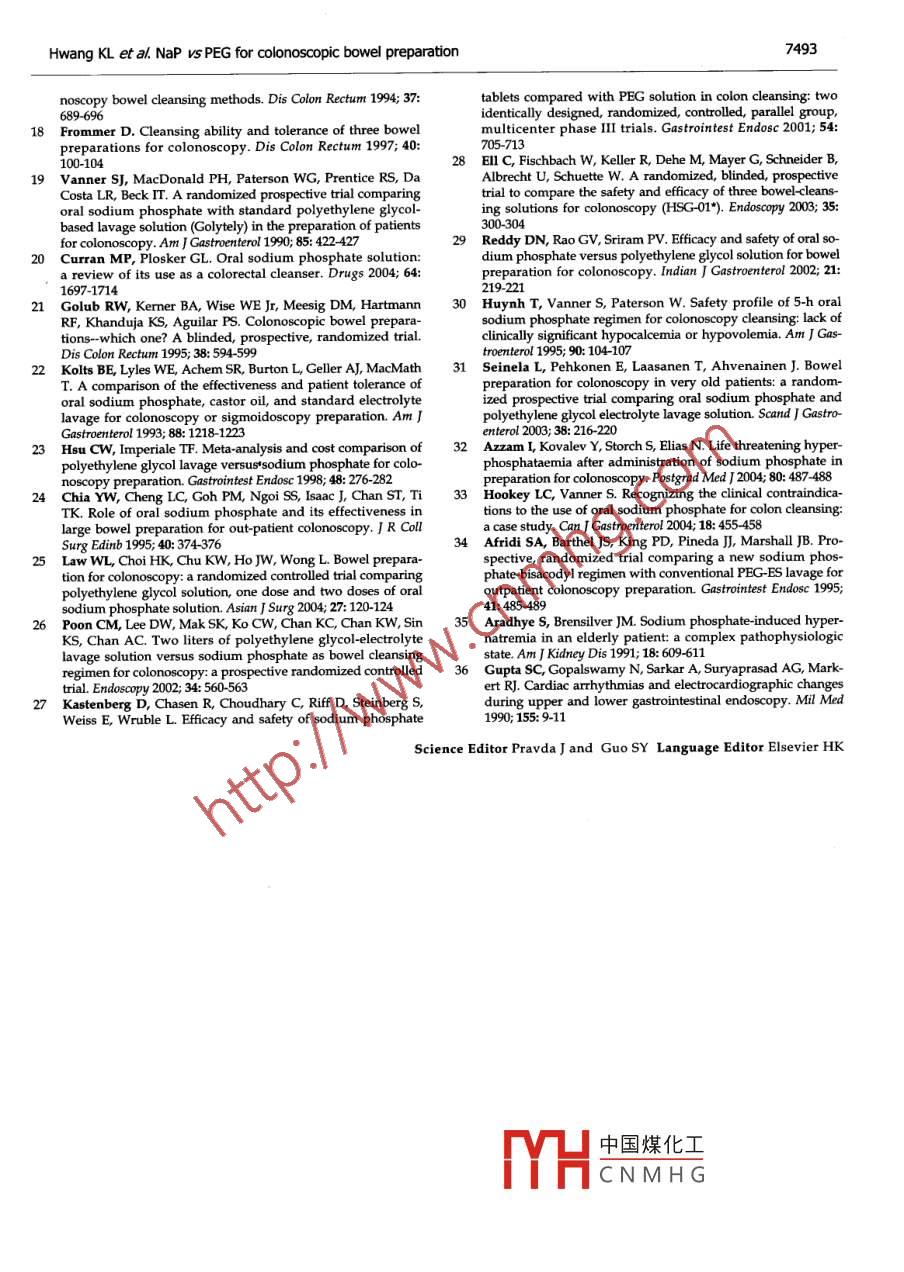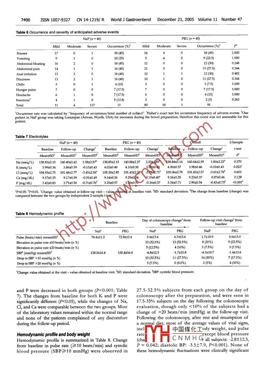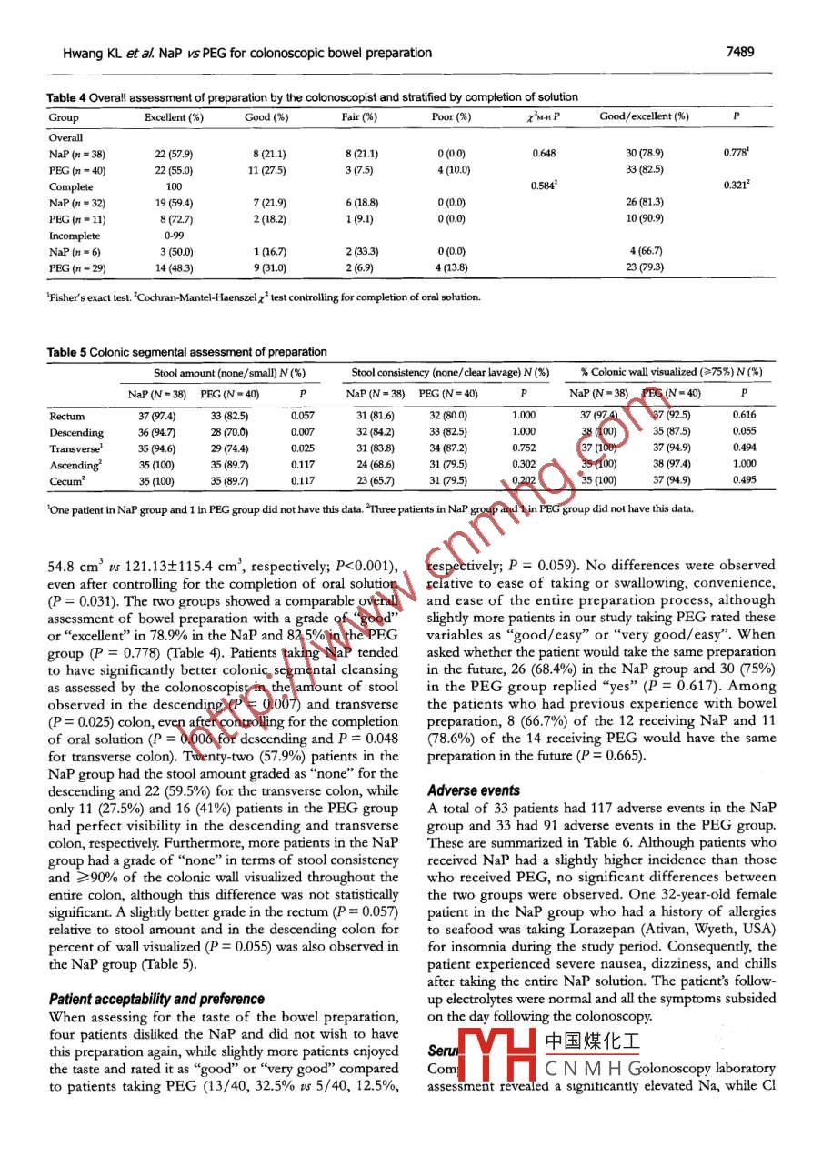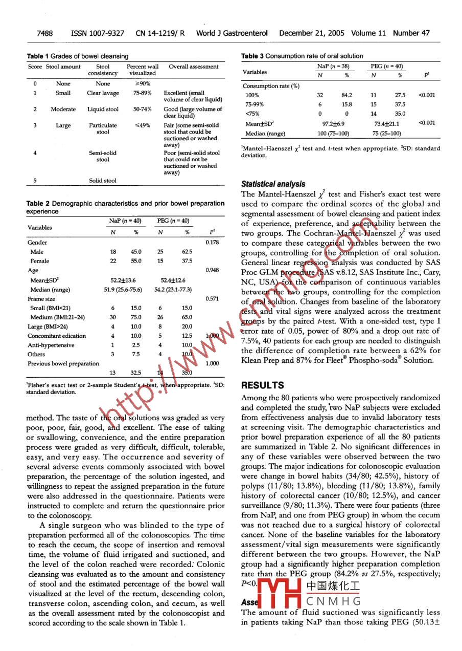 PO Box 2345, Beijing 100023, ChinaWorld I Gastroenterol 2005;11(47:7486-7493www.wjgnet.comWorld Journal of Gastroenterology ISSN 1007-9327wjg@wignet.comELSEVIER◎2005 The wjG Press and Elsevier Inc. All rights reserved.●CLINTCAL RESEARCH●Prospective rando mized comparison of oral sodiumphosphate and polyethylene glycol lavage for colonoscopypreparationKai-in Hwang, Wlliam Tzu-Liang Chen, Koung-Hong Hsiao, Hong-Chang Chen, Ting-Ming Huang, Chien-Ming Chiu,Ger-Haur HsuKai-Lin Hwang, Department of Public Health, Chung Shantransverse (94.6% vs 74.4%, P = 0.025) colon. lightlyMedical University, Taichung 402, Taiwan; Center for Clinicalmore patients graded the taste of NaP as "good" or "veryTrials, ChangHua Christian Hospital, Changhua 500, Taiwan,good" compared to the PEG patients (32.5% Vs 12.5%;ChinaP = 0.059). Patients' willingness to take the same prepa-William Tzu-Liang Chen, Koung-Hong Hsiao, Hong-Changration in the future was 68.4% in the NaP compared toChen, Ting-Ming Huang, Chien-Ming Chiu, Ger-Haur Hsu,75% in the PEG group (P = 0.617). There was a signif-Division of Colorectal Surgery at ChangHua Christian Hospital,cant increase in serum sodium and a significant decreaseChanghua 500, Taiwan, ChinaThis study was conducted at the Division of Colorectal Surgery atin phosphate and chloride levels in NaP group on the dayfollowing the colonoscopy without any dlinical sequelae.ChangHua Christian Hospital, Changhua 500, Taiwan, ChinaCorrespondence to: Dir. William Tzu-Liang Chen, Division ofProlonged (>24 h) hemodynamic changes were also ob-Colorectal Surgery, ChangHua Christian Hospital, 135 Nanhsiaoserved in 20-35% subjects of either group.Street, Changhua, 500, Taiwan, China. 37599@cch.org.twTelephone: +886- 4-7238595 Fax: +886-4-7227945CONCLUSION: Both bowel cleansing agents provedReceived: 2005-04-07Accepted: 2005-07-08to be similar in safety and effectiveness, while NaP ap-peared to be more cost-effective. After identifying andexcluding patients with potential risk factors, sodiumphosphate should become an alternative preparation forAbstractpatients undergoing elective colonoscopy in the Taiwan-AIM: To compare the effectiveness, patient acceptability,ese population. ,and physical tolerability of two oral lavage solutions priorG 2005 The W)G Press and Elsevier Inc. AIl rights reserved.to colonoscopy in a Taiwanese population.METHODS: Eighty consecutive patients were random-Key words: Colonoscopy; Bowel preparation; Sodiumized to receive either standard 4 L of polyethylene glycolphosphate; Polyethylene glycol(PEG) or 90 mL of sodium phosphate (NaP) in a splitHwang KL, Chen WTL, Hsiao KH, Chen HC, Huang TM,regimen of two 45 mL doses separated by 12 h, prior toChiu CM, Hsu GH. A prospective randomized comparisoncolonoscopic evaluation. The primary endpoint was theof oral sodium phosphate and polyethylene glycol lavagepercent of subjects who had completed the preparation.for colonoscopy preparation. World J Gastroentero/ 2005;Secondary endpoints included colonic dleansing evalu-11(47): 7486-7493ated with' an overall assessment and segmental evalua-http://www.wjgnet.com/1007-9327/11/7486.asption, the tolerance and acceptability assessed by a self-administered structured questionnaire, and a safety pro-file such as any unexpected adverse events, electrolytetests, physical exams, vital signs, and body weights.INTRODUCTIONRESULTS: A significantly higher completion rate wasColonoscopy has become an essential procedure for thefound in the NaP group compared to the PEG groupdetection and treatment of colonic lesions; therefore,(84.2% vs 27.5%, P<0.001). The amount of fluid SuC-cleansing the bowel for adequate visualization of thetioned was significantly less in patients taking NaP VSmucosa during colonoscopic examination isPEG (50.13+54.8 cc vs 121.13+115.4 c, P<0.001),important. In the past two decades, various boweleven after controlling for completion of the oral solutionpreparation methods have been proposed including castor(P = 0.031). The two groups showed a comparabledinhenulmathanes, phenolphthalein,overall assessment of bowel preparation with a rate of"good" or "excellent" in 78.9% of patients in the NaPand中國(guó)煤化工tion with a low residuegroup and 82.5% in PEG group (P = 0.778). Patientsdiet'TYH.CNMHGansing agents, cleansingenembowel preparations .taking NaP tended to have significantly better colonicThe introduction of polyethylene glycol (PEG) in 1980,segmental cleansing relative to stool amount observedin the descending (94.7% Vs 70%, P = 0.007) andan osmotically balanced solution, gradually replaced the7487Hwang KL et al. NaP vs PEG for colonoscopic bowel preparationrigorous traditional 2 d preparation of enemas, a。MATERIALS AND METHODSliquid diet, and laxatives in various combinationsPatients and methodsAlthough PEG provided safe and effective bowel cleansing,From August 2003 to December 2003, 80 consecutivethe patient was required to take 3-4 Lof a salty tastingpatients who underwent elective colonoscopy weresolution within a short period of time'e61. As repotted,enolled in this study. Eligible patients who had given5-15% of patients were unable to finish the prescribedwritten informed consent were randomized to receivedosagelhio, potenialy resuling in a pootly cleansed coloneither the standard 4 L of PEG (Klean Prep solution;and inadequate colonoscopic assessment'Helsinn Birex Pharmaceuticals Ltd, UK) or 90 mL of NaPOral sodium phosphate (NaP), a highly osmotic(Fleet' Phospho soda*; C.B. Fleet Company, Inc, USA),cathattic containing monobasic and dibasic sodiumin a split regimen of two 45 mL doses separated by 12 h,phosphate, was first evaluated by Vanner et al' in 1990prior to the colonoscopic evaluation. Colonoscopy wasby comparing it with PEG solutions. The mechanism ofscheduled after 8:00 a.m. for all the subiects, and studyNaP is through the osmotic effect of phosphate. Thissubjects werc asked to report to the endoscopy room bydraws large amounts of water 