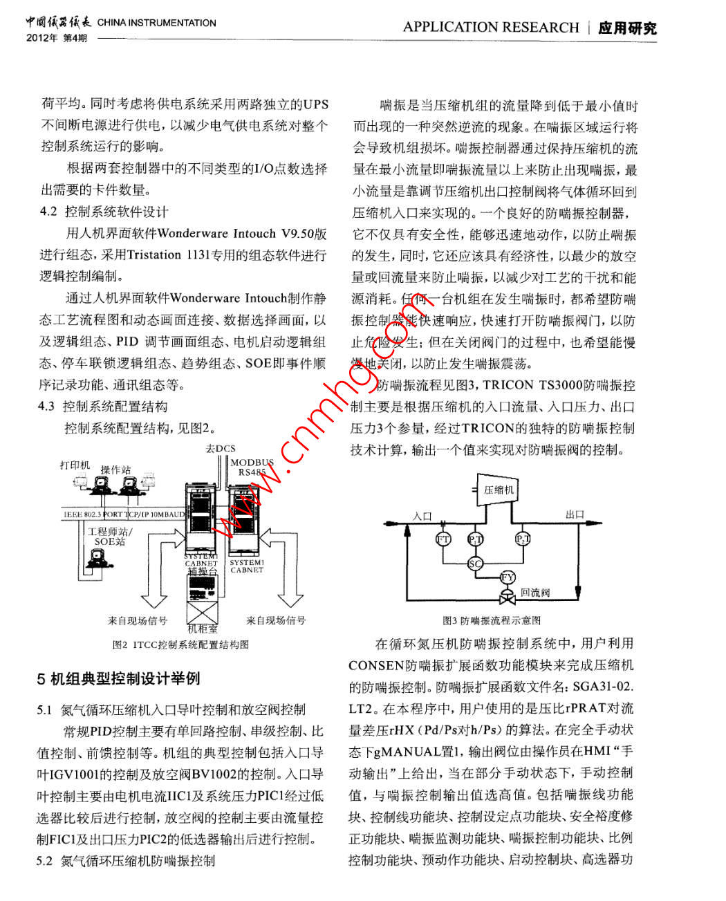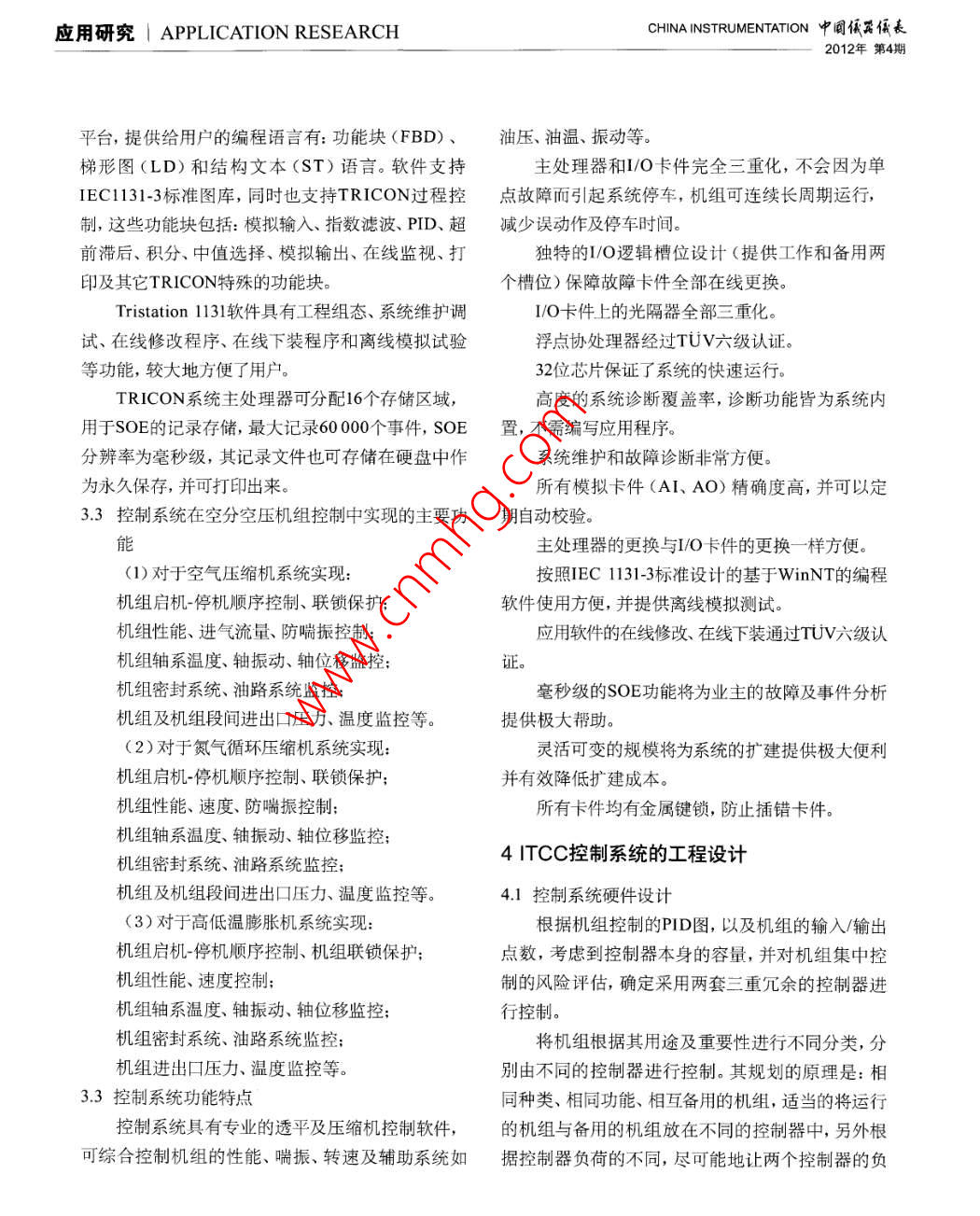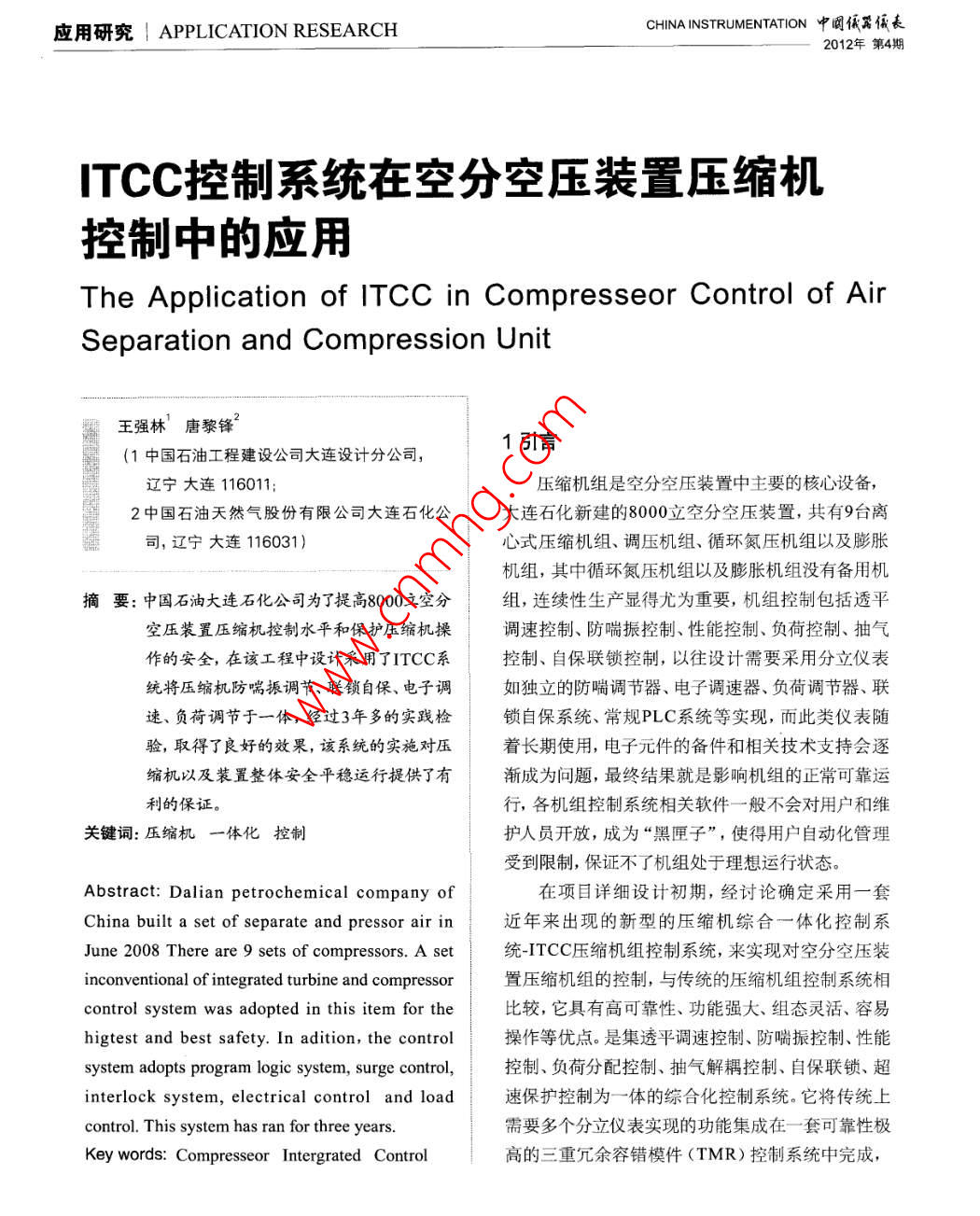 應(yīng)用研究| APPLICATION RESEARCHCHINA INSTRUMENTATION中闞露佞表2012年第4期Tcc控制系統(tǒng)在空分空壓裝置壓縮機(jī)控制中的應(yīng)用The Application of ITCC in Compresseor Control of AirSeparation and Compression Unit王強(qiáng)林唐黎鋒翻(1中國石油工程建設(shè)公司大連設(shè)計分公司,1引言遼寧大連116011壓縮機(jī)組是空分空壓裝置中主要的核心設(shè)備,2中國石油天然氣股份有限公司大連石化公大連石化新建的8000立空分空壓裝置,共有9臺離司,遼寧大連116031)心式壓縮機(jī)組、調(diào)壓機(jī)組、循環(huán)氮壓機(jī)組以及膨脹機(jī)組,其中循環(huán)氮壓機(jī)組以及膨脹機(jī)組沒有備用機(jī)摘要:中國石油大連石化公司為了提高800空分組,連續(xù)性生產(chǎn)顯得尤為重要,機(jī)組控制包括透平空壓裝置壓縮機(jī)控制水平和保護(hù)壓縮機(jī)操調(diào)速控制、防喘振控制、性能控制、負(fù)荷控制、抽氣作的安全,在該工程中設(shè)計采用了ITCC系控制、自保聯(lián)鎖控制,以往設(shè)計需要采用分立儀表統(tǒng)將壓編機(jī)防喘振調(diào)節(jié)、聯(lián)鎖自保、電子調(diào)如獨(dú)立的防喘調(diào)節(jié)器、電子調(diào)速器、負(fù)荷調(diào)節(jié)器、聯(lián)速、負(fù)荷調(diào)節(jié)于一體,經(jīng)過3年多的實(shí)踐檢鎖自保系統(tǒng)、常規(guī)PLC系統(tǒng)等實(shí)現(xiàn),而此類儀表隨驗(yàn),取得了良好的效果,該系統(tǒng)的實(shí)施對壓著長期使用,電子元件的備件和相關(guān)技術(shù)支持會逐縮機(jī)以及裝置整體安全平穩(wěn)運(yùn)行提供了有漸成為問題,最終結(jié)果就是影響機(jī)組的正常可靠運(yùn)利的保證。行,各機(jī)組控制系統(tǒng)相關(guān)軟件一般不會對用戶和維關(guān)鍵詞:壓縮機(jī)一體化控制護(hù)人員開放,成為“黑匣子”,使得用戶自動化管理受到限制,保證不了機(jī)組處于理想運(yùn)行狀態(tài)。Abstract: Dalian petrochemical company of在項(xiàng)目詳細(xì)設(shè)計初期,經(jīng)討論確定采用一套China built a set of separate and pressor air in近年來出現(xiàn)的新型的壓縮機(jī)綜合一體化控制系June2008 There are9 sets of compressors. A set統(tǒng)ITCC壓縮機(jī)組控制系統(tǒng),來實(shí)現(xiàn)對空分空壓裝inconventional of integrated turbine and compressor置壓縮機(jī)組的控制,與傳統(tǒng)的壓縮機(jī)組控制系統(tǒng)相control system was adopted in this item for the比較,它具有高可靠性、功能強(qiáng)大、組態(tài)靈活、容易higtest and best safety. In adition, the control操作等優(yōu)點(diǎn)。是集透平調(diào)速控制、防喘振控制、性能system adopts program logic system,. surge control,掉控制、負(fù)荷分配控制抽氣解耦控制、自保聯(lián)鎖、超interlock system, electrical control and load速保護(hù)控制為一體的綜合化控制系統(tǒng)。它將傳統(tǒng)上control. This system has ran for three years需要多個分立儀表實(shí)現(xiàn)的功能集成在一套可靠性極Key words: Compresseor Intergrated Control高的三重冗余容錯模件(TMR)控制系統(tǒng)中完成,中明佞露長 CHINA INSTRUMENTATIONAPPLICATION RESEARCH應(yīng)用研究2012年第4期因此減少了各個系統(tǒng)間的連接和故障率,降低了長之為 TRICON的基于三重冗余容錯模件(TMR)結(jié)周期運(yùn)行成本,提供了先進(jìn)的控制技術(shù)和良好的監(jiān)構(gòu)的控制器, TRICON系統(tǒng)有3個主處理器,每一個控界面。主處理器的CPU為32位、50MHz,16MRAM,工作2空分空壓機(jī)組設(shè)置概況方式為3-2-1-0。其32位浮點(diǎn)協(xié)處理器的使用得到了TUV6級的安全認(rèn)證。系統(tǒng)中所有的IO信號都要經(jīng)大連石化公司新建空分空壓裝置機(jī)組設(shè)置概況過硬件的三取二表決。如下:數(shù)字量輸入信號在DI模件中被分成隔離的三機(jī)組類型功能數(shù)量機(jī)組位號路,通過3個獨(dú)立的通道分別被送到3個主處理器中料機(jī)空分原料壓縮2c1011,美國SC1012Atlascopco進(jìn)行三取二表決;經(jīng)糾正任何偏差后的數(shù)據(jù)通過3氮壓機(jī)空分氮?dú)庋h(huán)1SC102美國Cooper條IO總線被送到DO模件,并在DO模件通過獲得專膨脹機(jī)空分膨脹致冷1HT101利的“方形表決電路”硬件進(jìn)行再次表決,DI、DOHT102Cryostat壓縮機(jī)空壓原料壓縮3Sc201-1,美國模件均采用與現(xiàn)場光電隔離方式,以及“ STUCKSC201-2, AtlascopcoSC201-3ON、 STUCK OFF”檢測功能。調(diào)壓機(jī)組空壓風(fēng)量調(diào)節(jié)2SC202-1,美國同樣模擬量輸入信號在AI模件中被分成隔離SC202-2 Ingersoll Rand3TCC控制系統(tǒng)簡介的三路,通過A模塊上每一個分電路的模數(shù)轉(zhuǎn)換器把模擬量轉(zhuǎn)換成12位的數(shù)字量,用32位的協(xié)處理器31控制系統(tǒng)硬件介紹進(jìn)行處理,每個主處理器采用選取中間值的算法讀ITCC控制系統(tǒng)采用的是 TRICON TS3000系取正確值,并糾正任何分電路中的偏差,主處理器統(tǒng),硬件設(shè)置如下:主要包括2套冗余控制器、2套操輸出的模擬量信號在AO模塊中的模擬輸出選擇器作站、2套輔助操作臺、1套工程師站,ⅠO數(shù)量約922中進(jìn)行選擇,以確保輸出信號的準(zhǔn)確點(diǎn),ITCC控制系統(tǒng)通過ECM4119A的RS-232/485從用戶的角度來看,系統(tǒng)的使用非常簡單。用戶接口與DCS系統(tǒng)進(jìn)行串行通訊,執(zhí)行 MODBUS通只要將傳感器和輸出回路的接線接