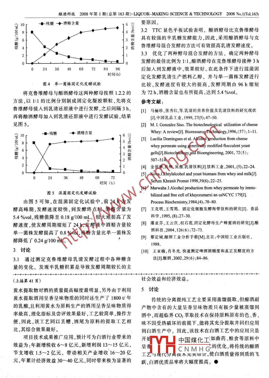 釀酒科技2008年第1期(總第163期)· LIQUOR- MAKING SCIENCE& TECHNOLOGY2008Nol(rol163)混菌固定化發(fā)酵乳清生產(chǎn)燃料乙醇的硏究周珺,肖冬光,郭學(xué)武,王艷(天津科技大學(xué)天津市工業(yè)微生物重點(diǎn)實(shí)驗(yàn)室,天津300457)摘要:采用克魯維酵母和釀酒酵母混合發(fā)酵,并對(duì)混菌固定化發(fā)酵的方法進(jìn)行研究。結(jié)果表明,兩種酵母發(fā)酵的最佳比例為11,釀酒酵母在克魯維酵母接種3h后加入到發(fā)酵液中;在該條件下,發(fā)酵周期由%6h減少至Th。關(guān)鍵詞:燃料乙醇;乳清;混菌;固定化酵母中圖分類號(hào):TS262.2;TS2614;Q814文獻(xiàn)標(biāo)識(shí)碼:A文章編號(hào):1001-9286(2008)01-0042-03Study on Whey Fermentation by Mixed Yeast to Produce Fuel EthanolZHoU Jun, XIAO Dong-guang, GUO Xue-wu and WANG Yan(Tianjin Industrial Microbiology Key Lab, Tianjin University of Science and Technology, Tianjin, 300457, China)Abstract: Whey fermentation by mixed yeast (Kluyveromyces marxianus and Saccharomyces cerevisiae )to produce fuel ethanol was studied.The results showed that the best ratio of the two yeast was 1: l, and Saccharomyces cerevisiae was added in the fermenting solution 3 h later afterthe inoculation of Kluyveromycesnus, which could shorten fermentation time from 96 h to 72 hKey words: fuel ethanol; whey; mixed yeast; immobilized yeast乳清是生產(chǎn)干酪或干酪素的副產(chǎn)品,營(yíng)養(yǎng)豐富,相1.21乳清還原液的制備(w/v)當(dāng)于除去酪蛋白的脫脂乳的營(yíng)養(yǎng)。目前國(guó)外乳清資源乳清粉12%,pH60;110℃,20min滅菌;初始糖度化研究較多的是利用乳清生產(chǎn)乳清蛋白、乳清粉、乳糖、10.2g/100mL。酒精等產(chǎn)品習(xí);而國(guó)內(nèi)的研究主要集中在利用乳清作122酵母細(xì)胞的固定化方法為基料生產(chǎn)調(diào)配型果汁乳清飲料、發(fā)酵型乳酸飲料或發(fā)將TY-13與AY-5分別經(jīng)種子培養(yǎng)后,取酵母種酵型含醇飲料。1998年 Savova J首次利用乳清發(fā)酵子液與海藻酸鈉溶液混合均勻,用注射器滴入CaCl2的生產(chǎn)乙醇。固定化微生物可以進(jìn)行高密度增殖培養(yǎng)提溶液中造粒,浸泡1h,濾出固定化顆粒,用無(wú)菌水洗滌高生物轉(zhuǎn)化速率,增加穩(wěn)定性。采用固定化、共固定化細(xì)2次,再浸泡入CaCl2溶液中進(jìn)行固化,固化后用生理鹽胞生產(chǎn)酒精、啤酒、果酒及食醋等的研究十分盛行四。水洗滌2次備用。其中,酵母種子液、海藻酸鈉和固化劑Marwaha和 Kennedy用褐藻酸鈉和角叉膠包埋固定化CaCl2的體積比為:1:3克魯維酵母生產(chǎn)乙醇。經(jīng)試驗(yàn)發(fā)現(xiàn),克魯維酵母具有較1.23酵母細(xì)胞的增殖培養(yǎng)高的乳糖酶活力,但對(duì)半乳糖的發(fā)酵速度較慢,而釀酒將制備好的固定化酵母凝膠顆粒接入到乳清還原酵母不具備乳糖酶活力,但其利用半乳糖能力較好。鑒液中,30℃活化24h。于此,本文采用混菌固定化的方法發(fā)酵乳清生產(chǎn)燃料乙1.24分析方法醇,有效地提高了發(fā)酵速度,縮短了發(fā)酵周期。發(fā)酵液總還原糖含量:菲林滴定法門。1材料與方法發(fā)酵液葡萄糖含量:SBA-40型多功能生物傳感儀。發(fā)酵液酒精含量:快速氧化法圓。1.1材料發(fā)酵液酵母濃度:在620nm下用分光光度法測(cè)定。菌種:克魯維酵母( Kluyveromyces marxianus)TY-發(fā)酵液乳糖及半乳糖含量:先取一定量樣液,經(jīng)適13;釀酒酵母( Saccharomyces cerevisiae)AY-5。當(dāng)稀釋后測(cè)定其中葡萄糖的含量(Glul)。將樣液中乳糖乳清粉:地球牌甜乳清粉,天津奧凱化工貿(mào)易有限全部酸解成為葡萄糖和半乳糖,再測(cè)定其中的葡萄糖含公司;海藻酸鈉:上海化學(xué)試劑廠;氯化鈣:天津市凱通化學(xué)試劑有限公司。中國(guó)煤化工6×360.32。1.2方法CNMHG收稿日期:2007-09作者簡(jiǎn)介:周珺(1982-),女,天津人,碩士研究生研究方向:現(xiàn)代釀造技術(shù)周珺,肖冬光,郭學(xué)武,王艷·混菌固定化發(fā)酵乳清生產(chǎn)燃料乙醇的研究半乳糖N=G-M-Ghu1。乳糖,同時(shí)乳糖被分解為葡萄糖和半乳糖,克魯維酵2結(jié)果與分析母也可以較好地利用葡萄糖,但是對(duì)半乳糖利用效果并不理想;而釀酒酵母利用葡萄糖和半乳糖能力都較21克魯維酵母發(fā)酵乳清強(qiáng),可以解除半乳糖積累的問(wèn)題。所以,確定合適的克以乳清還原液為發(fā)酵培養(yǎng)基,接入克魯維酵母魯維酵母和釀酒酵母的比例,對(duì)于發(fā)酵速率和酒精生(TY-13)進(jìn)行發(fā)酵(20~40h為發(fā)酵高峰期)發(fā)酵過(guò)程成量是十分重要的。為考察不同比例的菌種配比對(duì)本中,定時(shí)測(cè)定其酵母生長(zhǎng)量乳糖葡萄糖和半乳糖的變實(shí)驗(yàn)的影響,以不同比例的克魯維酵母制成固定化粒化量,并在發(fā)酵結(jié)束時(shí),測(cè)定酒精含量,結(jié)果見(jiàn)表1子,以10%接種量接入發(fā)酵培養(yǎng)基,30℃搖瓶發(fā)酵表1發(fā)酵過(guò)程中各種參數(shù)變化的測(cè)定(ag/100m)60h,結(jié)果見(jiàn)圖2。由圖2可知,當(dāng)兩種酵母的比例為參數(shù)時(shí)間(h)1:1時(shí),殘?zhí)侵递^低,為0.23g/100mL,而酒精含量較24283248607296高,達(dá)到46%Vol葡萄糖殘?zhí)恰艟凭堪肴樘?607817168.942.12210乳糖147.5134124.61119688酒精含量0D值0.1450.2060.220.5810.6080.650.705由表1中3種糖的變化可知,有半乳糖的積累現(xiàn)A53:1211:11:21:3m130象,葡萄糖基本上無(wú)積累。表1中酒精含量和OD值的菌株比例變化量