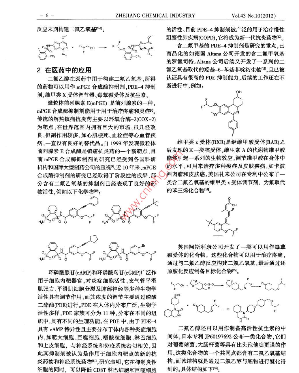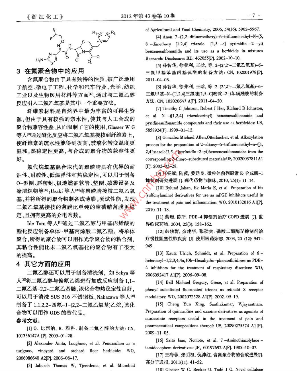 《浙江化工》2012年第43卷第10期章編號:10064184(2012)100005-0第化2,2-二氟乙醇的應用蔣強李華徐衛(wèi)國陳忠民戴佳亮楊汪松(浙江省化工研究院有限公司,浙江杭州310023)摘要:綜述了22一二氟乙醇的性質,并討論了在農(nóng)藥、醫(yī)藥,含氟聚合物等中的應用,同時分析了一些含2,2-二氟乙氧基化合物的特性及應用。關鍵詞:2,2-二氟乙醉;二氟乙氧基;特性;應用2,2-二氟乙醇(以下簡稱二氟乙醇)是重要含氟前稻田用除草劑中殺草譜最廣的品種。精細化學品之一,分子式為C2HF2O,CAS號:359五氟磺草胺屬于三唑并嘧啶磺酰胺類除草劑,13-7常溫下為無色液體,沸點96℃,熔點-28℃,通過抑制乙酰乳酸合成酶(AS而起作用。2004年相對密度1296,折射率134其酸性與苯酚相當,9月24日在美國EPA正式注冊登記,2005年在美溶于水、酸、乙醇、乙醚等。二氟乙醇性質穩(wěn)定,蒸餾國南部稻區(qū)推廣應用,2008年在中國登記,目前在時不分解。二氟乙醇有很多化學性質與乙醇類似,我國登記的劑型為25%的油懸浮劑。其羥基能發(fā)生與乙醇羥基類似的化學反應,可以通五氟磺草胺能被土壤迅速吸附,但不會長期滯過醚化、酯化等反應合成二氟乙氧基。二氟乙醇可留在土壤中。它能被光解和微生物降解,對水生生由2,2-二氯乙醇與氟化鉀在高沸點乙二醇類溶劑物毒害低,屬于高效低毒的新型農(nóng)藥。五氟磺草胺中反應制得,亦可由二氟乙酰鹵還原得到由于二還能和一系列的除草劑復配使用,如殺草丹、殺草氟乙醇含有二氟甲基的特殊結構,被廣泛的用于農(nóng)隆、解草胺、解草惡唑和解草腈等q。藥領域,醫(yī)藥領域及含氟聚合物中五氟磺草胺中的二氟乙氧基可以在反應末期1在農(nóng)藥中的應用構建也可以在反應中構建。二氟乙醇在農(nóng)藥中主要用于合成五氟磺草胺。反應中構建二氟乙氧基q五氟磺草胺是由美國陶氏溢農(nóng)公司開發(fā)的廣譜除草劑,主要用于水稻除草??捎行Х莱薏?、千金子以及一年生莎草科雜草,并對眾多闊葉雜草有效,如沼生異蕊花、鯉腸、田菁、竹節(jié)花、鴨舌草等。同時,其亦可防除稻田中的抗芐嘧磺隆雜草。有效期長達30~60d,一次用藥能基本控制全季雜草危害,是目ZHEJIANG CHEMICAL INDUSTRY Vol43 No10(2012)反應末期構建二氟乙氧基副的活性。目前PDE4抑制劑被廣泛的用于治療慢性阻塞性肺疾病(COPD),它將成為新一代抗炎藥物嗎。含二氟甲基的PDE4抑制劑是研究的重點,已商品化的如德國 Altana公司開發(fā)的含二氟甲氧基的羅氟司特。 Altana公司后續(xù)又開發(fā)了一系列的二2在醫(yī)藥中的應用氟乙氧基取代的羥基-6-苯基菲啶衍生物嗎,且已被二氟乙醇在醫(yī)藥中用于構建二氟乙氧基,所得認證具有很高的PDE抑制能力后續(xù)的工作還在不的藥物可以用作mPGE合成酶抑制劑,PDE4抑制斷進行中例如:劑維甲類X受體調節(jié)器、毒蕈堿受體及抗生素。微粒體前列腺素 E(mPGE)是前列腺素的一種mPGE合成酶抑制劑能用于用于治療疼痛和炎癥陰傳統(tǒng)的解熱鎮(zhèn)痛抗炎藥主要以環(huán)氧合酶-2(COX-2)為靶點,在世界范圍內擁有巨大的市場,雖幾經(jīng)改良,但副作用較多,如心肌梗死、血栓癥等心血管疾病,一直沒有良好的替代品。自1999年發(fā)現(xiàn)微粒體維甲類x受體RXR)是繼維甲酸受體RAR)之前列腺素E合成酶是鎮(zhèn)痛抗炎藥的一個新靶點目后發(fā)現(xiàn)的又一類核受體維生素A的代謝物維甲酸前mPGE合成酶抑制劑的研究已經(jīng)受到各國科研能夠引起一系列的生物效應,調節(jié)維甲酸在身體中機構和國際大型制藥公司的重視近10年來,mPGE的水平,可用來治療多種癌癥及皮膚疾病,如卡波合成酶抑制劑的研究已經(jīng)取得了階段性的成果,部西肉瘤和皮膚癌美國禮來公司在專利中公布了分含有二氟乙氧基的抑制劑已經(jīng)表現(xiàn)了良好的藥類含二氟乙氧基的維甲類x受體調節(jié)劑,為氟取代物活性例如以下化學物叫的苯三烯化合物嗎。英國阿斯利康公司開發(fā)了一類可以用作毒蕈堿受體的化合物,這些化合物可以用于治療疼痛,通過與二氟乙醇反應構建二氟乙氧基,最后通過還環(huán)磷酸腺苷(cAMP和環(huán)磷酸鳥苷(cCMP廣泛作原胺化反應制備目標化合物嗎。用于細胞內靶器官,對炎癥細胞活性、支氣管平滑肌張力平滑肌細胞分裂及肺部神經(jīng)等多種生物學6活性具有調節(jié)作用,而其濃度的調節(jié)主要通過磷酸二酯酶PDE進行。PDE在人體內分布廣泛,生物學活性多樣,PDE家族可分為11種,分布在不同的組織中,具有不同的生理功能。在PDE中,由于PDE4具有cAMP特異性且主要分布于體內各種炎癥細胞二氟乙醇還可以用作制備高活性抗生素的中內,如肥大細胞、巨噬細胞、嗜酸粒細胞、淋巴細胞間體,日本專利P60197692公布一類化合物它們和上皮細胞,與神經(jīng)系統(tǒng)和免疫系統(tǒng)密切相關,因對葡萄球菌大腸桿菌等具有比頭孢他啶更強的作此其抑制劑被認為是作用于細胞內靶點的新的抗用。這類化合物的一個共同點都含有二氟乙氧基結炎藥物和神經(jīng)系統(tǒng)藥物叫研究表明,它在抑制炎性構而該結構就是通過二氟乙醇與底物進行醚化得細胞的同時,可以降低CD8T淋巴到的。具體結構如下《浙江化工2012年第43卷第10期R2of Agricultural and Food Chemistry, 2006, 54(16): 5962-5967[4] Anon. 2-(2, 2-difluoroethoxy)-6-trifluoromethyl-N-(5.8-dimethoxy [1, 2, 4] triazolo [1,5 -c] pyrimidin-2 -y