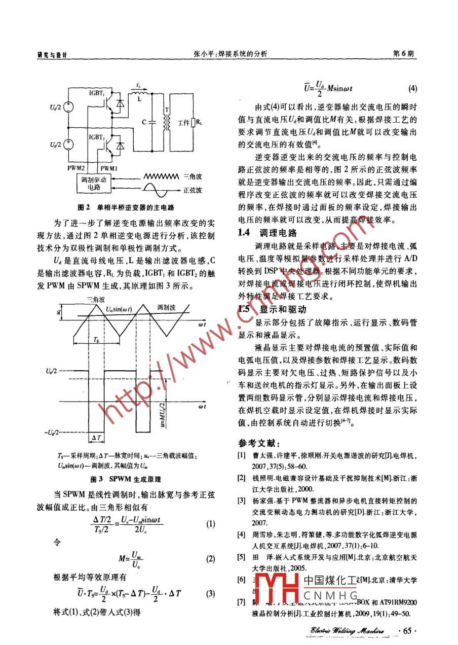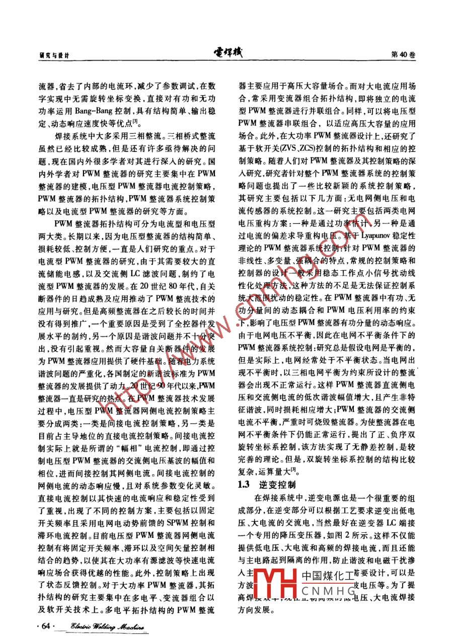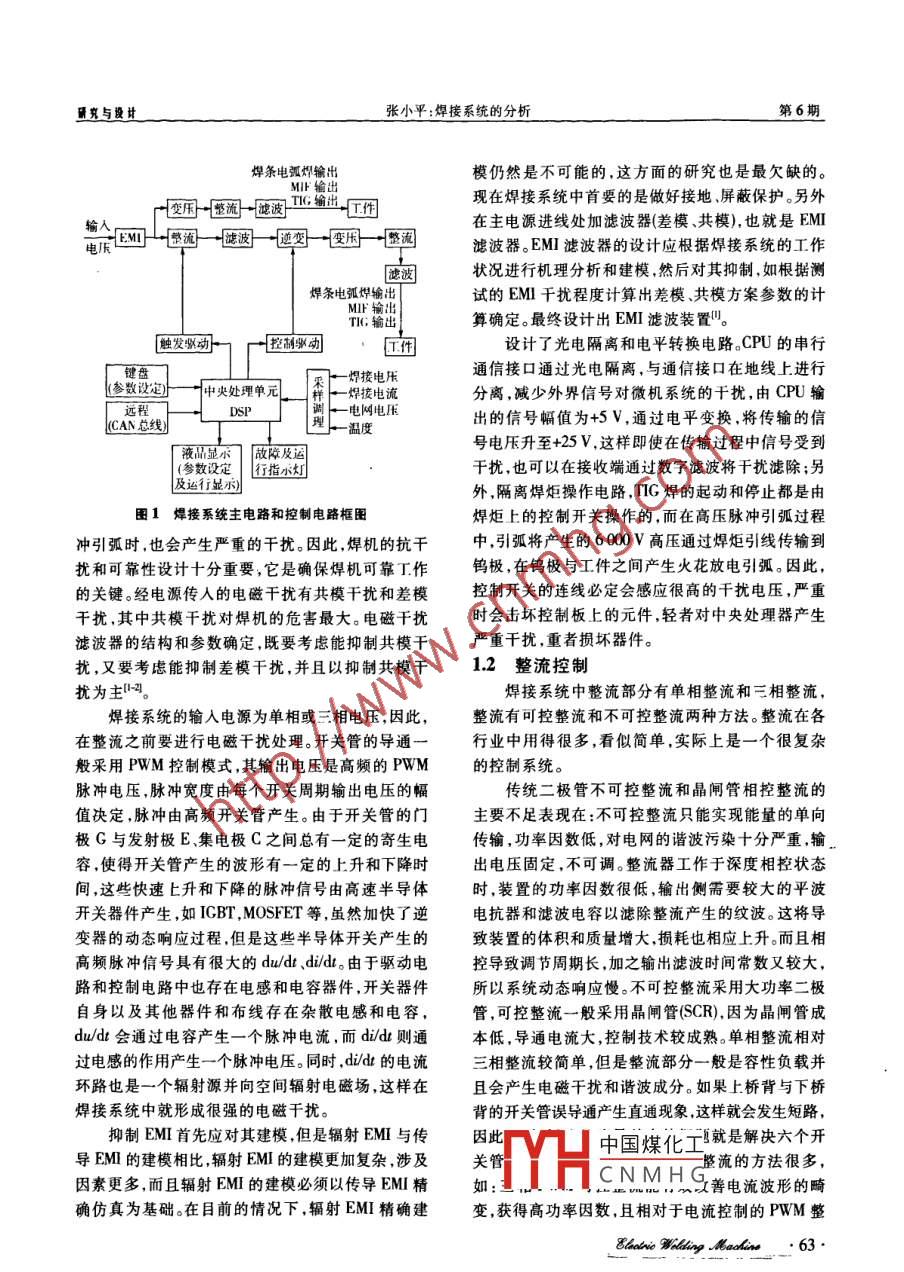 .第40卷第6期電焊棧Vol.40 No.62010年6月Electric Welding MachineJun.2010焊接系統(tǒng)的分析張小平(攀枝花學(xué)院電氣信息工程學(xué)院,四川攀枝花617000)摘要:概述焊接系統(tǒng)的相關(guān)控制部分;重點(diǎn)分析焊接系統(tǒng)中電磁干擾的產(chǎn)生,給焊接系統(tǒng)帶來(lái)的危害以及抑制電磁干擾的方法。由于焊接系統(tǒng)中整流部分是一個(gè)非常重要的環(huán)節(jié),針對(duì)傳統(tǒng)整流控制存在的問(wèn)題,簡(jiǎn)述了整流控制的發(fā)展以及近年來(lái)整流技術(shù)的最新動(dòng)態(tài),以及焊接系統(tǒng)中調(diào)理電路的作用和數(shù)字顯示的特點(diǎn)。關(guān)鍵詞:焊接系統(tǒng);電磁干擾;整流;逆變中圖分類(lèi)號(hào):TC40文獻(xiàn)標(biāo)識(shí)碼:A文章編號(hào):1001-2303(2010)06 -0062 -04Analysis on welding systemZHANG Xiao-ping(School of Information and Electric Engineering , Panzhihua University , Panzhihua 617000 ,China)Abetract:This paper briely intoduces the relative control parts in welding system, and analyies the generation of EMI in weldingsystem,in which has much hamm to welding 8ystem . and shows the methods to control EMI.The three phase rectifer cireuit is animportant part in welding system .aims to the problems in traditional rectifer technology ,simplify the latest development of rectifiertechnology.This paper simply intoduces the functions of conditioning circuit and the features of digital display.Key words :welding system;EMrecifer:inverter0前言調(diào)理控制系統(tǒng),以及多機(jī)控制的CAN總線通信控制。隨著電力電子和數(shù)字控制技術(shù)的高速發(fā)展,焊因此,焊接系統(tǒng)是一個(gè)融入了電力電子技術(shù)和數(shù)字接系統(tǒng)已經(jīng)從傳統(tǒng)的模擬控制逐步向數(shù)字和人工控制技術(shù)的系統(tǒng),在此對(duì)焊接系統(tǒng)中的電磁干擾、整智能控制發(fā)展。另外為了提高焊接質(zhì)量,焊接新型流控制.逆變控制、采樣電路和顯示控制部分進(jìn)行材料也不斷涌現(xiàn),這對(duì)焊接工藝的控制提出了更高分析和概述。要求。如在氬弧焊工藝中,大多采用非接觸式引弧1焊接系統(tǒng)的組成和工作原理方式,通過(guò)高頻高壓擊穿空氣間隙而引燃電弧,由于高壓脈沖的存在,嚴(yán)重影響焊接系統(tǒng)的穩(wěn)定性和可焊接系統(tǒng)主電路和控制電路原理如圖1所示。靠性。焊接系統(tǒng)是多功能控制系統(tǒng),每一部分必須在焊接系統(tǒng)中,電磁干擾和整流控制是相當(dāng)重要的協(xié)調(diào)工作,因此,采用數(shù)字和人工智能控制能夠解兩部分。早期的焊接設(shè)備大多忽略這兩部分,隨著數(shù)決模擬控制不能解決的問(wèn)題,同時(shí)具有體積小,穩(wěn)字控制技術(shù)的發(fā)展和焊接質(zhì)量的提高,焊接系統(tǒng)的定性和可靠性高.易控制、擴(kuò)展和維護(hù)等特點(diǎn)。數(shù)字各部分已經(jīng)引起了專(zhuān)家和生產(chǎn)商的重視??刂坪附酉到y(tǒng)包括:中央處理器(DSP/MCU),用來(lái)運(yùn)1.1電磁干擾的產(chǎn)生和抑制算和協(xié)調(diào)處理焊接系統(tǒng)的其他分單元;送絲控制系隨著變頻調(diào)速技術(shù)和大功率開(kāi)關(guān)電源的大量.統(tǒng),小車(chē)控制系統(tǒng);顯示控制系統(tǒng)、遙控和遠(yuǎn)程控制使用,電網(wǎng)受到高次諧波噪聲的污染越來(lái)越嚴(yán)重,這系統(tǒng)焊接系統(tǒng)中參數(shù)采樣(焊接電壓、電流)的電路中國(guó)煤化工造成傳導(dǎo)性電磁干擾,另一方面,焊機(jī)的收稿日期:2010-02-03逆TYHCNMHG微機(jī)系統(tǒng)與主電作者簡(jiǎn)介:張小平(1956-),男,四川攀枝花人.副教授,主要從事電機(jī)理論電力電子與電力傳動(dòng)的研究工作。路共地時(shí),干擾尤為嚴(yán)重。此外,在TIG焊的高樂(lè)脈.62:_ Ehatis Willing Molin研究與設(shè)計(jì)張小平:焊接系統(tǒng)的分析第6期焊條電弧燜輸出模仍然是不可能的,這方面的研究也是最欠缺的。IF輸出TIG輸出現(xiàn)在焊接系統(tǒng)中首要的是做好接地.屏蔽保護(hù)。另外r變困一整流一濾波一在主電源進(jìn)線處加濾波器(差模、共模),也就是EMI輸人r電話(huà)國(guó)團(tuán)團(tuán)一-謎波一-選變一-空困-整國(guó)濾波器。EMI濾波器的設(shè)計(jì)應(yīng)根據(jù)焊接系統(tǒng)的工作速波狀況進(jìn)行機(jī)理分析和建模,然后對(duì)其抑制,如根據(jù)測(cè)焊條電弧燁輸it試的EMI干擾程度計(jì)算出差模、共模方案參數(shù)的計(jì)TIC輸出算確定。最終設(shè)計(jì)出EMI濾波裝置"。[觸發(fā)馭動(dòng)一r -控制歌動(dòng)設(shè)計(jì)了光電隔離和電平轉(zhuǎn)換電路。CPU的串行鍵盤(pán)焊接電壓通信接口通過(guò)光電隔離,與通信接口在地線上進(jìn)行(參數(shù)設(shè)定)卜中央處理單元樣一焊接電流分離,減少外界信號(hào)對(duì)微機(jī)系統(tǒng)的干擾,由CPU輸DSP調(diào).電網(wǎng)電壓出的信號(hào)幅值為+5V,通過(guò)電平變換,將傳輸?shù)男臗AN總線)-溫度號(hào)電壓升至+25V,這樣即使在傳輸過(guò)程中信號(hào)受到液品顯示故障及運(yùn)(參數(shù)設(shè)定。|行指小燈干擾.也可以在接收端通過(guò)數(shù)字濾波將干擾濾除;另及運(yùn)行顯利外,隔離焊炬操作電路,TIG焊的起動(dòng)和停止都是由圖1焊接系統(tǒng)主電路和控制電路框團(tuán)焊炬上的控制開(kāi)關(guān)操作的,而在高壓脈沖引弧過(guò)程沖引弧