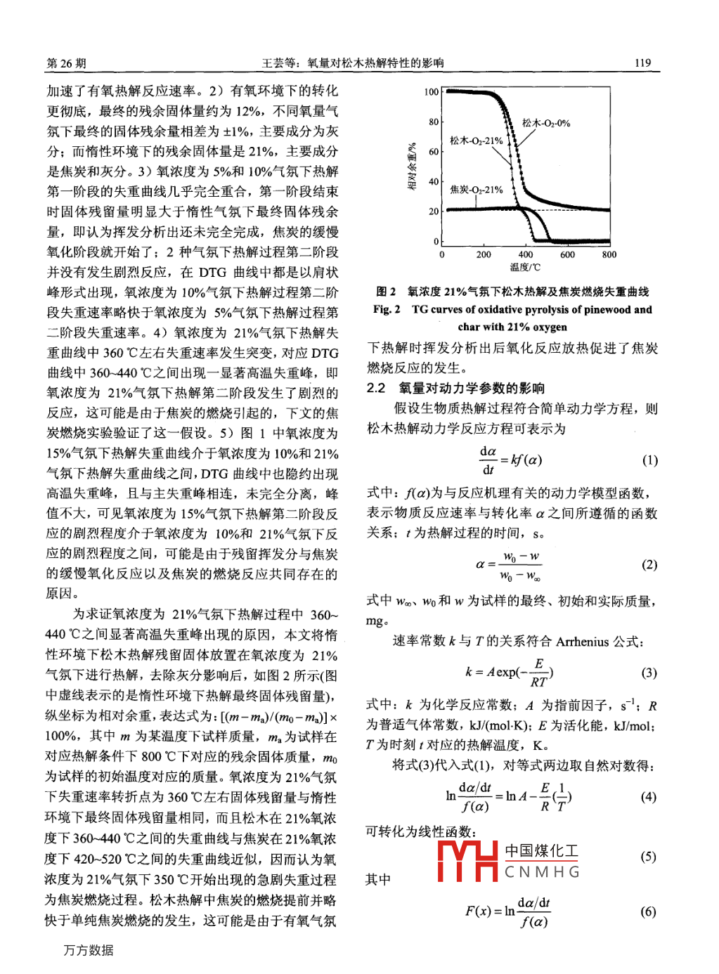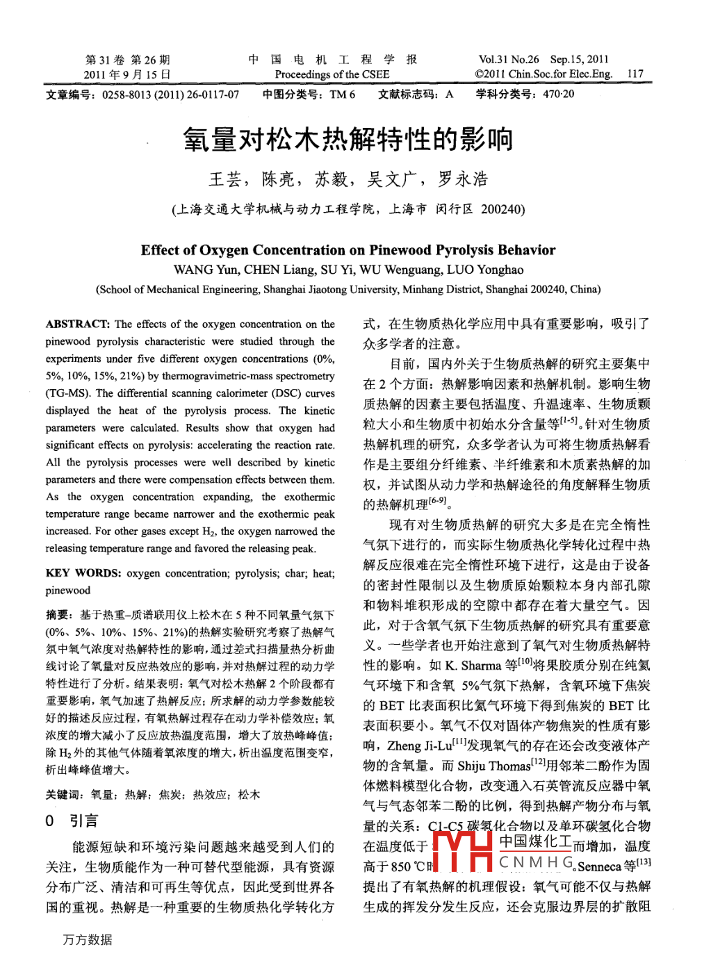 第31卷第26期中國電機工程學報Vol 31 No 26 Sep 15, 20112011年9月15日Proceedings of the CSEEC2011 Chin. Soc. for Elec Eng. 117文章編號:0258-8013(2011)26-0117-07中圖分類號:TM6文獻標志碼:A學科分類號:47020氧量對松木熱解特性的影響王蕓,陳亮,蘇毅,吳文廣,羅永浩(上海交通大學機械與動力工程學院,上海市閔行區(qū)200240)Effect of Oxygen Concentration on Pinewood Pyrolysis BehaviorWANG Yun, CHEN Liang, SU Yi, WU Wenguang, LUO Yonghao(School of Mechanical Engineering, Shanghai Jiaotong University, Minhang District, Shanghai 200240, China)ABSTRACT: The effects of the oxygen concentration on the式,在生物質(zhì)熱化學應用中具有重要影響,吸引了pinewood pyrolysis characteristic were studied through the眾多學者的注意experiments under five different oxygen concentrations (0%,目前,國內(nèi)外關于生物質(zhì)熱解的研究主要集中5%,10%0, 15%, 21%)by thermogravimetric-mass spectromet(TG-MS). The differential scanning calorimeter(DSC)curves在2個方面:熱解影響因素和熱解機制。影響生物displayed the heat of the pyrolysis process. The kinetic質(zhì)熱解的因素主要包括溫度、升溫速率、生物質(zhì)顆parameters were calculated. Results show that oxygen had粒大小和生物質(zhì)中初始水分含量等針對生物質(zhì)significant effects on pyrolysis: accelerating the reaction rate.熱解機理的研究,眾多學者認為可將生物質(zhì)熱解看All the pyrolysis processes were well described by kineti作是主要組分纖維素、半纖維素和木質(zhì)素熱解的加parameters and there were compensation effects between them.權,并試圖從動力學和熱解途徑的角度解釋生物質(zhì)s the oxygen concentration expanding, the exothermic的熱解機理9temperature range became narrower and the exothermic peakncreased. For other gases except H2, the oxygen narrowed the現(xiàn)有對生物質(zhì)熱解的研究大多是在完全惰性releasing temperature range and favored the releasing peak氣氛下進行的,而實際生物質(zhì)熱化學轉(zhuǎn)化過程中熱KEY WORDS: oxygen concentration; pyrolysis; char; heat;解反應很難在完全惰性環(huán)境下進行,這是由于設備的密封性限制以及生物質(zhì)原始顆粒本身內(nèi)部孔隙摘要:基于熱重-質(zhì)譜聯(lián)用儀上松木在5種不同氧量氣氛下和物料堆積形成的空隙中都存在著大量空氣。因0%%6、10%、15%、8/熱解實驗研究考察了熱解氣此,對于含氧氣氛下生物質(zhì)熱解的研究具有重要意氛中氧氣濃度對熱解特性的影響,通過差式掃描量熱分析曲義。一些學者也開始注意到了氧氣對生物質(zhì)熱解特線討論了氧量對反應熱效應的影響,并對熱解過程的動力學性的影響。如K. Sharma等將果膠質(zhì)分別在純氦特性進行了分析。結果表明:氧氣對松木熱解2個階段都有氣環(huán)境下和含氧5%氣氛下熱解,含氧環(huán)境下焦炭重要影響,氧氣加速了熱解反應;所求解的動力學參數(shù)能較的BET比表面積比氦氣環(huán)境下得到焦炭的BET比好的描述反應過程,有氧熱解過程存在動力學補償效應;氧表面積要小。氧氣不僅對固體產(chǎn)物焦炭的性質(zhì)有影濃度的增大減小了反應放熱溫度范圍,增大了放熱峰峰值除H2外的其他氣體隨著氧濃度的增大,析出溫度范圍變窄響, Zheng Ji-Lu發(fā)現(xiàn)氧氣的存在還會改變液體產(chǎn)析出峰峰值增大物的含氧量。而 Shiju Thomas2)鄰苯二酚作為固關鍵詞:氧量焦炭;熱效應;松木體燃料模型化合物,改變通入石英管流反應器中氧氣與氣態(tài)鄰苯二酚的比例,得到熱解產(chǎn)物分布與氧0引言量的關系:化合物以及單環(huán)碳氫化合物能源短缺和環(huán)境污染問題越來越受到人們的在溫度低于中國煤化工而增加,溫度關注,生物質(zhì)能作為一種可替代型能源,具有資源高于850℃CNMHGSenneca等3分布廣泛、清潔和可再生等優(yōu)點,因此受到世界各提出了有氧熱解的機理假設:氧氣可能不僅與熱解國的重視。熱解是一種重要的生物質(zhì)熱化學轉(zhuǎn)化方生成的揮發(fā)分發(fā)生反應,還會克服邊界層的擴散阻118中國電機工程學報第31卷力以及揮發(fā)分析出的流動阻力進入生物質(zhì)孔隙內(nèi)始溫度為40℃,終溫800℃,升溫速率為20Kmin部參與反應。 Yi Chen等國研究了有氧氣氛下稻稈、試樣質(zhì)量為(85±1)玉米桿和玉米芯3種物質(zhì)的熱解特性,發(fā)現(xiàn)隨著氧2結果與分析量的增加,同一種生物質(zhì)的燃燒特性指數(shù)增大,易于燃燒,各氣體析出溫度范圍減小,析出終溫增大。21氧量對失重特性的影響M. X Fang等5發(fā)現(xiàn)棉花稈、印茄木的有氧熱解過圖1為松木在不同氧量下的熱解失重曲線(TG程中都存在臨界氧濃度,氧濃度高于或是低于臨界曲線)和失重速率曲線(OTG曲線)。松木在純氬氣環(huán)氧濃度時,燃燒階段為單一過程,熱解氣氛中含氧境下的熱解反應可分為2個階段:237~394℃為熱濃度低于臨界氧濃度時,燃燒階段為2個過程。以解主要失重階段,395-800℃為半焦緩慢失重階段。上關于有氧氣氛下生物質(zhì)熱解文獻均表明氧氣對有氧氣氛下的熱解過程也可分為2個階段:第一階熱解具有顯著影響,而具體氧量對生物質(zhì)熱解影響段是揮發(fā)分的析出及燃燒;不同氧量下第二階段發(fā)的作用機理目前仍不是很完善生的反應不同,含氧5%和10%氣氛下是殘留揮發(fā)本文考察了氧量對松木熱解特性的影響,主要分及焦炭的緩慢氧化反應,氧量為2%氣氛下是焦研究了氧量對熱解過程第二階段的影響,結合焦炭炭的燃