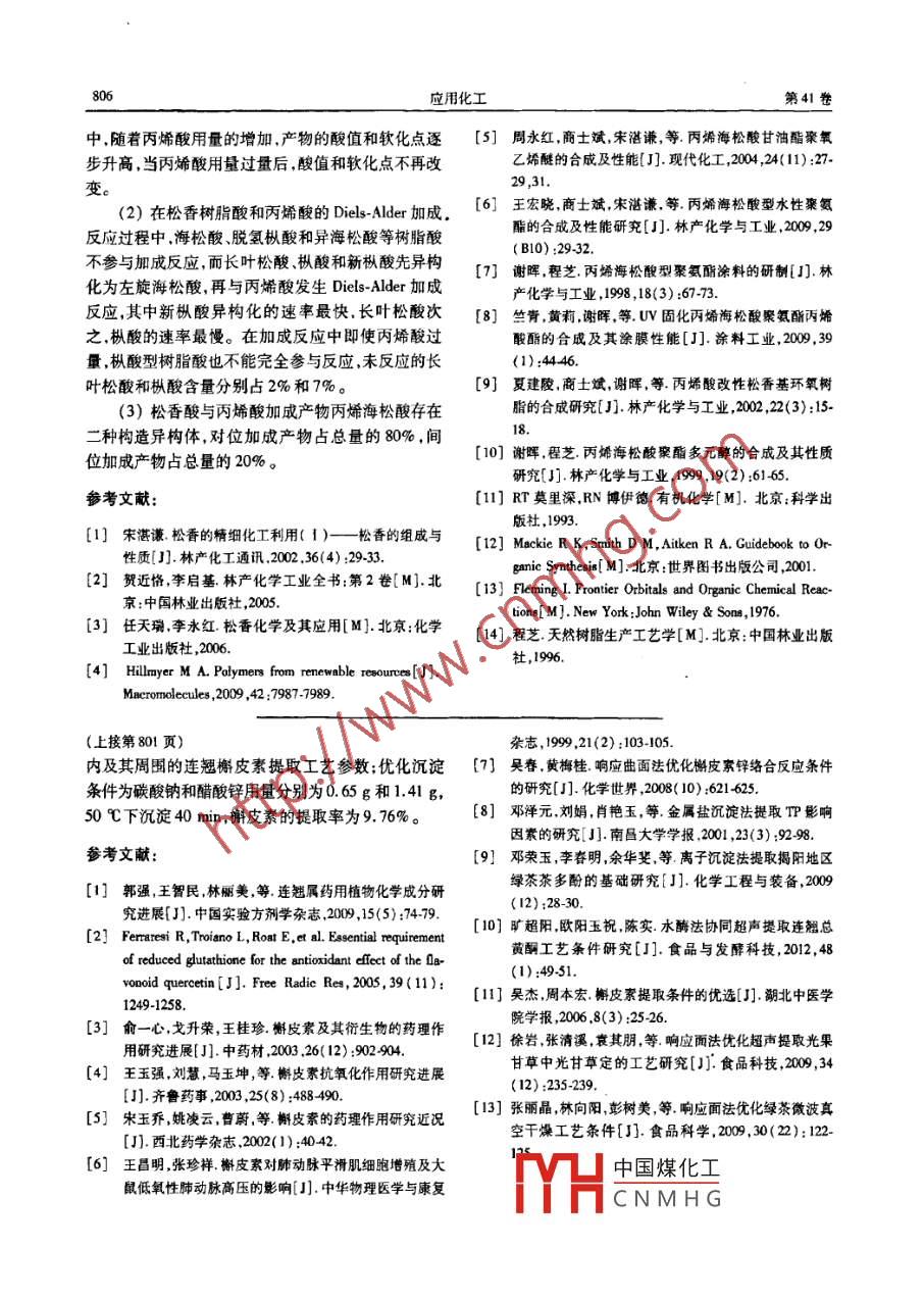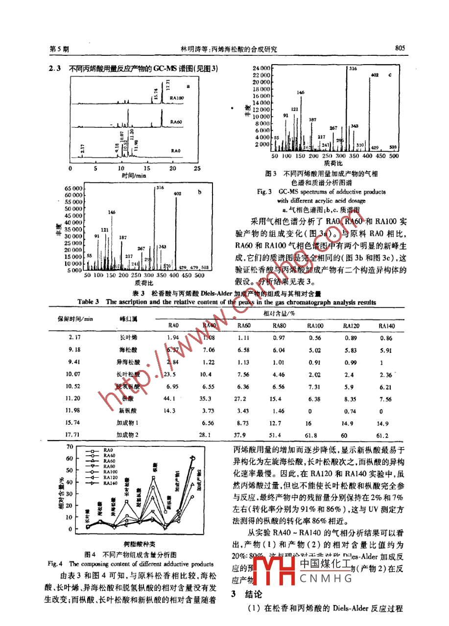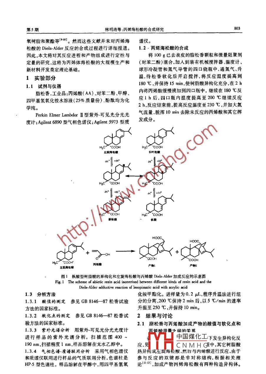 第41卷第5期應(yīng)用化工v.41No.52012年5月Applied Chemical IndustryMay 2012丙烯海松酸的合成研究林明濤'2,王基夫12,劉玉鵬!2,王春鵬2,儲富祥2(1.中國林業(yè)科學(xué)研究院林產(chǎn)化學(xué)工業(yè)研究所國家林業(yè)局林產(chǎn)化學(xué)工程重點開放性實驗室江蘇南京2100422.中國林業(yè)科學(xué)研究院林業(yè)新技術(shù)研充所,北京10001)摘要:通過松香與丙烯酸的Dil- Alder加成反應(yīng)制備了丙烯海松酸,考察了原料摩爾比對反應(yīng)的影響。實驗結(jié)果表明隨著丙烯酸用量的增加,產(chǎn)物的酸值和軟化點逐步升高至不變;紫外光譜研究發(fā)現(xiàn),隨著丙烯酸用量的增長,樅酸型樹脂酸相對含量下降,而海松酸型樹脂酸的含量未見顯著變化;氣相色譜質(zhì)諧聯(lián)用分析顯示,在松香樹脂酸與丙烯酸的加成反應(yīng)中樹脂酸中的海松酸、異海松酸、脫氫樅酸等不參與反應(yīng),而長葉松酸、樅酸和新樅酸異構(gòu)化為左旋海松酸與丙烯酸發(fā)生加成反應(yīng);即使丙烯酸過量,長葉松酸和樅酸轉(zhuǎn)化率最高也只可以達到91%和86%;研究還發(fā)現(xiàn)加成產(chǎn)物丙烯海松酸有二種構(gòu)造異構(gòu)體,分別占丙烯海松酸量的20%和80%。關(guān)鍵詞:丙烯海松酸;合成;松香;丙烯酸;Diel- Alder反應(yīng)中圖分類號:TQ424.19文獻標識碼:A文章編號:1671-3206(2012)05-0802-05Study on the synthesis of acrylpimaric acidLIN Ming-tao, WANG Ji-fu", LIU Yu-peng1.2 WANG Chun-peng, CHU Fu-tuang(1. Institute of Chemical Industry of Forestry Products, CAF, Key and Open Laboratory on Forest ChemicalEngineering, SFA, Nanjing 210042, China; 2. Institute of New Technology of Forestry, CAF, Beijing 100091, China)Abstract Acrylpimaric acid was synthesized by Diels-Alder adductive reaction of rosin and acrylic acidThe molar ratio of rosin acid and acrylic acid how to influence the reaction was studied. It was found thatthe acid number and softening point of products were gradually increased with the increase of dosage ofacrylic acid, until the arrival of equal mole ratio of acrylic acid and resin acid. The UV-VIS result showedthat the abietic acid content in the final products was gradually decreased, while the pimaric resin acidcontent kept constant during the reactions, GC-MS analyzing result showed that pimaric acid, isopimariacid, dehydroabietic acid in the rosin didn't participated in the adductive reaction; and palustric acidabietic acid, neoabietic acid were isomerized into leoopimaric acid firstly, then took part in the adductivereaction with acrylic acid. The final conversion of longifolene acid and abietic acid were only 91% and86% respectively even acrylic acid exceeded the demand of the reaction It was also demonstrated thatacrylpimaric acid has two isomers with relatively proportion of 20% and 80% respectively in the adductive productionKey words: acrylpimaric acid; synthetic; rosin; acrylic acid; Diels-Alder adductive reaction松香是我國重要的林產(chǎn)化學(xué)工業(yè)產(chǎn)品之一,其Ader加成反應(yīng)的產(chǎn)物,由于它在結(jié)構(gòu)上與石油基芳產(chǎn)量和出口量都居世界首位但對松香的使用目前香族二元酸,如對苯二甲酸間苯匚甲酸等結(jié)構(gòu)相國內(nèi)還以直接應(yīng)用為主。如何提高松香的附加值,近因此丙烯海松酸被認為是最有可能替代石油基利用其氫化三元菲環(huán)的分子結(jié)構(gòu)來制備高性能的材高分子單體的化合物之一(。有關(guān)丙烯海松酸改料,是林產(chǎn)化學(xué)工業(yè)需要解決的重要課題之一1。性和應(yīng)用的研究已有文獻報道。如將丙烯海松酸制丙烯海松酸是松香樹脂酸與丙烯酸進行 Diels-備成表面活性劑聚氨酯°)、WV固化涂料、環(huán)收稿日期:20110916修改稿日期20120319基金項目:江蘇省自然科學(xué)基金資助項目(Bx200059:中國林中國煤化工所所長基金(CAFINT2010K04: CAFINT2010C05)作者簡介林明濤(1975-),男安徽當涂人,中國林業(yè)科學(xué)研究院CNMHGH,從事乳液聚合研究及生物質(zhì)材料研究。電話13770504209,E-mail4911036@q通訊聯(lián)系人:儲富祥研究員博土生導(dǎo)師從事乳液聚合及生物質(zhì)材料研究。電話:010-628900,E-ml: chunxiang第5期林明濤等:丙烯海松酸的合成研究803氧樹脂和聚酯等1。然而這些文獻并未對丙烯海譜儀。松酸的 Diels-Alder反應(yīng)的合成過程進行詳細報道。1.2·丙烯海松酸的合成因此,本文將對其反應(yīng)進程和產(chǎn)物組成進行定性與將100g已去表皮的脂松香顆粒和微量阻聚劑定量的研究,這將為丙烯體海松酸的大規(guī)模生產(chǎn)和(對苯二酚)混合,加入到裝有機械攪拌器溫度計新材料開發(fā)奠定理論基礎(chǔ)。球形冷凝管和氮氣導(dǎo)管的四口燒瓶中,通氮氣、升1實驗部分溫,待松香軟化后開啟攪拌,將反應(yīng)溫度提高到11試劑與儀器180℃,并保持15min,使樹脂酸異構(gòu)化充分,在2h脂松香,工業(yè)品;丙烯酸(A)、對苯二酚、甲醇內(nèi)將丙烯酸緩慢滴加到四口瓶中,繼綏在180℃反四甲基氫氧化銨水溶液(25%質(zhì)量份)酚酞均為化應(yīng)1h后四口瓶內(nèi)溫度提高至200℃繼續(xù)反應(yīng)學(xué)純。2h,反應(yīng)結(jié)束前提高反應(yīng)溫度至230℃,并加大氮Perkin Elmer Lambdor型紫外可見光分光光氣流量,脫揮10mn去除未反應(yīng)的丙烯酸和其它揮度計;Alnt6890型氣相色譜儀; Agilent5973型質(zhì)發(fā)成分。左旋海松酸長葉松酸COOHCOCH丙烯最左旋海松酸圖1樅酸型樹脂酸的異構(gòu)化和左旋海松酸與丙烯酸 Diels- Alder加成反應(yīng)的示意圖