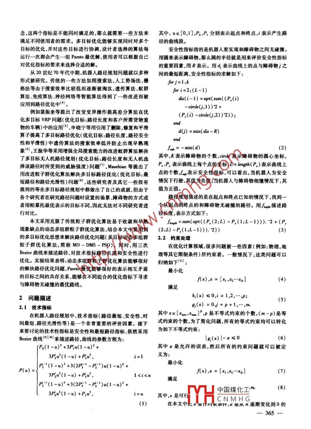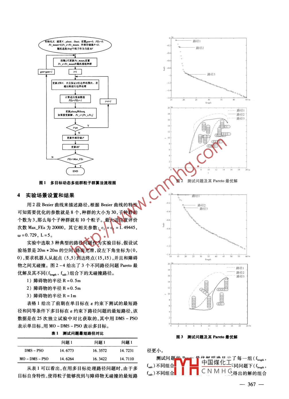 第31卷第4期計(jì)算機(jī)仿真2014年4月文章編號:1006 -9348(2014)04 -0364 -05多目標(biāo)優(yōu)化在路徑優(yōu)化中的應(yīng)用梁靜',宋慧',瞿博陽2(1.鄭州大學(xué)電氣工程學(xué)院,河南鄭州450001 ;2.中原工學(xué)院電子信息學(xué)院,河南鄭州450007)摘要:在移動機(jī)器人路徑規(guī)劃問題的研究中,路徑規(guī)劃的實(shí)質(zhì)是機(jī)器人按照- -定的技術(shù)指標(biāo)找到一條從起 點(diǎn)到終點(diǎn)與障礙物無碰擅的最短路徑。由于路徑長度和安全性指標(biāo)是相互矛盾的兩個(gè)技術(shù)指標(biāo),大多數(shù)現(xiàn)存算法在把它們作為單目標(biāo)優(yōu)化時(shí)容易陷人局部最優(yōu),用多目標(biāo)優(yōu)化中的帕累托最優(yōu)則能夠很好地平衡和解決這兩個(gè)目標(biāo)不同資源分配下的組合情況。用貝塞爾曲線來描述路徑,用帕累托最優(yōu)解決路徑長度和安全性指標(biāo)之間的共存問題。實(shí)驗(yàn)結(jié)果表明,比起單目標(biāo)處理,多目標(biāo)優(yōu)化在解決路徑優(yōu)化問題中路徑長度及安全性指標(biāo)時(shí)較穩(wěn)定,能夠找到滿足條件的更短路徑,并且帕累托最優(yōu)能夠很好地解決不兼容目標(biāo)之間的共存問題,找到不同安全性指標(biāo)下優(yōu)化最短路徑。關(guān)鍵詞:貝塞爾曲線;多目標(biāo)優(yōu)化;帕累托最優(yōu)中圖分類號:TP18文獻(xiàn)標(biāo)識碼:AApplication of Multi - objective Optimizer in Path PlanningLIANG Jing',SONG Hui' ,QU Bo - yang2(1. School of Electrical Engineering, Zhengzhou University , Zhengzhou Henan 450001 , China;2. School of Electric and Information Engineering, Zhongyuan University of Technology,Zhengzhou Henan 450007 , China)ABSTRACT :The essence of robotic path planning is to fnd a cllision - free path from the start location to the targetlocation in an environment with obstacles which satisfy certain optimum criteria. Criteria of path length and securityare contradictory isues in path planning problem, most existing algorithms regard it as a single objective problem andare easily to be trapped into local optima while Pareto optimality in multi - objective optimizer can balance and solvethe combination well under different resource assigned of two goals. In the paper, Bezier curve was used to describepath in this task, and Pareto optimality was utilized to solve the coexistence of path length and security. The resultshows that compared with single - objective optimizer, the multi - objective optimizer is more stable in achieving thecriteria of path length and security and can find the shortest path which satisfies certain conditions. The Pareto opti-mality can effectively solve the coexistence problem of incompatible objectives and find the shortest path under differ-ent safety criteria.KEYWORDS: Bezier curve; Muti - objective optimizer; Pareto optimality最短,機(jī)器人消耗能量最低,花費(fèi)時(shí)間最少,安全性及路徑光1引言滑度等技術(shù)指標(biāo)"。但是這些指標(biāo)在作為單目標(biāo)優(yōu)化處理路徑規(guī)劃在移動機(jī)器人導(dǎo)航中占有很重要的位置,表現(xiàn)時(shí)容易陷局部最優(yōu),因此路徑優(yōu)化問題通常被當(dāng)作很難發(fā)現(xiàn)為機(jī)器人按某--性能指標(biāo)找到--條從起點(diǎn)到終點(diǎn)的和障礙最優(yōu)解的具有多個(gè)目標(biāo)的NP完全問題(2] ,即大多采用多目物無接觸最優(yōu)或者接近最優(yōu)路徑。路徑問題通常涉及路徑標(biāo)優(yōu)化來進(jìn)行處理。與單目標(biāo)優(yōu)化問題不同,多目標(biāo)優(yōu)化向題的目標(biāo)函數(shù)是大于等于二的,大多數(shù)專家學(xué)者用保持非支基金項(xiàng)目:國家自然科學(xué)基金項(xiàng)目(60905039) ;中國博士后科學(xué)基金配解集,同時(shí)將種群朝著非支配解集移動并最終收斂于帕累特別資助項(xiàng)目(2012750639);教育部高等學(xué)校博士學(xué)科點(diǎn)專項(xiàng)科研托曲面的中國煤化工基金( 2010000 ;河南省科技攻關(guān)項(xiàng)目(132102210521)本文中CNMH G'題,需要優(yōu)化的目標(biāo)收稿日期:2013 -07-26修回日期:2013-08 -05是路徑長度相女王比伯你,很亞然,這是兩個(gè)相互矛盾的概一364一念,這兩個(gè)指標(biāo)是不能同時(shí)滿足的,那么就需要- - 些方法來其中,u∈[0,1],PO、P分別表示起點(diǎn)和終點(diǎn),i表示產(chǎn)生路滿足不同使用者的需求。多目標(biāo)優(yōu)化能夠?qū)崿F(xiàn)同時(shí)對多個(gè)徑的曲線段。目標(biāo)的優(yōu)化,并對這些目標(biāo)進(jìn)行協(xié)調(diào),設(shè)計(jì)者選擇的算法每安全性指標(biāo)指的是機(jī)器人要實(shí)現(xiàn)和障礙物之間無碰撞。運(yùn)行一次都會產(chǎn)生一組Pareto 最優(yōu)解,使用者可以根據(jù)自己用圓來表示障礙物,那么圓的半徑就是用來評價(jià)安全性指標(biāo)對優(yōu)化指標(biāo)的要求來選擇合適的解。的重要因素,用R表示。用d,表示曲線上的點(diǎn)與障礙物j之從20世紀(jì)70年代中期,機(jī)器人路徑規(guī)劃問題就以多種間的最短距離,安全性指標(biāo)的求解如下:形式被研究。傳統(tǒng)的一些方法如圖搜索法,人工勢場法,柵forj=1:k格法等由于搜索效率比較低而逐漸被淘汰,遺傳算法、蟻群fori=2:(L-1)算法、免疫算法、神經(jīng)網(wǎng)絡(luò)等智能算法得到了一些改進(jìn)而被dis(i-1) = sqr(sum((P,(i)應(yīng)用到路徑優(yōu)化中[41。- circle(j,1))~2 +例如裴振奎等提出了改變變異操作提高差分算法在優(yōu)(P,(i) -circl