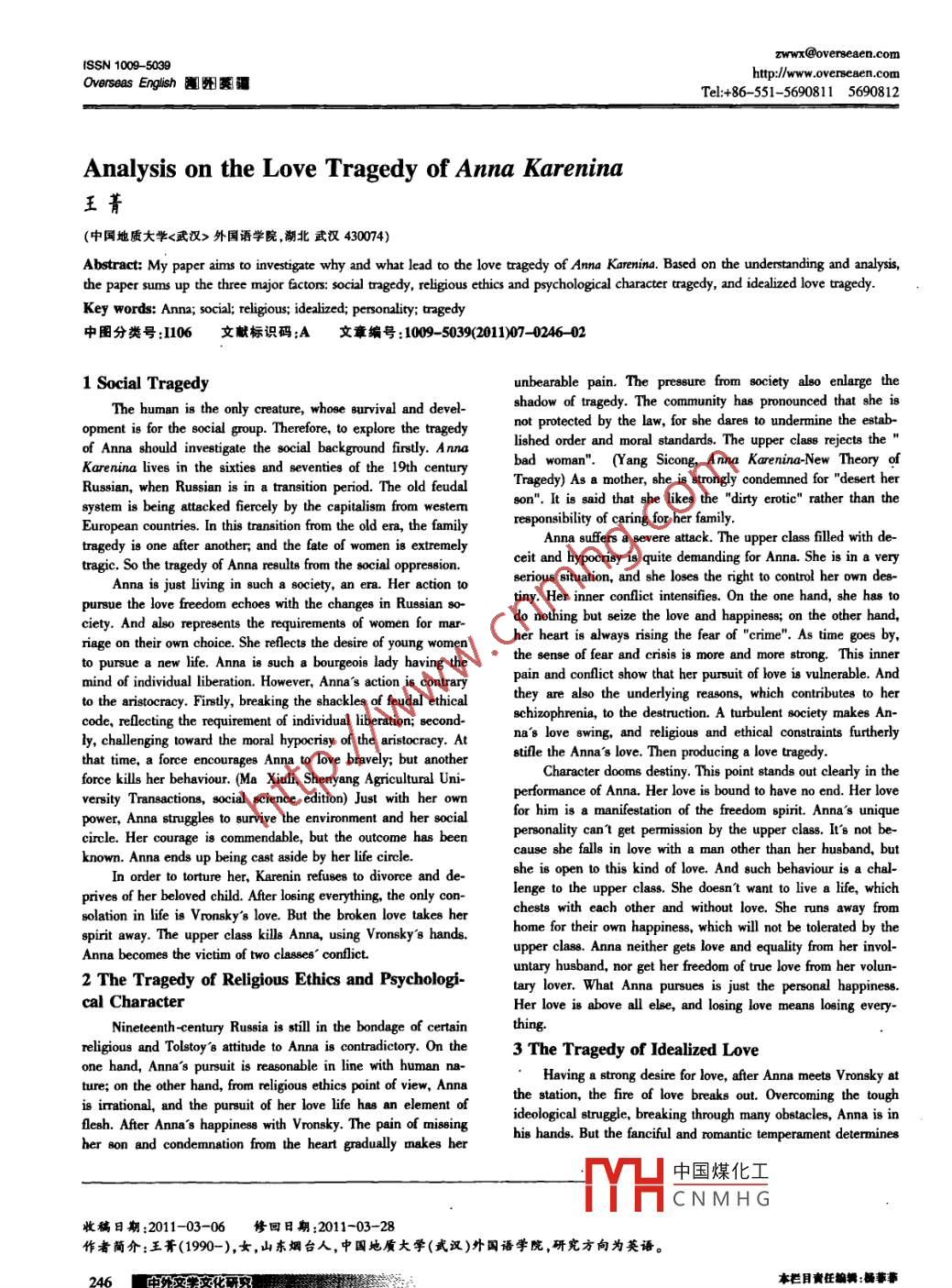 ISSN 1009- -5039zwwx@overseaen.comOverseas English 團(tuán)圖葵疆ht://www overseaen.comTel:+86-551- -5690811 5690812Analysis on the Love Tragedy of Anna Karenina王菁(中國地質(zhì)大學(xué)<武漢>外國語學(xué)院,湖北武漢430074)Abstract; My papet aimn to iveipe why and what lead to the love trgedy of Ama Karvin. Based on the udenstnding and alys,the paper sums叩the three mjor factos: social tnagedy, rligjous ethics and pychologca charncter aragedy, and iealied love tnagedy.Key words: Anna; social; teligjous; idealized; personaliy; rngedy中圍分類號:1106文獻(xiàn)標(biāo)識碼:A文章編號:1009- -5039(2011)07- 0246 021 Social Tragedyunbearable pain. The pressure from society also enlarge thThe human is the only creature, whoe survival and deve-shadow of tragedy. The community has pronounced that she isopment is for the social goup. Therefore, to explore the tragedynot protected by the law, for she dares to undermine the estab-of Anna should investigate the social background firstly.Annalished order and moral standards. The upper class rejects the”Karenina lives in the sixties and seventies of the 19th centurvbad woman". (Yang Sicong, Anna Karenina-New Theory ofRussian, when Russian is in a transition period. The old feudalTragedy) As a mother, she is strongly condemned for "desert hersystem is being atacked fercely by the capitalism from westermson". It is said that she likes the "dirty erotic" rather than theEuropean countries. In this transition from the old era, the familyresponsibility of caring for her family.tragedy is one after another, and the fate of women is extremelyAnna suffers a severe atack. The upper class flled with de-tragic. So the tragedy of Anna reults from the social oppression.ceit and hypocrisy is quite demanding for Anna. She is in a veryAnna is just living in such a society, an ern. Her action toserious situation, and she loses the right to control her own de8-pursue the love freedom echoes with the changes in Russian 80-tiny. Her inner conflict intensifies. On the one hand, she has toeiety. And alo repesentsne requirements of women for mar-do nothing but seize the love and happines; on the other hand,riage on their own choice. She relects the desire of young womenher heart is always rising the fear of "erime". As time goes by,to pursue a new life. Anna is such a bourgeois lady having thethe sense offear and crisis is more and more strong. This innermind of individual liberation. However, Anna's action is contrarypain and conflict show that her pursuit of love is vulnerable. Andto the aristocracy. Finsily, breaking the shackles of feudal ethicalthey are also the underlying reasons, which contributes to hercode, relecting the requitement of individual liberation; second-schizophrenia, to the destruction. A turbulent society makes An-ly, callenging toward the moral hypocrisy of the aistocracy. 1na's love swing, and religious and ethical constraints furtherlythat time, a force encourages Anna to love bravely; but anotherstile the Anna's love. Then producing a love tragedy.force kills her behaviour. (Ma Xiuli, Shenyang Agricultural Uni-Character dooms destiny. This point stands out clt clearly in theversity Transactions, social science editin) Just with her ownperformance of Anna. Her love is bound to have no end. Her lovepower, Anna stnuggles to survive the environment and her socialfor him is a manifestation of the fredom spirit. Anna's uniquecircle. Her courage is commendable, but the outcome has beenpersonality can't get permission by the upper class. I's not be-known. Anna ends up being cast aside by her life cirele.cause she falls in love with a man other than her husband, butIn order to torture her, Karenin refuses to divorce and de-she is open to this kind of love, And such behaviour is a chal-prives of her beloved child. After loing everything, the only con-lenge to lhe upper clas. She doesn't want to live a life, whicholation in life is Vronsky's love. But the broken love takes herchests with each other and without love. She runs away fromspirit away. The upper class kill Anna, using Vronsky's hands.home for their own happiness, which will not be tolerated by theAnna becomes the victim of two classe" conflict.upper cAnna neither gets love and equality frorm her invol-2 The Tragedy of Religious Ethics and Psychologi-untary husband, nor get her feedom of true love from her volun-tary lover. What Anna pursues is just the personal happines.cal CharacterHer love is above all ele, and loing love means loing every-Nnetenth century Rusia is sill in the bondage of certainthing.religious and Tolstoy's atinude to ArAnna is contradictory. On the3 The Tragedy of Idealized Love .one hand, Anna'3s pursuit is reasonable in line with human na-ture; on the other hand, from religious ethics point of view, Anna.Having a strong desire for love, afer Anna meets Vronsky atis irational, and the pursuit of her love life has an element ofthe station, the fire of love breaks out. Overcoming the toughflcesh. Afer Anna's happinese with Vronsky. The pain of missingidelogical snuggle, breaking through! obstacles, Anna is inher son and condemnation from the heart gradually makes herhis hands. But the fanciful and romantic temperament determines中國煤化工MYHCNMH G收稿日期:2011-03-06修回日期:2011-03-28作者簡介:王菁(1990-),女,山東煙臺人,中國地質(zhì)大學(xué)(式漢)外國語學(xué)院,研究方向為英語。本欄目責(zé)任編輯:備莘莽2011年7月Overseas English 海外美語passion, what he gets is not love but empty. Anna also has a kindcouldn't be avoided. My teacher just said to me easily:"Becauseof psychological imbalance, which makes the fantasy and sensi-she is Anna Karenina." If she were Dolly, who is faithful andtive Anna become a lttle nervous temperament. She always letshonest to keep a fanily, biterly swallows the pain given by hisVronsky promise that he still loves her as before. Only by the ashusba