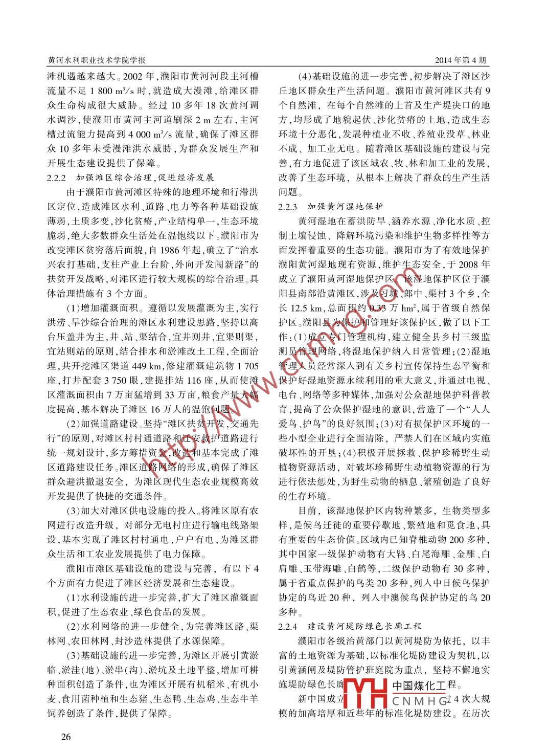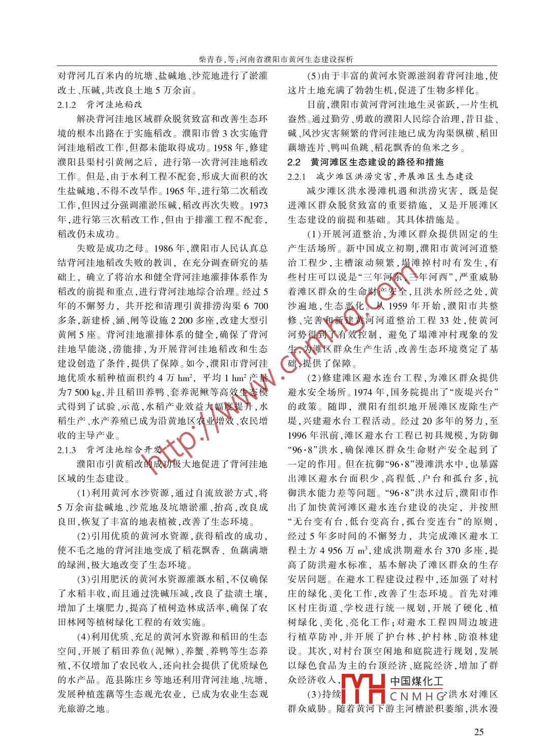 第26卷第4期黃河水利職業(yè)技術(shù)學(xué)院學(xué)報(bào)Vol.26 No.4_2014年10月Jourmal of Yellow River Conservancy Technical InstituteOct.2014河南省濮陽(yáng)市黃河生態(tài)建設(shè)探析柴青春,魯學(xué)璽,陳國(guó)寶(濮陽(yáng)黃河河務(wù)局,河南濮陽(yáng)457000)摘要:河南省濮陽(yáng)市黃河生態(tài)建設(shè)范圍包括沿黃河背河洼地和黃河灘區(qū)兩個(gè)部分。分析了濮陽(yáng)市黃河生態(tài)建設(shè)的重點(diǎn)和目標(biāo),探討了其進(jìn)行黃河生態(tài)建設(shè)的路徑和措施。關(guān)鍵詞:濮陽(yáng)市;黃河背河洼地;黃河灘區(qū);生態(tài)建設(shè)中圖分類號(hào):TV213.5文獻(xiàn)標(biāo)識(shí)碼:B文章編號(hào):1008- -486X(2014)04- 0024- -040引言背河洼地成為生態(tài)環(huán)境優(yōu)美,稻花、荷花飄香的豫北建設(shè)生態(tài)文明,是關(guān)系人民福祉、關(guān)乎民族未小江南。來的長(zhǎng)遠(yuǎn)大計(jì)。多年來,濮陽(yáng)市在致力于黃河治理1.2黃河灘區(qū)生態(tài)建設(shè)的重點(diǎn)和目標(biāo).開發(fā)、發(fā)展地方經(jīng)濟(jì)的同時(shí),也注重黃河的生態(tài)建濮陽(yáng)市黃河灘區(qū)位于濮陽(yáng)市最南部和東南部,設(shè)。如,對(duì)黃河背河洼地進(jìn)行引黃稻改,加快黃河河地處黃河河槽與大堤之間,呈一寬窄 不等的長(zhǎng)條狀,道整治步伐,對(duì)黃河灘區(qū)進(jìn)行綜合治理,加強(qiáng)濕地涉及濮陽(yáng)、范縣、臺(tái)前3縣21個(gè)鄉(xiāng)(鎮(zhèn)),560多個(gè)行保護(hù),擴(kuò)大綠化面積等。通過開展黃河生態(tài)建設(shè),有政村(含騎堤村),面積近4.67萬(wàn)hm2(含大堤占?jí)?,力地改善了沿黃兩岸生態(tài)環(huán)境,使背河洼地變成了約占全市總面積的11%。 該區(qū)域既是黃河行蓄洪.稻花飄香的豫北小江南,使黃河灘區(qū)變成了綠色生區(qū),又是灘區(qū)群眾繁衍生息、生產(chǎn)生活的必需場(chǎng)所,態(tài)長(zhǎng)廊,取得了巨大的社會(huì)效益。筆者結(jié)合工作實(shí)河勢(shì)擺動(dòng)頻繁,伏秋大汛洪水易漫灘,群眾的生產(chǎn)、踐,對(duì)濮陽(yáng)市黃河生態(tài)建設(shè)具體措施進(jìn)行了探討。生活沒有保障,土質(zhì)多變,沙化貧瘠,坑塘、洼地、串1濮陽(yáng)市黃河生態(tài)建設(shè)的重點(diǎn)和目標(biāo)溝、溝河相間,產(chǎn)業(yè)結(jié)構(gòu)單--,生態(tài)環(huán)境脆弱(3]。濮陽(yáng)市黃河生態(tài)建設(shè)的范圍主要包括沿黃背多年來,濮陽(yáng)市黃河灘區(qū)生態(tài)建設(shè)的重點(diǎn)和目河洼地和黃河灘區(qū)兩個(gè)區(qū)域甲。標(biāo)是:治理洪澇災(zāi)害,整治低洼、沙化土地,調(diào)整種植1.1黃河背河洼地生態(tài)建設(shè)的重點(diǎn)和目標(biāo)結(jié)構(gòu),發(fā)展生態(tài)高效農(nóng)業(yè);適度發(fā)展經(jīng)濟(jì)林,防風(fēng)固濮陽(yáng)市沿黃背河洼地位于臨黃大堤左側(cè),涉及沙,保持水土,消除灘區(qū)沙塵暴和荒漠化侵襲;實(shí)施濮陽(yáng)、范縣、臺(tái)前3縣19個(gè)鄉(xiāng)(鎮(zhèn)),230多個(gè)行政堤防綠色長(zhǎng)廊工程,加強(qiáng)濕地保護(hù),開發(fā)建設(shè)黃河水村,土地面積約3.3萬(wàn)hm?,占全市總面積的8%。受利風(fēng)景區(qū)。最終使黃河灘區(qū)成為生物多樣具有黃黃河決口、復(fù)堤取土和黃河長(zhǎng)期側(cè)滲的影響,該區(qū)河歷史文化特色的綠色生態(tài)旅游觀光帶。域塘坑、洼地多,漬生鹽堿地面積大,成了生態(tài)環(huán)境2濮陽(yáng)市進(jìn)行黃河生態(tài)建設(shè)的路徑措施惡劣、不產(chǎn)糧食的不毛之地?!按禾禧}堿白茫茫,夏2.1黃河背河洼地區(qū)域生態(tài)建設(shè)的路徑和措施天一.片水汪汪,秋天到處蘆草荒,只見種地不見糧”2.1.1 改良背河土地的順口溜,就是昔日沿黃背河洼地群眾飽受洪澇和濮陽(yáng)市黃河背河洼地生態(tài)建設(shè)是在改善農(nóng)業(yè)生鹽喊侵?jǐn)_的真實(shí)寫照2。產(chǎn)條件,發(fā)展農(nóng)業(yè)生產(chǎn),解決群眾貧困問題的基礎(chǔ)上多年來,濮陽(yáng)市沿黃背河洼地生態(tài)建設(shè)重點(diǎn)和逐步進(jìn)行的。早在20世紀(jì)70年代初期至80年代目標(biāo)是:充分利用黃河水沙資源,改良土壤,健全灌初期,濮陽(yáng)背河洼地人民為了改善農(nóng)業(yè)生產(chǎn)條件,利排體系,實(shí)施稻改,發(fā)展高效生態(tài)農(nóng)業(yè),完善農(nóng)田林用黃河水沙資源,通過引黃供水工程自流放淤等方網(wǎng),逐步建成濮陽(yáng)市稻米和水產(chǎn)生產(chǎn)基地,最終將式,淤填背河大潭坑10余個(gè)(因黃河決口形成),并中國(guó)煤化工收稿日期:2014-07-23 .MHCNMHG作者簡(jiǎn)介:柴青春(1962-),男,河南濮陽(yáng)人,總工程師,主要從事黃河防汛工程建設(shè)工作。24柴青春,等:河南省濮陽(yáng)市黃河生態(tài)建設(shè)探析對(duì)背河幾百米內(nèi)的坑塘鹽堿地、沙荒地進(jìn)行了淤灌(5)由于豐富的黃河水資源滋潤(rùn)著背河洼地,使改土、壓堿,共改良土地5萬(wàn)余畝。這片土地充滿了勃勃生機(jī),促進(jìn)了生物多樣化。2.1.2背河洼地稻改目前,濮陽(yáng)市黃河背河洼地生靈雀躍,- - 片生機(jī)解決背河洼地區(qū)域群眾脫貧致富和改善生態(tài)環(huán)盎然。通過勤勞、勇敢的濮陽(yáng)人民綜合治理,昔日鹽、境的根本出路在于實(shí)施稻改。濮陽(yáng)市曾3次實(shí)