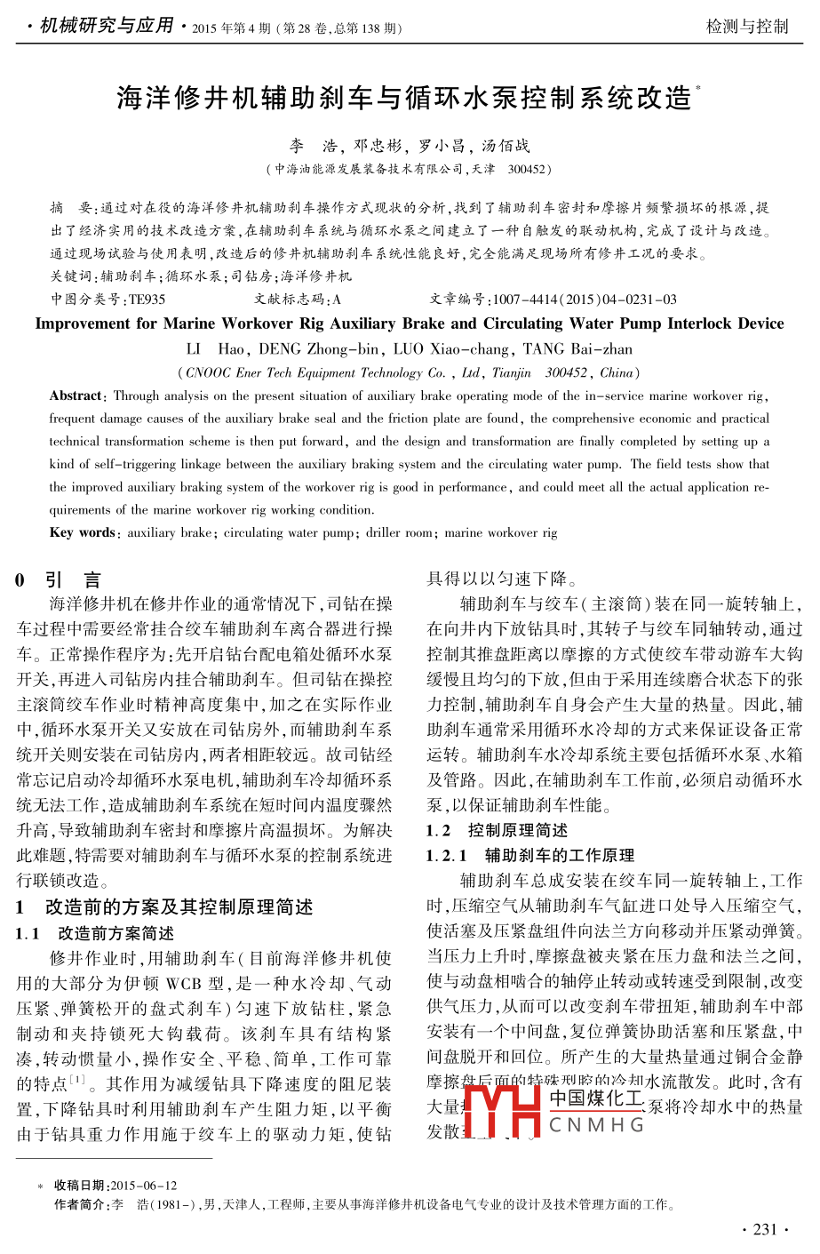 機(jī)械研究與應(yīng)用●2015年第4期(第28卷,總第138期)檢測(cè)與控制海洋修井機(jī)輔助剎車與循環(huán)水泵控制系統(tǒng)改造.李浩,鄧忠彬,羅小昌,湯佰戰(zhàn)(中海油能源發(fā)展裝備技術(shù)有限公司,天津 300452 )摘要:通過(guò)對(duì)在役的海洋修井機(jī)輔助剎車操作方式現(xiàn)狀的分析, 找到了輔助剎車密封和摩擦片頻繁損壞的根源,提出了經(jīng)濟(jì)實(shí)用的技術(shù)改造方案,在輔助剎車系統(tǒng)與循環(huán)水泵之間建立了一種自觸發(fā)的聯(lián)動(dòng)機(jī)構(gòu),完成了設(shè)計(jì)與改造。通過(guò)現(xiàn)場(chǎng)試驗(yàn)與使用表明,改造后的修井機(jī)輔助剎車系統(tǒng)性能良好,完全能滿足現(xiàn)場(chǎng)所有修井工況的要求。關(guān)鍵詞:輔助剎車;循環(huán)水泵;司鉆房;海洋修井機(jī)中圖分類號(hào):TE935文獻(xiàn)標(biāo)志碼:A文章編號(hào):1007-4414( 2015)04 - -0231-03Improvement for Marine Workover Rig Auxiliary Brake and Circulating Water Pump Interlock DeviceLI Hao, DENG Zhong-bin, LUO Xiao-chang, TANG Bai-zhan( CNOOC Ener Tech Equipment T'echnology Co.,Itd, Tianjin 300452, China)Abstract: Through analysis on the present situation of auxiliary brake operating mode of the in- service marine workover rig,frequent damage causes of the auxiliary brake seal and the friction plate are found, the comprehensive economic and practicaltechnical transformation scheme is then put forward, and the design and transformation are finally completed by setting up akind of self-triggering linkage between the auxiliary braking system and the circulating water pump. The field tests show thatthe improved auxiliary braking system of the workover rig is good in performance, and could meet all the actual application re-quirements of the marine workover rig working condition.Key words: auxiliary brake ; circulating water pump; driller room; marine workover rig0引言具得以以勻速下降。海洋修井機(jī)在修井作業(yè)的通常情況下,司鉆在操輔助剎車與絞車(主滾筒)裝在同- -旋轉(zhuǎn)軸上,車過(guò)程中需要經(jīng)常掛合絞車輔助剎車離合器進(jìn)行操在向井內(nèi)下放鉆具時(shí),其轉(zhuǎn)子與絞車同軸轉(zhuǎn)動(dòng),通過(guò)車。正常操作程序?yàn)?先開啟鉆臺(tái)配電箱處循環(huán)水泵控制其推盤距離以摩擦的方式使絞車帶動(dòng)游車大鉤開關(guān),再進(jìn)人司鉆房?jī)?nèi)掛合輔助剎車。但司鉆在操控緩慢且均勻的下放,但由于采用連續(xù)磨合狀態(tài)下的張主滾簡(jiǎn)絞車作業(yè)時(shí)精神高度集中,加之在實(shí)際作業(yè)力控制,輔助剎車自身會(huì)產(chǎn)生大量的熱量。因此,輔中,循環(huán)水泵開關(guān)又安放在司鉆房外,而輔助剎車系助剎車通常采用循環(huán)水冷卻的方式來(lái)保證設(shè)備正常統(tǒng)開關(guān)則安裝在司鉆房?jī)?nèi),兩者相距較遠(yuǎn)。故司鉆經(jīng)運(yùn)轉(zhuǎn)。輔助剎車水冷卻系統(tǒng)主要包括循環(huán)水泵、水箱常忘記啟動(dòng)冷卻循環(huán)水泵電機(jī),輔助剎車?yán)鋮s循環(huán)系及管路。因此,在輔助剎車工作前,必須啟動(dòng)循環(huán)水統(tǒng)無(wú)法工作,造成輔助剎車系統(tǒng)在短時(shí)間內(nèi)溫度驟然泵,以保證輔助剎車性能。升高,導(dǎo)致輔助剎車密封和摩擦片高溫?fù)p壞。為解決1.2 控制原理簡(jiǎn)述此難題,特需要對(duì)輔助剎車與循環(huán)水泵的控制系統(tǒng)進(jìn)1.2.1 輔助剎車的工作原理行聯(lián)鎖改造。輔助剎車總成安裝在絞車同-旋轉(zhuǎn)軸上,工作1改造 前的方案及其控制原理簡(jiǎn)述時(shí),壓縮空氣從輔助剎車氣缸進(jìn)口處導(dǎo)人壓縮空氣,1.1 改造前方案簡(jiǎn)述使活塞及壓緊盤組件向法蘭方向移動(dòng)并壓緊動(dòng)彈簧。修井作業(yè)時(shí),用輔助剎車(目前海洋修井機(jī)使當(dāng)壓力.上升時(shí),摩擦盤被夾緊在壓力盤和法蘭之間,用的大部分為伊頓WCB型,是一.種水冷卻、氣動(dòng)使與動(dòng)盤相嚙合的軸停止轉(zhuǎn)動(dòng)或轉(zhuǎn)速受到限制,改變壓緊、彈簧松開的盤式剎車)勻速下放鉆柱,緊急供氣壓力,從而可以改變剎車帶扭矩,輔助剎車中部制動(dòng)和夾持鎖死大鉤載荷。該剎車具有結(jié)構(gòu)緊.安裝有一個(gè)中間盤,復(fù)位彈簧協(xié)助活塞和壓緊盤,中湊,轉(zhuǎn)動(dòng)慣量小,操作安全、平穩(wěn)、簡(jiǎn)單,工作可靠間盤脫開和回位。所產(chǎn)生的大量熱量通過(guò)銅合金靜的特點(diǎn)中。其作用為減緩鉆具下降速度的阻尼裝摩擦盤后面的特殊刑腔的冷卻水流散發(fā)。此時(shí),含有置,下降鉆具時(shí)利用輔助剎車產(chǎn)生阻力矩,以平衡大量中國(guó)煤化工<泵將冷卻水中的熱量由于鉆具重力作用施于絞車上的驅(qū)動(dòng)力矩,使鉆發(fā)散MHCNMHG*收稿日期:2015-06-12作者簡(jiǎn)介:李浩(1981-),男 ,天津人,工程師,主要從事海洋修井機(jī)設(shè)備電氣專業(yè)的設(shè)計(jì)及技術(shù)管理方面的工作。檢測(cè)與控制2015年第4期(第28卷,總第138期)● 機(jī)械研究與應(yīng)用1.2.2循環(huán)水冷卻系統(tǒng)的工作原理器、報(bào)警鈴、報(bào)警燈,以實(shí)現(xiàn)設(shè)備司鉆對(duì)輔助剎車系統(tǒng)循環(huán)水泵將冷卻水通過(guò)水管線分別向主剎車和的監(jiān)控。輔助剎車供水冷卻,經(jīng)過(guò)主、輔剎車的冷卻水水溫升新增一路至循高通過(guò)回水管線經(jīng)散熱器使水溫