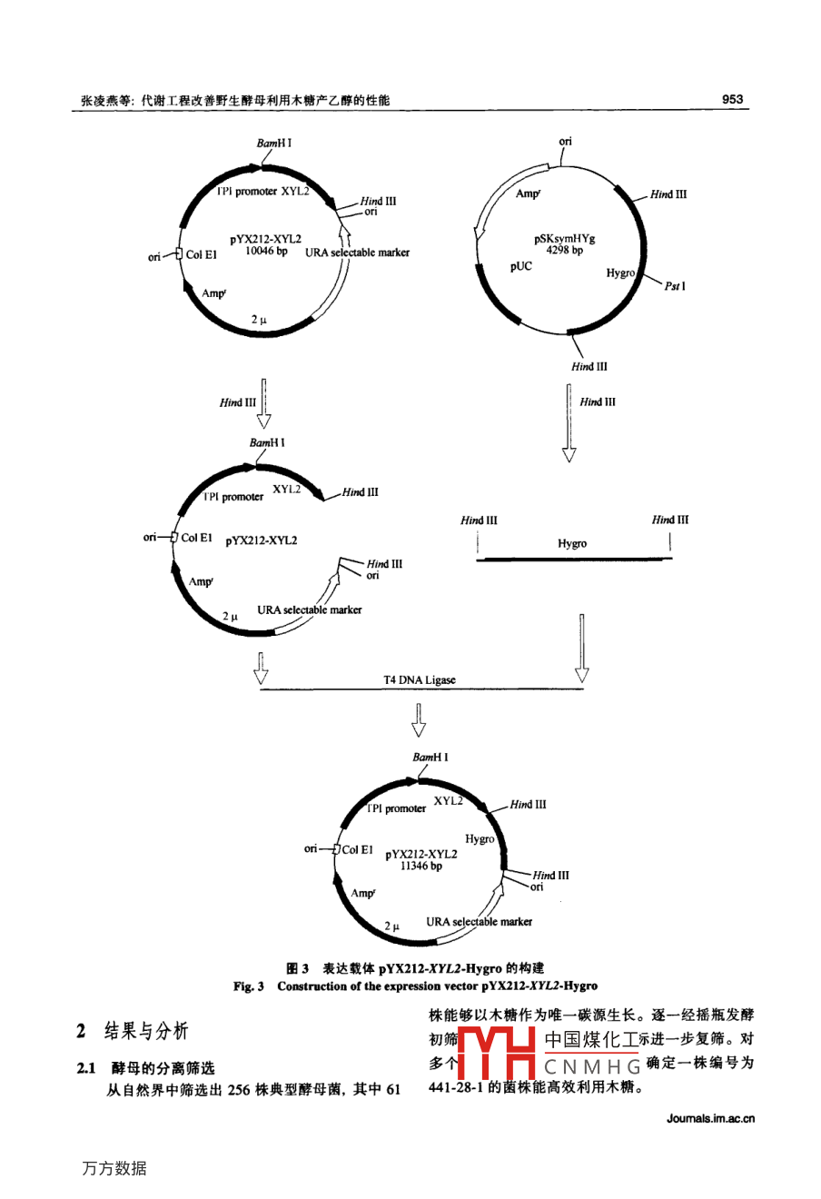 生物工程學(xué)報Chin J Biotech 2008, June 25: 24(6)journals. imaccnChinese Journal of Biotechnology ISSN 100cb@imaccn@2008 Institute of Microbiology, CAS CSM, All rightsresend研究報告代謝工程改善野生酵母利用木糖產(chǎn)乙醇的性能張凌燕12,張梁,丁重陽12,王正祥,石貴陽121江南大學(xué)工業(yè)生物技術(shù)教育部重點實驗室,無錫2141222江南大學(xué)生物工程學(xué)院生物資源與轉(zhuǎn)化研究室,無錫214122摘要:從256個自然樣品中篩選得到1株可高效轉(zhuǎn)化D木糖的酵母,通過生理生化和分子生物學(xué)方法鑒定,證實該菌株是屬于 Candidaπ tropicalis,以該酵母為研究對象,增加木糖醇脫氨酶表達量,通過改變代謝流以達到提高酒精產(chǎn)率的目的以pXY212ⅪY2質(zhì)粒為基礎(chǔ)載體,構(gòu)建了含有潮霉肅抗性的pYX212XYL2 Hygro,電擊轉(zhuǎn)化進入野生型C. tropicalis,潮霉抗性篩選,得到含高拷貝木糖醇脫氬酶基因的重組菌梾C.ⅳ tropicalisⅪY2-7.重組菌的比酶活達到o.5υ mg protein,比原始菌株提髙了3倍。實驗表明,重組菌木糖醇得率比原始菌株降低了3倍,酒精得率提高了5倍。首次通過實驗驗證了熱帶假絲酵母利用木糖產(chǎn)乙醇的可行性,這對研究酵母利用秸稈、麥糠、谷殼等纖維質(zhì)農(nóng)業(yè)廢棄物生產(chǎn)燃料乙醇具有重要啟示關(guān)鍵詞:熱帶假絲酵母,木糖,乙醇,木糖醇脫氫酶Metabolic Engineering for Improving Ethanol Fermentationof Xylose by Wild YeastLingyan Zhang, Liang Zhang, Zhongyang Ding.2, Zhengxiang Wang and Guiyang Shi2I Key Laboratory of industrial Biotechnology of Ministry of Education, Jiangnan University, Wuxi 214122, China2 Laboratory of Biomass Refinery Processing, Jiangnan Universiry, wuxi 214122, chinaAbstract: One yeast strain, which was isolated from 256 natural samples, was found to be able to utilize D-xylose effectively. Onthe basis of assimilation physiological and molecular biological tests, the yeast strain was identified as a strain of Candida tropicalisFurthermore, metabolic engineering breeding strategy was applied to change the metabolic flux in order to increase ethanolproductivity. In this study, the C. tropicalis was used as the host strain and the plasmid pYX212-XYL2, which was formerlyconstructed for over expression of XYL2 gene encoding xylitol dehydrogenase (XDH) from Pichia stipitis, was used as the backboneof the recombinant vector. A hygro gene was inserted into downstream position of XYLa gene, meanwhile, the result plasmidpXY212-XYL2-Hygro transformed into C tropicalis by electroporation. Thus, a recombinant yeast C tropicalis XYL2-7 was obtainedthrough hygromycin B resistance screening and its specific XDH activity was 0.5 u/mg protein, which was 3 times more than thatthe parent strain. Additionally, the recombinant yeast was applied in the fermentation of xylose. Compared with the parent yeast, itwas concluded that the xylitol yield in the broth decreased by 3 times, however, the ethanol yield increased by 5 times. The feasibilityof ethanol production from xylose by C. tropicalis was firstly studied in this paper. These research results are helpful to advance thebioconversion of renewable resources(e. g. straw, wheat bran, and husk )to fuel ethanolKeywords: Candida tropicalis, xylose, ethanol, xylitol dehydrogenaseecelved: January 14, 2008: Accepted: March 12, 2008Supported by: the National Natural Science Foundation of China (No. 20706024),H中國煤化工CNMHGand DevelopmeProgram of China(No. 2007AA10Z.359).Correspondingauthor:GuiyangShi.Tel:+86-510-85918229:Fax:+86-510-85815339:E-mail:gyshi@jiangnan.edu.cn國家自然科學(xué)基金(No.20706024)和國家863計劃(No.2007AA10Z359)資助張凌燕等:代謝工程改善野生酵母利用木糖產(chǎn)乙醇的性能951我國是一個農(nóng)業(yè)大國,以農(nóng)作物秸稈、林木枝并產(chǎn)生微量的酒精。以這株酵母為研究對象,在國條為主的農(nóng)業(yè)廢棄物資源十分豐富,但并未得到有內(nèi)首次嘗試將天然底物利用策略應(yīng)用到酵母中效利用,反而對農(nóng)業(yè)生態(tài)形成了一定的壓力;同時,通過增加細胞內(nèi)木糖醇脫氫酶的表達量,來減少木我國也是一個能源資源相對貧乏的國家,如何科學(xué)糖醇的積累,試圖將代謝流引向乙醇形成方向(圖1),利用農(nóng)業(yè)廢棄物進行能源生產(chǎn),對于實現(xiàn)可持續(xù)發(fā)以達到提高乙醇產(chǎn)量的目的。展戰(zhàn)略意義重大。近年來利用秸稈、麥糠、谷殼等農(nóng)業(yè)廢棄物生1材料與方法產(chǎn)燃料乙醇正逐步成為人們研究的熱點。隨著木質(zhì)1.1材料纖維素預(yù)處理技術(shù)的不斷改進和發(fā)展,特別近年來11.1樣品發(fā)展迅速的稀酸預(yù)處理、蒸汽爆碎等技術(shù)可高效破稍微腐爛的熱帶水果、花朵、土壤、酒曲、酒壞植物纖維結(jié)構(gòu),提高微生物的降解轉(zhuǎn)化速率。高醅、熱帶溫泉土、水樣等?;盍w維素酶,可利用纖維二糖的重組工業(yè)酒精酵1.1.2菌株與質(zhì)粒母的研究12使木質(zhì)纖維素原料中纖維素的水解和大腸桿菌( scherichia coli JMI09;PYX212X2高效利用成為可能。因此,微生物本身代謝半纖游離穿梭質(zhì)粒(含酵母TPI啟動子,樹干畢赤酵母木維素水解液中各種戊糖底物(木糖、阿拉伯糖等)的糖醇脫氫酶基因)由本實驗室先期構(gòu)建,物理圖譜如能力,已成為決定纖維質(zhì)原料水解液發(fā)酵成敗的下(圖2); pSKsymHyg質(zhì)粒由本實驗室保存;其他質(zhì)關(guān)鍵粒均在本實驗中構(gòu)建。據(jù)報道,酵母菌中有6個種利用木糖發(fā)酵產(chǎn)生113培養(yǎng)葚酒精的量相對較大,但這些菌株由于發(fā)酵