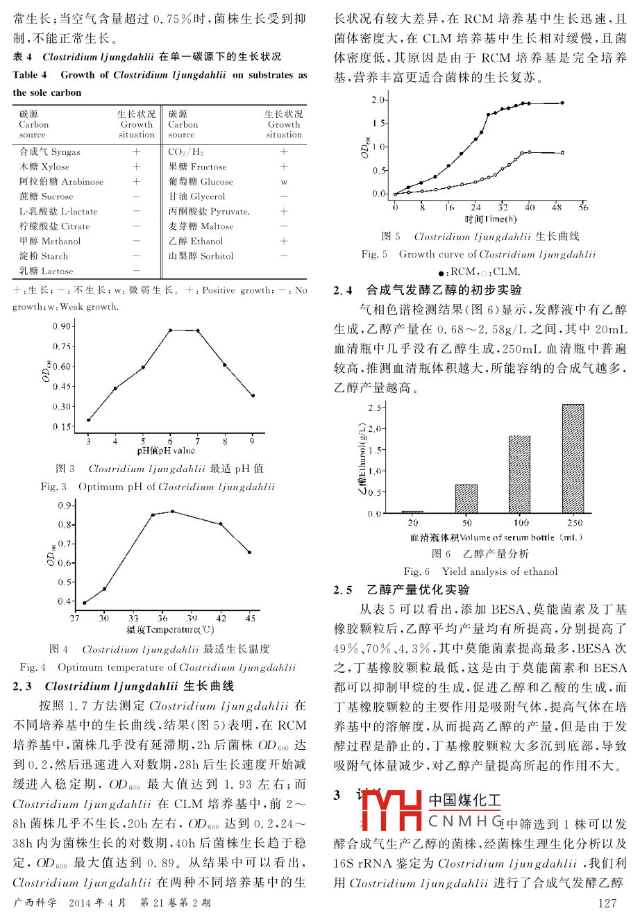 網(wǎng)絡(luò)優(yōu)先數(shù)字出版時(shí)間:2014-4-01網(wǎng)絡(luò)優(yōu)先數(shù)字出版地址http://www.cnkinet/kcms/doi/10.13656/j.cnkigxkx.20140401.002.html廣西科學(xué) Guangxi Sciences2014,21(2):124~128合成氣發(fā)酵生產(chǎn)乙醇菌株的篩選ˇScreening of a Microbial Strain Capable of producingEthanol from Syngas fermentation郭鈴,黃艷燕,潘麗霞,李檢秀,孫菲菲,孫靚,黃日波GUO Ling HUANG Yan-yan, PAN Li-xia, LI Jian-xiu, suN Fei-fei, SUN LiangHUANG Ri-bo(廣西科學(xué)院,非糧生物質(zhì)酶解國(guó)家重點(diǎn)實(shí)驗(yàn)室,國(guó)家非糧生物質(zhì)能源工程技術(shù)硏究中心,廣西生物質(zhì)產(chǎn)業(yè)化工程院,廣西生物煉制重點(diǎn)實(shí)驗(yàn)室,廣西南寧530007)(Guangxi Academy of Sciences, State Key Laboratory of Non-Food Biomass and Enzyme Technology, National Engineering Research Center for Non-food Biorefinery, Guangxi Biomass Industrialization Engineering Institute, Guangxi Key Laboratory of Biorefinery. Nanning, GuangXi, 530007, China)摘要:【目的】從動(dòng)物糞便樣品中分離能利用合成氣生產(chǎn)乙醇的菌株,并對(duì)其進(jìn)行鑒定及初步發(fā)酵實(shí)驗(yàn),為工業(yè)利用合成氣生產(chǎn)乙醇奠定理論基礎(chǔ)?!痉椒ā坷酶患Z化培養(yǎng)技術(shù),以合成氣為唯一碳源,分離篩選合成氣利用菌,通過(guò)形態(tài)觀察、生理生化實(shí)驗(yàn)及16 SrrNA序列分析鑒定菌株,并利用菌株進(jìn)行初步發(fā)酵實(shí)驗(yàn)。【結(jié)果】分離到1株可以發(fā)酵合成氣生產(chǎn)乙醇的菌株,分子鑒定結(jié)果表明,該菌株為 Clostridium ljungdahlia。生理生化分析結(jié)果顯示:該菌是嚴(yán)格厭氧型革蘭氏陽(yáng)性菌,短桿狀,有運(yùn)動(dòng)性,芽孢很少見,生長(zhǎng)必須因子包括酵母粉和維生素B族;最適碳源為果糖,最適生長(zhǎng)溫度35~37℃,最適pH值為6.0~7.0。合成氣發(fā)酵實(shí)驗(yàn)結(jié)果顯示:37℃厭氧靜止發(fā)酵30d,乙醇最高產(chǎn)量達(dá)到2.58g/L,添加BESA、莫能菌素、丁基橡膠顆??梢允挂掖籍a(chǎn)量分別提高49%、70%、4.3%,最大產(chǎn)量達(dá)到4.31g/L?!窘Y(jié)論】從動(dòng)物糞便中分離到1株( lostridium ljungdahlii,該菌能夠利用合成氣生產(chǎn)乙醇,為進(jìn)一步研究和開發(fā)新型生物質(zhì)材料提供了基礎(chǔ)資料。關(guān)鍵詞:合成氣厭氧發(fā)酵梭狀芽孢桿菌乙醇中圖分類號(hào):Q939文獻(xiàn)標(biāo)識(shí)碼:A文章編號(hào):1005-9164(2014)02-0124-05Abstract: (ObjectiveITo isolate and identify a microbial strain capable of producing ethanol fromsyngas fermentation from animal waste. I Methods] The enrichment culture using syngas as thesole carbon source was utilized to isolate the strain, which was identified according to the observation of morphology, physiological and biochemical tests, and analysis of 16S rRNa genesequences. The isolated strain was utilized for preliminary fermentation. [Results] A strain capable of fermenting syngas into ethanol was isolated successfully. The strain was identified asClostridium ljungdahlii, which is a strictanaerobe and gram-positive. The cells are rod收稿日期:2013-11-29shaped and show motility; spores are formed修回日期:2014-01-24frequently; the strain requires a minimum level作者簡(jiǎn)介:郭鈴(1983),男,碩士,主要從事微生物發(fā)酵與酶 I of yeast extract(0.1%)andB- vitamins for程研究growth; substrate optimum is fructose; temper廣西科學(xué)院基本科研業(yè)務(wù)費(fèi)項(xiàng)目(11Y24sW12、 ature opt中國(guó)煤化工; pH optimum11YJ24SWo1),廣西自然科學(xué)基金項(xiàng)目(2013 GXNSFBA019089)range Isntation revealshat undCNMH Ghe highest yield,通信作者:黃日波(1958),男,教授,博土生導(dǎo)師,主要從事 of ethanol in serum bottles at37cwas2.58g分子酶工程研究。 Email: ruhuang@gafter 30d i by addition of besa, monensin andbutyl rubber particles yields of ethanol can in-124Guangxi Sciences, Vol 21 No. 2. April 2014crease 49 %. 70% and 4.3%, respectively, with the highest yield of ethanol at 4.31g/L.IConclusion] Clostridium ljungdahlii was capable of producing ethanol from syngas fermentationKey words: syngas, anaerobic fermentation, Clostridium ljungdahlii, ethanol【研究意義】隨著化石能源日益枯竭,尋找新的可勻后取1mL培養(yǎng)物接種到含有40mL篩選培養(yǎng)基的再生替代能源就成為全世界最關(guān)注的熱點(diǎn)。乙醇是血清瓶中,以合成氣為唯一碳源,37℃厭氧靜止培養(yǎng)種優(yōu)質(zhì)的液體燃料,單位質(zhì)量的乙醇完全燃燒時(shí)可30d,取有生長(zhǎng)趨勢(shì)的培養(yǎng)物,稀釋1×10°倍后接種釋放約30KJ的熱量,是目前為止最有效的化石能源到新鮮的篩選培養(yǎng)基中,重復(fù)培養(yǎng)30d,重復(fù)以上步替代品。目前,燃料乙醇的生產(chǎn)方法主要有化學(xué)合成驟3次后,取培養(yǎng)物稀釋1×10°倍后涂布于固體與微生物發(fā)酵兩種方式,化學(xué)合成法主要是乙烯直接CLM培養(yǎng)基上,以果糖為唯一碳源,37℃厭氧靜止培水合法;微生物發(fā)酵法主要有以糖質(zhì)原料和淀粉質(zhì)原養(yǎng)3d后,挑取單克隆于液體CLM培養(yǎng)基中,以果糖料為底物直接發(fā)酵和以纖維素原料水解發(fā)酵兩種方為唯一碳源,37℃厭氧靜止培養(yǎng)24~36h,用甘油保式。利用微生物發(fā)酵合成氣生產(chǎn)乙醇是以生物質(zhì)為存菌種。原料生產(chǎn)乙醇的新工藝,即先將生物質(zhì)完全氣化生1.3菌株的鑒定成以CO、CO2、H2、N2等為主要成分的生物合成氣提取菌株基因組DNA,PCR擴(kuò)增16 SrrnA(引