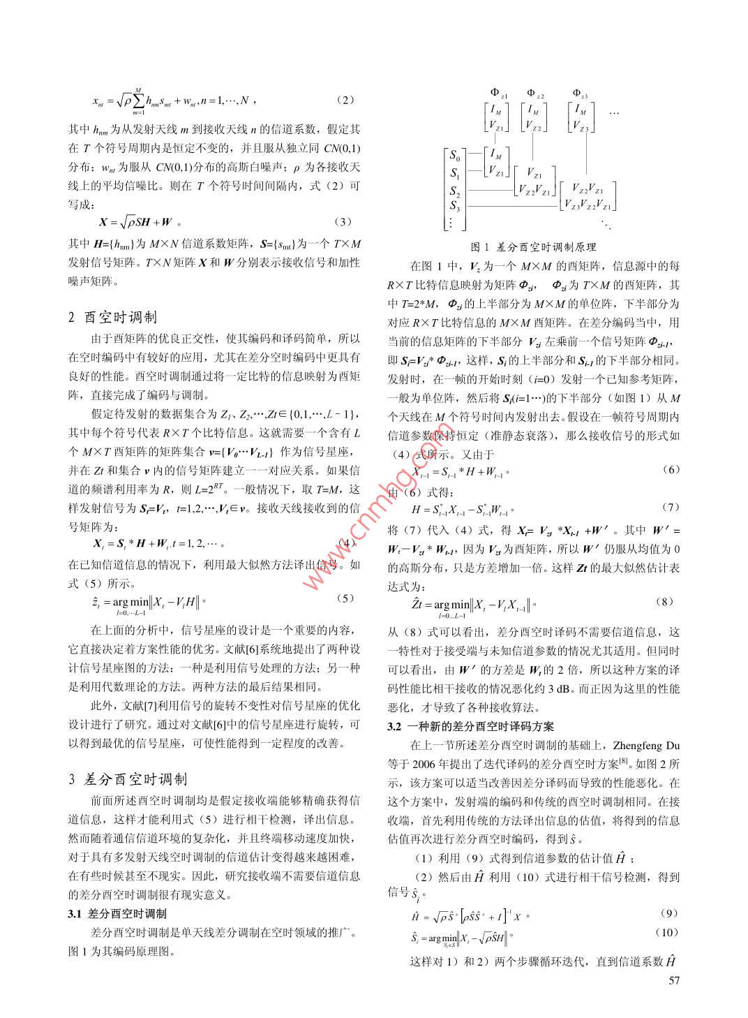 2009年第01期,第42卷通信技術(shù)Vol.42,No.01,2009總第205Communications TechnologyNo 205, Totally差分酉空時調(diào)制李慶坤,馬紅光,李正生第二炮兵工程學(xué)院,陜西西安710025)【摘要】總結(jié)了差分酉空時調(diào)制的原理和編譯碼方法。差分酉空時調(diào)制是多輸入多輸出(MIM0)無線通信中不需要信道信息的一種調(diào)制方法,它的性能比相干檢測接收差3dB。文中首先介紹了酉空時調(diào)制的基本原理和在各種信噪比下的信號星座圖的設(shè)計原則;然后在此基礎(chǔ)上介紹了不需要信道信息的差分酉空時調(diào)制;最后介紹了差分酉空時調(diào)制的最新進(jìn)展,指出了其研究方向【關(guān)鍵詞】多輸入多輸出;差分酉空時調(diào)制;信號星座;迭代【中圖分類號】TN911.22【文獻(xiàn)標(biāo)識碼】A【文章編號】1002-0802(2009)01-0056-03Differential Unitary Space-Time ModulationLI Qing-kun, MA Hong-guang, LI Zheng-sheng(The Second Artillery Engineering College, Xi'an Shaanxi 710025, China)(Abstract) This paper summarizes the principle, coding and decoding of Differential Unitary Space-Time Coding(DUSTC). DUSTC is a modulation for the MIMO when the channel state information (CSI) is absent. The performanceof dUStC is degraded 3dB as compared to the coherent receiver. This paper first presents the basic principle andthe design criterion for the signal constellations under the different Signal-Noise Ratio, and then describesthe dustc demanding no CSI. Finally, this paper points out the recent advancements and the development directionof the dustc(Key words] MIMO: DUSTC: signal constellation: iterati0引言獻(xiàn)[45]表明,酉空時調(diào)制是高信噪比下一種達(dá)到信道容量的信息論,多輸入多輸岀( MIMO)系統(tǒng)能夠顯著地提高信最佳調(diào)制方法。本文綜述了酉空時調(diào)制編碼的原理、設(shè)計原道容量2。MMO技術(shù)中的空時編碼技術(shù)通過將時間分集和則和發(fā)展方向??臻g分集結(jié)合起來,分別在時域和空域引入冗余,提高了系統(tǒng)的傳輸性能。在接收端能夠得到精確信道信息的情況下,1系統(tǒng)模型mou空時分組碼已有令人滿意的使用效果3,并已經(jīng)納假設(shè)通信系統(tǒng)發(fā)送端和接收端的天線數(shù)目分別為入3GPP標(biāo)準(zhǔn)T′是信道相干時間,表示該信道在T′個符號周期內(nèi)可以認(rèn)但是,在信道特性快速變化的移動環(huán)境中進(jìn)行有效的信為其信道衰落系數(shù)保持恒定。T是信號星座中酉矩陣的時間道估計是很困難的,在某些情況下甚至是不現(xiàn)實的。因此研維長度,T2時,MPSK存在信號擴(kuò)展,而且對于復(fù)信號很難應(yīng)用于發(fā)射天線數(shù)大于2的系統(tǒng):有關(guān)文接收天線n在t時刻的接收信號可表示為收稿日期:2008-04-28。作者簡介:李慶坤(1976-),男,博士研究生,主要研究方向為MMO技術(shù)、空時編碼技術(shù)等:馬紅光,(1959-),男,教授,主要研究方向為信號與信息處理:李正生,(1957-),男,教授,主要研究方向為信號與信息處理。h sn=1,…,N其中hm為從發(fā)射天線m到接收天線n的信道系數(shù),假定其在T個符號周期內(nèi)是恒定不變的,并且服從獨立同CNO.1)分布;wnm為服從CNO,1)分布的高斯白噪聲;p為各接收天S線上的平均信噪比。則在T個符號時間間隔內(nèi),式(2)可22v2S3Vz3Vz2vzi其中H={hm}為MN信道系數(shù)矩陣,S={sm}為一個T×M圖1差分西空時調(diào)制原理發(fā)射信號矩陣。T×N矩陣X和W分別表示接收信號和加性在圖1中,V為一個M×M的酉矩陣,信息源中的每噪聲矩陣。R×T比特信息映射為矩陣Φ,φ為T×M的酉矩陣,其中T=2*M,中3的上半部分為MXM的單位陣,下半部分為2酉空時調(diào)制對應(yīng)R×T比特信息的M×M酉矩陣。在差分編碼當(dāng)中,用由于酉矩陣的優(yōu)良正交性,使其編碼和譯碼簡單,所以當(dāng)前的信息矩陣的下半部分v左乘前一個信號矩陣,在空時編碼中有較好的應(yīng)用,尤其在差分空時編碼中更具有即s=V*,這樣,S1的上半部分和S1的下半部分相同。良好的性能。酉空時調(diào)制通過將一定比特的信息映射為酉矩發(fā)射時,在一幀的開始時刻(i=0)發(fā)射一個已知參考矩陣,陣,直接完成了編碼與調(diào)制。一般為單位陣,然后將Si=1…)的下半部分(如圖1)從M假定待發(fā)射的數(shù)據(jù)集合為Z1、Z2,…,∈{0,1…,L-1},個天線在M個符號時間內(nèi)發(fā)射出去。假設(shè)在一幀符號周期內(nèi)其中每個符號代表RXT個比特信息。這就需要一個含有L信道參數(shù)保持恒定(準(zhǔn)靜態(tài)衰落),那么接收信號的形式如個MXT酉矩陣的矩陣集合v={V…VL}作為信號星座(4)式所示。又由于并在Z和集合v內(nèi)的信號矩陣建立一一對應(yīng)關(guān)系。如果信道的頻譜利用率為R,則L=2。一般情況下,取T=M,這由(6)式得:樣發(fā)射信號為S=V,1=1,2,…,V∈ν。接收天線接收到的信S號矩陣為將(7)代入(4)式,得X=V*X1+W。其中W′=X,=S*H+H,t=1,2,…W-V*W1,因為V為酉矩陣,所以W′仍服從均值為0在已知信道信息的情況下,利用最大似然方法譯出信號。如的高斯分布,只是方差增加一倍。這樣Z的最大似然估計表式(5)所示達(dá)式為2,=arg)x, -V,HlZt=argminlX, -V, x,l(8)l=0…L-1=0.L-1在上面的分析中,信號星座的設(shè)計是一個重要的內(nèi)容,從(8)式可以看出,差分酉空時譯碼不需要信道信息,這它直接決定著方案性能的優(yōu)劣。文獻(xiàn)6系統(tǒng)地提出了兩種設(shè)特性對于接受端與未知信道參數(shù)的情況尤其適用