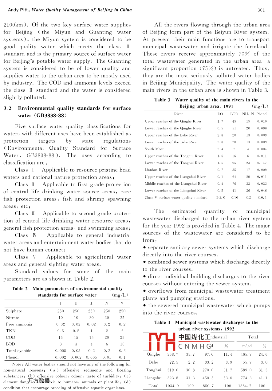 TSINGHUA SCIENCE AND TECHNOLOGYISSN 1007-0214 11/17 pp298 - 305Volume 5,Number 3,September 2000Water Quality Management of Beijing in ChinaAndy PittEntec UK Ltd, Northumbria House ,Manor Walks, Cramlington ,Northumberland, NE23 6UP, UKAbstract At present, Beijing's water resources are insufficient and will become the limiting factor forsustainable development for the city in the near future. Although efforts have been made to control pollution,water quality degradation has occurred in some of the important surface water supplies,aggravating the waterresource shortage. At present, approximately three quarters of the city's wastewater is discharged untreatedinto the urban river system ,resulting in serious pollution and negatively influencing the urban landscape andquality of daily life. To counteract these measures, the city has implemented a compr ehensive“Water QualityManagement Plan” for the region, encompassing water pollution control, prevention of water bodydegradation,and improved water quality.The construction of municipal wastewater treatment plants is recognised as fundamental to contr ollingwater pollution, and full secondary treatment is planned to be in place by the year 2015. Significant work isalso required to expand the service area of the municipal sewage system and to upgrade and renovate the oldersewer systems. The limitation on available water resources has also seen the emphasis shift to low water usingindustries and improved water conservation. Whilst industrial output has increased steadily over the past 1015 years at around 10% per annum, industrial water usage has remained relatively constant. Part of the city'swater quality management plan has been to introduce a strict discharge permit system, encour aging manyindustries to install on-site treatment facilities.Key words water quality; waste water treatment ; discharge permit systemFengtai,Haidian, Shijingshan). The rural areasIntroductioncontain 14 satellite cities surrounded by a total ofBeijing is the national capital of China, ancmore than 70 smaller towns.The region has athe capital of Beijing Municipality. The city istemperate climate; the summers are hot and humidlocated on the North China Plain, approximatelywith temperatures typically between 26 C to 30 C150 km Northwest of the Bohai Sea at a north-with abundant rainfall, and the winters are dry andlatitude of 40°. The municipality is approximatelycold with an average temperature of -5 C.16 000 km2 in size, of which 2/3 is mountainous1 Water Resourcesarea encircling the western, northern and easternsides of the city. From the 1990 census, the totalWater resources in the Beijing region consistpopulation was 12.9 million, with 6. 4 millionpri中國煤化工,reclaimed and re-usedliving in urban areas, 5. 2 million living in the city,wa'he region is consideredand a floating population of 1. 3 million. The cityolYHCNM HGring dry periods waterarea is 1048 km2 in size, and includes four centraldemand exceeds available supplies by up to 25%.urban districts (Dongcheng, Xicheng, Chongwen,Consequently,preservation of water quality is anXuanwu) and four suburban districts (Chaoyang ,important concern. With the steady growth of theurban population ( with increased standards CReceived,克7-02living) and the rapid development in industry andAndy Pitt: Water Quality Management of Beijing in China299agriculture, demand is continually increasing.However, these sources are deteriorating becauseThere is little possibility of developing newof pollution and increased abstraction upstream.water resources in the region except for furtherThe average available surface water resource forreclamation,re-use and conservation. Any majorthe municipality is about 2000 million m3/a.new water supply will involve regional importa-However,during ‘dry’ years this resource cantion. The favoured import scheme involves thedrop to as little as 9X108 m3/a.transportation of water from South China t(1. 2 Groundwater resourcesBeijing - a distance of 1235 km. It is estimated that1.2X10 m2/a will be imported by the year 2010.The Beijing area consists of two distinctgeomorphological regions, the mountains and the1. 1 Surface water resourcesplains,each having different hydrogeologicalThere are more than 200 streams and riversfeatures. Whilst the mountainous regions arewithin the municipal region associated with the fivegenerally lacking in groundwater, the Beijingmain river systems: Daqing, Yongding, Beiyun,plains have significant quantities of groundwaterChaobai and Miyun. There are 85 reservoirs with aavailable. The sustainable groundwater extractiontotal storage capacity of 7. 38 X 109 m,and 30rate is 2450 million m'/a. the long term averagelakes with a total water surface area of 9. 74 km',annual groundwater recharge is estimated atFig. 1.4950 m2/a,with an approximate sub-surface flowThe average annual rainfall is 626 mm,without of the basin of 1500 m3 /a.the annual run- off averaging 2.6X10* m'/a. LittleThe quality of the groundwater is generallysurface water flows out of the municipality exceptgood and is suitable for industrial, agricultural andduring severe storm events. Mountain water ismunicipal use. Most of the groundwater containsfully contained by the series of large reservoirs.calcium and magnesium. However, with the cityThe surface water supply is primarily drawn fromprimarily dependent upon groundwater for itsthe Miyun and Guanting reservoirs, which arewater supply, groundwater levels have dropped80 km to the north and west, respectively.significantly during the past 20 years because ofCity RiversLiangshui RiverTonghui RiverBahe RiverUpperQinghe RiverBejing-Miyun Irrigation CanalChaobai RiverYongding Irrigation C analBaihe RiverMIYUN> RESERVOIGUANTINGBEIJING、 RESERVOIRMUNICIPALITYHUAIROURESERVOIRJingmi DiversionC huaobaiCanalRiverVenYongdingnShiheRive中國煤化工MH.CNMHGFig.1 Water resources of Beijing municipality300Tsinghua Science and Technology ,September 2000, 5(3): 29