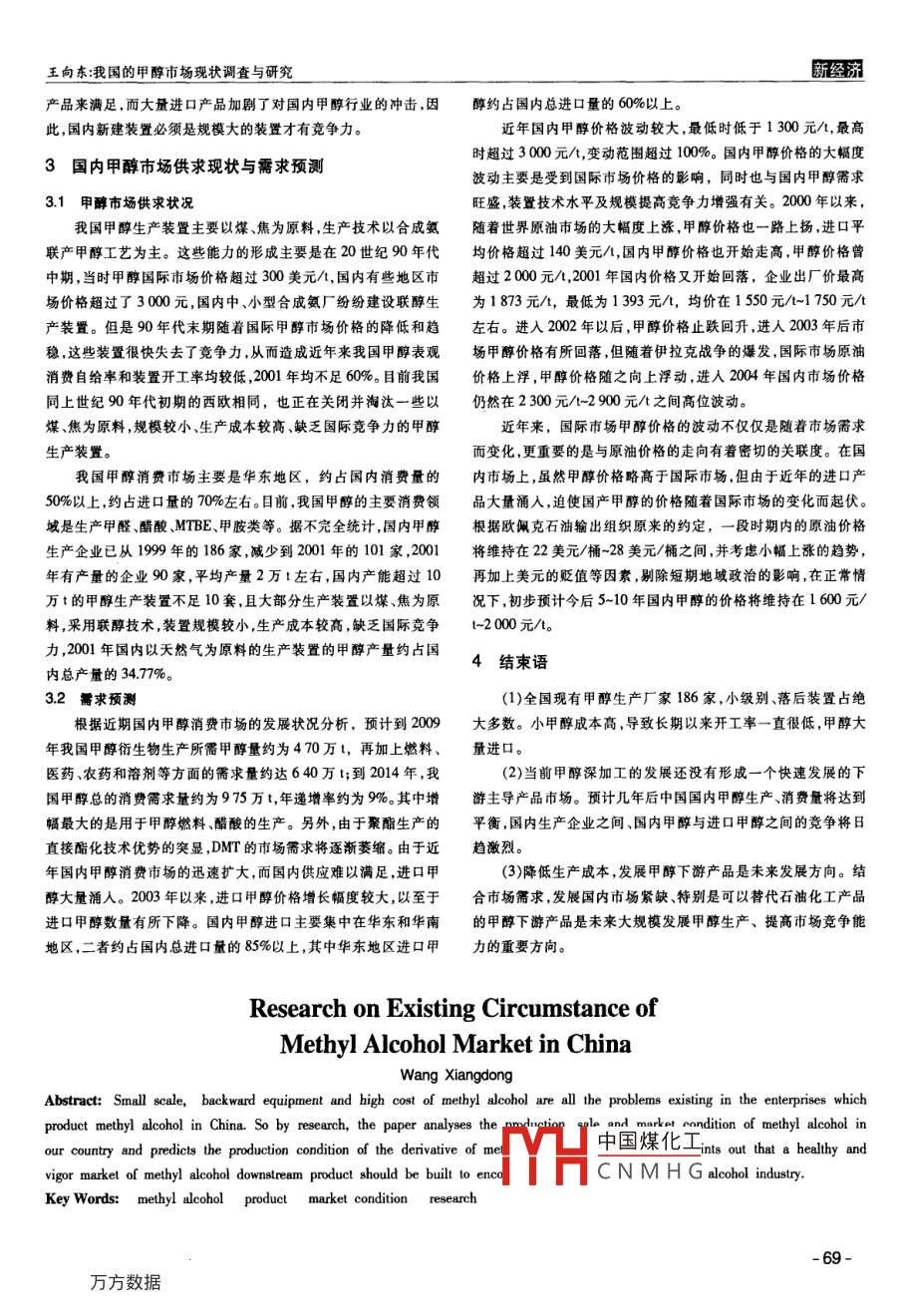 科學之友Friend of Science Amateurs2005年12月B我國的甲醇市場現(xiàn)狀調查與研究王向東(河曲縣地產(chǎn)開發(fā)公司山西忻州034000)摘要通過調查研究分析了國內甲醇的生產(chǎn)、鋪售及市場現(xiàn)狀,指出我國甲醇的生產(chǎn)企業(yè)現(xiàn)狀是級別小、裝置落后、甲醇成本高,并預測未來我國甲醇衍生物生產(chǎn)狀況,提出我國應形成一個健康有活力的甲醇下游產(chǎn)品市場才能促進申醇產(chǎn)業(yè)的發(fā)展。關鑣詞甲醇生產(chǎn)市場現(xiàn)狀調查中圖分類號:TQ351274文獻標識碼:A文章編號:1000-8136(2005)12-0068-021概述10t/年。甲醇產(chǎn)量4106,裝置開工率約787%消費量5732,自給率76.9%。進口甲醇1359,進口量占國內總消費量的23.7%。甲醇既是重要的化工產(chǎn)品及化工原料,又是未來的清潔能由表1可見,國內甲醇裝置總能力較大,但開工率嚴重不源之一。作為化工的關鍵產(chǎn)品,甲醇是由天然氣或煤炭生產(chǎn)其他1992-2004年國內甲醇市場情況表化工產(chǎn)品或合成燃料的最佳途徑,其重要性不言而喻。在世界基礎有機化工原料中,甲醇消費量僅次于乙烯、丙烯和苯而居第四年份產(chǎn)量開工率/%位。106.587.181.78甲醇廣泛用于生產(chǎn)塑料、合成纖維、合成橡膠、染料、涂料、118.175.02香料、醫(yī)藥和農(nóng)藥等。目前甲醇主要下游產(chǎn)品有甲醛、醋酸、甲基82.28叔丁基醚(MTBE)、甲胺類、氯甲烷類、對苯二甲酸二甲酯、甲基丙烯酸甲酯、二甲醚等,上述產(chǎn)品又可生成各自的衍生物,由甲113.487093醇出發(fā)生產(chǎn)的化工產(chǎn)品達數(shù)百種。甲醇還是一種重要的有機溶劑,在合成燃料和汽油添加劑方面其消費量也很大。甲醇在許多34.6174.3351.1潛在領域有著廣闊的應用前景:甲醇可以作為清潔燃料代替汽19983599油或與汽油摻混使用;甲醇燃料電池即將投入商業(yè)化運行;用甲醇制取微生物蛋白作為飼料乃至食品添加劑,國外已有工業(yè)化3684179.37裝置;甲醇制汽油及甲醇制烯烴技術都有所突破??梢娂状加猛?869相當廣泛。20012064855.82國內甲醇生產(chǎn)與消費現(xiàn)狀200253.63國內甲醇生產(chǎn)起始于20世紀60年代,以小甲醇起家。到60200371.16年代末,甲醇的生產(chǎn)能力僅為1×10v/年左右。80年代,國內甲醇550440.68000生產(chǎn)得到了進一步發(fā)展,到80年代末,甲醇的生產(chǎn)能力已達到86×10%/年。進人90年代,國內甲醇生產(chǎn)得到了較大的發(fā)展,足,1998年開工率僅為4136%,2000年市場形勢有所好轉,開工2004年全國生產(chǎn)能力已達56010/年。率上升到53.7%,2001年上升到558%,2003年隨著國內產(chǎn)能增目前國內煤制甲醇生產(chǎn)裝置近200套,規(guī)模在20×10%年加,開工率又回升到71.2%,2004年達到了78%。這主要是由于的僅兩套。10×10v/年級規(guī)模的有9套。4/年-10×10/年(不含國內聯(lián)醇裝置能力約占總能力的60%,多數(shù)聯(lián)醇裝置規(guī)模小、并10×10%/年)的有22套。其余小甲醇均為聯(lián)醇裝置。在1998年之且受到主產(chǎn)品化肥銷售的影響導致原料成本高、缺乏競爭力造前,受國外產(chǎn)品的沖擊我國甲醇裝置的開工率不斷下降。近年成中國煤化工醇消費市場的快速增長和來隨著國內市場需求的快速增長和產(chǎn)品價格的高位增長,國內化肥CNMH③有所提高。裝置的開工率逐漸回升,到2003年已經(jīng)突破78%。是由子國丙小聯(lián)醇裝置規(guī)模小、競爭力不足、造成裝置開2004年,全國甲醇生產(chǎn)企業(yè)近200家,總生產(chǎn)能力560×工率低國內甲醇產(chǎn)品供不應求有相當一部分甲醇市場需進口王向東:我國的甲醇市場現(xiàn)狀調查與研究斷終產(chǎn)品來滿足,而大量進口產(chǎn)品加劇了對國內甲醇行業(yè)的沖擊,因醇約占國內總進口量的60%以上。此,國內新建裝置必須是規(guī)模大的裝置才有競爭力。近年國內甲醇價格波動較大,最低時低于1300元/,最高時超過3000元/,變動范圍超過100%。國內甲醇價格的大幅度3國內甲醇市場供求現(xiàn)狀與需求預測波動主要是受到國際市場價格的影響,同時也與國內甲醇需求31甲醇市場供求狀況旺盛,裝置技術水平及規(guī)模提高競爭力增強有關。2000年以來我國甲醇生產(chǎn)裝置主要以煤、焦為原料,生產(chǎn)技術以合成氨隨著世界原油市場的大幅度上漲,甲醇價格也一路上揚,進口平聯(lián)產(chǎn)甲醇工藝為主。這些能力的形成主要是在20世紀90年代均價格超過140美元∧,國內甲醇價格也開始走高,甲醇價格曾中期,當時甲醇國際市場價格超過300美元/,國內有些地區(qū)市超過2000元/,2001年國內價格又開始回落,企業(yè)出廠價最高場價格超過了3000元,國內中、小型合成氨廠紛紛建設聯(lián)醇生為1873元/t,最低為1393元/,均價在1550元/t-1750元/t產(chǎn)裝置。但是90年代末期隨著國際甲醇市場價格的降低和趨左右。進入2002年以后,甲醇價格止跌回升,進人2003年后市穩(wěn),這些裝置很快失去了竟爭力,從而造成近年來我國甲醇表觀場甲醇價格有所回落,但隨著伊拉克戰(zhàn)爭的爆發(fā),國際市場原油消費自給率和裝置開工率均較低,2001年均不足60%。目前我國價格上浮,甲醇價格隨之向上浮動,進人2004年國內市場價格同上世紀90年代初期的西歐相同,也正在關閉并淘汰一些以仍然在2300元/-2900元/之間高位波動煤、焦為原料,規(guī)模較小、生產(chǎn)成本較高、缺乏國際競爭力的甲醇近年來,