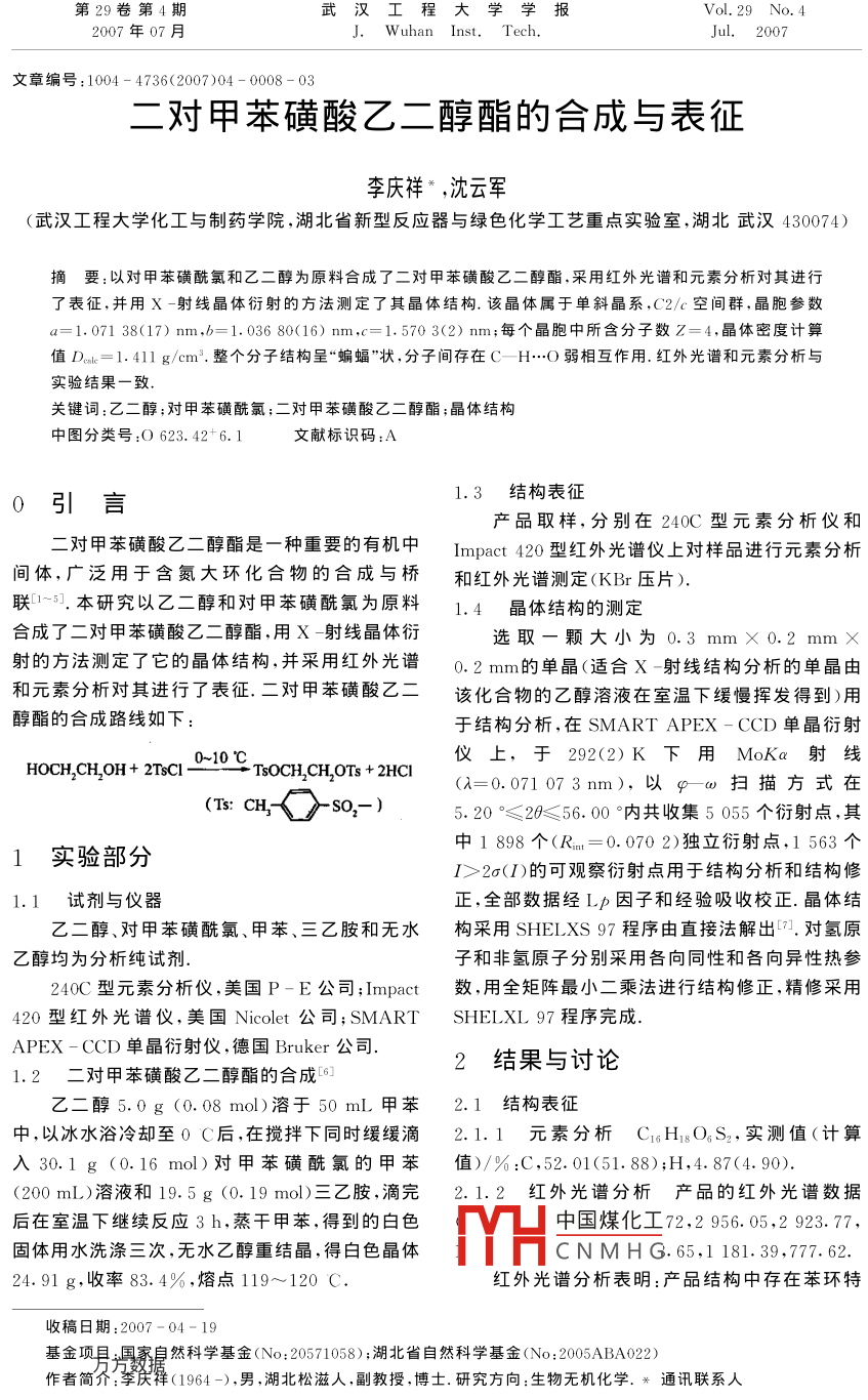第29卷第4期武漢工程大學(xué)學(xué)報ol. 29 No 42007年07月J. Wuhan Inst, Tech,Jul.2007文章編號:1004-4736(2007)04-0008-0二對甲苯磺酸乙二醇酯的合成與表征李慶祥*,沈云軍(武漢工程大學(xué)化工與制藥學(xué)院,湖北省新型反應(yīng)器與綠色化學(xué)工藝重點實驗室,湖北武漢430074)摘要:以對甲苯磺酰氯和乙二醇為原料合成了二對甲苯磺酸乙二醇酯,采用紅外光譜和元素分析對其進(jìn)行了表征,并用Ⅹ-射線晶體衍射的方法測定了其晶體結(jié)構(gòu),該晶體屬于單斜晶系,C2/c空間群,晶胞參數(shù)a=1.07138(17)mm,b=1.03680(16)nm,c=1.5703(2)nm;每個晶胞中所含分子數(shù)Z=4,晶體密度計算值Dk=1.4llg/cm3.整個分子結(jié)構(gòu)呈“蝙蝠”狀,分子間存在C-H…O弱相互作用.紅外光譜和元素分析」實驗結(jié)果一致關(guān)鍵詞:乙二醇;對甲苯磺酰氯;二對甲苯磺酸乙二醇酯;晶體結(jié)構(gòu)中圖分類號:O623.42+6.1文獻(xiàn)標(biāo)識碼:A0引言1.3結(jié)構(gòu)表征產(chǎn)品取樣,分別在240C型元素分析儀和二對甲苯磺酸乙二醇酯是一種重要的有機(jī)中1 mpact420型紅外光譜儀上對樣品進(jìn)行元素分析間體,廣泛用于含氮大環(huán)化合物的合成與橋和紅外光譜測定(KBr壓片)聯(lián)1-3.本研究以乙二醇和對甲苯磺酰氯為原料1.4晶體結(jié)構(gòu)的測定合成了二對甲苯磺酸乙二醇酯,用Ⅹ射線晶體衍選取一顆大小為0.3mm×0.2mm射的方法測定了它的晶體結(jié)構(gòu),并采用紅外光譜0.2mm的單晶(適合X射線結(jié)構(gòu)分析的單晶由和元素分析對其進(jìn)行了表征·二對甲苯磺酸乙二該化合物的乙醇溶液在室溫下緩慢揮發(fā)得到)用醇酯的合成路線如下于結(jié)構(gòu)分析,在 SMART APEX-CCD單晶衍射TOCH CH- OH+2C~010℃儀上,于292(2)K下用MoKa射線TsOCH, CHOTs+ 2HCI(λ=0.071073nm),以ga掃描方式在SO.-)5.20°≤20≤56.00°內(nèi)共收集5055個衍射點,其1實驗部分中1898個(Rmn=0.0702)獨立衍射點,1563個Ⅰ>2σ(1)的可觀察衍射點用于結(jié)構(gòu)分析和結(jié)構(gòu)修1.1試劑與儀器正,全部數(shù)據(jù)經(jīng)Lp因子和經(jīng)驗吸收校正.晶體結(jié)乙二醇、對甲苯磺酰氯、甲苯、三乙胺和無水構(gòu)采用 SHELXS97程序由直接法解出.對氫原乙醇均為分析純試劑子和非氫原子分別采用各向同性和各向異性熱參240C型元素分析儀,美國P-E公司; Impact數(shù),用全矩陣最小二乘法進(jìn)行結(jié)構(gòu)修正,精修采用420型紅外光譜儀,美國 Nicolet公司; SMART SHELXI97程序完成APEX-CCD單晶衍射儀,德國 Bruker公司2二對甲苯磺酸乙二醇酯的合成結(jié)果與討論乙二醇5.0g(0.08mol)溶于50mL甲苯2.1結(jié)構(gòu)表征中,以冰水浴冷卻至θC后,在攪拌下同時緩緩滴2.1.1元素分析C1H1OS2,實測值(計算入30.1g(0.16mol)對甲苯磺酰氯的甲苯值)/%:C,52.01(51.88);H,4,87(4.90)(200mL)溶液和19.5g(0.19mol)三乙胺,滴完2.1.2紅外光譜分析產(chǎn)品的紅外光譜數(shù)據(jù)后在室溫下繼續(xù)反應(yīng)3h,蒸干甲苯,得到的白色中國煤化工72,2956.05,2923.77,固體用水洗滌三次,無水乙醇重結(jié)晶,得白色晶體CNMHG.65,1181.39,777.6224.91g,收率83.4%,熔點119~120C紅外光譜分析表明:產(chǎn)品結(jié)構(gòu)中存在苯環(huán)特收稿日期:2007-04-19基金自然科學(xué)基金(No:20571058);湖北省自然科學(xué)基金(No:2005ABA022)1964-),男,湖北松滋人,副教授,博士.研究方向:生物無機(jī)化學(xué).*通訊聯(lián)系人李慶祥,等:2-二對甲苯磺酸乙二醇酯的合成與表征征吸收峰(777.62,1595.28,1451.79cm-1)、砜甲基碳原子C(1)和磺?;鶊F(tuán)的硫原子S(1)幾乎(S=O)特征吸收峰(1363.65,1181.39cm-1)及與苯環(huán)共平面.原子S(1),O(1),O(2)和C(1)與甲基和亞甲基的特征吸收峰(2993.72,2956.05,苯環(huán)平面C(2)-C(7)之間的距離分別為923.77cm-1)0.00048,-0.03907,-0.05354和0.0073nm2.2晶體結(jié)構(gòu)分子中存在兩種C—H…O氫鍵(見表3),這些氫化合物的晶體結(jié)構(gòu)見圖1,部分晶體學(xué)數(shù)據(jù)、鍵可能會使晶體更穩(wěn)定部分鍵長和鍵角數(shù)據(jù)以及氫鍵參數(shù)分別見表1表2二對甲苯磺酸乙二醇酯的部分鍵長、鍵角表2和表3Table 2 Selected bond lengths and bond angles for 1, 2bis(p-tolylsulfonato )ethane化學(xué)鍵鍵長/mm鍵角/()C(AlC(1)—C(2)0.1502(3)CaLO(1)-S(1)0.1420(18)C(8)—O(3)的0.1422(16C(5)-S(1)0.1582(15)C(3)C(2)C(1)120.80(2)圖1二對甲苯磺酸乙二醇酯的晶體結(jié)構(gòu)(7)-C(6)-C(5)119.09(19)Fig. 1 Crystal struc103.67(9(4)C(5)-S(1)119.37(1thandO(3)-C(8)—C(8)107.13(16)表1二對甲苯磺酸乙二醇酯的晶體學(xué)數(shù)據(jù)O(1)-S(1)-C(5)109.23(10Table 1 Crystallographic data of 1.2bis (pO(1)-S(1)O(3)108.57(10)tolylsulfonato )ethaneC(8)-0(3)-S(1120.07(13)晶體學(xué)參數(shù)數(shù)據(jù)O(2)-S(1)—C(5110.36(9)rmulaChiSo szC(6)-C(5)—S(1)20.15(14)O(1)-S(1)-O(2)119.91(11)MonoclinicO(3)-S(1)—C(5)103.76(8)ColorlessSymmetry transformations used to generate equivalent atoms#1:-x+1,y,-z+3/2range for data collection /()2.59~26.9表3二對甲苯磺酸乙二醇酯的氬鍵1.07138(17)Table 3 Hydrogen Bonds for 1, 2-bis(p-tolylsulfonato)1.03680(16)1.57030(2)1.7443(5)D—H….4D-HH…AD…A/(°)al/g·cmC(7)—H(7)…0(3)#20.0930.2530.3437(3)163.9Absorption coefficient /mm -C(3)H(3)…O(1)#30.0930.2590.3446(3)153F(000)Symmetry transformations used to generate equivalent atordent reflections1898(Rm=0.0702)Goodness -of -fit on F1.087參考文獻(xiàn)R1,tR2(l>20(10.0469,0.1321RI, wR,(all data)0.0547,0.1378[1 Richman J E, Atkins T J Nitrogen analogs of crown32land-220nd hole/(e·nm-3)ethers [J. J Am Chem Soc, 1974, 96(7):2268由圖1可