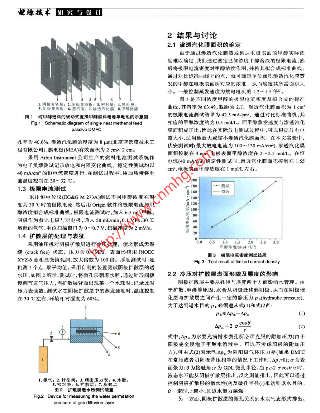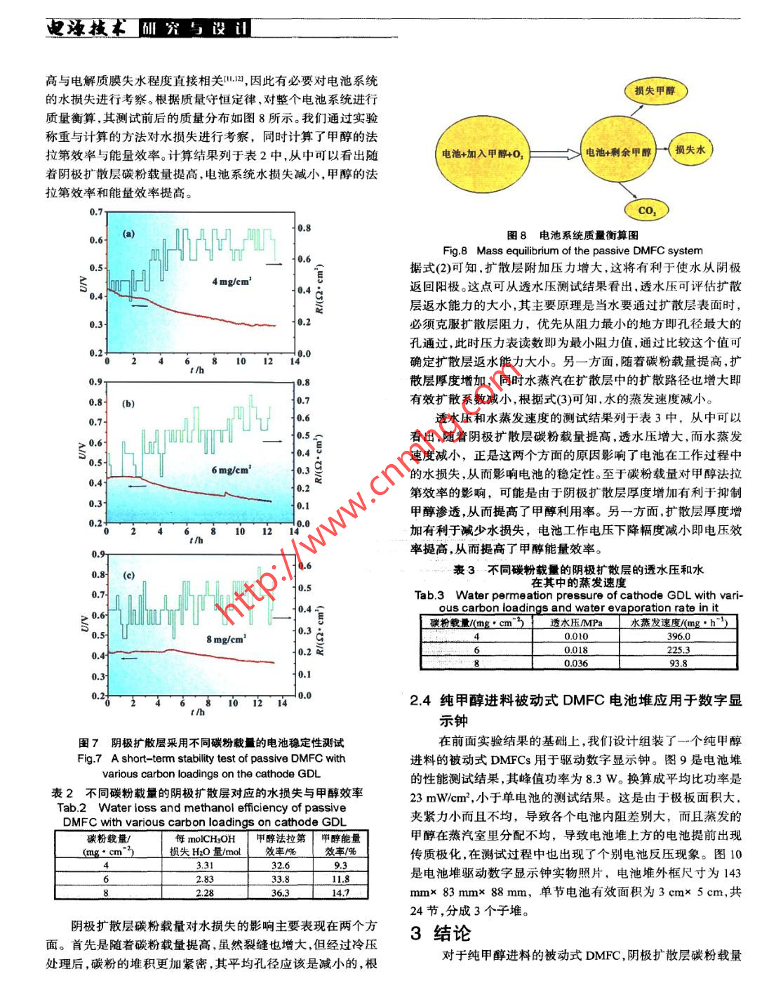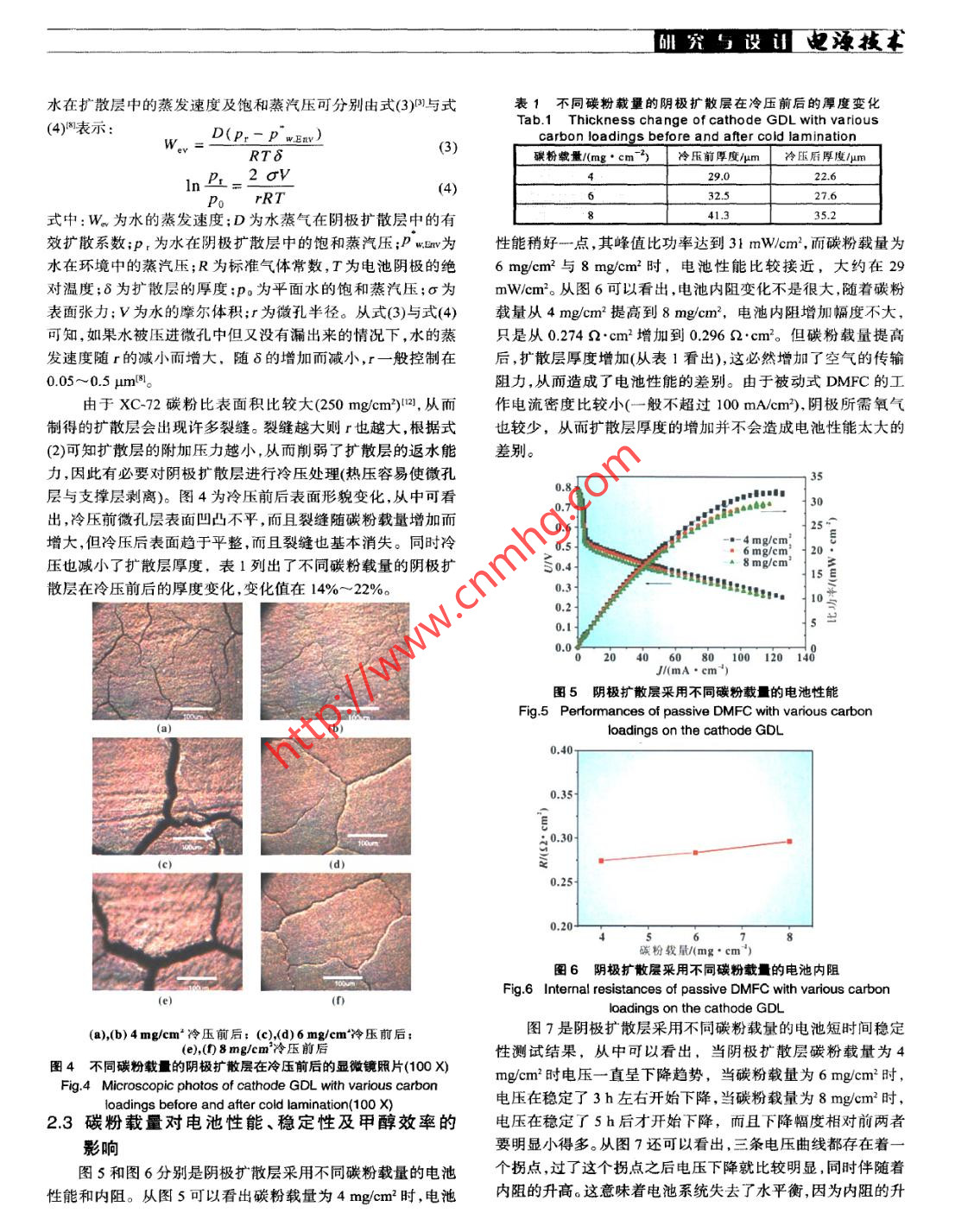 研究與設(shè)迅電源技術(shù)純甲醇進(jìn)料被動(dòng)式直接甲醇燃料電池趙鋒良,孫公權(quán),高妍,陳利康,楊少華,辛勤(中國(guó)科學(xué)院大連化學(xué)物理研究所,遼寧大連116023)摘要:考察了陰極擴(kuò)散層碳粉載量對(duì)純甲醇進(jìn)料被動(dòng)式直接甲醇燃料電池穩(wěn)定性和被動(dòng)式水管理的影響,并定量計(jì)算了水損失和甲醇效率。結(jié)果表明:陰極擴(kuò)散層碳粉載量(即厚度)增加,電池系統(tǒng)水損失量減少,甲醇法拉第效率和能量效率提高;設(shè)計(jì)、組裝了一個(gè)純甲醇進(jìn)料被動(dòng)式直接甲醇燃料電池堆,其最大輸出功率為8.3W,并用于驅(qū)動(dòng)數(shù)字顯示鐘。關(guān)鍵詞:被動(dòng)式直接甲醇燃料電池;被動(dòng)式水管理;水損失;甲醇效率中圖分類號(hào):TM 911.4文獻(xiàn)標(biāo)識(shí)碼:A文章編 號(hào):1002-087 X(2007)04- -0301-05Neat methanol feed passive DMFCZHAO Feng-liang, SUN Gong quan, GAO Yan, CHEN Li-kang, YANG Shao-hua, XIN Qin(Dalian Institue of Chemical Physics, Chinese Academy of Science, Dalian Liaoning 116023, China)Abstract: The effect of cathode GDL with various carbon loadings on stability of neat methanol feed passive DMFCand passive water management was investigated. Water loss and methanol efficiency were quantitatively calculated.The results show that the increased carbon loadings of cathode GDL is helpfut to reduce water loss and enhancemethanol efficiency. A neat methanol feed passive DMFC stack with a maximum power of 8.3 W was successfullydesigned and fabricated to power a digital calendar.Key words: passive direct methanol fuel cell; passive water management; water loss; methanol efficiency直接甲醇燃料電池(direct methanol fuel cell, DMFC)具有也是被動(dòng)式水管理的根本出發(fā)點(diǎn),其中研究較多的是具有返結(jié)構(gòu)簡(jiǎn)單燃料易于運(yùn)輸和存儲(chǔ)、系統(tǒng)比能量高等優(yōu)點(diǎn),已成水結(jié)構(gòu)的GDLD.7M。為國(guó)內(nèi)外研發(fā)熱點(diǎn)之一。近年來(lái)又出現(xiàn)了一種“被動(dòng)式”基于被動(dòng)式水管理,我們先對(duì)陰極擴(kuò)散層進(jìn)行冷壓處(passive)的DMFC,它的進(jìn)料主要靠自由擴(kuò)散,取消了燃料和理,然后考察陰極擴(kuò)散層碳粉載量對(duì)純甲醇進(jìn)料被動(dòng)式DM-氧化劑的供給和循環(huán)裝置,因而結(jié)構(gòu)更為簡(jiǎn)單,在輸出功率較FC穩(wěn)定性的影響,并定量計(jì)算了水損失與甲醇效率。最后根低情況下系統(tǒng)效率較高。受到甲醇滲透問(wèn)題限制,被動(dòng)式據(jù)實(shí)驗(yàn)結(jié)果,設(shè)計(jì)、組裝了一個(gè)純甲醇進(jìn)料的被動(dòng)式DMFC電DMFC-般采用低濃度甲醇溶液(- - 般不超過(guò)5 molL)進(jìn)池堆用于驅(qū)動(dòng)數(shù)字顯示鐘。料,這意味著系統(tǒng)必須攜帶大量的水,從而降低了電池系統(tǒng)1實(shí)驗(yàn)比能量。因此,在有限體積里要提高被動(dòng)式DMFC系統(tǒng)比能1.1膜電極制備,量,就必須提高進(jìn)料甲醇濃度,從而以高濃度或純甲醇進(jìn)料成采用轉(zhuǎn)壓法(decal method)制備膜電極。陰陽(yáng)極催化劑分為被動(dòng)式DMFC研究的主要方向”。水管理是DMFC系統(tǒng)的關(guān)鍵問(wèn)題之_1。主動(dòng)式DMFC別采用60%(質(zhì)量分?jǐn)?shù))PvC (Johnson Matthey Corp.)與PtRu一般采用高流 速氣體帶走陰極生成的水,然后再冷凝回收補(bǔ)black (Johnson Matthey Corp.),其中貴金屬載量分別為2.4充陽(yáng)極。被動(dòng)式DMFC通常采用被動(dòng)的方式進(jìn)行水管理,特mg/cm2與5 mg/cm?,Nafion含量分別為10%與15%(質(zhì)量分別是以純甲醇進(jìn)料的被動(dòng)式DMFC,其反應(yīng)所需的水只能靠數(shù))。電解質(zhì)膜采用Nafion1135膜。陰陽(yáng)極支撐層均采用自身來(lái)維持。陰極的氣體擴(kuò)散層(gas difusion layer , GDL)起著Toray TGP-H-060碳紙,浸聚四氟乙烯(PTFE)量分別為30%與氧氣傳輸和生成水排出等作用,因此很多研究者首先關(guān)注的10%(質(zhì)量分?jǐn)?shù))。陽(yáng)極微孔層的XC-72碳粉載量為1.9 mg/cm',是GDL本身的性質(zhì)對(duì)陰極水管理能力和電池性能的影響,它采用Nafion作為粘結(jié)劑,其含量為10%(質(zhì)量分?jǐn)?shù))。陰極微孔層采用PTFE作為粘結(jié)劑,其含量為50%(質(zhì)量分?jǐn)?shù))。1.2單電池性能及穩(wěn)定性測(cè)試收稿日期:2006- -12- -05作者簡(jiǎn)介:趙鋒良(1977--),男,福建省人,碩士生,主要研究方向單電池測(cè)試裝置見(jiàn)圖1。當(dāng)純甲醇加人甲醇腔后,被滲透為直接甲醇燃料電池。汽化膜吸收并蒸發(fā)進(jìn)入蒸汽室,最后到達(dá)電極表面。甲醇儲(chǔ)罐Biography: ZHAO Feng- liang (1977- -),male, candidate for的容積為6.5 mL,蒸汽室的厚度為3 mm,集流板為2 mm厚master.的316L不銹鋼板,其上鉆有--系列直徑為3mm的通孔,開(kāi)聯(lián)系人:孫公權(quán)3012007.4 Vol.31 No.4電源技術(shù)研究馬設(shè)證2結(jié)果與討論2.1滲透汽化膜面積的確定由于通過(guò)滲透汽化膜蒸發(fā)到達(dá)電極表面的甲醇實(shí)際濃度難以確定,我們通過(guò)測(cè)定已知濃度甲醇溶液的極限電流,然后將極限電流密度對(duì)甲醇濃度作圖,并將其擬合成標(biāo)準(zhǔn)曲線。通過(guò)對(duì)比標(biāo)準(zhǔn)曲線上的點(diǎn),就可確定單位面積滲透汽化膜蒸發(fā)的甲醇在電極表面所對(duì)應(yīng)的濃度,從而確定其所需面積大小。一般控制蒸發(fā)速度為放電電流的1.2~1.5 倍P)