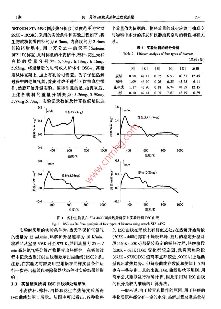 第27卷第3期太陽能學(xué)報Vol 27, No. 32006年3月ACTA ENERGLAE SOLARIS SINICAMar,,2006文章編號:0540096(2006)030237-05生物質(zhì)熱解過程吸熱量何芳,徐梁2,柏雪源!,蔡均猛3,易維明(1.山東理工大學(xué)淄博255049;2.德國耐弛儀器制造公司上海應(yīng)用實驗室,上海20003.上海理工大學(xué),上海20003)摘要:對生物質(zhì)熱解過程吸熱量(生物質(zhì)升溫所吸熱量和生物質(zhì)熱解所吸熱量的和)的研究現(xiàn)狀進行了總結(jié)分析認為目前采用的分別選取生物質(zhì)熱容c和熱解反應(yīng)熱Q,用公式來計算熱解過程吸熱量的方法很難得出準確的結(jié)果。通過對同步熱分析儀(STA)的分析和對差熱曲線(DC)的研究將c和Q,綜合考慮對實驗所得DSC曲線進行處理和積分得出熱解過程吸熱量的規(guī)律。在 Netsch STA49C上對小麥秸稈、棉桿、花生殼和白松進行了實驗研究和分析。結(jié)果表明將1kg上述干生物質(zhì)從初始室溫30K升到主要熱解反應(yīng)完成的溫度673K所需提供的熱量分別為523k、459kJ385k、646kJ,為生物質(zhì)熱解工藝的能量平衡分析和經(jīng)濟性分析提供了參考關(guān)鍵詞:生物質(zhì);熱解;吸熱量;分析;實驗中圖分類號:TK文獻標(biāo)識碼:A0引言的快速熱解計算時使用的熱容參數(shù)是2300kJ/(kgK); Janse等2(200對木材顆粒的快速熱解計算時生物質(zhì)熱解過程吸熱量是指在生物質(zhì)熱解(隔也采用參數(shù)值2300J(kgK)。Jmn等(19)對絕氧氣)過程中提供生物質(zhì)升溫和熱解所需熱量的柱狀小顆粒物熱解過程分析采用的熱容值是1+總和,是生物質(zhì)熱解過程中必須提供的最小熱量。4.85(7-273);而Sham等1(198)對環(huán)形翅片式這個熱量的確定對生物質(zhì)熱解裝備的設(shè)計計算、生生物質(zhì)熱解裝置中稻殼熱解實驗分析計算時采用的物質(zhì)熱解工藝的能量平衡分析和經(jīng)濟性分析都具有是12(kgK),Liso等(199對片狀柱狀非常重要的意義和球狀生物質(zhì)熱解過程分析時采用的數(shù)據(jù)是1國內(nèi)外研究現(xiàn)狀分析1670kJ/(kg…K)對熱解反應(yīng)的熱效應(yīng)來說,一直沒有較為一致由于生物質(zhì)成分熱解過程(狀態(tài)、成分不斷變的定量或定性的結(jié)論。 Raveendran等(196)認為化)的復(fù)雜性以及現(xiàn)有生物質(zhì)熱物性參數(shù)的缺乏和生物質(zhì)的焓和熱解反應(yīng)后的各產(chǎn)物焓的和相等。難以測定等因素生物質(zhì)熱解過程吸熱量的準確確 Diebold等(1982)假設(shè)熱解1g生物質(zhì)需要能量定一直是個難題。目前大多采用假設(shè)生物質(zhì)熱容恒200包括生物質(zhì)升溫至熱解溫度過程熱解反應(yīng)定和熱解反應(yīng)熱效應(yīng)是定值的方法來計算”,即過程和熱解產(chǎn)物蒸發(fā))。Momi等”(99)指出,在Q=c2△7+Q。其中,Q—熱解過程吸熱量,kJ/生物質(zhì)熱解液化設(shè)備中,生產(chǎn)1kg生物原油(得率約kg;cp生物質(zhì)熱容kJ/(kgK);T為樣品溫度,K;為喂料量的62%)需能量約為2.5M,這個能量包括Q,—熱解反應(yīng)熱效應(yīng),k/kg。在這個公式中要輻射損失和廢氣帶走的能量。顯然,這里提到的能確定生物質(zhì)的熱容和熱解反應(yīng)熱效應(yīng)。量不僅包括了反應(yīng)吸收或放出的能量,還涉及其它目前不同生物質(zhì)廢棄物熱容方面數(shù)據(jù)還很缺多種能量損耗,從這些數(shù)據(jù)中很難判斷出熱解反應(yīng)乏,沒有全面可靠的數(shù)據(jù)。不同的研究者在計算時的熱效應(yīng)。采用的熱容值比較混亂,沒有明確的依據(jù)而且互相Liliedahl等在進行熱解反應(yīng)理論分析時假設(shè)之間差異顯著。例如: Latour等(2001)對葡萄皮反應(yīng)熱為零。 Miller等(197)在對生物質(zhì)熱解模收稿日期:2004-1008基金項目:國家863高技術(shù)研究發(fā)展計劃(200A514030);山東省自然科學(xué)基金(20042X21)238太陽能學(xué)報27卷型進行研究時,采用三獨立平行反應(yīng)原理給出了每以將cp和Q綜合考慮,對DsC曲線處理和積分得步反應(yīng)的熱效應(yīng),如表1所示。Jawe等(199)出熱解過程吸熱量規(guī)律。介紹了 Milosavljevic等對熱解反應(yīng)熱效應(yīng)的總結(jié),指出不同作者給出纖維素?zé)峤獾臒嵝?yīng)值范圍在+2DSC曲線特性1700-2500J·g;他們在對生物質(zhì)快速熱解液化熱分析儀器中,能同時進行熱重和熱效應(yīng)分析過程進行模擬時,各反應(yīng)的熱效應(yīng)列于表1中。根的儀器主要有:熱重差熱分析儀(TG/DTA)和熱重差據(jù)Mler和 Janse的各自模型和反應(yīng)條件可以計算出示掃描熱分析儀( TG/DSC),但差熱分析(DTA)對熱生物質(zhì)熱解過程中總的熱效應(yīng),但是他們都做了一量定性定量結(jié)果的精度遠不如差示掃描分析,因此定的假設(shè),從數(shù)據(jù)來源和表1中數(shù)據(jù)本身可以看出,選用 TG-DSC同步熱分析儀進行實驗研究。由于該這些模型的準確性等都有待驗證,目前有效的驗證儀器能同時準確地監(jiān)測生物質(zhì)熱解過程失重的熱效方法尚未見報道。應(yīng)情況,因此可以對生物質(zhì)熱解進程和熱效應(yīng)規(guī)律表1 Miller、 Janse快速熱解反應(yīng)各步熱效應(yīng)進行對應(yīng)分析。明確了解失重各階段對應(yīng)的熱效應(yīng)Table 1 Reaction heat of each step in Miller and Janse models數(shù)據(jù),并利用這些實驗數(shù)據(jù)可以對應(yīng)計算達到不同反應(yīng)序號1(K1)2(K2)3(K)4(K)5熱解溫度狀態(tài)生物質(zhì)所吸熱量M