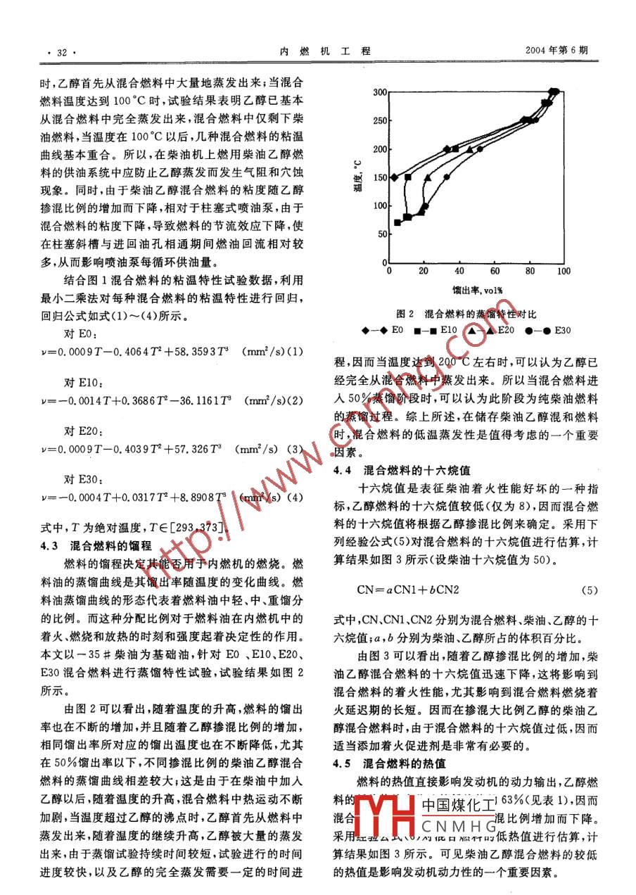 第25卷第6期內(nèi)燃機工程VoL 25 No 62004年12月Chinese Internal Combustion Engine EngineeringDec. 200文章編號:1000-0925(2004)06-030-04250112乙醇-柴油混合燃料的理化特性的研究于世濤,郭英男2,卓斌,劉金山2,楊林(1.上海交通大學(xué)汽車電子技術(shù)研究所,上海200030;2.吉林大學(xué)內(nèi)燃機研究所)Study on the Physical and Chemical Characteristics of Ethanol-Diesel Blend FuelsYU Shi-tao, GUO Ying-nan, ZHUO Bin', LIU Jin-shan, Yang Lin(1. The Institute of Automotive Electronic Technology, Shanghai Jiaotong University, Shanghai 200030, China;2. The Institute of Internal Combustion Engine, Jilin University)Abstract: In order to help the study of using the ethanol-diesel blend fuel on a diesel engine, the mainphysical and chemical characteristics of ethanol-diesel blend fuel lueve investigated in this paper. The lowheating value, cetane number of the blends with different ethanol fractions are calculated by using the experiential formula, Experiments of distillation and viscosity were done to study the distillation characteristics andviscosity characteristics of different ethanol-diesel blend fuels (E0, E10, E20, E30), and several experientialformulas are formulated based on the results of viscosity experiment: The solubility experiment is done tostudy the solubility of different ethanol-diesel blends(EO-E100), besides, the effects of solvent on the solubility curve of different ethanol-diesel blends are also studied. The studies show that the low heat value, cetane number, viscosity of the blends decrease with the increasing content of ethanol in the blends; The distil-lation characteristics of the blends is very high in the low range of temperature; Solvent can better the solu-bility of ethanol-diesel blend fuels.摘要:為了有助于開展乙醇柴油混合燃料在發(fā)動機上的應(yīng)用研究,本文開展了不同乙醇摻混比例柴油乙醇混合燃料的主要理化特性的研究。采用數(shù)值計算的方法研究了不同乙醇摻混比例對混合燃料的低熱值、十六烷值的影響;開展燃料的蒸餾特性試驗、粘溫特性試驗,研究了不同乙醇摻混比例(E0,E10,E20,E30)對混合燃料的蒸餾特性、粘溫特性的影響,并對混合燃料的粘溫特性試驗結(jié)果進行數(shù)值回歸;釆用相溶特性試驗研究了不冋乙醇摻混比例的混合燃料(E0-E100的相溶特性,以及助溶劑對混合燃料相溶特性曲線的影響。研究結(jié)果表明:隨著乙醇摻混比例的增加,混合燃料的低熱值、十六烷值、粘度逐漸降低,混合燃料的低溫蒸餾特性較強,助溶劑可有效解決乙醇柴油的相溶問題。關(guān)鍵詞:內(nèi)燃機;柴油乙醇混合燃料;粘度;蒸餾特性;助溶劑Key Words: I C Engine; Ethanol-Diesel Blend Fuel; Viscosity; DistillationCharacteristic; Solvent中圖分類號:TK407.9文獻標(biāo)識碼:A1概述普遍關(guān)注的問題。乙醇作為一種可再生含氧生物燃料,被認(rèn)為是一種比較有前景的代用燃料。隨著汽車保有量的增加,石油短缺及排放污染問題日益突出,尋求清潔的石油替代燃料成為人們yhA中國煤化工、巴西和歐共體等國一汽油(E7.7,E10CNMHG收稿日期:200402-20作者簡介:于世濤(1977-),男,博士生,主要研究方向為內(nèi)燃機代用燃料與排放,Ema: seawave@ sjtu. edu,cn2004年第6期20)多年,然而乙醇在柴油機上的應(yīng)用技術(shù)還不成3試驗裝量和方法熟,這主要是由于乙醇與柴油之間存在較大理化性質(zhì)的差異。本文針對與發(fā)動機應(yīng)用相關(guān)的柴油乙醇采用GB265型石油產(chǎn)品運動粘度測定儀,按照混合燃料理化特性進行的研究結(jié)果表明:隨著乙醇GB/T265試驗方法進行混合燃料粘溫特性試驗;遵摻混比例的增加,混合燃料的十六烷值、熱值、粘度循GB/T6536試驗方法在蒸餾儀上進行混合燃料蒸逐漸降低;混合燃料的低溫蒸餾特性較強;助溶劑可餾特性試驗;采用水浴、冰柜化學(xué)試驗臺進行混合燃有效解決乙醇柴油的相溶問題。料的相溶特性試驗。2醇類燃料的物化特性4混合燃料的理化性質(zhì)醇類是烴基(一R)與羥基(-OH組成的化合4.1冷濾點物,從本質(zhì)上決定了醇類可成為替代石油系燃料的冷濾點是評價燃料油低溫性能的指標(biāo)。對于柴內(nèi)燃機燃料,而羥基的存在又決定了它有很多不同油乙醇混合燃料,由于乙醇的凝點為-114°C,因而于石油系燃料的特性。燃料在內(nèi)燃機燃燒做功過程混合燃料的冷濾點不會因乙醇的摻人而下降,反而是一個復(fù)雜的物理化學(xué)變化過程,燃料的著火燃燒還會保持較好的低溫使用性能。特性取決于其揮發(fā)性、沸點、汽化熱、閃點、著火溫4.2混合燃料的粘度度、辛烷值、十六烷值、粘度等一系列物理化學(xué)特在柴油機中,燃油在供油系統(tǒng)中起著潤滑和防性漏作用,燃油的粘度是發(fā)動機燃料一個重要的評價指標(biāo),燃料的粘溫曲線(粘度隨溫度變化關(guān)系)是燃表1幾種燃料的主要理化特性比較料、特別是代用燃料重要的品質(zhì)特性。考慮到發(fā)性質(zhì)汽油柴油動機燃油系統(tǒng)工作溫度范圍,本文以一35#柴油為化學(xué)式Cle-23C3HsOH基礎(chǔ)油,在20~100°C的溫度范圍內(nèi),對E0、E10、分子量95~120180~20046E20、E30(符號E后面的數(shù)字表示乙醇在混合燃料含氧量,%0.434.8中的體積百分比)混合燃料進行粘溫特性試驗,試驗比重07~0.780.82~0.880.79結(jié)果如圖1所示。理論空燃比kg/kg14.2~15.114.49.0沸點,C0~200175~36078.5凝點,C114粘度(20C),mPas0.42低熱值,M/kg43.542.526.77汽化潛熱,kJ/k冒L辛烷值RON84~94111十六烷值0~1040~55著火極限,vol%1.4~7.61.58~8.24.3~19