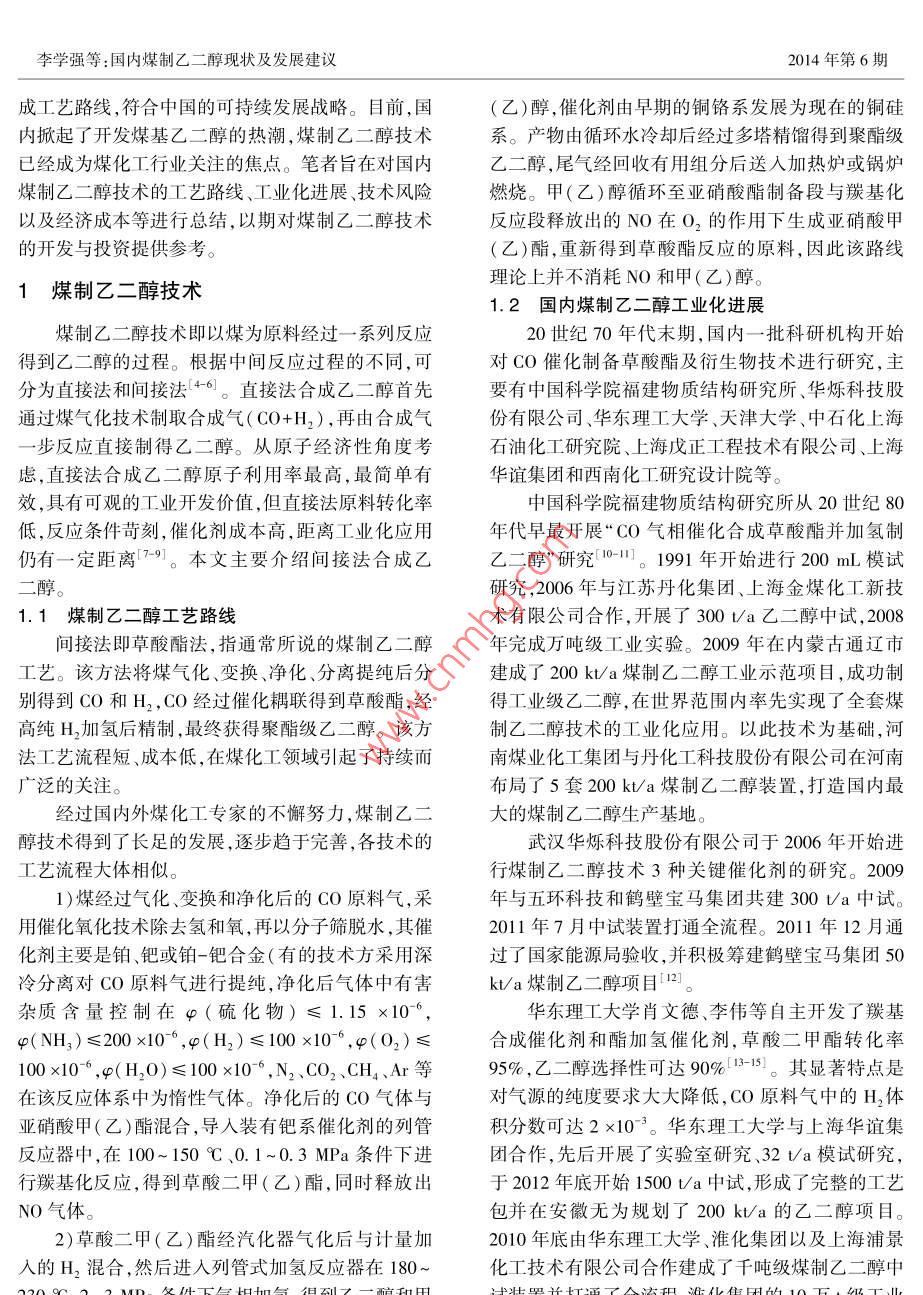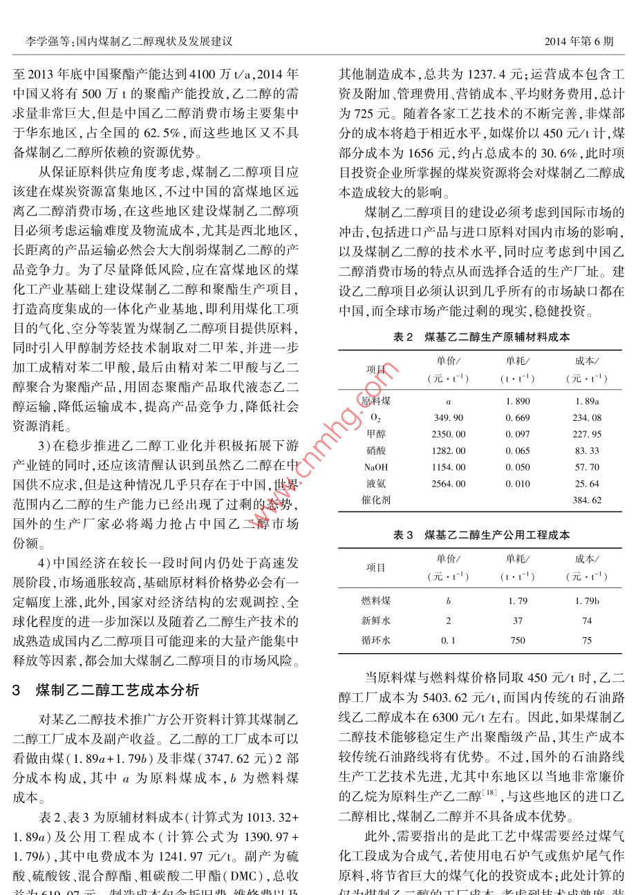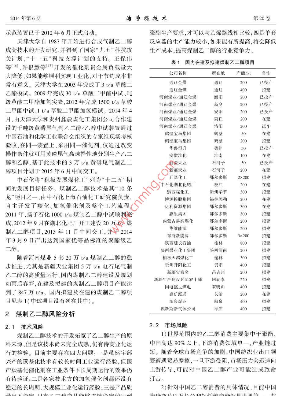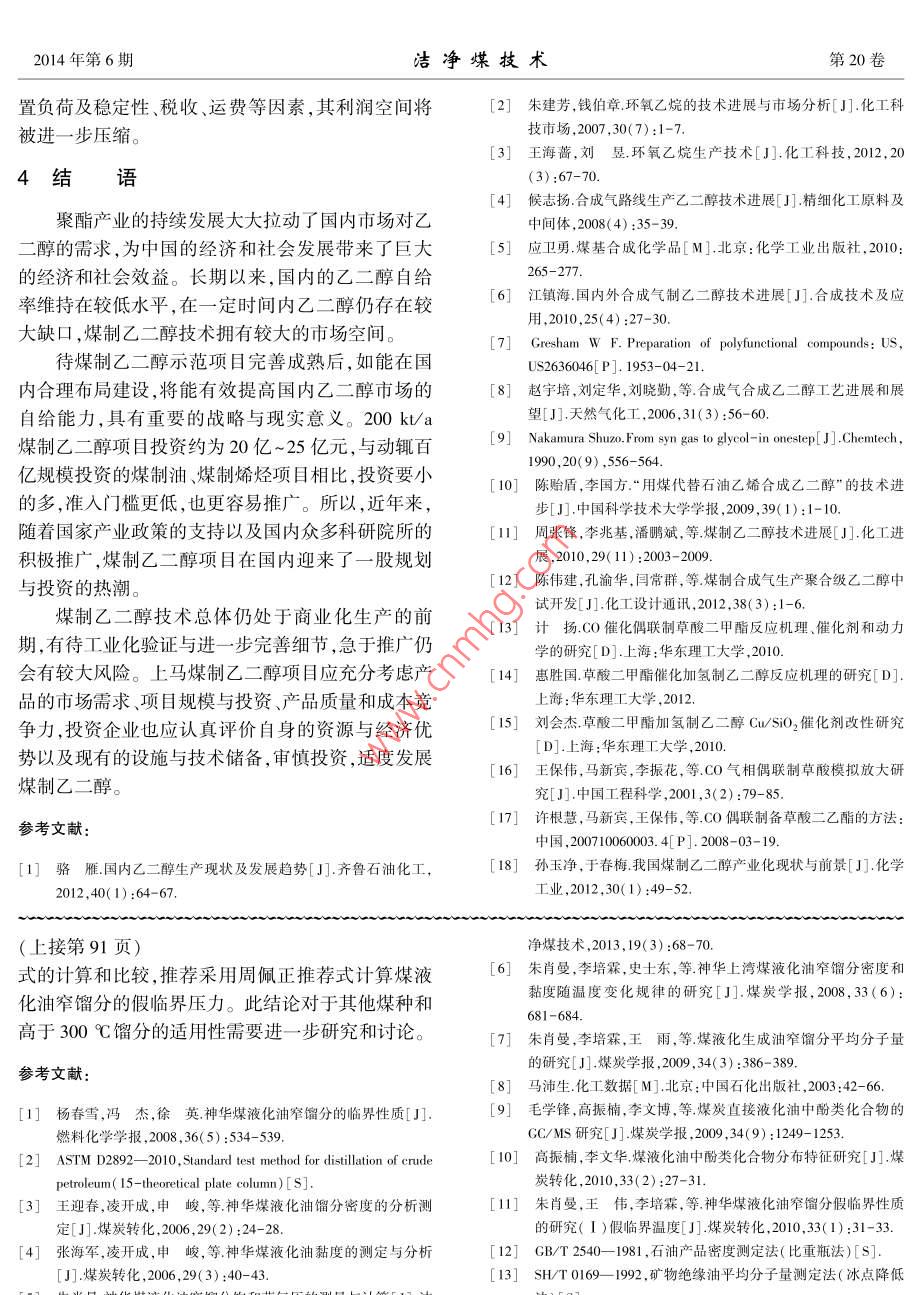 第20卷第6期潔凈煤技術(shù)Vol 20 No 62014年11月Clean Coal Technology國內(nèi)煤制乙二醇現(xiàn)狀及發(fā)展建議李學(xué)強,鄭化安,張生軍,陳靜升,李瑤,苗青,趙鶴翔,張建波(陜西煤業(yè)化工技術(shù)研究院有限責(zé)任公司.陜西西安710065)摘要:為了合理利用煤炭,降低煤制♂二醇風(fēng)險,提高♂二醇產(chǎn)量,介紹了間接法制♂二醇工藝流程。詳細(xì)分析了國內(nèi)煤制♂二醇工業(yè)化進(jìn)展。統(tǒng)計分析了國內(nèi)擬建及在建的煤制♂二醇項目。發(fā)現(xiàn)」煤制廴二醇項目存在催化劑缺少長周期、大規(guī)模運行經(jīng)驗,產(chǎn)品質(zhì)量不穩(wěn)定,單套反應(yīng)器生產(chǎn)能力小產(chǎn)業(yè)鏈過短等技術(shù)及市場風(fēng)險。最后以某煤制乙二醇項目為例,通過成本、收益等的計算,發(fā)現(xiàn)當(dāng)原料煤與燃料煤的單價均為450元/時,煤制乙二醇的成本為5403.62元',傳統(tǒng)的石油制乙二醇成本為6300元/t,因此煤制乙二醇更具有推廣前景關(guān)鍵詞:乙二醇;合成氣;草酸酯;風(fēng)險分析;生產(chǎn)成本中圖分類號:TQ223.162;TD849文獻(xiàn)標(biāo)志碼:A文章編號:1006-672(2014)06-0092-05Development suggestions for coal to ethylene glycol in domesticLI Xueqiang, ZHENG Huaan, ZHANG Shengjun, CHEN Jingsheng, LI YaoMIAo Qing, ZHAO Hexiang, ZHANG JianbShaanxi Coal and Chemical Technology Institute Co., Ltd, Xi'an 710065, China)Abstract: In order to make rational use of coal and reduce the risk of coal to ethylene glycol, meanwhile, increase the ethylene glycol yieldthis paper introduced the technological process of ethylene glycol synthesis by indirect method and its industrialization first, then analyzedthe proposed and under construction coal to ethylene glycol projects at home. There were technological and market risk. At present, therewere no catalysts having long-period and stable operation instance, the products quality varied, the productivity of reactor was low and theindustry chain was short. Taking one coal to ethylene glycol project as research object, the cost and benefits were calculated. If both of peton of feed coal and fuel coal was RMB 450, then the cost of coal to ethylene glycol and traditional oil to ethylene glycol was RMB 5403. 62and 6300 per ton. So the coal to ethylene glycol had good prospectKey words: ethylene glycol; synthetic gas; oxalate ester; risk assessment; production cost0引言中正發(fā)揮著越來越重要的作用。乙二醇的生產(chǎn)工藝路線按原料不同可分為石油路線和非石油路線。在乙二醇是一種重要的大宗基礎(chǔ)有機化工原料,現(xiàn)階段,全球主要的大型乙二醇生產(chǎn)裝置均采用石可用于生產(chǎn)多種化工產(chǎn)品,如聚酯纖維、防凍劑、不油路線,也稱乙烯路線23,即在銀催化劑、甲烷或飽和聚酯樹脂、潤滑劑、增塑劑、非離子表面活性劑、H致穩(wěn)劑、氯化物抑制劑存在下,乙烯直接被O,氧炸藥、涂料和油墨等,應(yīng)用領(lǐng)域非常廣泛。在中國化生成環(huán)氧乙烷,再與水直接或催化條件下反應(yīng)生乙二醇主要作為聚酯及防凍液的原料,其中聚酯消成乙二醇。石油路線經(jīng)過多年的發(fā)展,工藝已趨于費占90%以上,2013年國內(nèi)乙二醇進(jìn)口量825萬t成熟,但耗水量大,生產(chǎn)過程副產(chǎn)物多且生產(chǎn)原料受進(jìn)口依存度高達(dá)70%左右,市場缺口巨大。2014石油價格波動影響較大,無法擺脫對石油資源的依年,國內(nèi)新增聚酯產(chǎn)能預(yù)計達(dá)500萬t,將繼續(xù)拉動賴。因此,結(jié)合中國貧油、少氣和相對富煤的能源結(jié)乙二醇消費量的增長。乙二醇在中國國民經(jīng)濟發(fā)展構(gòu)特點,開發(fā)一條以煤為原料、經(jīng)濟合理的乙二醇合收稿日期:2014-06-06;責(zé)任編輯:宮在芹DOn:10.13226/jisn.1006-6702.2014.06024基金項目:陜西省科技統(tǒng)籌創(chuàng)新工程計劃資助項目(2013KTZB01-04-02)作者簡介:李學(xué)強(1984-),男,河南新鄉(xiāng)人,研發(fā)員,主要從事煤炭清潔轉(zhuǎn)化利用方面的研究。E-mail:linq@sxcctl.com引用格式:李學(xué)強,鄭化安,張生軍,等國內(nèi)煤制乙二醇現(xiàn)狀及發(fā)展建議[J]潔凈煤技術(shù),2014,20(6):92-96LI Xueqiang, ZHENG Huaan, ZHANG Shengjun, et al. Development suggestions for coal to ethylene glycol in domestic[ J ] Clean Coal Technology李學(xué)強等:國內(nèi)煤制乙二醇現(xiàn)狀及發(fā)展建議2014年第6期成工藝路線,符合中國的可持續(xù)發(fā)展戰(zhàn)略。目前,國(乙)醇,催化劑由早期的銅鉻系發(fā)展為現(xiàn)在的銅硅內(nèi)掀起了開發(fā)煤基乙二醇的熱潮,煤制乙二醇技術(shù)系。產(chǎn)物由循環(huán)水冷卻后經(jīng)過多塔精餾得到聚酯級已經(jīng)成為煤化工行業(yè)關(guān)注的焦點。筆者旨在對國內(nèi)乙二醇,尾氣經(jīng)回收有用組分后送人加熱爐或鍋爐煤制乙二醇技術(shù)的工藝路線、工業(yè)化進(jìn)展、技術(shù)風(fēng)險燃燒。甲(乙)醇循環(huán)至亞硝酸酯制備段與羰基化以及經(jīng)濟成本等進(jìn)行總結(jié),以期對煤制乙二醇技術(shù)反應(yīng)段釋放出的NO在O2的作用下生成亞硝酸甲的開發(fā)與投資提供參考。(乙)酯,重新得到草酸酯反應(yīng)的原料,因此該路線煤制乙二醇技術(shù)理論上并不消耗NO和甲(乙)醇。1.2國內(nèi)煤制乙二醇工業(yè)化進(jìn)展煤制乙二醇技術(shù)即以煤為原料經(jīng)過一系列反應(yīng)20世紀(jì)70年代末期,國內(nèi)一批科研機構(gòu)開始得到乙二醇的過程。