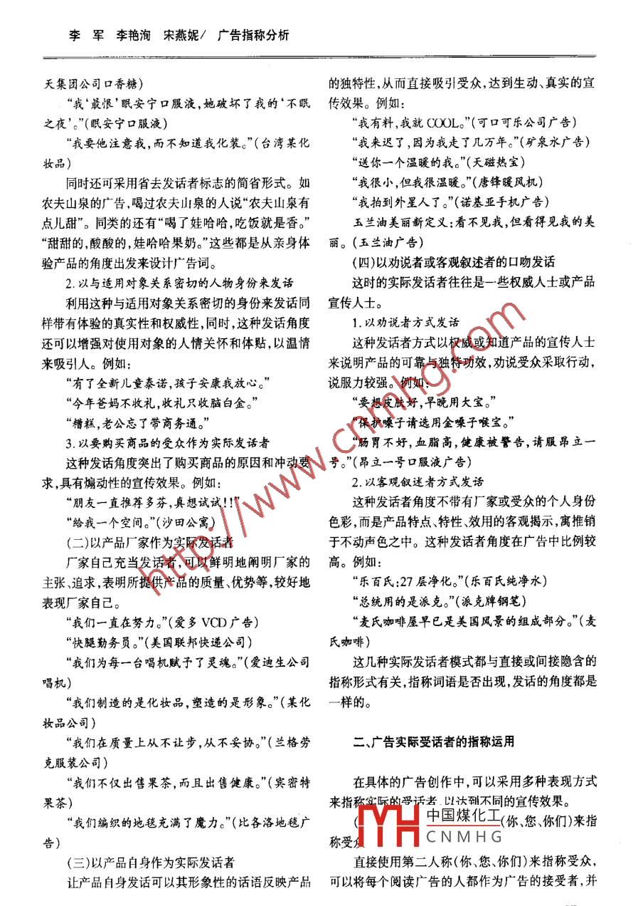 2006年第3期廣西社會(huì)科學(xué)NO.3,2006(總第129期)GUANGXI SOCIAL SCIENCES(Cumulatively,NO. 129)廣告指稱分析李軍'李艷洵',宋燕妮2(1.暨南大學(xué)華文學(xué)院,廣東廣州501632;2.廣 東深圳職業(yè)技術(shù)學(xué)院,廣東深圳518055)[摘要]指稱對(duì)象的確定是廣 告吸引受眾、有針對(duì)性地?cái)U(kuò)大宣傳效果的重要因素。如何成功地指示指稱對(duì)象,以達(dá)到更好的指稱效果,是廣告制作者需要認(rèn)真考慮的語(yǔ)用問題。在實(shí)際發(fā)語(yǔ)者與指稱運(yùn)用、實(shí)際受話者與指稱運(yùn)用及時(shí)空指稱形式三個(gè)方面,指稱對(duì)廣告均具有受眾定位及吸引受眾的作用。[關(guān)鍵詞]指稱實(shí)際發(fā)話者 實(shí)際受話者 即時(shí)性即地性[中圖分類號(hào)] H030 [文獻(xiàn)標(biāo)識(shí)碼] A [文章編號(hào)] 1004 - 6917(2006)03 -0156 -04指稱對(duì)象的確定是廣告吸引受眾、有針對(duì)性地是幫 助產(chǎn)品做宣傳的人;意圖接受者是商品針對(duì)的擴(kuò)大宣傳效果的重要因素。如何成功地指示指稱對(duì)對(duì)象 ;實(shí)際接受者則是閱讀廣告的人。象,以達(dá)到更好的指稱效果,是廣告制作者需要認(rèn)真筆者認(rèn)為,廣告交際中的意圖發(fā)話者與意圖接考慮的語(yǔ)用問題。這種指稱既可以利用語(yǔ)用學(xué)所關(guān)受者很簡(jiǎn)單,或者說是特定的,其更多地涉及到商家注的指示詞語(yǔ),以說話人及所處的現(xiàn)時(shí)現(xiàn)地為參照,對(duì)自 己產(chǎn)品的定位問題。廣告交際的巧妙性著重體達(dá)到拉近交際距離,增強(qiáng)近親感和現(xiàn)場(chǎng)感的語(yǔ)用目現(xiàn)在實(shí)際發(fā)話者 與實(shí)際接受者之間的關(guān)系。廣告成的,也可以采用泛指等擴(kuò)大范圍的表達(dá)方式,在具體功的秘訣之一 就在于實(shí)際發(fā)話者如何確定和如何發(fā)化受眾的同時(shí)擴(kuò)大指稱對(duì)象。以下從三個(gè)方面來分話才能讓每 個(gè)實(shí)際接受者的交際地位都得到確認(rèn),析廣告中指稱策略的運(yùn)用。.才能更好地發(fā)揮廣告宣傳的效果。根據(jù)對(duì)中外大量?jī)?yōu)秀廣告的分析,廣告中實(shí)際發(fā)話者的表現(xiàn)形式主一、廣告實(shí)際發(fā)話者模式與指稱運(yùn)用要有如下一些類型:(一)以接受產(chǎn)品的受眾作為實(shí)際發(fā)話者現(xiàn)代廣告是- -種商家與受眾之間的交際?,F(xiàn)實(shí)產(chǎn)品的接受對(duì)象是商品的使用者和體驗(yàn)者,以生活中的交際包括說聽兩方,說話者是信息的發(fā)出接受產(chǎn)品的受眾作為 發(fā)話者,從受眾的角度來宣傳者,聽話者是信息的接收者。而廣告交際則要復(fù)雜產(chǎn)品 ,可以增強(qiáng)對(duì)產(chǎn)品功效和作用的推銷效果。這得多。因?yàn)橥粍t廣告面對(duì)的是無數(shù)個(gè)有思想有意在具體廣 告創(chuàng)作中可以從以下角度著手:識(shí)的受眾,所以,如何對(duì)這些受眾的交際地位進(jìn)行定1.以實(shí)際使用產(chǎn)品的受眾作為實(shí)際發(fā)話者位,如何與之交流就決定了廣告交際的成敗。黃國(guó)這種發(fā)話形式可從親身體驗(yàn)者的角度揭示產(chǎn)品文先生在他的《廣告語(yǔ)篇分析》中指出廣告的交際包的特 點(diǎn)和好處,增強(qiáng)產(chǎn)品宣傳的真實(shí)性,激發(fā)消費(fèi)者括四方:意圖發(fā)話者、實(shí)際發(fā)話者、意圖接受者、實(shí)際的購(gòu)買欲望。例如:接受者。他認(rèn)為,制作廣告的商家是意圖發(fā)話者,其“我沒穿上斯庫(kù)大夫鞋之前,總以為當(dāng)護(hù)士,腳意圖非常明確,就是讓受眾購(gòu)買其商品或記住其企疼是天經(jīng)地義的事?!?斯庫(kù)大夫鞋)業(yè);實(shí)際發(fā)話者是廣告中應(yīng)用的具體的發(fā)話人,也就“我沿機(jī)到日本也有這么棒的口香糖?!?日本樂中國(guó)煤化工[收稿日期]2005-11-14YHCNMHG[作者簡(jiǎn)介]李軍(1966 -),男,湖南岳陽(yáng)人暨南大學(xué)華文學(xué)院教授,博士;李艷洵(1980-),女,湖南瀏陽(yáng)人,暨南大學(xué)華文學(xué)院碩士研究生。月務(wù)數(shù)據(jù)李軍李艷洵宋燕妮/廣告指稱分析天集團(tuán)公司口香糖)的獨(dú)特性,從而直接吸引受眾,達(dá)到生動(dòng)、真實(shí)的宣“我‘最恨’眠安寧口服液,她破壞了我的‘不眠傳效果。 例如:之夜’?!?眠安寧口服液)“我有料,我就COOL."(可口可樂公司廣告)“我要他注意我,而不知道我化裝?!?臺(tái)灣某化“我來遲了,因?yàn)槲易吡藥兹f年?!?礦泉水廣告)妝品“送你-一個(gè)溫暖的我?!?天磁熱寶)同時(shí)還可采用省去發(fā)話者標(biāo)志的簡(jiǎn)省形式。如“我很小,但我很溫暖。”(唐鋒暖風(fēng)機(jī))農(nóng)夫山泉的廣告,喝過農(nóng)夫山泉的人說“農(nóng)夫山泉有“我拍到外星人了?!?諾基亞手機(jī)廣告)點(diǎn)兒甜”。同類的還有“喝了娃哈哈,吃飯就是香?!庇裉m油美麗新定義:看不見我,但看得見我的美“甜甜的,酸酸的,娃哈哈果奶?!边@些都是從親身體麗。 (玉蘭油廣告)驗(yàn)產(chǎn)品的角度出發(fā)來設(shè)計(jì)廣告詞。(四)以勸說者或客觀敘述者的口吻發(fā)話2.以與適用對(duì)象關(guān)系密切的人物身份來發(fā)話這時(shí)的實(shí)際發(fā)話者往往是一些權(quán)威人士或產(chǎn)品利用這種與適用對(duì)象關(guān)系密切的身份來發(fā)話同宣傳人士