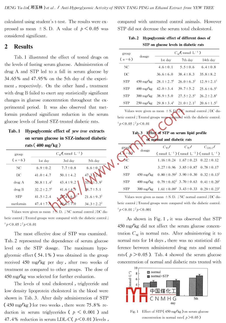 Journal of Beijing Institute of Technology 2005, Vol. 14, No. 3Anti-Hyperglycemic Activity of Shan Tang Ping anEthanol extract from yew tree in diabetic ratsDENG YU-lid(鄧玉林), SHENG Ling-huk盛靈慧), DAI Rongⅸ戴榮繼),XU Xiao-yu(徐曉玉)School of Life Science and Technology Beijing Institute of Technology Beijing 100081, ChinaAbstract: The extracts of yew tree have showed unique anti-tumor and anti-leakematic activities. Taxol ex-tracted from it is effective against a variety of cancers such as ovarian cancer and breast cancer. However thehypoglycemic efficacy of the extract has not been reported yet so the effects of oral administration of yew treextracts on streptozotocin- induced diabetic rats were examined. Administration of shan tang ping( StP),afraction from the column separation of extract(450 mg/kg body weight), for 14 days reduced the serum glucose concentrations of fasted diabetic rats by 52. 4%. In addition, it also decreased the concentrations ofglyceride(Tg), total cholesterol( TC), and low density lipoprotein cholesterol LDL-C ). An oral glucosetolerance test(OGTT)was performed a significant improvement in glucose tolerance was observed in ratstreated with STP. These results suggest that STP has hypoglycemic properties and hypolipidemic action onstreptozotocin-induced diabetic ratsKey words: Jew tree streptozotocin hypoglycemic diabetes mellitusCLC number: R 965 Document code: A Article ID: 1004-057 2005 03-0323-05Diabetes mellitus is a multifactorial disease char- have shown unique anti-tumor and anti-leakematic ac-acterized by hyperglycemia and lipirotein abnormali- tivitieoweverthere is no report available in theties. According to WHo projections the prevalence literature for the anti-diabetic effect of jew tree exof diabetes is likely to increase by 35%,so it will tract. The present study is undertaken to investigatehave been to reach 300 million or more by the year the effect of shan tang ping StP ), an extract of20251. Although there are many drugs managing ew tree, on changes in serum glucose, serum lipiddiabetes they are either expensive( like insulin thia- profile oral glucose tolerance of strepozotocin-inducedzolidinediones )or having adverse effects like sulfonylureas ) Plant drugs are frequently considered toI Materials and methodsbe less toxic and side effects than synthetic ones. Insome countries many traditional practice medicinalThe leaves of vewe tree were obtained from Anplants are used to control diabetes mellitus]hui province in November 2002. The botanical idenAmong the natural plants, jew tree( taxaceae) tity was confirmed by Dr Deng Yu-lin. a dried specihas been used as a cure for cough rheumatism and men was stored in the Lab of Life science and Techintestines verminosis in the ancient times in China. In nology. Streptozotocin( stz) was obstained fromCompany Inc., St Louis, MOChen"and Ben Cao gang, etc. yew tree wasrecorded as a novel medical plant. The extracts of it frorH中國(guó)煤化tic kits were purchasedCNMHGroject High-TechnologyReceived 2004-03-22Sponsored by the National Natural Science Foundation( 20275005 30170336)BiographyDENGYu-linf1962-)professordoctoraladviserdeng(@bit.edu.cnJournal of Beijing Institute of Technology 2005, Vol. 14, No. 3Company Beijing China ) All other chemicals used group 3: diabetic rats STP 400 mg/kgfor this experiment were of analytical gradegroup 4: diabetic rats drug A 400 mg/kg i1.1 Preparation of Plant Extractsgroup 5: diabetic rats drug b 400 mg/kgThe air-dried leaves of yew tree were ground togroup 6: diabetic rats metformin 80 mg/kgAnimals were administeredThe homogenate was extracted with 95% glucose concentration was determined 2 h after theethanol. The solution was concentrated to dryness treatment on the lst 3rd and 5th day. The depenunder reduced pressure at 70 C yielding dark-brown dence of the anti-hyperglycemic effect on Stp dosageextracts, which is used as drug A. Subsequently the was further investigated. Diabetic rats were treatedextracts were subject to stepwise procedures for con- with different dosage of StP, and the treatment lastcentrating the active components. The crude extracts ed for 14 days. The effect of stp on glucose homewere defatted with petroleum and followed by the stasis was studied using normal rats. Twelveextraction with chloroform. The chloroform extracts wistar rats were divided into normal and StP groupswere further separated by the silica-parked column, For the drug-supplemented group, 450 mg/kg bodyand eluted with ethyl acetate/ethanol(9: 1 ). The weight of StP was given for five daysfraction 2, 3 and 4 were pooled as stP, and the frac- 1.5 Estimation of Lipid Profiletion 5, 6 and 7 were merged as drug bThe diabetic groups were fed with 600, 450 and1.2 Animals300 mg/kg of StP for two weeks respectively. TotalAdult female wistar rats( 150-180 g )were used cholesterol TC), low density lipoprotein cholesteroin the experiment. Rats were kept and maintained LDL-C)and triglyceride( tg )were examined on fiunder laboratory conditions 12 h day/dark cycle. Be- nal days for each group to study the hypolipidemic effore injection the animals were allowed to acclimatize fect. tc was determined using a commercial enzy-for four days while being maintained on regular com- matic kit based on CHOD-PAP method 41; LDL-Cmercial rat diet and water ad libitumwas estimated using a commercial enzymatic kit by1.3 Preparation of Diabetic Animal Modelpolyethene sulfuric precipitation method5]; Serumrats were treated with STz TC concentration was measured using a commercialat a dosage of 80intraperitoneal injectionenzymatic kit based on a modification of the lipase-The STz was freshly dissolved in citrate buffer glycerol phosphate oxidase method 6)(0.01 mol, pH 4. 5) and kept on ice prior to use. 1.6 Oral Glucose Tolerance TestThe injection volume was 2 mL/kg. Control rats re-Normal and STz-diabetic rats were fastedceived the buffer as placebo. On the third day after overnight water a