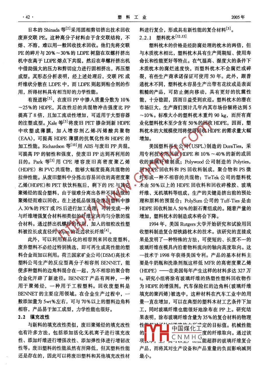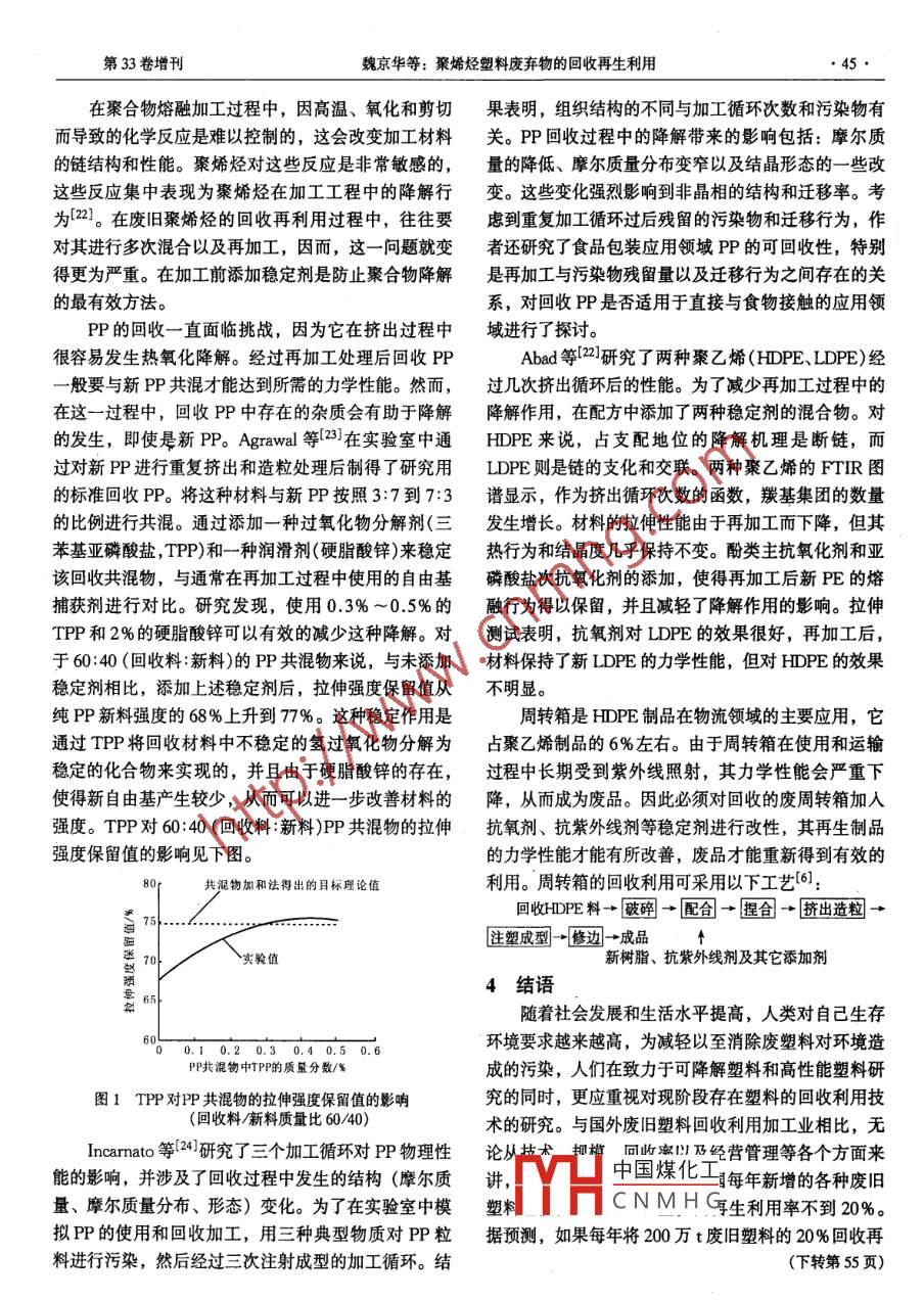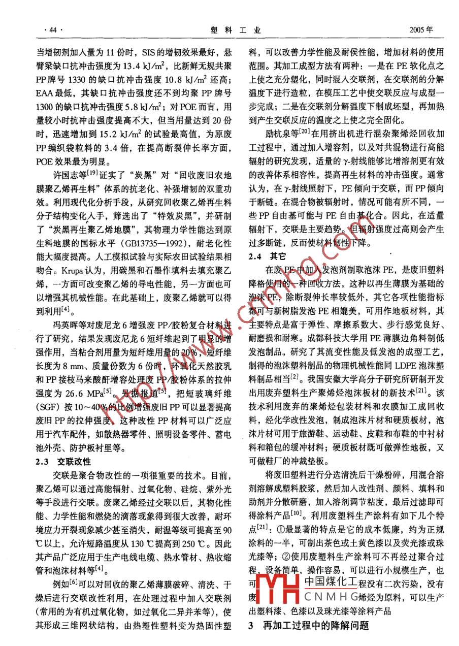 塑料工業(yè)第33卷增刊CHINA PLASTICS INDUSTRY2005年5月聚烯烴塑料廢棄物的回收再生利用魏京華(中石化北京化工研究院,北京100013)摘要:綜述了聚烯烴廢塑料的回收再生利用現(xiàn)狀,重點(diǎn)介紹了聚烯烴廢塑料的改性再生利用,列舉了近期國內(nèi)外的主要研究成果。與新塑料相比,廢塑料的力學(xué)性能下降較大,不宜制作高檔次的制品。為了改善其基本力學(xué)性能滿足制品的質(zhì)量要求,可以采取各種改性方法對(duì)其進(jìn)行改性以達(dá)到或超過原塑料制品的性能。改性的方法主要包括塑料合金化、填充改性以及交聯(lián)改性等。對(duì)聚烯烴廢塑料的回收再生利用過程中存在的降解問題進(jìn)行了探討,指出在加工前添加穩(wěn)定劑是防止聚合物降解的最有效方法。關(guān)鍵詞:聚烯烴;廢塑料;回收再生利用;改性Recycling of polyolefin plastics WasteWEI Jing-hua(Sinopec Beijing Research Institute of Chemical Industry, Beijing 100013, China)Abstract: The present status of the recycling of polyolefin plastics waste is summarized, putting thestress on the modification recycling of the waste. The main research reports on the recycling in recent yearsare listed. Compared with new plastics, the mechanical properties of the waste are in low level, therefore thewaste is not suitable to made into high-level products. In order to improve the basic mechanical propertiesand meet the requirement of the product, different modifications, such as plastic alloying, filling andcrosslinking, could be applied to the recycling of the waste. the degradation of waste in recycling process isalso discussed, and it is pointed out that the addition of stabilizers before processing is the most effective wayto protect against polymer degradationKeywords: Polyolefin; Plastics Waste; Recycling; Modification廢舊塑料的回收利用技術(shù)主要可歸納為三類,即特別的重視回收再生利用技術(shù)、化學(xué)裂解回收技術(shù)以及焚燒回收塑料的品種較多,它們的生產(chǎn)原料不同,廢棄物能源技術(shù),其中回收再生利用技術(shù)是指將回收的塑料降解后的產(chǎn)物也不同,不同雜質(zhì)的混人對(duì)回收再生后制品經(jīng)鑒別、分類、清洗、破碎或溶解、熔融后,直的性能影響也不一樣,各種塑料的物化特性差異及不接加工成型,或者經(jīng)過機(jī)械共混或化學(xué)改性后,再加相容性,使回收后的混合物的加工性能受到較大影工成型(1。由于廢塑料的回收再生利用能夠?qū)⒐I(yè)垃響。為了提高回收產(chǎn)品的利用價(jià)值,最好先將收集的圾變成極有價(jià)值的工業(yè)生產(chǎn)原料,實(shí)現(xiàn)了資源再生循廢舊塑料分類篩選,然后根據(jù)不同的材料和不同的要環(huán)利用,具有不可忽略的潛在意義。目前世界各國對(duì)求,采用不同的回收利用技術(shù)加以處理。在過去的20廢塑料的回收再生利用方法都很關(guān)注和支持,并且予年中,廢塑料的分類分離主要集中在PE、PP、PVC以高度評(píng)價(jià)。在工業(yè)發(fā)達(dá)國家的固體廢棄物中,廢塑和PS以及PET等5種主要塑料上2l國外已開發(fā)出料約占4%~10%(質(zhì)量分?jǐn)?shù))或10%~20%(體積計(jì)算機(jī)自動(dòng)分選系統(tǒng),實(shí)現(xiàn)分選過程的連續(xù)自動(dòng)化。分?jǐn)?shù)),而這當(dāng)中聚烯烴(主要是PE和PP)占有相我國仍以最原始的人工挑選方法為主,效率低、勞動(dòng)當(dāng)大的比例(超過70%),加之其回收利用價(jià)值高、強(qiáng)立k出廠時(shí)打印上供識(shí)別的代耐老化性較好等特點(diǎn),近年來聚烯烴的回收利用受到號(hào)中國煤化工制度,能夠?qū)θ斯し诌xCNMHG作者簡介:魏京華,女,1975年生,碩士,工程師,主要從事石油化工領(lǐng)域的專題調(diào)研以及信息資料的搜集整理工作。weijinghua @brici ac cno第33卷增刊魏京華等:聚烯烴塑料廢棄物的回收再生利用41·帶來較大幫助以采取各種改性方法對(duì)廢舊塑料進(jìn)行改性以達(dá)到或超廢塑料的回收再生利用可分為直接再生利用和改過原塑料制品的性能。改性利用的方法主要包括塑料性再生利用兩大類。直接再生利用是指將回收的廢舊合金化、填充改性(包括添加活化無機(jī)離子進(jìn)行填充塑料制品經(jīng)過分類、清洗、破碎、造粒后直接加工成改性、添加纖維進(jìn)行增強(qiáng)改性添加彈性體進(jìn)行增韌改型。改性再生利用是指將再生料通過物理或化學(xué)方法性等)以及交聯(lián)改性等6。對(duì)廢舊塑料的改性再生利改性后(如復(fù)合、增強(qiáng)、接枝)再加工成型。經(jīng)過改性的用很有發(fā)展前景,越來越受到人們的重視5。再生塑料,其機(jī)械性能得到改善或提高,可用于制作2.1塑料合金化檔次較高的塑料制品3。這種回收技術(shù)主要是將廢舊塑料與其它塑料共直接再生利用混,制成塑料合金,來提高廢舊塑料的力學(xué)性能,從廢舊塑料的再生利用是不需要進(jìn)行各種改性,而而生產(chǎn)出有用的制品。在實(shí)際應(yīng)用中,主要是與相對(duì)直接將廢舊塑料經(jīng)過清洗、塑化加工成型或與其它物分子質(zhì)量較高或鍵結(jié)構(gòu)規(guī)整度較好的同類新樹脂進(jìn)行質(zhì)經(jīng)過簡單加工制成有用的制品。廢舊塑料的這種直共混2。其關(guān)鍵在于提高共混物之間的相容性,改善接再生制品已經(jīng)廣泛應(yīng)用于農(nóng)業(yè)、漁業(yè)、建筑業(yè)、工由于各相之間差的界面粘接力