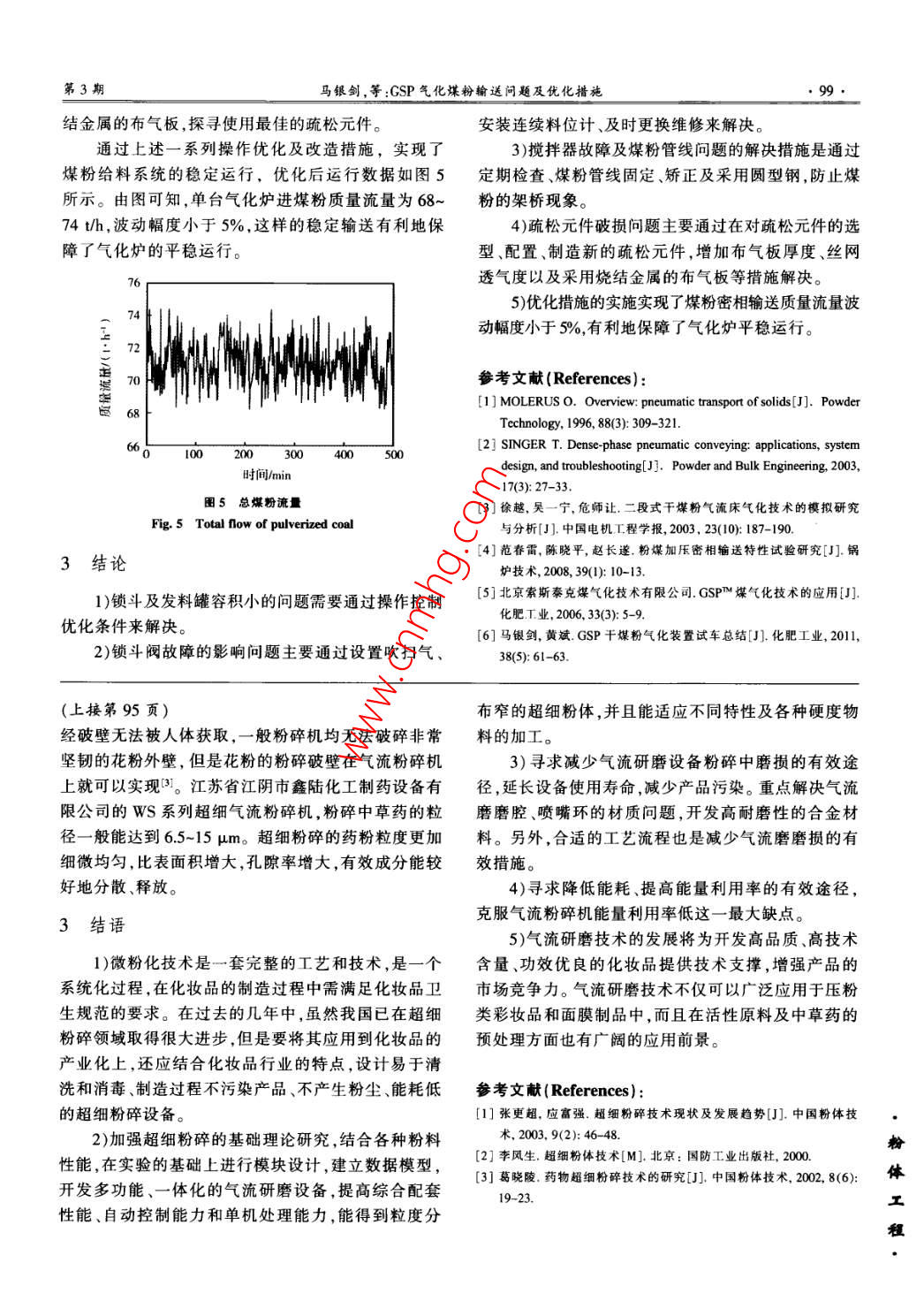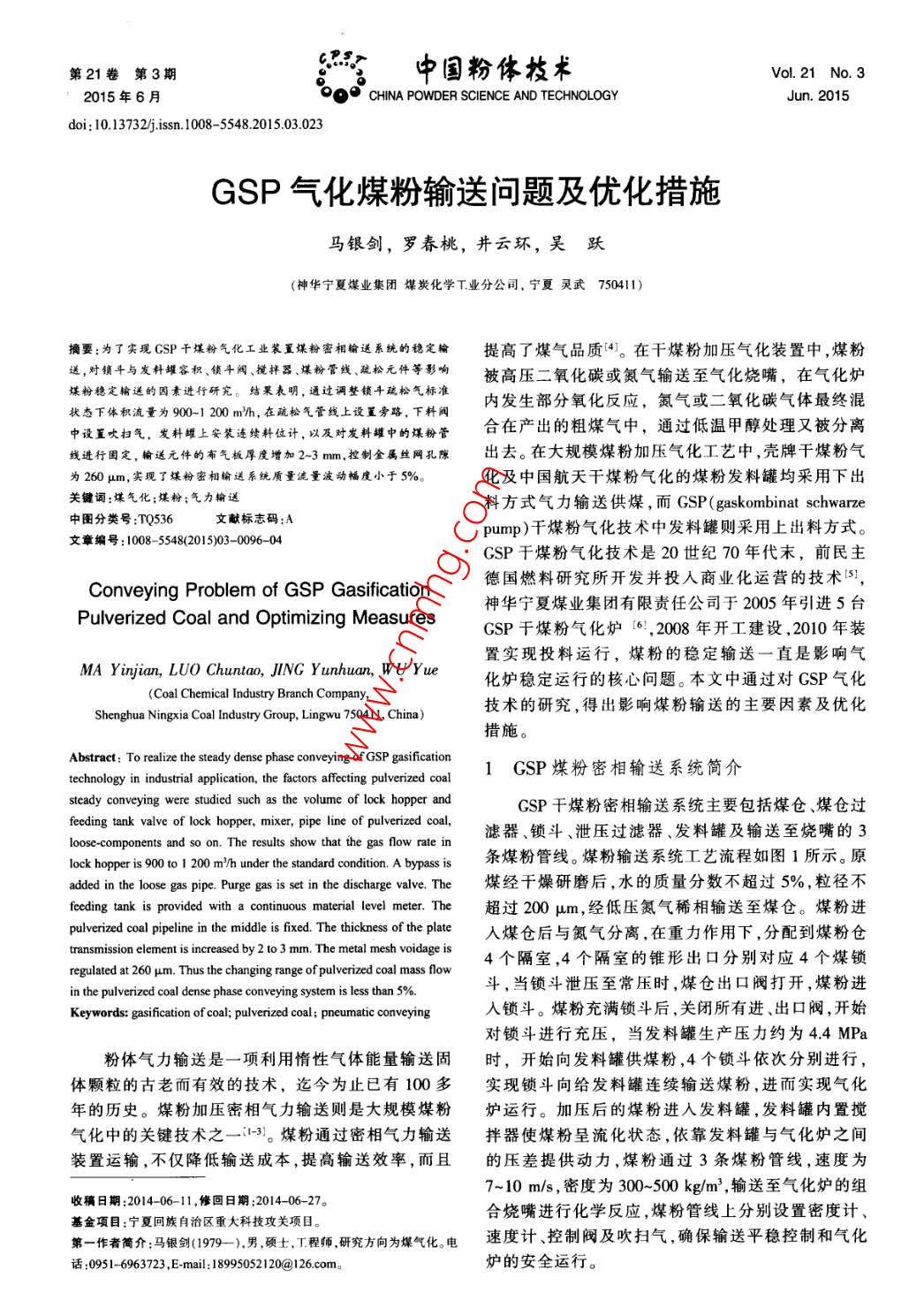第21卷第3期中國粉體技術(shù) Vol. 21 No.32015年6月 CHINA POWDER SCIENCE AND TECHNOLOGYjun.2015oi:0.2i.0-5482015.03.023GSP氣化煤粉輸送問題及優(yōu)化措施馬銀劍,羅春桃,井云環(huán),吳躍(神華寧夏煤業(yè)集團(tuán)煤炭化學(xué)T業(yè)分公司,寧夏靈武750411)摘要為了實(shí)現(xiàn)S干煤粉氣化工業(yè)裝置煤粉密相送系統(tǒng)的穩(wěn)定輸提高了煤氣品質(zhì)41。在干煤粉加壓氣化裝置中,煤粉送,對(duì)鎖斗與發(fā)料罐容積、鎖斗閥、攪拌器、煤粉管線、疏松元件等影響被高壓二氧化碳或氮?dú)廨斔椭翚饣療?在氣化爐煤粉穩(wěn)定輸送的因素進(jìn)行研究結(jié)果表明,通過調(diào)整鎖斗疏松氣標(biāo)準(zhǔn)內(nèi)發(fā)生部分氧化反應(yīng),氮?dú)饣蚨趸細(xì)怏w最終混狀態(tài)下體積流量為900-1200m3h,在疏松氣管線上設(shè)置旁路,下料潤中設(shè)置吹掃氣,發(fā)料罐上安裝連續(xù)料位計(jì),以及對(duì)發(fā)料罐中的煤粉管合在產(chǎn)出的粗煤氣中,通過低溫甲醇處理又被分離線進(jìn)行固定,輸?shù)?,控制金屬絲網(wǎng)孔隙出去。在大規(guī)模煤粉加壓氣化工藝中殼牌干煤粉氣輸送 -3mm元件的布?xì)獍搴穸仍黾?~3為260μm,實(shí)現(xiàn)了煤粉密相輸送系統(tǒng)質(zhì)量流量波動(dòng)度小于5%化及中國航天干煤粉氣化的煤粉發(fā)料罐均采用下出關(guān)鍵詞:煤氣化;煤粉;氣力輸送料方式氣力輸送供煤,而GSP( gaskombinat schwarze中圖分類號(hào):TQ536文獻(xiàn)標(biāo)志碼:A文章編號(hào):1008-5548(2015)03-0096-04pump)干煤粉氣化技術(shù)中發(fā)料罐則采用上出料方式。GSP干煤粉氣化技術(shù)是20世紀(jì)70年代末,前民主 Conveying Problem of GSP Gasification德國燃料研究所開發(fā)并投入商業(yè)化運(yùn)營的技術(shù)51,神華寧夏煤業(yè)集團(tuán)有限責(zé)任公司于2005年引進(jìn)5臺(tái) Pulverized Coal and Optimizing MeasuresGSP干煤粉氣化爐【6,2008年開工建設(shè),2010年裝置實(shí)現(xiàn)投料運(yùn)行,煤粉的穩(wěn)定輸送一直是影響氣 MA Yinjian, LUO Chuntao, JING Yunhuan, WU Yue化爐穩(wěn)定運(yùn)行的核心問題。本文中通過對(duì)GSP氣化 (Coal Chemical Industry Branch Company, Shenghua Ningxia Coal Industry Group, Lingwu 750411, China)技術(shù)的研究,得出影響煤粉輸送的主要因素及優(yōu)化措施。 Abstract: To realize the steady dense phase conveying of GSP gasification technology in industrial application, the factors affecting pulverized coal1GSP煤粉密相輸送系統(tǒng)簡介 steady conveying were studied such as the volume of lock hopper andGSP干煤粉密相輸送系統(tǒng)主要包括煤倉、煤倉過 feeding tank ock hopper, mixer, pipe line of pulverized coal, show that the gas flow rate in濾器、鎖斗、泄壓過濾器、發(fā)料罐及輸送至燒嘴的3 loose-co lock hopper is 900 to 1 200 m er the standard condition bypass is條煤粉管線。煤粉輸送系統(tǒng)工藝流程如圖1所示。原 added in the loose gas pipe Purge gas is set in the discharge valve.the煤經(jīng)干燥研磨后,水的質(zhì)量分?jǐn)?shù)不超過5%,粒徑不 feeding tank is provided with continuous material level meter The超過200m,經(jīng)低壓氮?dú)庀∠噍斔椭撩簜}。煤粉進(jìn) pulverized coal pipeline in the middle is fixed. The thickness of the plate nemi入煤倉后與氮?dú)夥蛛x,在重力作用下,分配到煤粉倉 transmission element is increased by to mm. The meta mesh4個(gè)隔室,4個(gè)隔室的錐形出口分別對(duì)應(yīng)4個(gè)煤鎖 regulated at 260 um. Thus the changing range of pulverized coal mass flow in the pulverized coal dense phase conveying system is less than 5%.斗,當(dāng)鎖斗泄壓至常壓時(shí),煤倉出口閥打開,煤粉進(jìn) Keywords: gasification of coal; pulverized coal; pneumatic conveying入鎖斗。煤粉充滿鎖斗后,關(guān)閉所有進(jìn)、出口閥,開始對(duì)鎖斗進(jìn)行充壓,當(dāng)發(fā)料罐生產(chǎn)壓力約為4.4MPa粉體氣力輸送是一項(xiàng)利用惰性氣體能量輸送固時(shí),開始向發(fā)料罐供煤粉,4個(gè)鎖斗依次分別進(jìn)行,體顆粒的古老而有效的技術(shù),迄今為止已有00多實(shí)現(xiàn)鎖斗向給發(fā)料罐連續(xù)輸送煤粉,進(jìn)而實(shí)現(xiàn)氣化年的歷史。煤粉加壓密相氣力輸送則是大規(guī)模煤粉爐運(yùn)行。加壓后的煤粉進(jìn)入發(fā)料罐,發(fā)料罐內(nèi)置攪氣化中的關(guān)鍵技術(shù)之1-31。煤粉通過密相氣力輸送拌器使煤粉呈流化狀態(tài),依靠發(fā)料罐與氣化爐之間裝置運(yùn)輸,不僅降低輸送成本,提高輸送效率,而且的壓差提供動(dòng)力,煤粉通過3條煤粉管線,速度為7~10m/s,密度為300~500kg/m3,輸送至氣化爐的組收稿日期:2014-06-11修回日期:2014-06-27合燒嘴進(jìn)行化學(xué)反應(yīng),煤粉管線上分別設(shè)置密度計(jì)、基金項(xiàng)目:寧夏回族自治區(qū)重大科技攻關(guān)項(xiàng)目。第一作者簡:馬銀(19),硬士,工程師,研究方向?yàn)槊簹饣娝俣扔?jì)、控制閥及吹掃氣,確保輸送平穩(wěn)控制和氣化話:0951-6963723,-mai:18995052120@126.com爐的安全運(yùn)行。第3期馬銀劍,等:GSP氣化煤粉輸送問題及優(yōu)化措施97氮?dú)庵幸粔毫σ?一質(zhì)量流量76過濾器煤粉7并聯(lián)鎖斗煤倉7068去鎖斗泄壓50100150200250300350660100150二氧化碳時(shí)間/min斗圖2鎖斗壓力對(duì)煤粉流量的影響煤粉去燒嘴 Fig. 2 Effect of lock hopper pressure on pulverized coal flow發(fā)二氧化碳料料發(fā)完,鎖斗個(gè)數(shù)減少,動(dòng)作時(shí)間延