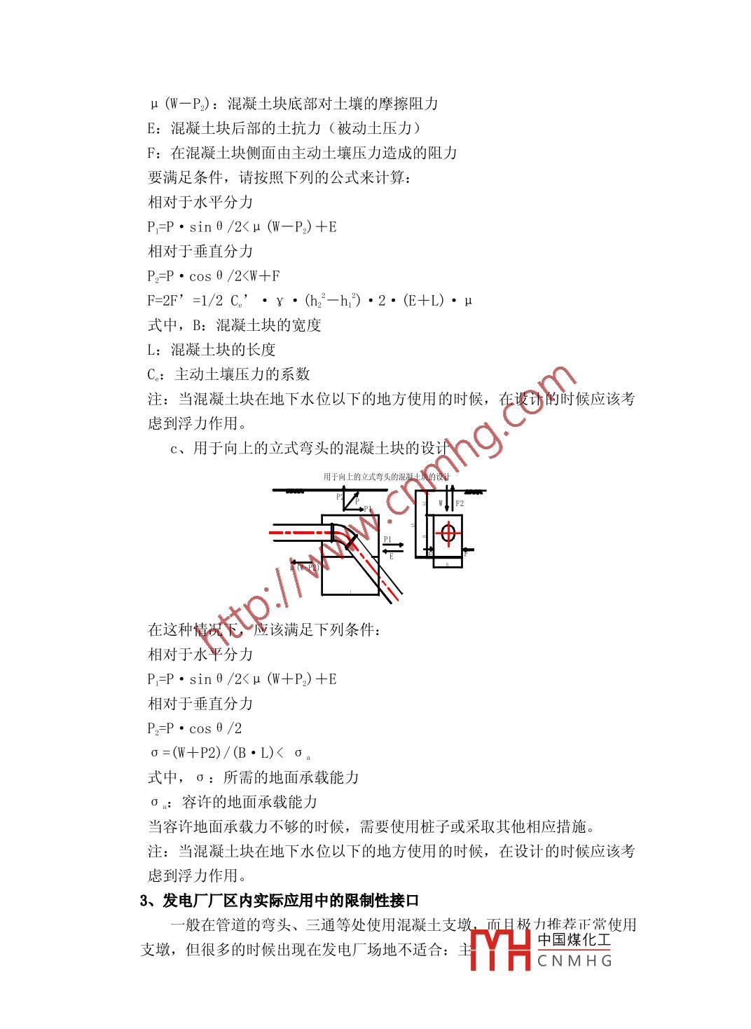 大口徑球墨鑄鐵管應(yīng)用于火力發(fā)電廠循環(huán)水系統(tǒng)技術(shù)初探.1史俊龍2祁虎生(1中新聯(lián)進(jìn)出口有限公司) (2 新興鑄管股份有限公司)摘要:火力發(fā)電廠蒸汽機組循環(huán)水管道安全性能要求高,維修及改造困難,且費用高昂。因此循環(huán)水管道的選材問題會直接影響到電廠機組本身供水系統(tǒng)的安全可靠性及工程的整體投資。本文從大口徑球墨鑄鐵管的工作原理、機械性能、設(shè)計、應(yīng)用等幾個方面較全面地論證了大口徑球墨鑄鐵管在火力發(fā)電廠蒸汽機組循環(huán)水管道中實際優(yōu)勢并提出在此領(lǐng)域應(yīng)用的重要意義。關(guān)鍵詞:大口徑循環(huán)水管道安裝 經(jīng)濟技術(shù)引言火力發(fā)電廠蒸汽機組循環(huán)水管道安全性能要求高,維修及改造困難,且費用高昂。因此循環(huán)水管道的選材問題會直接影響到電廠機組本身供水系統(tǒng)的安全可靠性及工程的整體投資。近幾年來,各大、中型火力發(fā)電廠600MW以下機組的循環(huán)水管道一般選用鋼套筒混凝土管(PCCP) 做為最佳的輸水管材。規(guī)格為DN1800---3000。鋼套筒混凝土管主要具備以下特點:承壓能力較高,具備較強的抵抗外部荷載能力。2、柔性接口連接,能滿足不同地質(zhì)條件的要求。3、造價低廉,材料各地易購,并具有較長的使用壽命。行業(yè)內(nèi)部技術(shù)成熟,施工工藝簡單。但是,隨著當(dāng)前人類水資源的嚴(yán)重匱乏和對環(huán)保的重視,凈水將不再應(yīng)用于電廠的循環(huán)水系統(tǒng),絕大多數(shù)的工程中已逐步推廣使用污水處理廠的中水,中水在電廠內(nèi)經(jīng)加酸、緩蝕劑及阻垢劑后補充至循環(huán)水系統(tǒng),循環(huán)水的經(jīng)電廠內(nèi)的加工處理,水質(zhì)指標(biāo)發(fā)生了明顯的變化,具體指標(biāo)如下:硫酸根: 680- 1620mg/L氯離子: 221-500mg/L溶解固形物: 1295-2420mg/LPH:7.2- -7.8-一、大口徑球墨鑄鐵管的主要工作原理DN1600以上的大口徑球墨鑄鐵管的連接方式推薦采用K型接口,這種接口是由球墨鑄鐵管、壓蘭、膠圈及螺栓組成的機械接口,具有-定的柔性,能偏轉(zhuǎn).一定的角度。 當(dāng)壓蘭的前部將膠圈壓緊時,膠圈受到擠壓變形。這種變形在膠圈上引起初始應(yīng)力(Po)。 當(dāng)施加內(nèi)壓時,膠圈的應(yīng)力也隨之增加,與內(nèi)壓的關(guān)系.成正比。由于膠圈總應(yīng)力(P=Ps+P0) 總是大于內(nèi)部壓力(P;), 因此在管子爆裂之前在接口處不會發(fā)生泄漏現(xiàn)象。該膠圈由角形尾部和圓形頭部組成,硬度不同,該膠圈形式在日本被認(rèn)為是最好的膠圈之-?!?”型膠圈 由于受壓后橢圓長軸兩中國煤化工的狀YHCNMHG況,而在實際使用過程中增加了滲漏的可能性。保證在內(nèi)外壓力條件下,即使在最不利的鑄造公差即最小插口與最大承口連接和接頭運動條件下,如偏角1. 5°接頭受大于30倍公稱直徑的剪切力的條件下,保證接頭密封良好。具有偏轉(zhuǎn)的特性使管線能吸收因地基沉降而產(chǎn)生的應(yīng)力,避免管道事故,因此也能滿足地質(zhì)條件不良的工程施工。( 見圖1、2)K型摟口型式(圖1)二、大口徑球墨鑄鐵管的機械性能1、機械性能IS02531中規(guī)定的球鐵管的機械性能直徑DN抗拉強度Rm屈服強度Rp0. 2延伸率A硬度MmN/mm2%HBDN80-1000≥420> 300≥10DN1200-2600≥300≥7≤230注:當(dāng)延伸率大于或等于10%時,允許最小屈服強度值Rp0.2為270N/mm22、尺寸和重量尺寸: IS02531 只規(guī)定管和管件插口尺寸及公差,規(guī)定用環(huán)形卷尺測量:適用于所有壁厚等級管,也適用于盤插類管件。負(fù)公差取決于管子接口類型,在國家標(biāo)準(zhǔn)中有規(guī)定。管與管件插口橢圓度應(yīng)為: DN>600, 不超過DE的2%。內(nèi)徑:球墨鑄鐵管內(nèi)徑標(biāo)準(zhǔn)值,單位mm,等于公稱直徑DN;.壁厚:管與管件的標(biāo)準(zhǔn)壁厚是根據(jù)公稱直徑DN的函數(shù)來計算的。公式如下:e=K (0.5+0. 001DN)式中: e-標(biāo)準(zhǔn)壁厚,mm;DN一公稱直徑,mm中國煤化工K---壁厚級別系數(shù):.MHCNMH G長度見下表單位:米DN標(biāo)準(zhǔn)長度Lμ80-- 26006或8.15注:不是所有的標(biāo)準(zhǔn)長度在所有的國家都適用對壁厚等級為K9的DN2000的管,e=22. 5mm公差為: - (1. 3+0.001DN) =- 3.3mmDN1800以上大口徑球鐵管長度一般為8. 15m在廠方提供的管總數(shù)中,短尺管比例不超過10%。管的平直度:管子應(yīng)平直,其最大偏差為長度的0. 125%。.三、大口徑球墨鑄鐵管設(shè)計及應(yīng)用1、推力錨固(1)由水壓產(chǎn)生的推力:40N◆xf = 2pAsin號=2p"D-sin號4同樣的在三通處產(chǎn)生的推力為:.在三通處由水壓引起的推力f=pa=pndπd12在漸縮處產(chǎn)生的推力為:中國煤化工YHCNMH G在減縮處由水壓引起的推力二f= p(A-a)= p("01--門)在管道末端產(chǎn)生的推力為:在管道末端由水壓引起的推力.-二三二三→f= pA= prDI1上式中:f為推力;p為內(nèi)壓力;A為主管的截面積;a為支管的截面積;θ為彎頭的角度;在水壓為1Kgf/cm2時管件處的推力如下表: _公稱直徑管線末端45°22.5°11.25°200034045260571328466742200408283124915930800424004745236318185159302260056579433082207611092注: (1)、要決定實際壓力條件下的推力,可用表中的推力數(shù)乘實際壓力在計算;(2)、. 上表中的數(shù)值由實際管子的外徑計算得來。2、使用混凝土塊固定中國煤化工在設(shè)計混凝土塊時,主要考慮敷