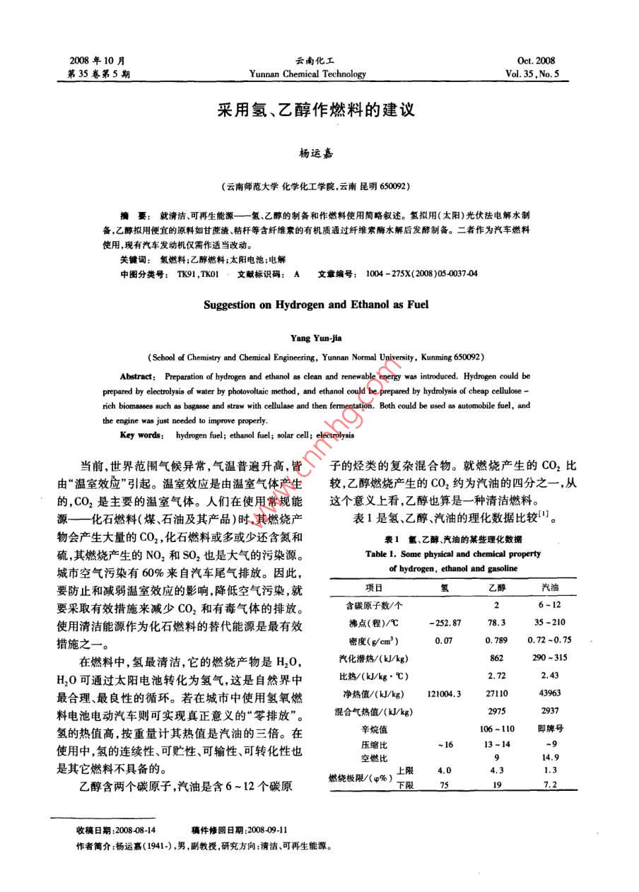 2008年10月云南化工Oct.2008第35卷第5期 Yunnan Chemical Technology Vol.35, No.5采用氫、乙醇作燃料的建議楊運(yùn)嘉(云南師范大學(xué)化學(xué)化工學(xué)院,云南昆明650092摘要:就清潔、可再生能源氫、乙醇的制備和作燃料使用簡(jiǎn)略敘述。氫擬用(太陽)光伏法電解水制、可再生備,乙醇擬用便宜的原料如甘蔗渣、秸桿等含纖維素的有機(jī)質(zhì)通過纖維素酶水解后發(fā)酵制備。二者作為汽車燃料使用,現(xiàn)有汽車發(fā)動(dòng)機(jī)僅需作適當(dāng)改動(dòng)。關(guān)鍵詞:氫燃料;乙醇燃料;太陽電池;電解中圖分類號(hào):TK91,TK01文獻(xiàn)標(biāo)識(shí)碼:A文章編號(hào):1004-275X(2008)0500704 Suggestion on Hydrogen and Ethanol as Fuel Yang Yun-jia (School of Chemistry and Chemical Engineering, Yunnan Normal University, Kunming 650092) Abstract: Preparation of hydrogen and ethanol as clean and renewable energy was introduced. Hydrogen could be epared by electrolysis of water by photoltaic method, and ethanol could be prepared by hydrolysis of cheap celulose- rich biomasses such as bagasse and straw with cellulase and then fermentation. Both could be used as automobile fuel, and the engine was just needed to improve properly. Key words: hydrogen fuel; ethanol fuel: solar cell; electrolysis當(dāng)前,世界范圍氣候異常,氣溫普遍升高,皆子的烴類的復(fù)雜混合物。就燃燒產(chǎn)生的CO2比由“溫室效應(yīng)”引起。溫室效應(yīng)是由溫室氣體產(chǎn)生較,乙醇燃燒產(chǎn)生的CO2約為汽油的四分之一,從的,CO2是主要的溫室氣體。人們?cè)谑褂贸R?guī)能這個(gè)意義上看,乙醇也算是一種清潔燃料源——化石燃料(煤、石油及其產(chǎn)品)時(shí),其燃燒產(chǎn)表1是氫、乙醇、汽油的理化數(shù)據(jù)比較。物會(huì)產(chǎn)生大量的CO2,化石燃料或多或少還含氮和表1、乙醇汽油的某些理化數(shù)據(jù)硫,其燃燒產(chǎn)生的NO2和SO2也是大氣的污染源。 Table 1. Some physical and chemical property城市空氣污染有60%來自汽車尾氣排放。因此, of hydrogen, ethanol and gasoline要防止和減弱溫室效應(yīng)的影響,降低空氣污染,就項(xiàng)氫乙醇汽油要采取有效措施來減少CO2和有毒氣體的排放。含碳原子數(shù)/個(gè)26-12使用清潔能源作為化石燃料的替代能源是最有效沸點(diǎn)(程)/℃-252.8778.335-210措施之一。密度(g/cm3)0.070.7890.72-0.75在燃料中,氫最清潔,它的燃燒產(chǎn)物是H2O,汽化潛熱/(k/kg)862290~315H2O可通過太陽電池轉(zhuǎn)化為氫氣,這是自然界中比熱/(kJ/kg·℃)2.722.43最合理、最良性的循環(huán)。若在城市中使用氫氧燃凈熱值k)1210032711043963料電池電動(dòng)汽車則可實(shí)現(xiàn)真正意義的“零排放”。混合氣熱值/(k/kg)29752937氫的熱值高,按重量計(jì)其熱值是汽油的三倍。在辛烷值106-110即牌號(hào)使用中,氫的連續(xù)性、可貯性、可輸性、可轉(zhuǎn)化性也壓縮比~1613-14-9空燃比914.9是其它燃料不具備的。燃燒極限%上限4.04.31.3乙醇含兩個(gè)碳原子,汽油是含6~12個(gè)碳原下限75197.2收稿日期:2008-08-14稿件修回日期:2008-09-11作者簡(jiǎn)介:楊運(yùn)嘉(1941-),男,副教授,研究方向:清潔、可再生能源。38云南化工2008年第5期新。同時(shí),液氫的沸點(diǎn)低(-252.87℃),致使氣態(tài)1氫燃料氫很難液化,液氫則很易揮發(fā),稍微振動(dòng)、受熱,體積就激烈膨脹。因此,盛氫容器必須耐壓、絕緣、1.1氫的制備保溫效果好,這就增加了使用的困難。二是氫的制氫的方法很多,目前國(guó)內(nèi)已工業(yè)化的有:常密度低、粘度小提升力大(比氦大8%)。氣態(tài)氫規(guī)電解水制氫(這是已成熟的工藝,但該法耗電量若加壓后在高壓鋼瓶中使用,與現(xiàn)有汽車燃料箱大,成本高,不宜普遍采用);水煤氣法制氫(提供提供的里程數(shù)比較,要跑相同里程,則需幾個(gè)鋼城市煤氣,其中H2占大約50%);氯堿工業(yè)副產(chǎn)瓶,容器笨重,體積又大。氫分子體積小,高壓下氫;煉油廠用輕質(zhì)烴制氫等。易滲透到金屬材料內(nèi)部產(chǎn)生氫脆現(xiàn)象,導(dǎo)致材料在科研方面,國(guó)內(nèi)外所用的制氫方法有:高溫強(qiáng)度下。這些問題都必須予以解決才能實(shí)現(xiàn)氫電解水制氫、熱化學(xué)循環(huán)分解水制氫、生物質(zhì)細(xì)菌燃料汽車的使用。制氫等。使用貯氫合金是解決安全性的首選?,F(xiàn)在人作者擬采用的方法是(太陽)光伏法電解水制們?cè)阪V、鎂鎳、鑭鎳、鈦鐵、稀土等各系列作了大氫。用這種方法制氫,盡管首次投資成本高(昆明量研究,一旦貯氫容量、貯放速度得到提高,達(dá)某公司太陽電池出廠價(jià)35元/瓦),光電轉(zhuǎn)換效率到實(shí)用化和規(guī)?;?氫氣汽車就指日可待了。僅為15%~17%還有待提高,但太陽電池壽命至由于液氫或固氫凍膏比氣態(tài)氫的密度高得少20年。作者所做實(shí)驗(yàn)已在2000年第十三屆世多,用作發(fā)動(dòng)機(jī)(特別是火車)燃料是可行的但盛界氫能大會(huì)論文集中以題目“The production of hy液氫的容器設(shè)計(jì)必須耐壓、絕緣保溫效果好???drogen by electrolysis of water with the aid of sun考慮與燃料電池聯(lián)用,即有意識(shí)的讓燃料箱留孔 light作過報(bào)道。使氫氣向外泄,不斷外泄的氫可作為燃料電池當(dāng)時(shí)采用兩根各150mL的有機(jī)玻璃管做水的燃料,所得到的電力不僅可作機(jī)車的雙動(dòng)力能電解器,而經(jīng)過車工的有機(jī)玻璃管透光