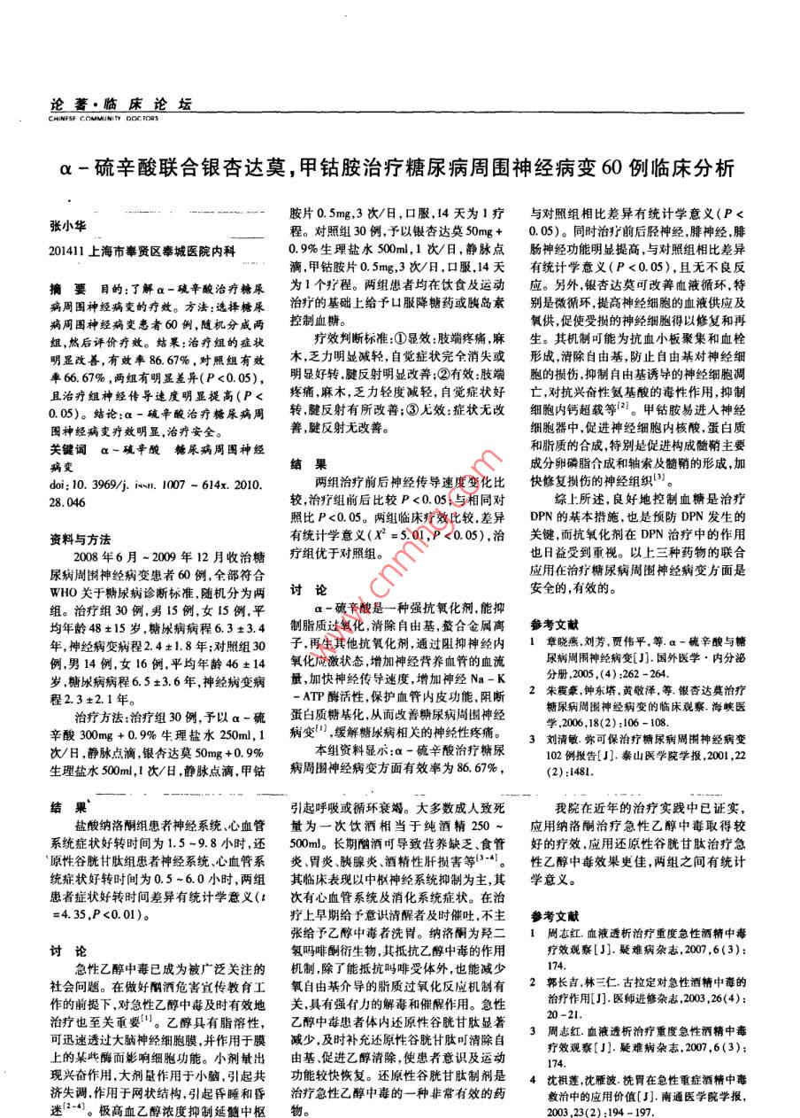 陀·臨床論壇肺結(jié)核抗癆期間肝功能損害25例臨床分析方法:根據(jù)患者病史服藥史、臨床表性肝損害亦較常見,可造成不同程度的肝張小英現(xiàn)、肝功能、二對半、腹部B超等。肝功損傷、嚴(yán)重者可致肝功能衰竭而死亡。201700上海中山醫(yī)院青浦分院肺科能異常判定標(biāo)準(zhǔn):ALT>60U/L,可伴有黃本文資料顯示:肺結(jié)核患者在抗癆治療期摘要目的:通過抗癆藥物對肺結(jié)楗患疸指數(shù)的升高。間,肝功能異常的發(fā)生率為25%,其中大者肝功能損害的臨床持點,并積極采取保部分為輕中度肝功能異常。當(dāng)出現(xiàn)藥物肝等措施分析,對今后具有重要的臨床意結(jié)果性肝損害時,應(yīng)根據(jù)肝功損害的嚴(yán)重程度義。方法:對2009年1月~2010年5月臨床癥狀主要表現(xiàn)為腳酸、乏力5決定治療方案3。綜上所述,在今后的收治的100例肺結(jié)核患者在抗癆期間有例納差惡心嘔吐1例,發(fā)熱、皮疹1例作中應(yīng)注意以下幾點措施①化療前應(yīng)25例出現(xiàn)肝功能異常的時間、程度等情黃疽2例,余患者均無不適癥狀??拱A后全面∫解肺結(jié)核患者的肝臟,有無肝炎病況進行回顧性分析。結(jié)果:本文中肝功能LT異常時間最短為4-70天平均28.史及其他易影響肝功能的因素如飲酒、損害多見于中年男性飲酒多者肝臟有56天。ALT異常情況ALT在1001以妊娠等:常規(guī)檢查肝功能和乙肝病毒標(biāo)志基礎(chǔ)疾病者;臨床缺乏典型癥狀。同時發(fā)內(nèi)10例;ALT>100U/L至正常值2倍有物B超血脂膽固醇等根據(jù)患者的個現(xiàn)肝損害后,積極采取措施后肝功能恢6例;ALT高達正常值2倍或以上有體差異選擇較為適當(dāng)?shù)姆桨浮σ延懈螐?fù)時間亦較快。結(jié)論全面了解肺結(jié)核惠例。二對半陽性7例。B超示:膽囊及膽臟疾患史者初始抗癆就選用肝損害較小者的肝臟,抗癆期間應(yīng)預(yù)防性的使用保肝管結(jié)石5例;肝囊腫4例;肝血管瘤1例;的抗癆藥物并積極采取保肝措施。②抗藥物,以減少發(fā)生肝損害的機會。對已發(fā)血吸蟲病1例:肝脾腫大1例;膽囊息肉癆期間應(yīng)預(yù)防性的使用保肝藥物。據(jù)報生肝損害的患者,選用肝損害較小的抗癆1例。對ALT<100U/L者繼原方案抗道乙肝“大三陽”的結(jié)核病患者在抗癆化藥物并積極采取保肝措施,嚴(yán)密監(jiān)測肝功癆或叮停用RFP,改用Re,同時保肝降疔同時輔以護肝治療,可延緩肝損害和黃能情況,確??拱A治療。酶治療,每周檢測1次肝功能;ALT超過疸的發(fā)生時間,明顯降低肝損害發(fā)生率關(guān)鍵詞肺結(jié)核抗癆肝功能損害正常2倍時,停用RFP、PA,同時保肝降避免中途停藥,以確??拱A治療順利進臨床分析酶治療,待肝功能恢復(fù)后選用對肝臟毒性行,提高結(jié)核病的治愈率do:10.390,isn.1007-614x.2010.作用較小的抗癆藥物ALT超過正常3倍28.044或以上,停用全部抗癆藥物,積極保肝為參考文獻主、輔以其他對癥支持治療。ALT恢復(fù)時蔡雄茂姚思敏抗結(jié)核藥物致急性肝功能間4-26天,平均12.87天,恢復(fù)在1周衰竭死1例臨床分析[刀中國防癆雜資料與方法200年1月-2010年5月收治肺結(jié)左右10例2周左右9例1月左右6例。志,2003,25(3):140-142.2邢同京陳加保,張光曙,等利福平與異煙核抗癆期間肝功能異?;颊?5例,男22肼合用致肝損害的臨床與病理分析[J].中例,女3例,年齡18-73歲,平均42.92由于結(jié)核病治療的特點是療程長需華結(jié)核和呼吸雜志,1997,20:333-351歲。其中男性酒者13例。繼發(fā)性肺結(jié)3張培元應(yīng)重視肝臟疾患時抗結(jié)核藥物肝核19例結(jié)核性胸膜炎6例,初治24例多種藥物聯(lián)合應(yīng)用,利福平、異煙肼、吡嗪損害[]中華結(jié)核和呼吸雜志,1998,21:復(fù)治1例。治療前査肝功能均正常酰胺是不可替代的一線藥,但引起的藥物643-64急性乙醇中毒38例的治療體會還原性谷胱甘肽(古拉定)藥物治療者38例,按隨機抽簽法分為兩組,鹽酸納doi:10.3969/jisn.100-614x.2010.洛剩組21例和還原型谷胱甘肽組17例。830000新疆烏魯木齊有色金屬公司醫(yī)院8.045臨床表現(xiàn)主要出現(xiàn)中樞神經(jīng)系統(tǒng)癥狀、心血管系統(tǒng)癥狀等癥狀。摘要目的:探討納洛酮及還原性谷胱目前我國急性乙醇中毒事件呈逐年治療方法:納洛酮組患者在葡萄糖甘肽治疔急性酒精中毒的療效的比較。增高趨勢,在新疆急性乙醇中毒是臨床上胰島素-B族維生素療法的基礎(chǔ)上,納洛方法:鹽酸納洛酮組(21例)和還原性谷常見的內(nèi)科急癥,其發(fā)病急病情變化快輕酮0.4-0.8m,肌肉注射或溶于50%葡胱甘肽組(19例)在傳統(tǒng)療法的基礎(chǔ)上分者會引起身體不適影響學(xué)習(xí)作,重者會萄糖40~60m靜脈注射,直至清醒。古別給予鹽酸納洛酮和古拉定靜脈應(yīng)用,個引起身體器官損害甚至危及生命。本文將拉定組是在葡萄糖-胰島素-族維生素別重癥患者進行血液透析治療。結(jié)果;兩我院收治的38例急性乙醇中毒患者的臨床疔法的基礎(chǔ)上,古拉定1.2-2.4g加入到組患者癥狀好轉(zhuǎn)的時間差有統(tǒng)計學(xué)意義資料及治療體會總結(jié)報告如下。0.9%氯化鈉溶液100ml靜脈滴注。(P<0.01)。結(jié)論:還原性谷胱甘肽治療療效評定標(biāo)準(zhǔn):神經(jīng)系統(tǒng)癥狀好轉(zhuǎn)為急性乙醇中毒療效更佳。資料與方法意識清楚,無明顯情緒異常等癥狀。心血管羔…順,床論左—α-硫辛