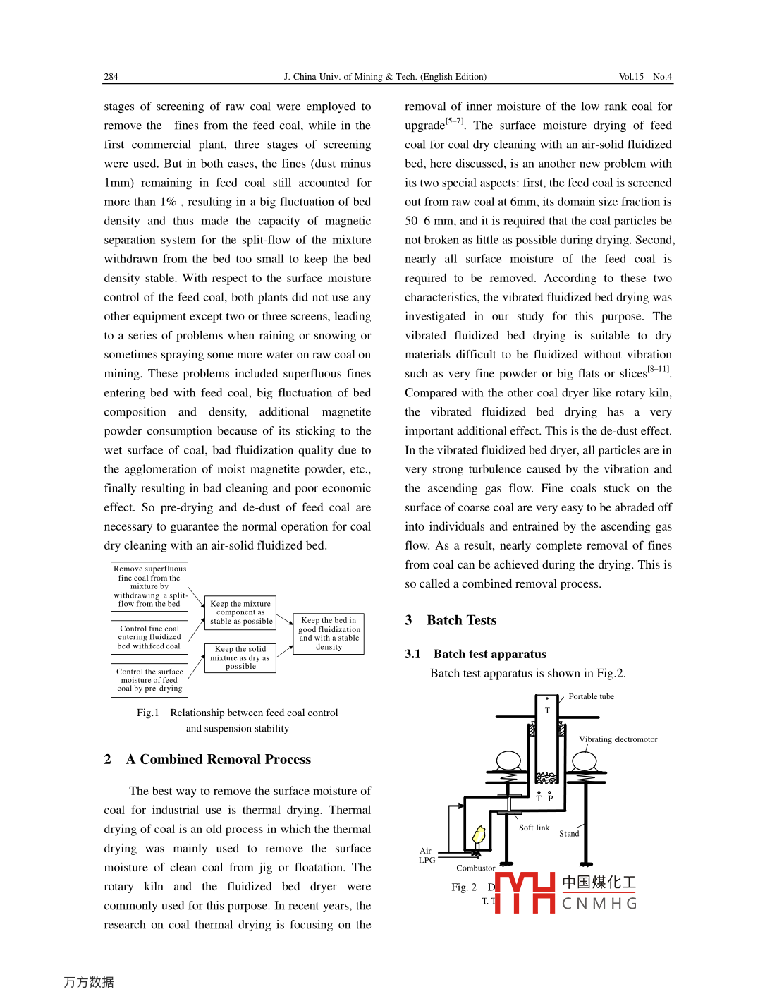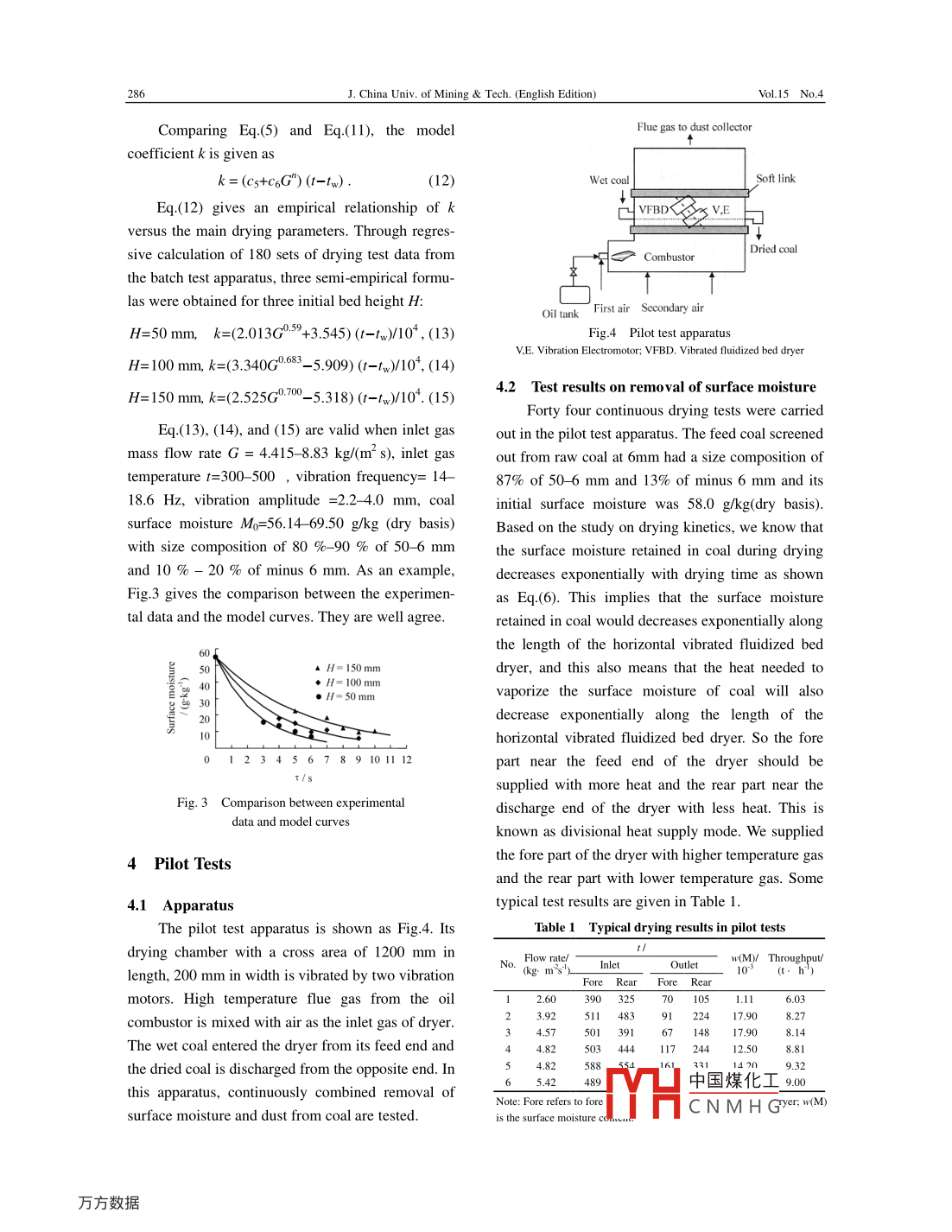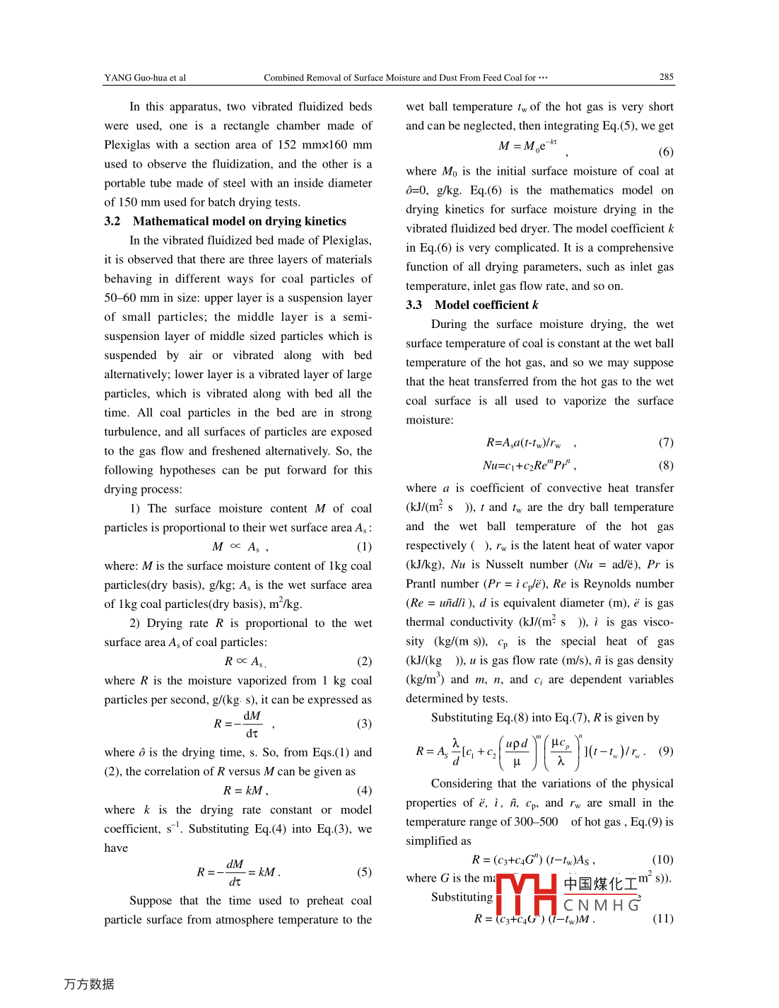 Dec.2005J. China Univ. of Mining Tech (English Edition)Combined removal of surface moisture andDust from Feed Coal for Coal Dry Cleaningwith an Air-solid fluidized bedYANG Guo-hua, ZHAO Yue-min, Chen Qing-ruI Ningbo University, Ningbo, Zhejiang 315211, ChinaSchool of Chemical Engineering and Technology, China University of Mining Technology, Xuzhou, Jiangsu 221008, ChinaAbstract: A demonstration plant and a commercial plant employing coal dry cleaning technology with an air-solidfluidized bed were built in China. The operation practice of these two plants shows that the surface moisture and thefines or dust of feed coal must be well controlled as low as possible. For this purpose, a new process of combinedremoval of surface moisture and dust from feed coal using a vibrated fluidized bed dryer was investigated in a batch testapparatus and a pilot test system. A mathematical model on drying kinetics of coal surface moisture was developed andthree empirical formulas of the model coefficient involving the main operating variables were determined based on theest results from the batch test apparatus. The mathematical model shows that the surface moisture retained in coduring drying decreases exponentially with drying time. According to this model, a new divisional heat supply mode, intemperature into the rear part of the dryer, was employed in the pilot test system. The pilot tests show that 1)the newdivisional heat supply mode is effective for lowering down the average temperature and reducing the total heat loss ofthe outlet gas off the dryer, 2)the moist coal of about 60 g/kg surface moisture contentcan be dried to about 10 g/kg, andsimultaneously the fines(