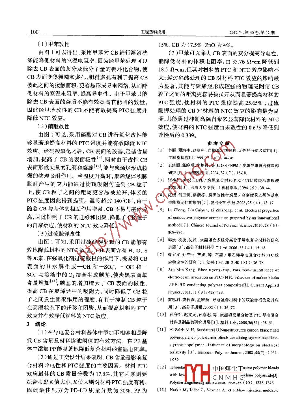 第40卷,第12期工程塑料應用Vol.40, No.12972012年12月ENGINEERING PLASTICS APPLICATIONDec. 2012doi:10.3969/j.isn.1001-3539.2012.12.023改性炭黑對多相聚烯烴/炭黑導電復合材料阻溫特性的影響*王延剛,譚洪生,李麗平(山東理T:大學材料科學與T程學院.山東淄博255049 )摘要:以高密度聚乙烯(PE- HD)為基體,研究了不同組分及炭黑(CB)改性方法對PE/聚丙烯(PP) /CB多相聚烯烴導電復合材料阻溫特性的影響。結果表明,在PE中添加PP能顯著降低材料的室溫體積電阻率,適量的CB能夠提高材料的正溫度系數(PTC)強度。經過硝酸和過硫酸鉀改性的CB能夠有效提高復合材料的導電性和PTC強度,其中硝酸改性的CB能與聚烯烴形成強物理吸附,使CB粒子高溫下更容易分開, PTC強度比未改性時提高了25.65%。此外,改性CB能使復合材料的NTC效應降低,其中過硫酸鉀使CB表面氧含量增加,提高了CB在聚烯烴中的吸附力,抑制高溫團聚,經過硫酸鉀改性CB的復合材料的NTC強度從未改性的0.675降低到改性后的0.339。關鍵詞:高密度聚乙烯;聚丙烯;改性炭黑;正溫度系數;阻溫特性中圖分類號: TQ322.2文獻標識碼:A文章編號: 1001-3539(2012)12-0097-05Effect of Modifed Carbon Black on Resistance and Temperature Characteristic of Multiphase Polyolefin/Carbon Black Conductive CompositesWang Yangang, Tan Hongsheng, Li Liping( School of Materials Science and Engineering, Shandong University of Technology, Zibo 255049, China )Abstract : The high density polyethylene ( PE- HD )was used as matrix, the influences of different constituents and differentmodification methods of carbon black(CB) on resistance and temperature characteristic of PE / PP / CB multiphasc polyolefinconductive composites were studied. The results showed that the volume resistivity at room temperature were reduced with theaddition of PP in PE and the PTC strength was increased with appropiate amount CB. The conductivity and the PTC strength of thecomposite materials were improved by modified CB, by HNO3 and K2S2Og modified CB could form strong physical adsorptionwith polyolefin to separate the CB easily under high temperature, the PTC strength improved 25.65% than that of composite withunmodified CB. Besides, the NTC effect was reduced by the modifed CB, among these, K2S2Ox could increase the CB surfaceoxygen content and the adsorption force in polyolefin was improved to restrain the agglomeration under high temperature, the NTCstrength of the composite modifed by K,S2O; was reduced from 0.675 to 0.339.Keywords:high density polyethylene ; polypropylene ; modified carbon black ; positive temperature coficient ; resistanceand temperature characteristic當前,聚合物基正溫度系數( PTC)材料已廣泛苯對CB表面進行洗滌,濃硝酸和過硫酸鉀對CB應用于導電和抗靜電材料、自控溫發(fā)熱材料、電磁進行氧化改性,研究了不同CB改性方法對PE/PP屏蔽材料等領域1-2。炭黑(CB )是最常用的導電/ CB復合材料的阻溫特性的影響,以探求穩(wěn)定PTC填料,為滿足復合材料的滲濾國值, CB含量通常較材料阻溫特性的規(guī)律。高,高填充使復合材料的黏度增大,加工性能變差;1實驗部分同時由于CB大多以聚集體的形式存在,高含量CB1.1 主要原材料在高溫下更容易自聚,導致材料電熱特性不穩(wěn)定,高密度聚乙烯( PE -HD):牌號DGDB 2480,熔NTC效應增大[3]。為解決上述問題研究人員通過體流動速率( MFR)為12.5 g/ !0 min,中國石油化采用增加不相容相、對CB進行改性、聚合物交聯、接枝改性4←8]等方法抑制CB的團聚,降低NTC效*山東省自然中國煤化工012)應,提高材料的負溫度系數( NTC )效應。筆者通過能化研究工作聯系人:譚判YHCNMHG的高性能化和功選用聚乙烯(PE) /聚丙烯( PP )兩相基體,采用甲收稿日期:2012-09-16.98工程塑料應用2012年,第40卷,第12期工股份有限公司齊魯分公司;試樣進行室溫電阻率的測試,測量試樣厚度后按照低密度聚乙烯( PE LD ):中國石油化工股份有使用說明將數據輸人測試儀,調節(jié)測試儀,每個試樣限公司齊魯分公司;片分別在不同位置測試3次,并記錄數據,最后求得PP:牌號T30S,MFR為0.9g/10min,中國平均數,得到試樣片的體積電阻率(p.)見公式(1):石油天然氣股份有限公司大慶石化分公司;RXS(1)CB : Y-10,天津利華進化工有限公司;氧化鋅( ZnO ):淄博憶鄴商貿有限公司;式中:R-- -電阻,Q ;抗氧劑1010、抗氧劑168:宜興市天使合成化S一試樣面積, cm2 ;學有限公司;L一試樣厚度 , cm。甲苯:山東興魯化工有限公司;(2 )阻溫特性測試硝酸:煙臺市雙雙化工有限公司;將試樣兩側銅網刮開,焊接上銅絲,然后連接過硫酸鉀:深圳市吉平化工有限公司。上導線放人電熱恒溫鼓風干燥箱內,導線的另一側1.2 主要儀器及設備連接萬用表,將干燥箱進行升溫,由25C升到180C轉矩流變儀: RM- 200A型,哈爾濱哈普電氣技并隨著溫度的升高記錄試樣的溫度和電阻值,按照術有限責任公司; .式(1)計算p、。式(2 )、式(3 )分別為PTC強度(d)電熱恒溫鼓風干燥箱: 101-1型,龍口市電爐制和NTC強度(0)的計算公式:造廠;0=lg(o;)(2)萬用表: DT9205A型,深圳山創(chuàng)儀器儀表有限公司;δ=lg(=)(3)熱模壓機: XH- 406型,廣東省錫華精密檢測儀器廠式中:Pmx--試樣最大電阻率, n .cm;萬能制樣機:ZHY_W型,承德試驗機有限公po一 試樣室溫電阻率,∩. cm;司;'min- 試樣達到最大電阻后電阻下降的最電線電纜半導電橡塑電阻測試儀:DB- 4A型,小電阻率, n . cm。上海虹運檢測儀器有限公司。2結果與討論1.3 試樣制備2.1組分對復合材料阻溫特性的影響(1 )聚烯烴/未改性CB導電復合材料制備按表1實驗內容稱取試樣料總質量45 g,按L。采用正交設