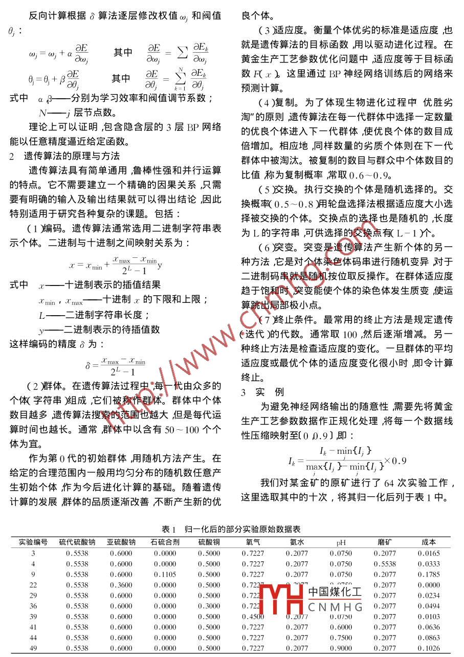 黃金生產(chǎn)工藝參數(shù)的優(yōu)化盧才武云慶夏陳永鋒蘭新哲西安建筑科技大學(xué)西安710055)摘要本文探討了神經(jīng)網(wǎng)絡(luò)與遺傳算法相結(jié)合協(xié)同求解黃金生產(chǎn)工藝參數(shù)的優(yōu)化問(wèn)題。該方法既利用了神經(jīng)網(wǎng)絡(luò)的自學(xué)習(xí)、自適應(yīng)非線性映射和預(yù)測(cè)功能,又利用了遺傳算法的全局優(yōu)化特性,實(shí)例證明該方法是合理的、可行的。關(guān)鍵詞人工神經(jīng)網(wǎng)絡(luò)遺傳算法優(yōu)化黃金中圖分類號(hào)F402.3文獻(xiàn)標(biāo)識(shí)碼A文章編號(hào)1004-4051(2003)10-0051-03OPTIMIZATION OF THE TECHNICAL PARAMETERSIN GOLD PRODUCTIONLu Caiwu Yun Qingxia Chen Yongfeng Lan Xinzhe(xi'an University of Architecture and Technology Xi'an 710055)Abstract: this paper discusses the application of the new optimal method-Genetic algorithm and artificialeural network in the determination of the gold production technical parameters. The method uses not only theability of nonlinear mapping and prediction of artificial neural network, but also the overall situation optimizationof genetic algorithm. The results of example show that it is reasonable and reliable to determinate the technicaparameters of gold production by using B-P neural network and genetic algorithmKeywords: Artificial neural network, Genetic algorithm, Optimization Gold人工神經(jīng)網(wǎng)絡(luò)是80年代獲得迅速發(fā)展的一門(mén)網(wǎng)絡(luò)的學(xué)習(xí)過(guò)程由正向計(jì)算和誤差反向傳非線性科學(xué),它力圖模擬人腦的一些基本特性,如遞修改2個(gè)過(guò)程組成。正向計(jì)算各層節(jié)點(diǎn)輸出值自適應(yīng)性,自組織性和容錯(cuò)性能,并已用于模式識(shí)為別、系統(tǒng)辯識(shí)等領(lǐng)域,取得了很好的效果(2)。對(duì)fay-1+9,)(j=23……)于多輸入多輸出問(wèn)題,利用神經(jīng)網(wǎng)絡(luò)模型可以建立式中y1—輸入網(wǎng)絡(luò)的數(shù)據(jù)向量多輸入和多輸出之間復(fù)雜的非線性關(guān)系,本文擬將y-1—第j-1層節(jié)點(diǎn)輸出數(shù)據(jù)向量人工神經(jīng)網(wǎng)絡(luò)模型應(yīng)用于黃金生產(chǎn)工藝參數(shù)優(yōu)化y—第j層節(jié)點(diǎn)輸出數(shù)據(jù)向量中,建立各個(gè)工藝參數(shù)與生產(chǎn)成本間的非線性關(guān)第j-1層節(jié)點(diǎn)與第j層節(jié)點(diǎn)間的連系,然后利用遺傳算法搜索尋找最優(yōu)的生產(chǎn)工藝參接權(quán)值矩陣數(shù),以期得到更加可行和合理的結(jié)果。1誤差反向傳播網(wǎng)絡(luò)原理0——第j層節(jié)點(diǎn)閾值向量。誤差反向傳播網(wǎng)絡(luò)由 Rumelhart等于1985年f(x)=,1為Sgmd函數(shù)。定義網(wǎng)絡(luò)提出。BP網(wǎng)絡(luò)模型屬于多層前饋映射網(wǎng)絡(luò),其核誤差函數(shù)為心算法是基于最小二乘法(LMS)的廣義δ算法網(wǎng)絡(luò)通過(guò)δ算法學(xué)習(xí)訓(xùn)練數(shù)據(jù)集,確定各神經(jīng)元之中國(guó)煤化工-y)間的連接權(quán)值和閥值,從而建立一個(gè)n維空間的子式中HCNMHG集至m維空間的子集的映射關(guān)系期望輸出。*霍英東教育基金(81044)和陜西省教育廳專項(xiàng)基金(99JK218)資助項(xiàng)目黃金生產(chǎn)攝的優(yōu)化反向計(jì)算根據(jù)δ算法逐層修改權(quán)值ω;和閥值良個(gè)體。3適應(yīng)度。衡量個(gè)體優(yōu)劣的標(biāo)準(zhǔn)是適應(yīng)度也+2其中=∑就是遺傳算法的目標(biāo)函數(shù)用以驅(qū)動(dòng)進(jìn)化過(guò)程。在黃金生產(chǎn)工藝參數(shù)優(yōu)化問(wèn)題中適應(yīng)度等于目標(biāo)函9=9+9E其中OE數(shù)F(x)這里通過(guò)BP神經(jīng)網(wǎng)絡(luò)訓(xùn)練后的網(wǎng)絡(luò)來(lái)預(yù)測(cè)計(jì)算。式中aβ——分別為學(xué)習(xí)效率和閥值調(diào)節(jié)系數(shù)(4)復(fù)制。為了體現(xiàn)生物進(jìn)化過(guò)程中優(yōu)勝劣Nj層節(jié)點(diǎn)數(shù)。淘"的原則遺傳算法在毎一代群體中選擇一定數(shù)量理論上可以證明,包含隱含層的3層BP網(wǎng)絡(luò)的優(yōu)良個(gè)體進(jìn)入下一代群體使優(yōu)良個(gè)體的數(shù)目成能以任意精度逼近給定函數(shù)。倍增加。相應(yīng)地同樣數(shù)量的劣質(zhì)個(gè)體則在下一代2遺傳算法的原理與方法群體中被淘汰。被復(fù)制的數(shù)目與群眾中個(gè)體數(shù)目的遺傳算法具有簡(jiǎn)單通用魯棒性強(qiáng)和并行運(yùn)算比值稱為復(fù)制概率常取0.6-0.9的特點(diǎn)。它不需要建立一個(gè)精確的因果關(guān)系只需5痠交換。執(zhí)行交換的個(gè)體是隨機(jī)選擇的。交要有明確的輸入及輸出結(jié)果就可以得出結(jié)論因此換概率(0.5-0.8用輪盤(pán)選擇法根據(jù)適應(yīng)度大小選特別適用于研究各種復(fù)雜的課題。包括擇被交換的個(gè)體。交換點(diǎn)的選擇也是隨機(jī)的,長(zhǎng)度1蹁編碼。遺傳算法通常選用二進(jìn)制字符串表為L(zhǎng)的字符串可供選擇的交換點(diǎn)有L-1)個(gè)。示個(gè)體。二進(jìn)制與十進(jìn)制之間映射關(guān)系為(6戾變。突變是遺傳算法產(chǎn)生新個(gè)體的另.min y-max min,種方法它是對(duì)個(gè)體染色體碼串進(jìn)行隨機(jī)變異對(duì)于式中x—十進(jìn)制表示的插值結(jié)果進(jìn)制碼串就是隨機(jī)按位取反操作。在群體適應(yīng)度趨于飽和時(shí)突變能使個(gè)體的染色體發(fā)生質(zhì)變使
